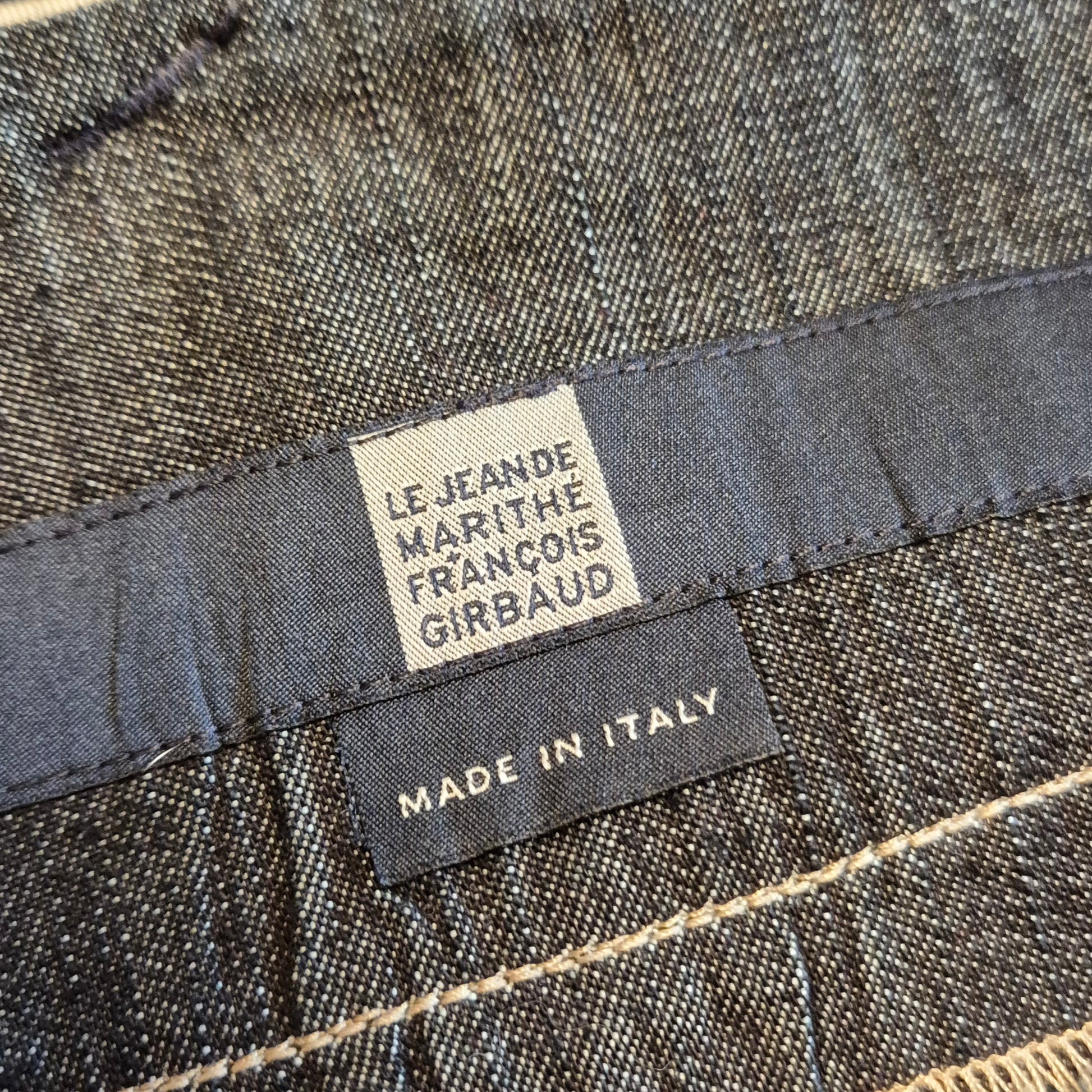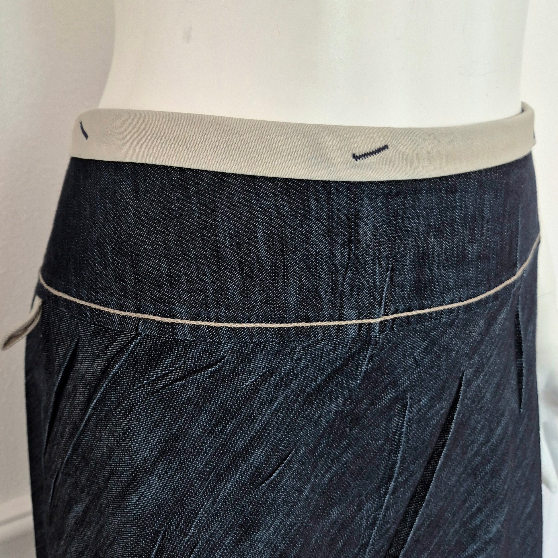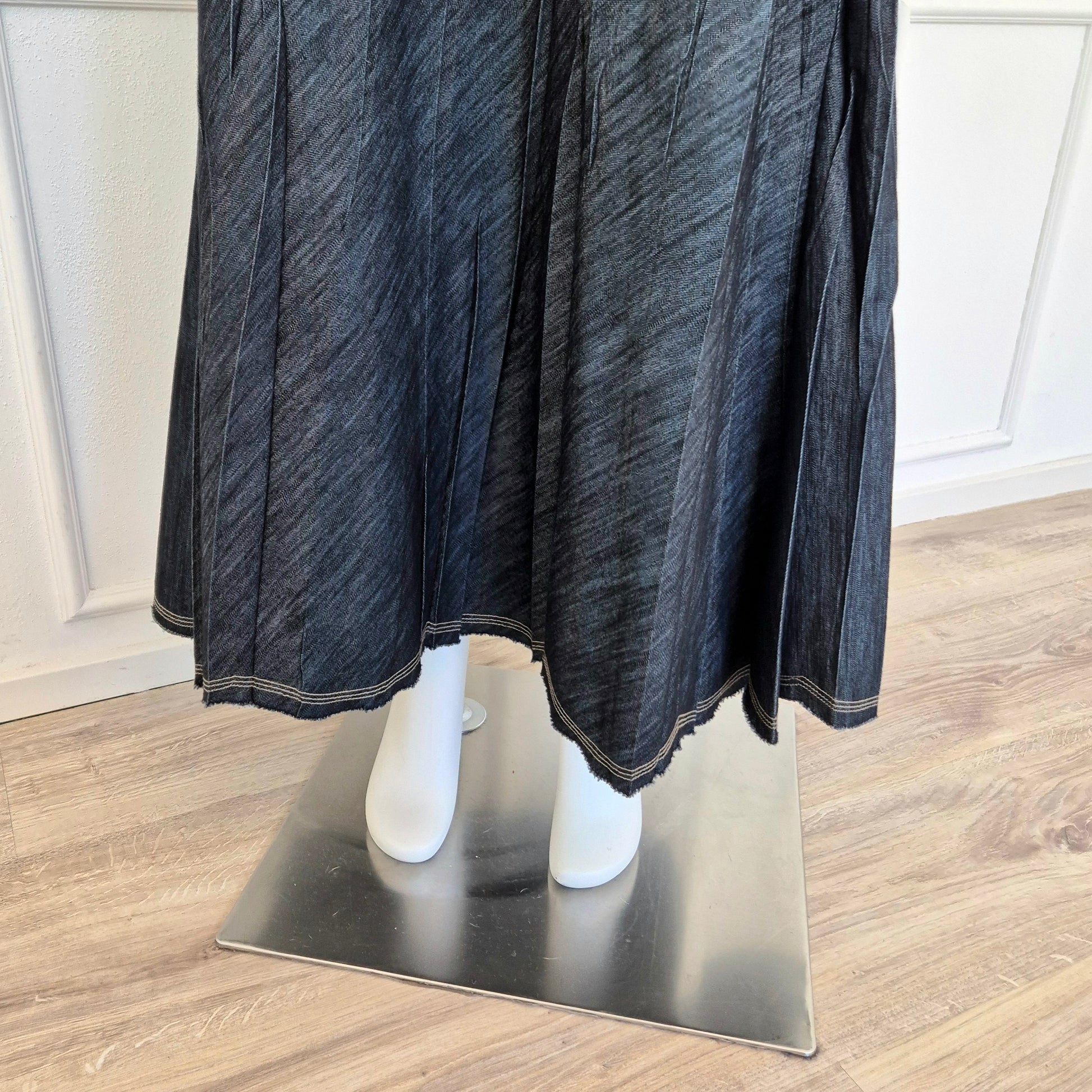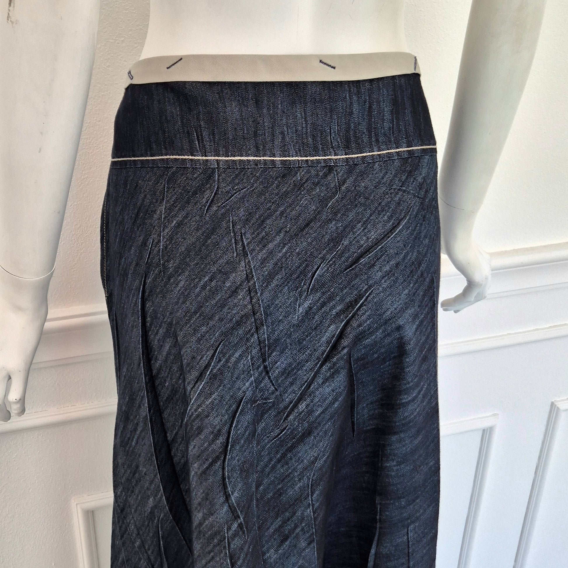 MARITHÉ+FRANҪOIS GIRBAUD gonna lunga in denim lavaggio scuro con particolare lavorazione del tessuto a darle un effetto "stropicciato". Linea a sirena con punto vita bordato in cotone grigio ghiaccio e zip laterale.