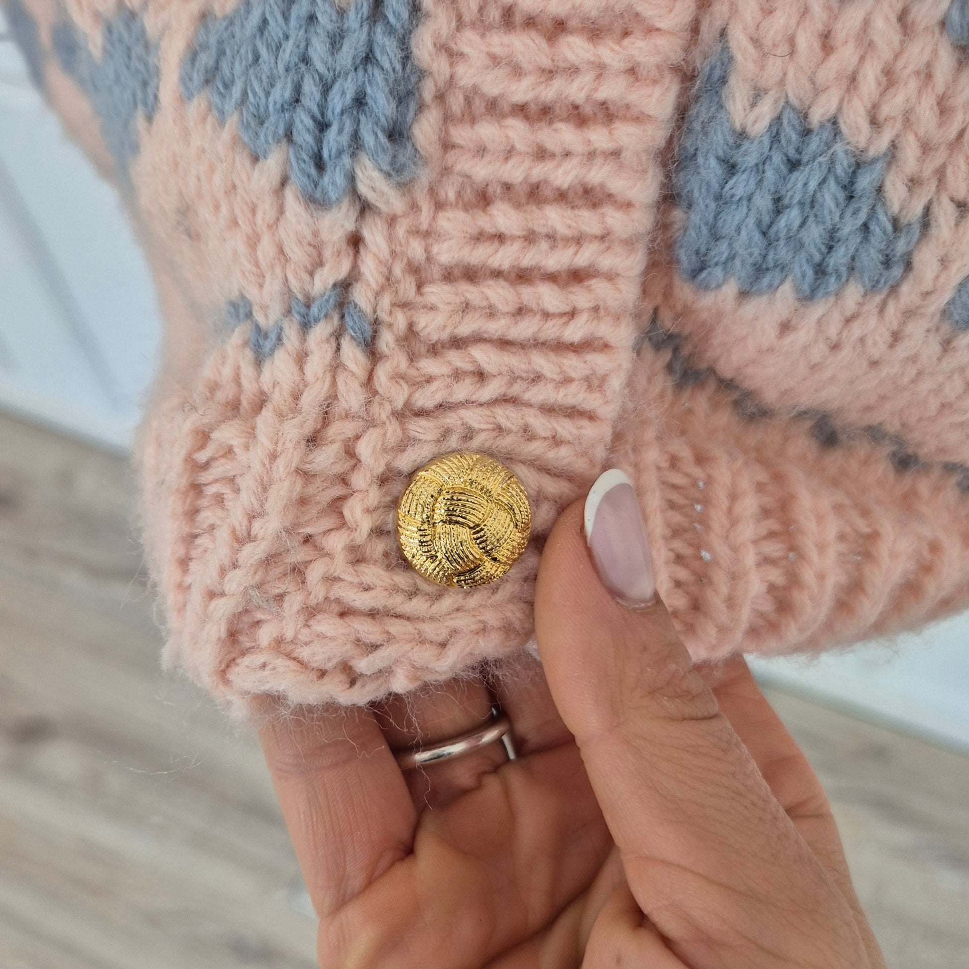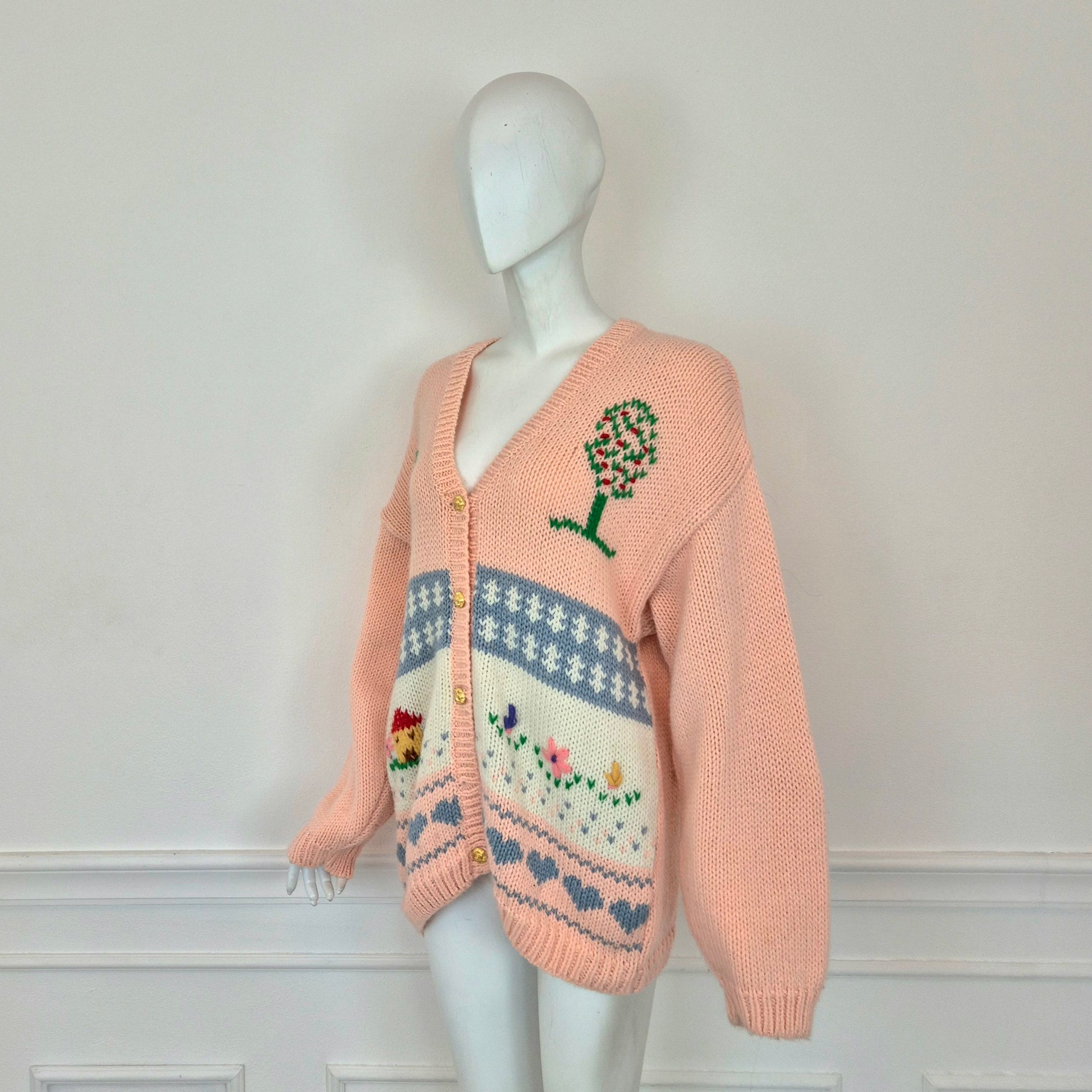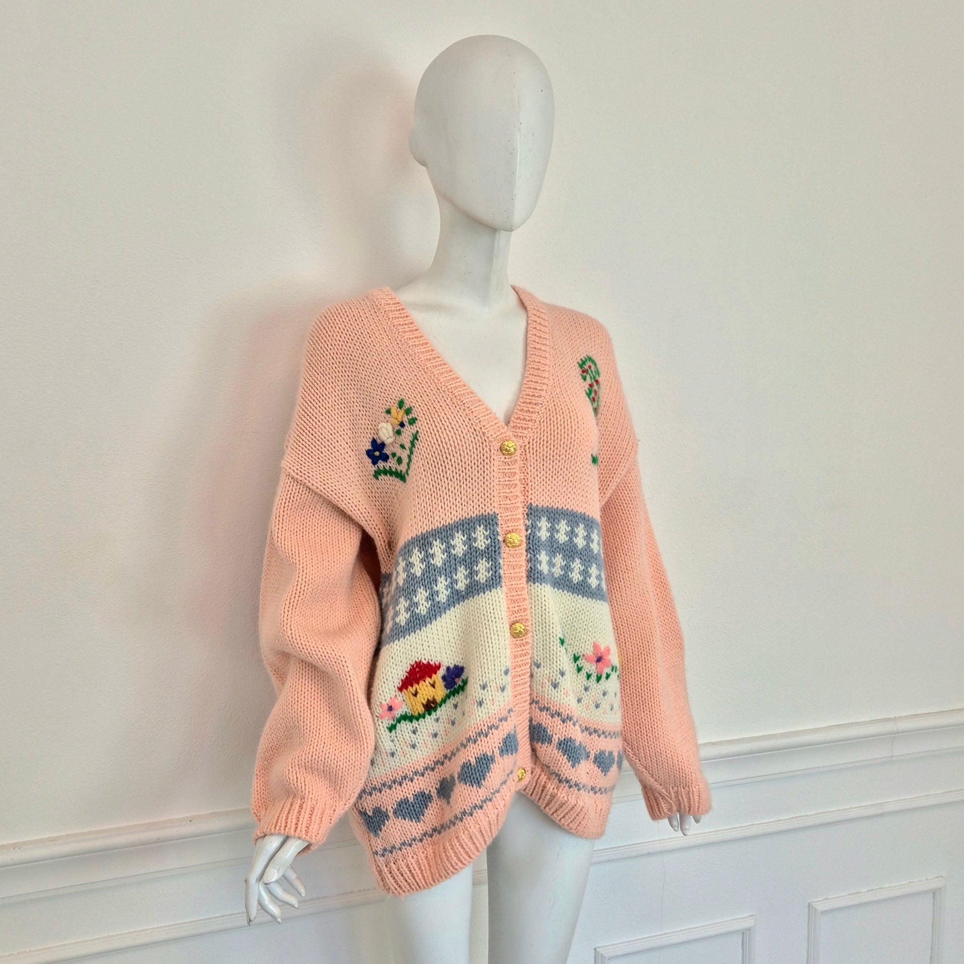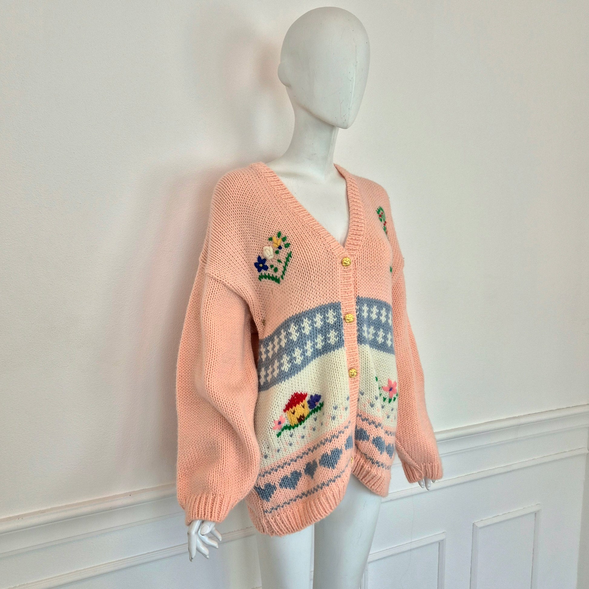 Maxi cardigan vintage fatto a mano, filato rosa confetto e ricamo sulla parte frontale. Bottoni in metallo dorato su tutta la lunghezza.