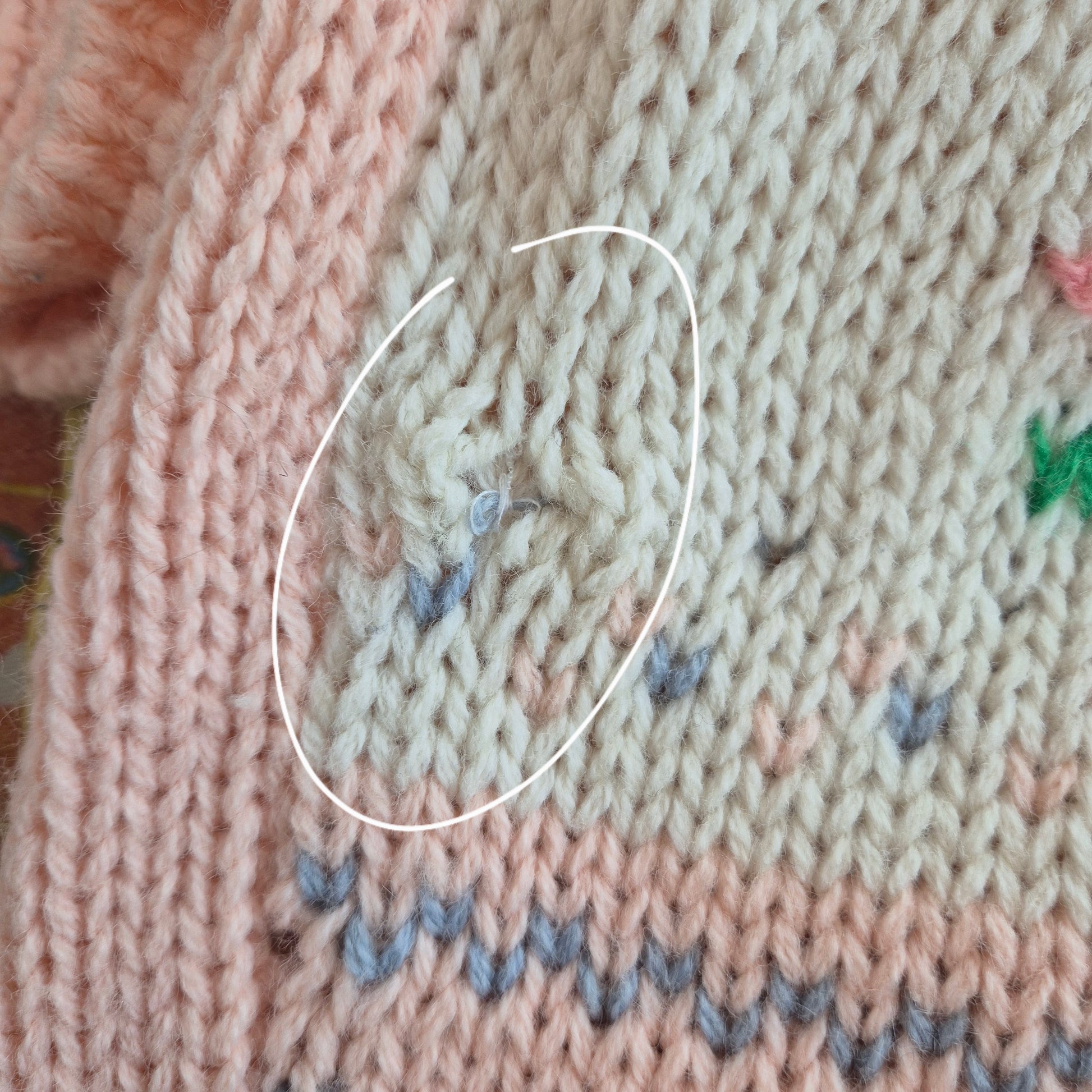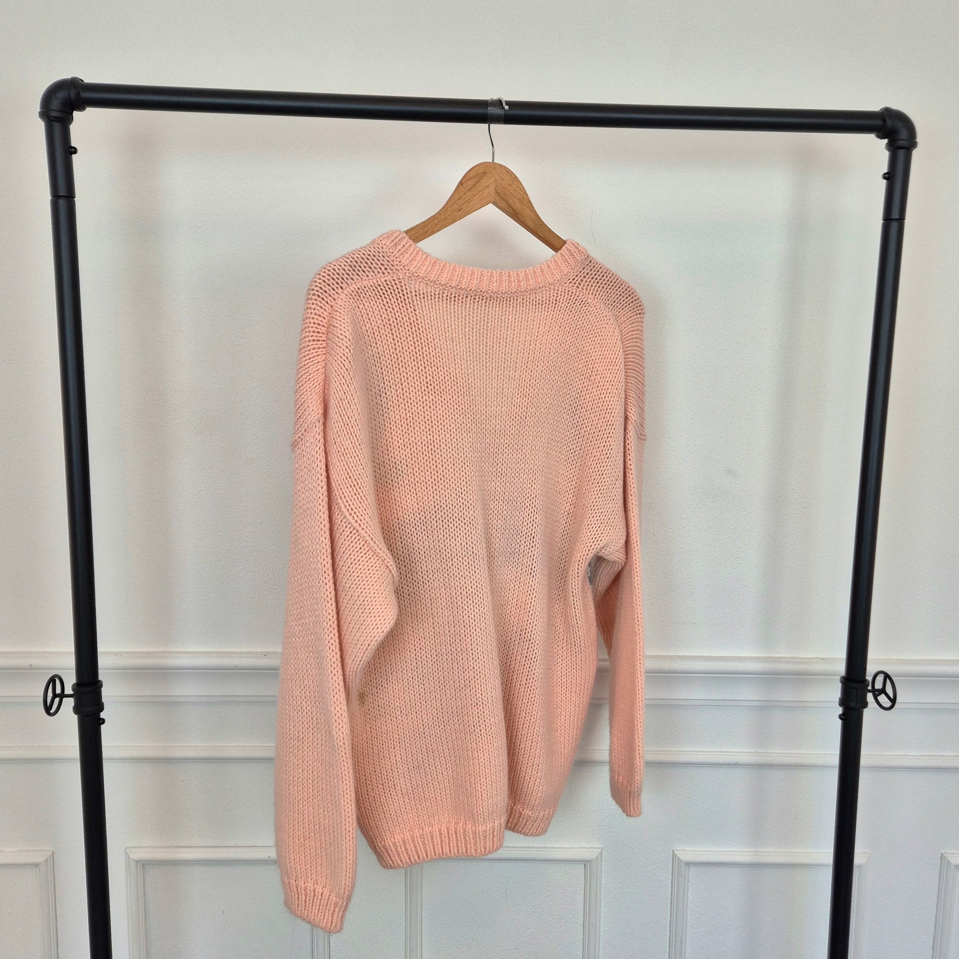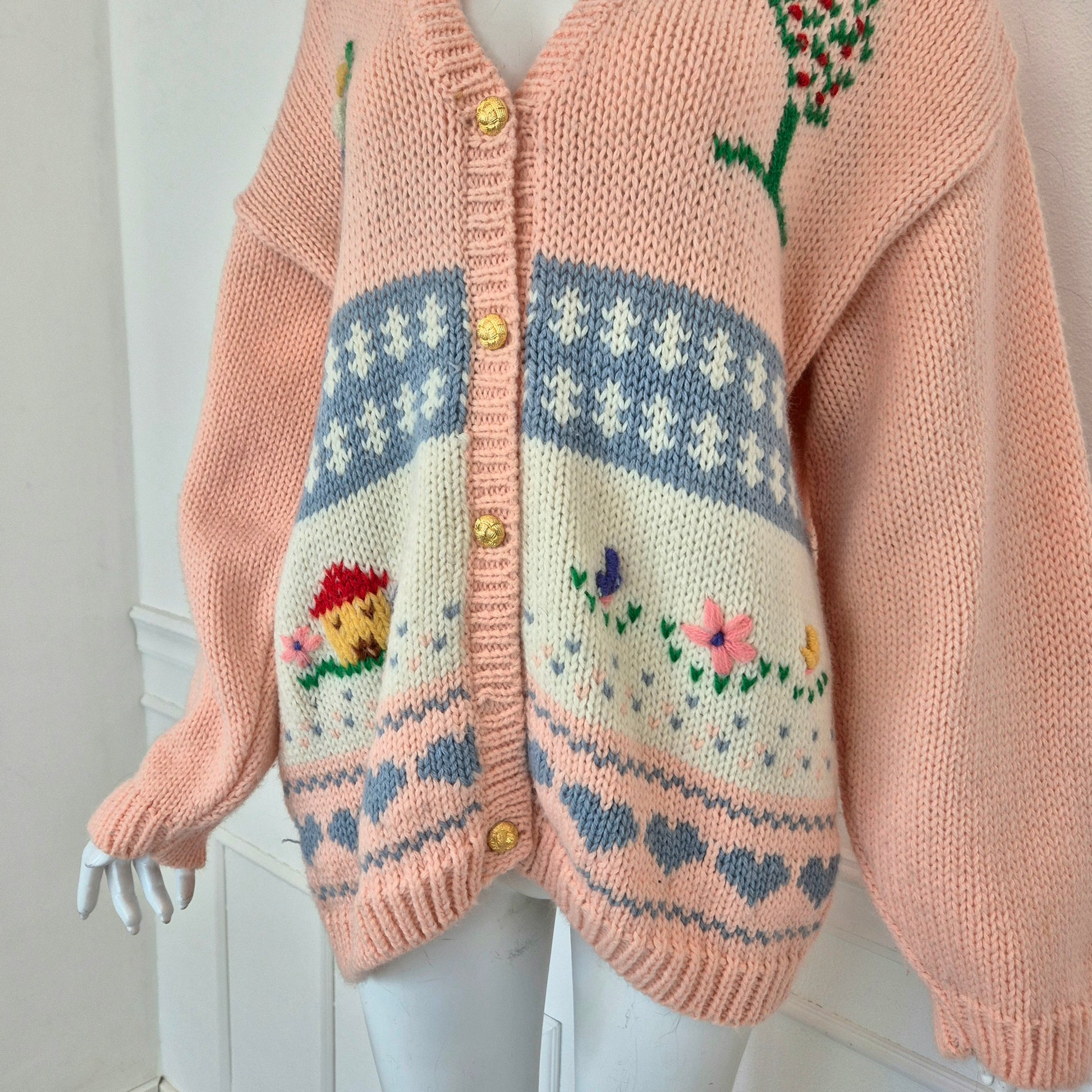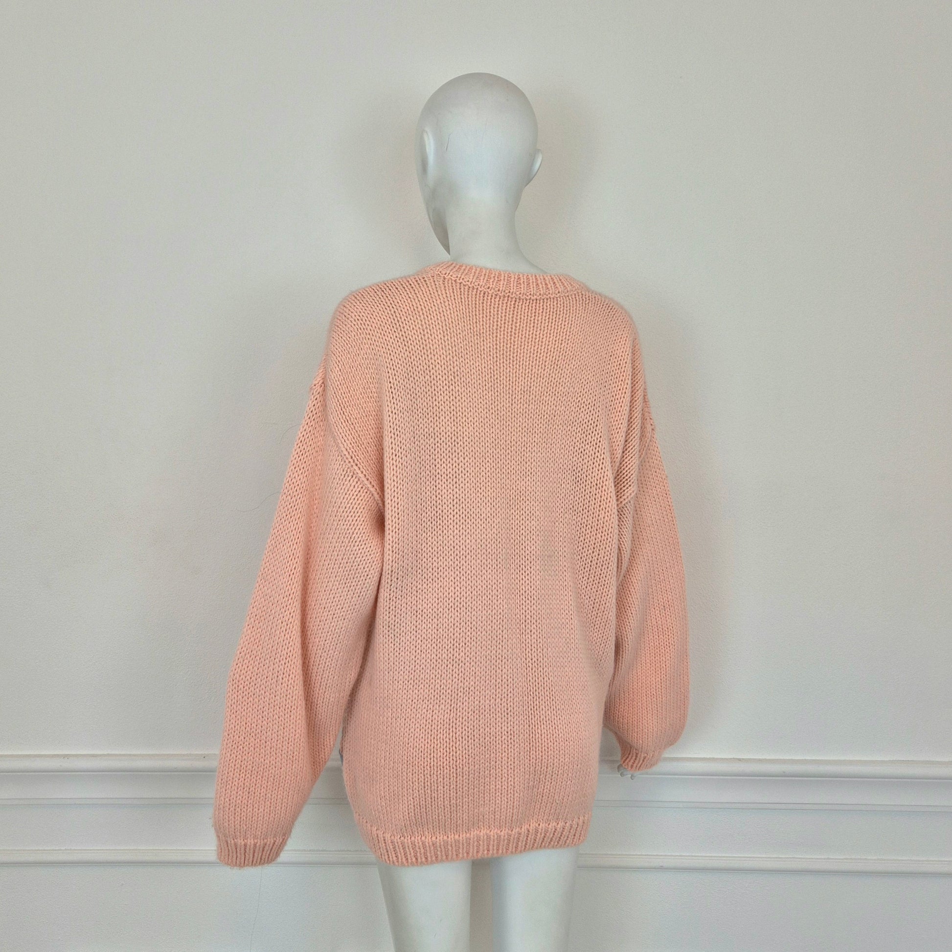 Maxi cardigan vintage fatto a mano, filato rosa confetto e ricamo sulla parte frontale. Bottoni in metallo dorato su tutta la lunghezza.