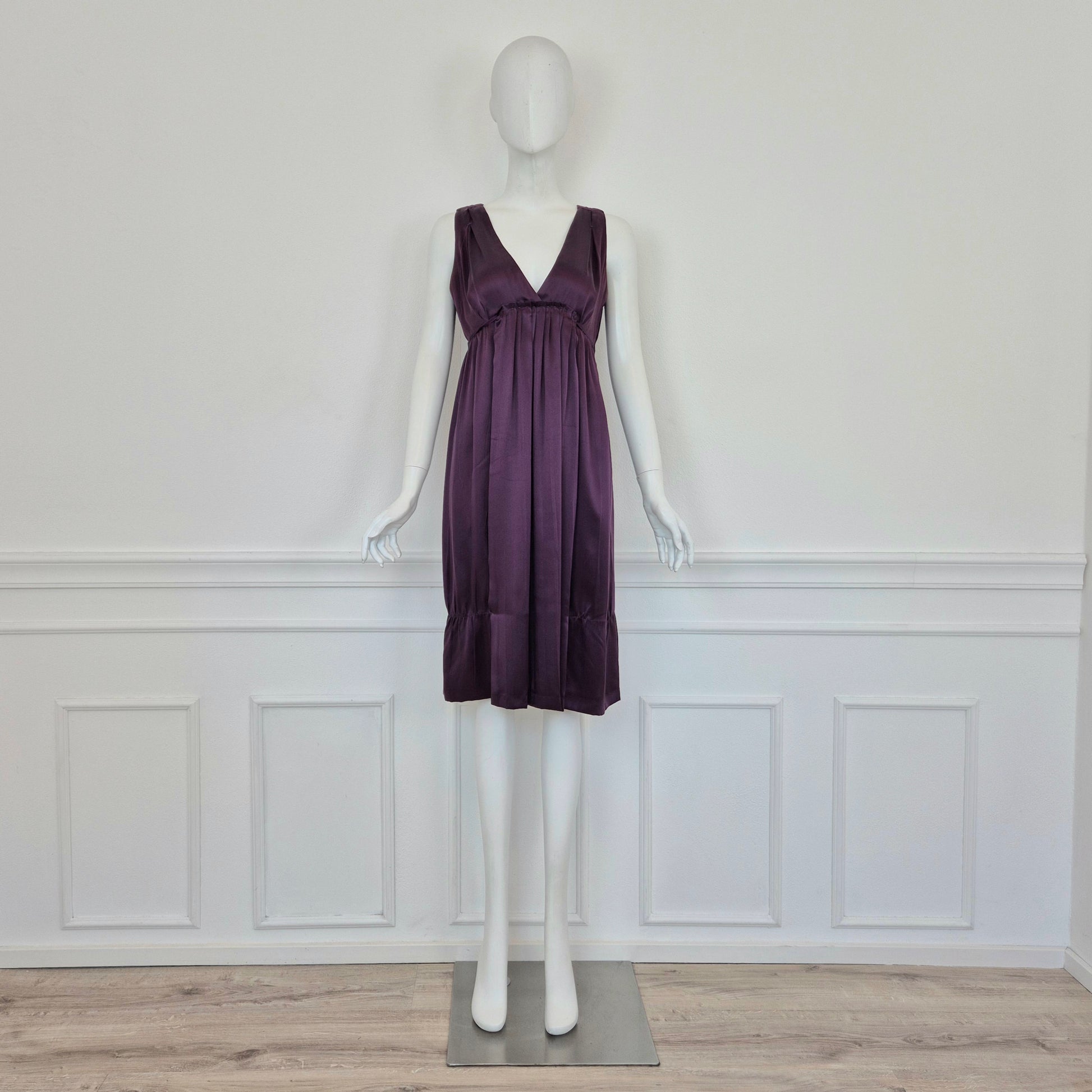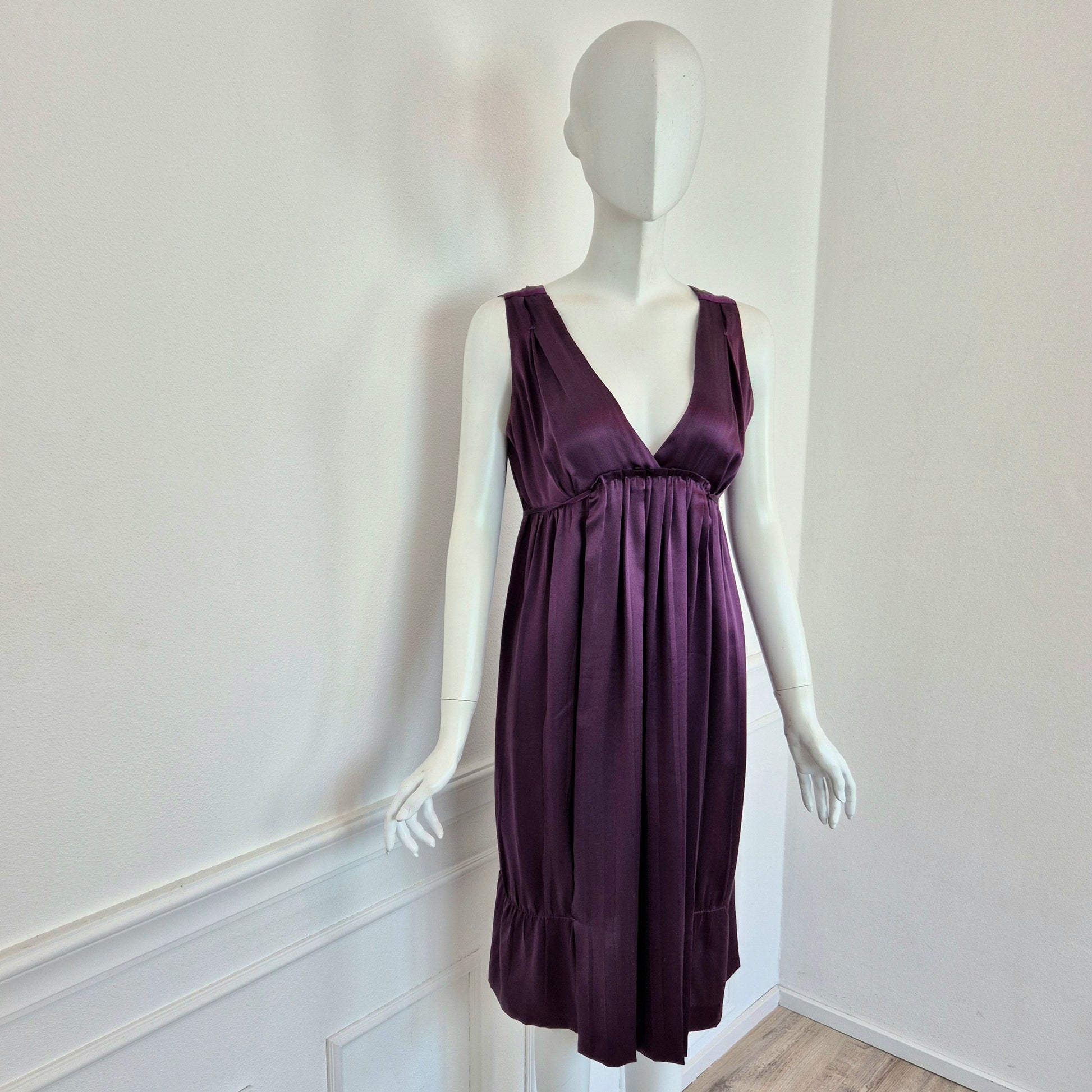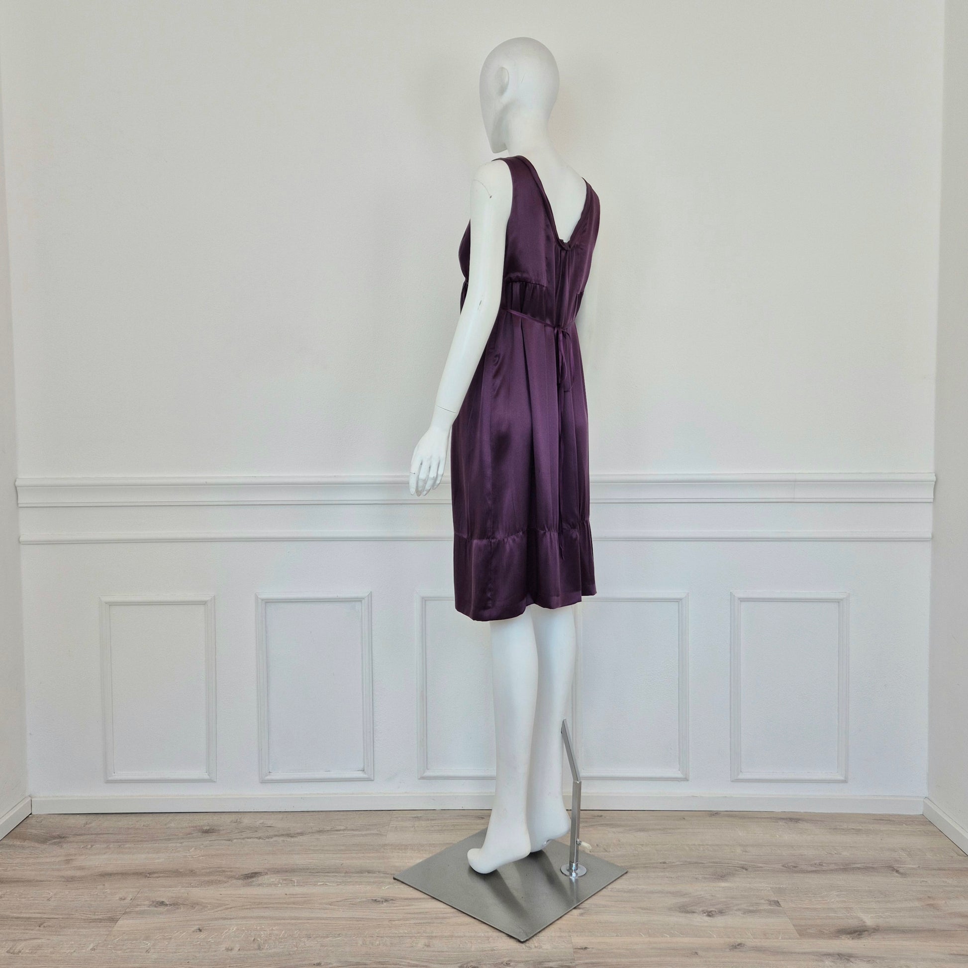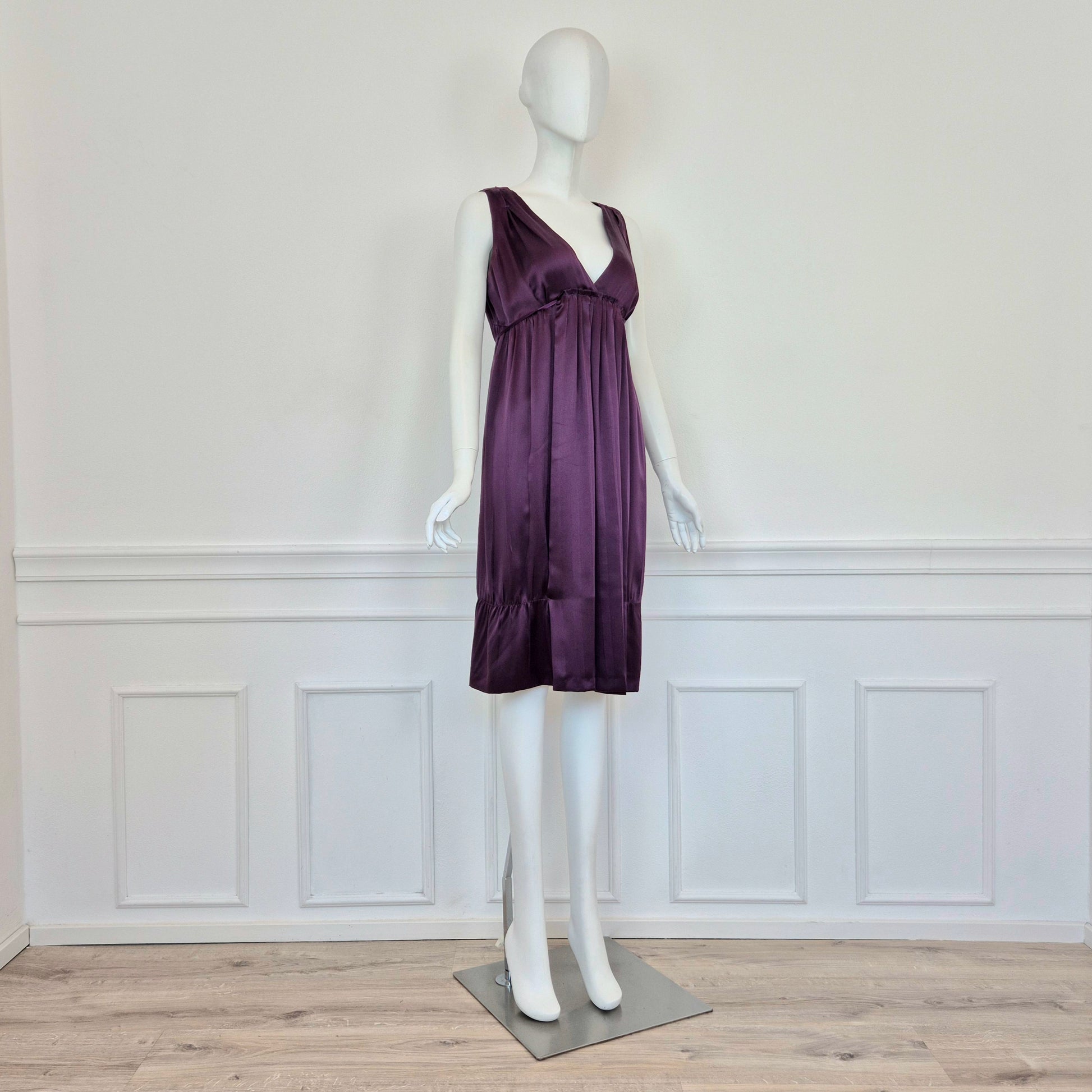 MIU MIU abito in pura seta color viola melanzana, con scollo a V, pieghe all'altezza del seno e due sottili lacci da chiudere sul retro in un fiocco per regolare il punto vita secondo necessità.