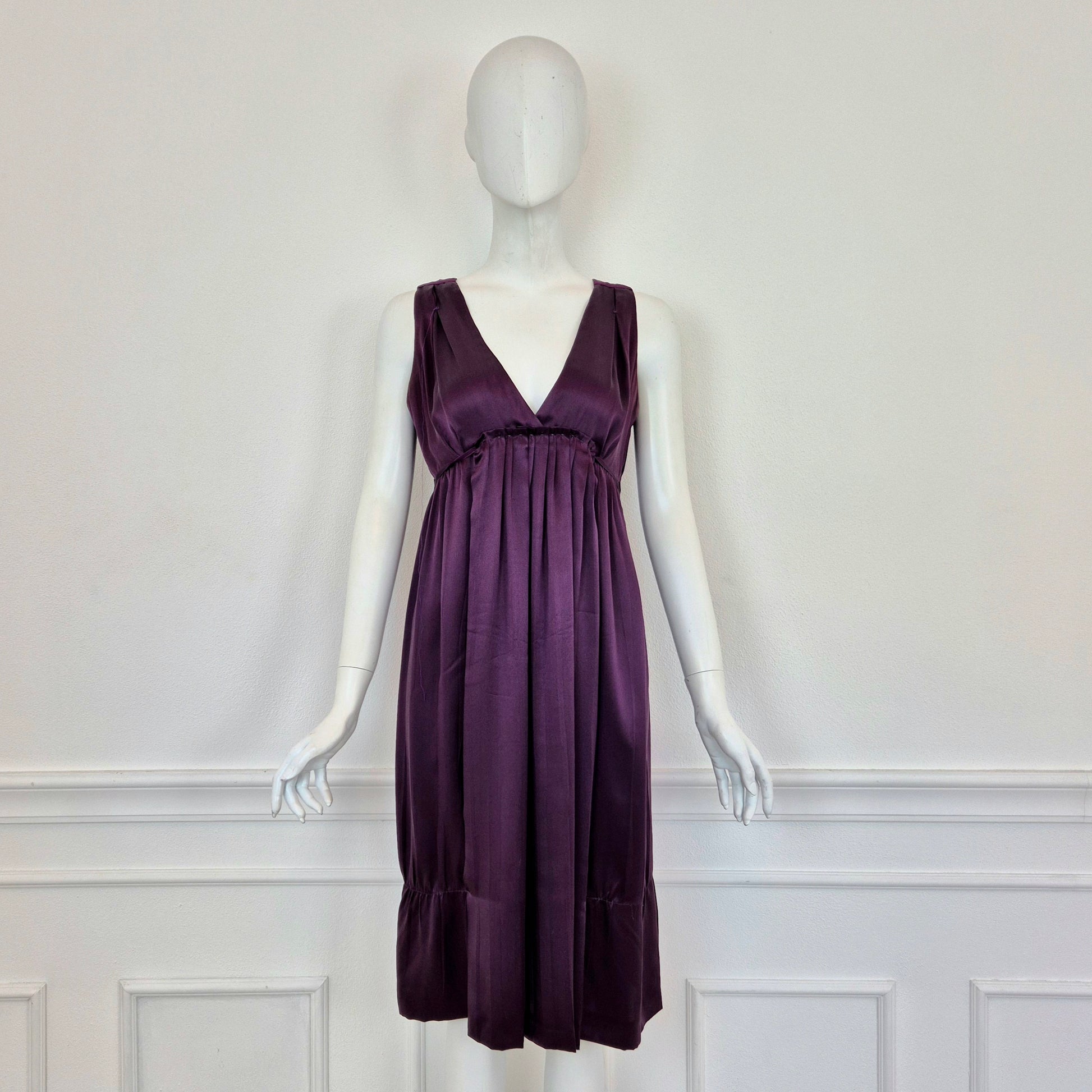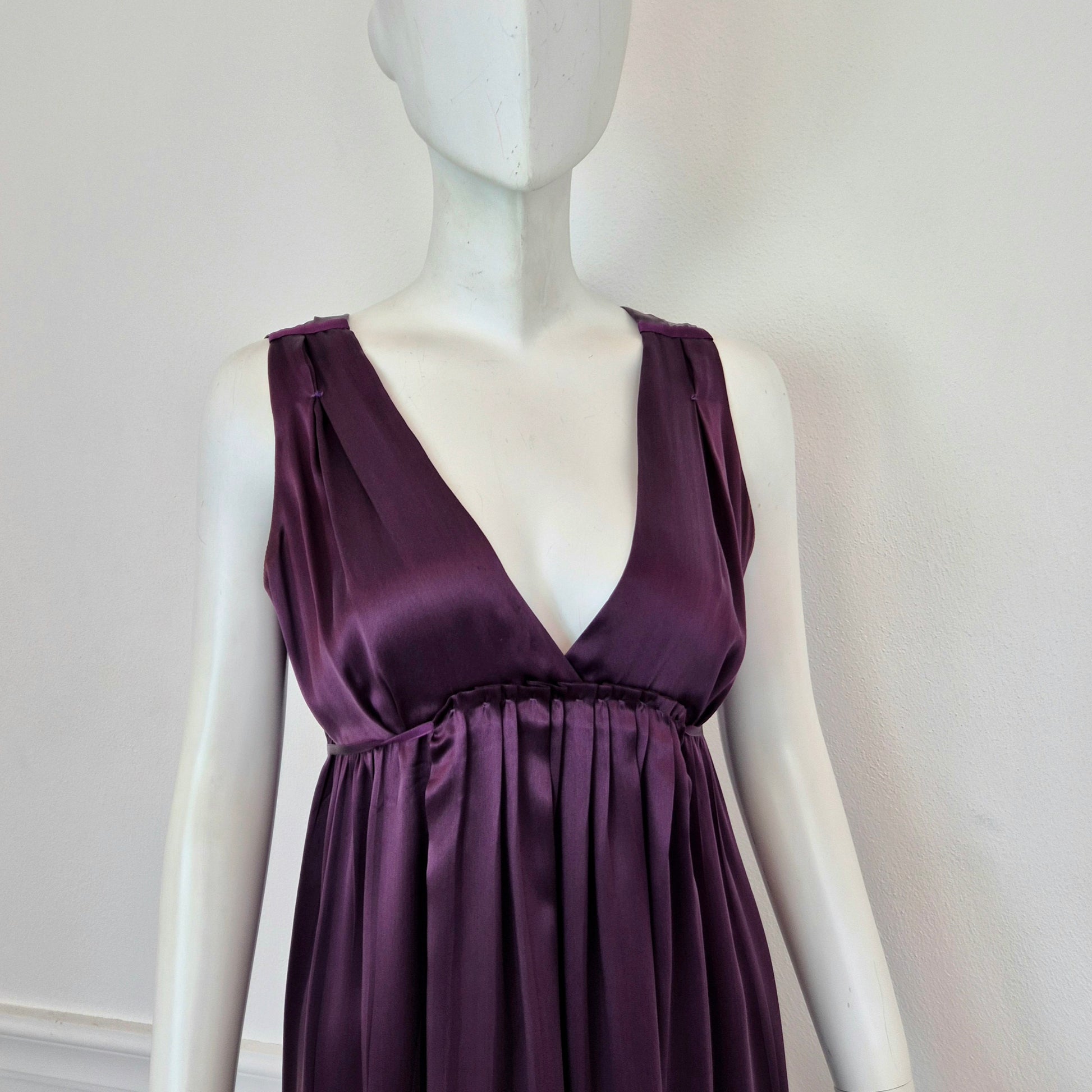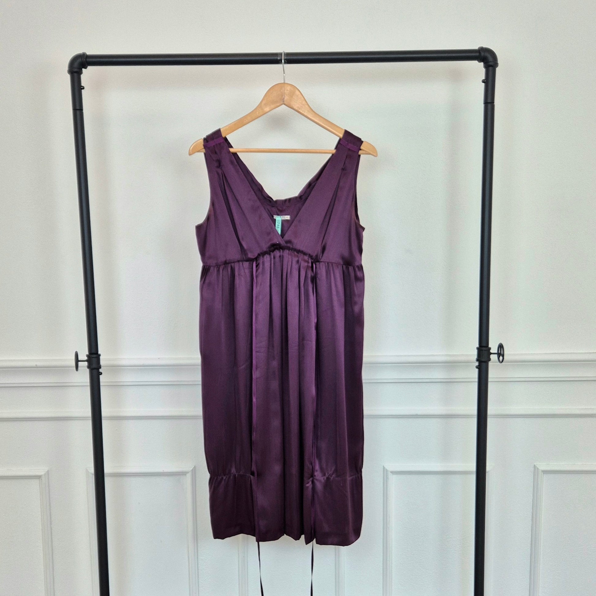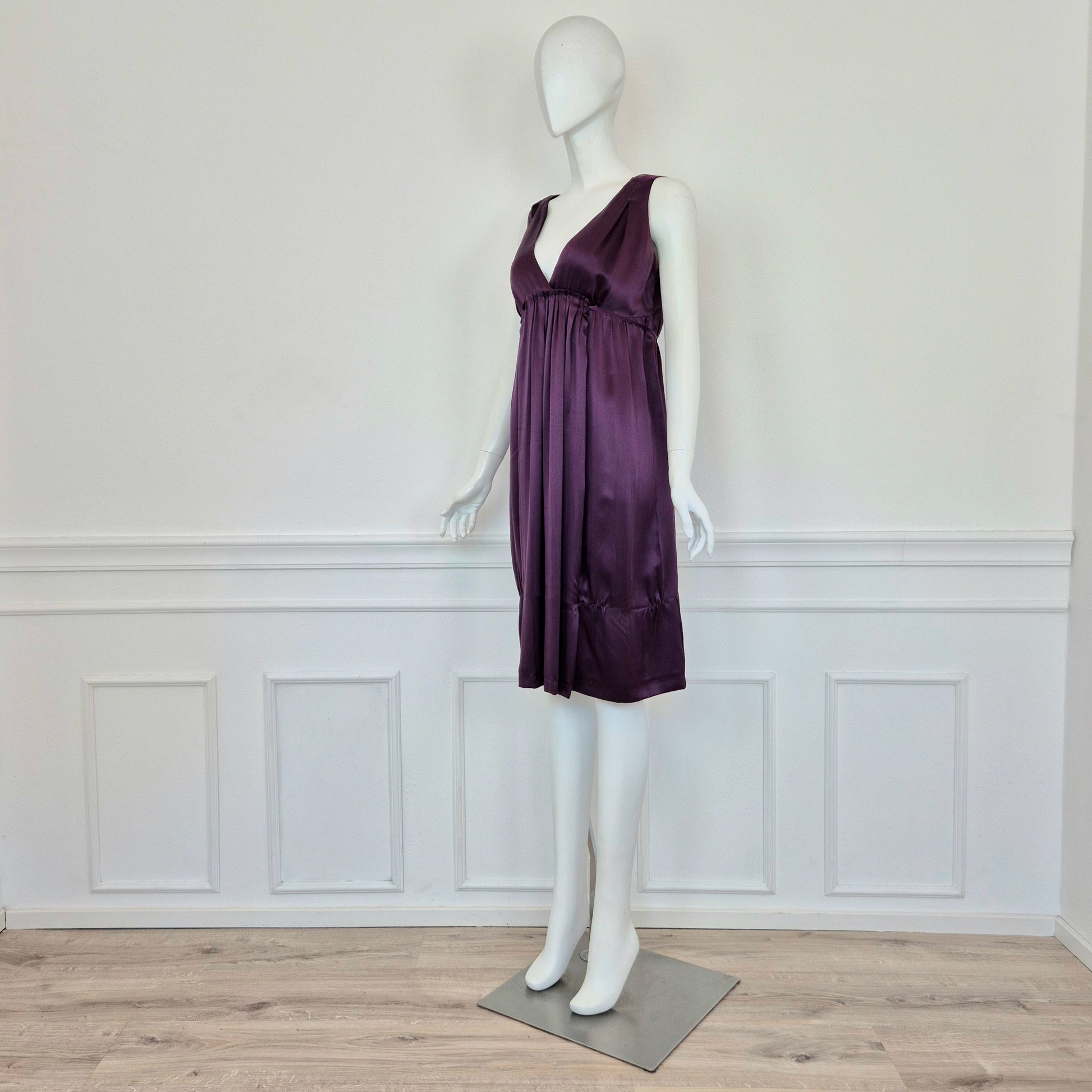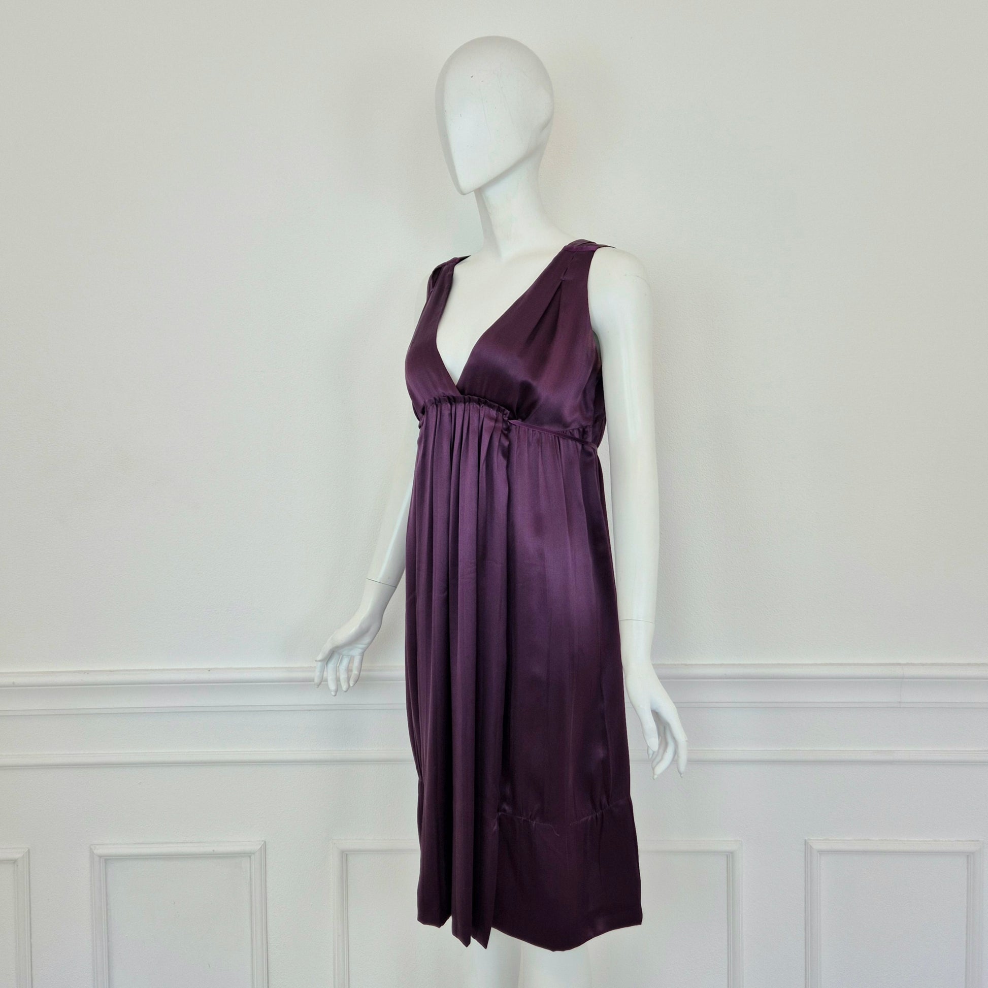 MIU MIU abito in pura seta color viola melanzana, con scollo a V, pieghe all'altezza del seno e due sottili lacci da chiudere sul retro in un fiocco per regolare il punto vita secondo necessità.