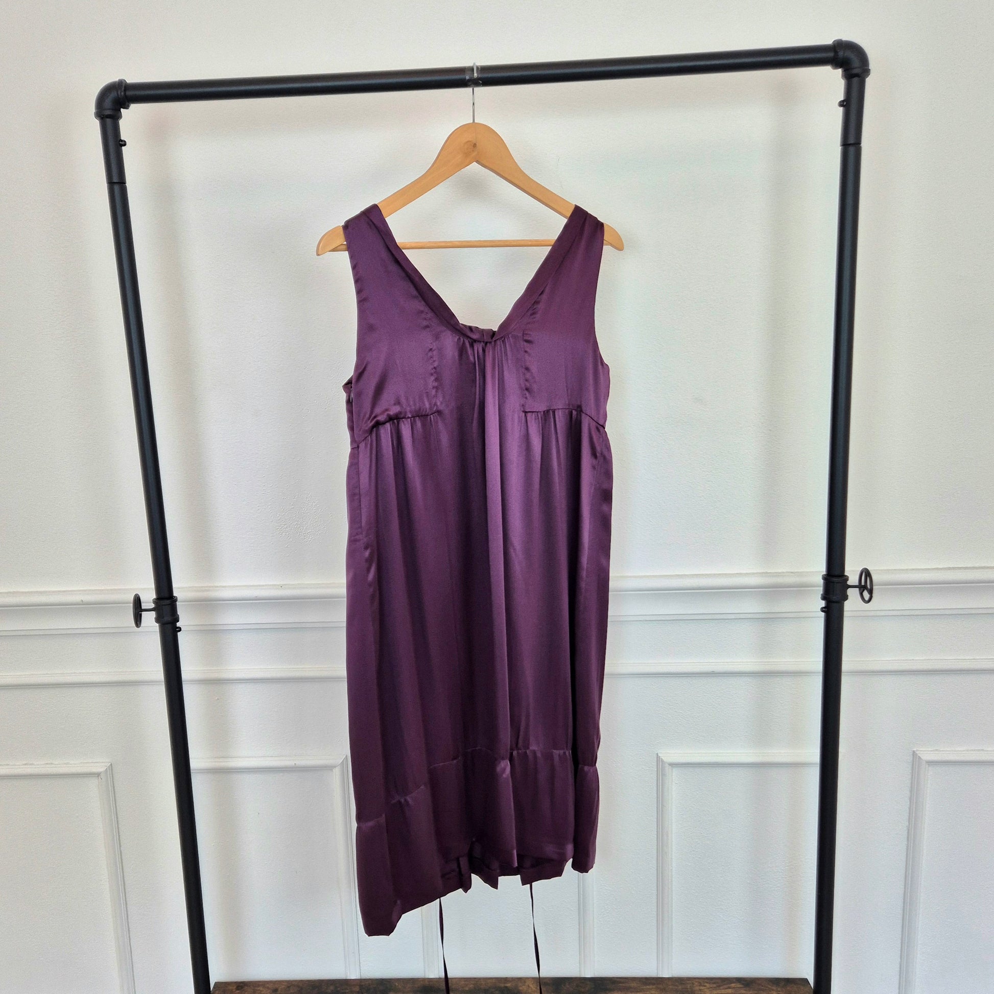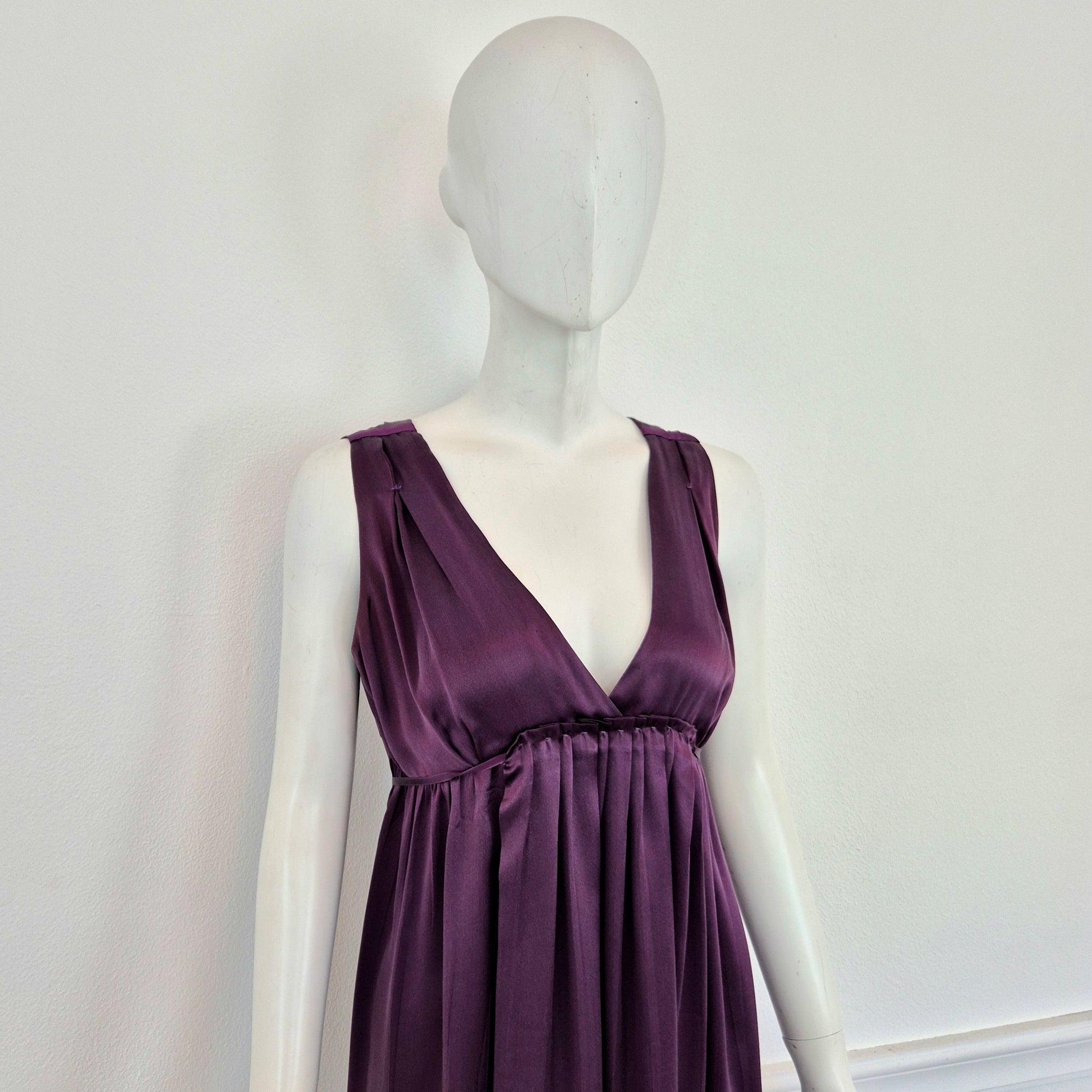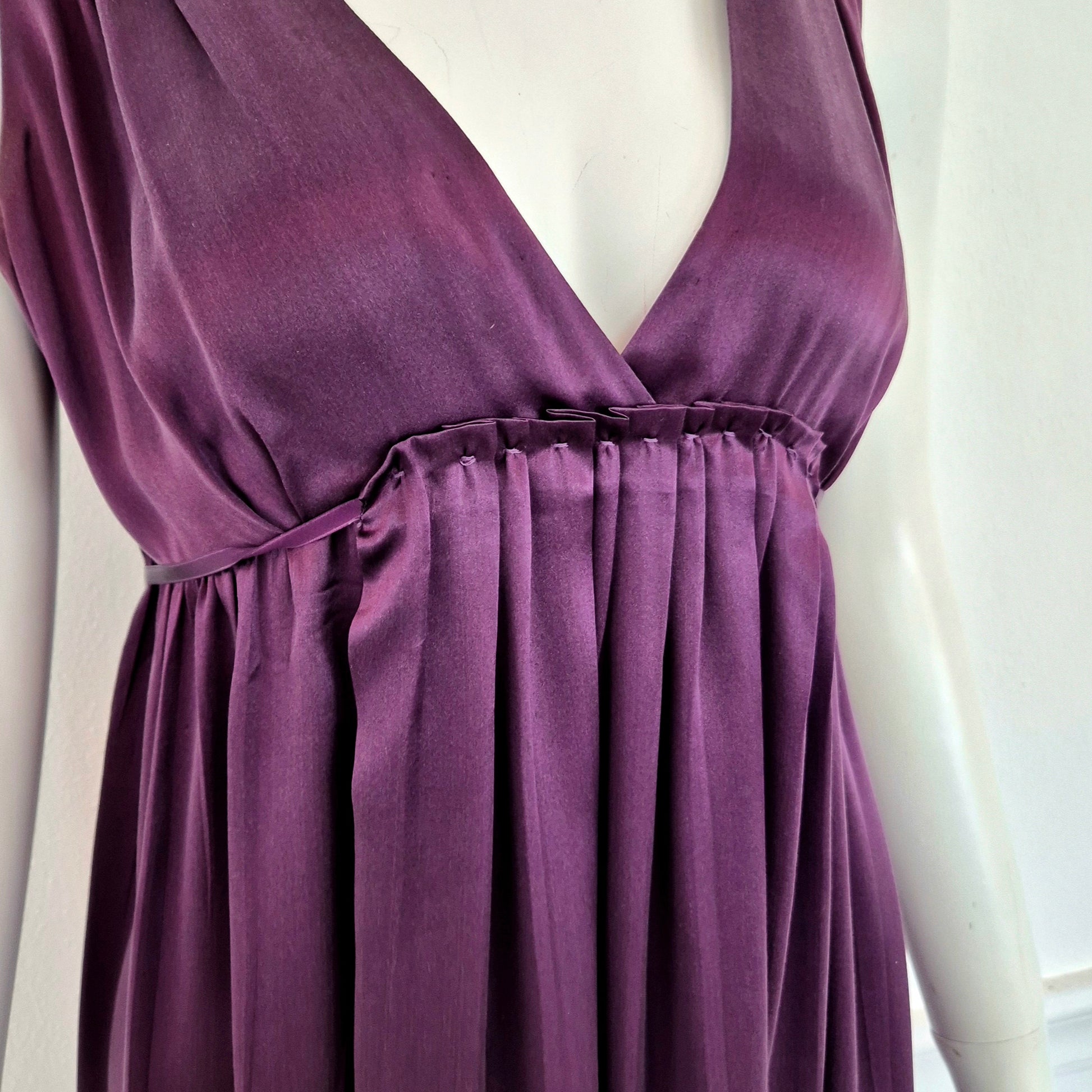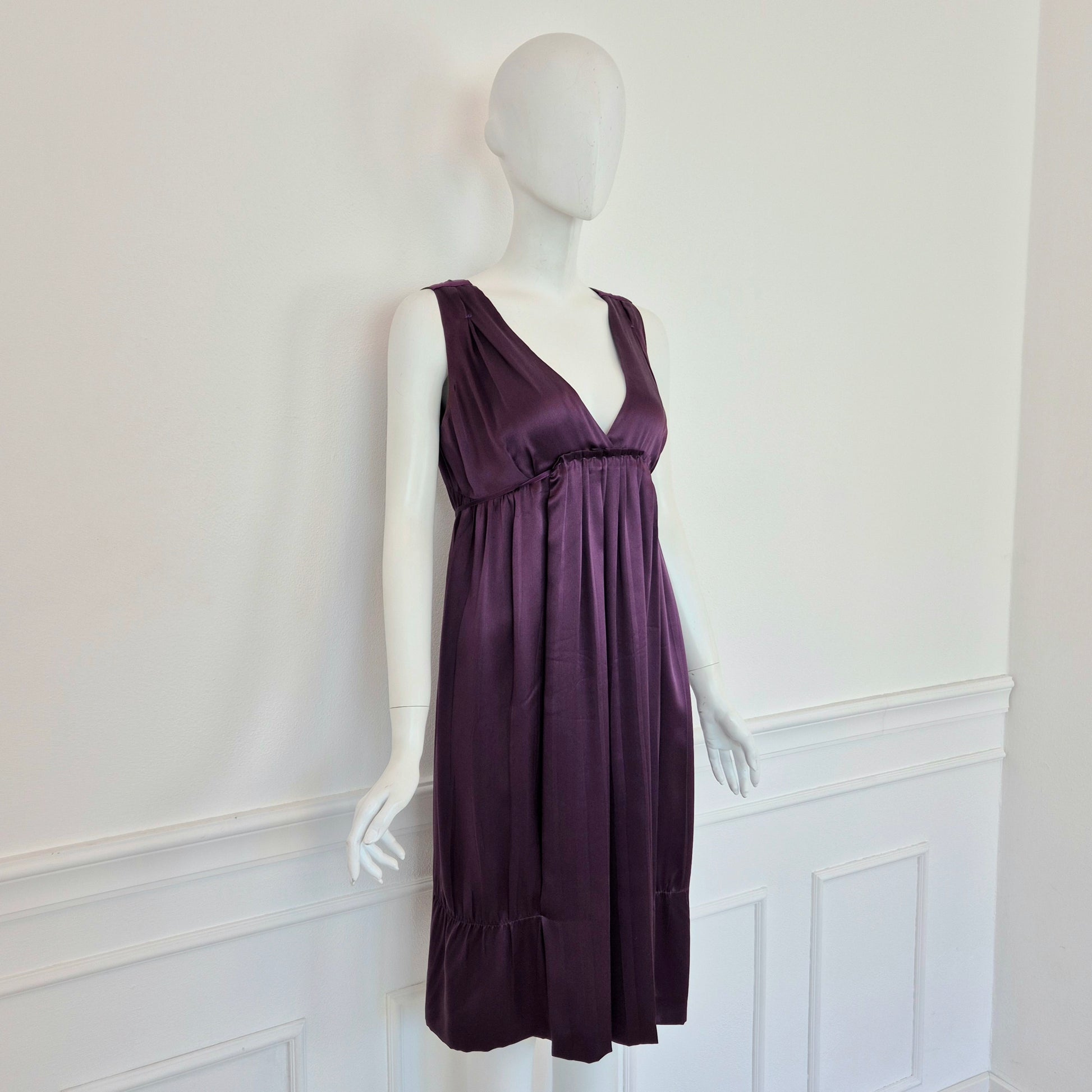 MIU MIU abito in pura seta color viola melanzana, con scollo a V, pieghe all'altezza del seno e due sottili lacci da chiudere sul retro in un fiocco per regolare il punto vita secondo necessità.