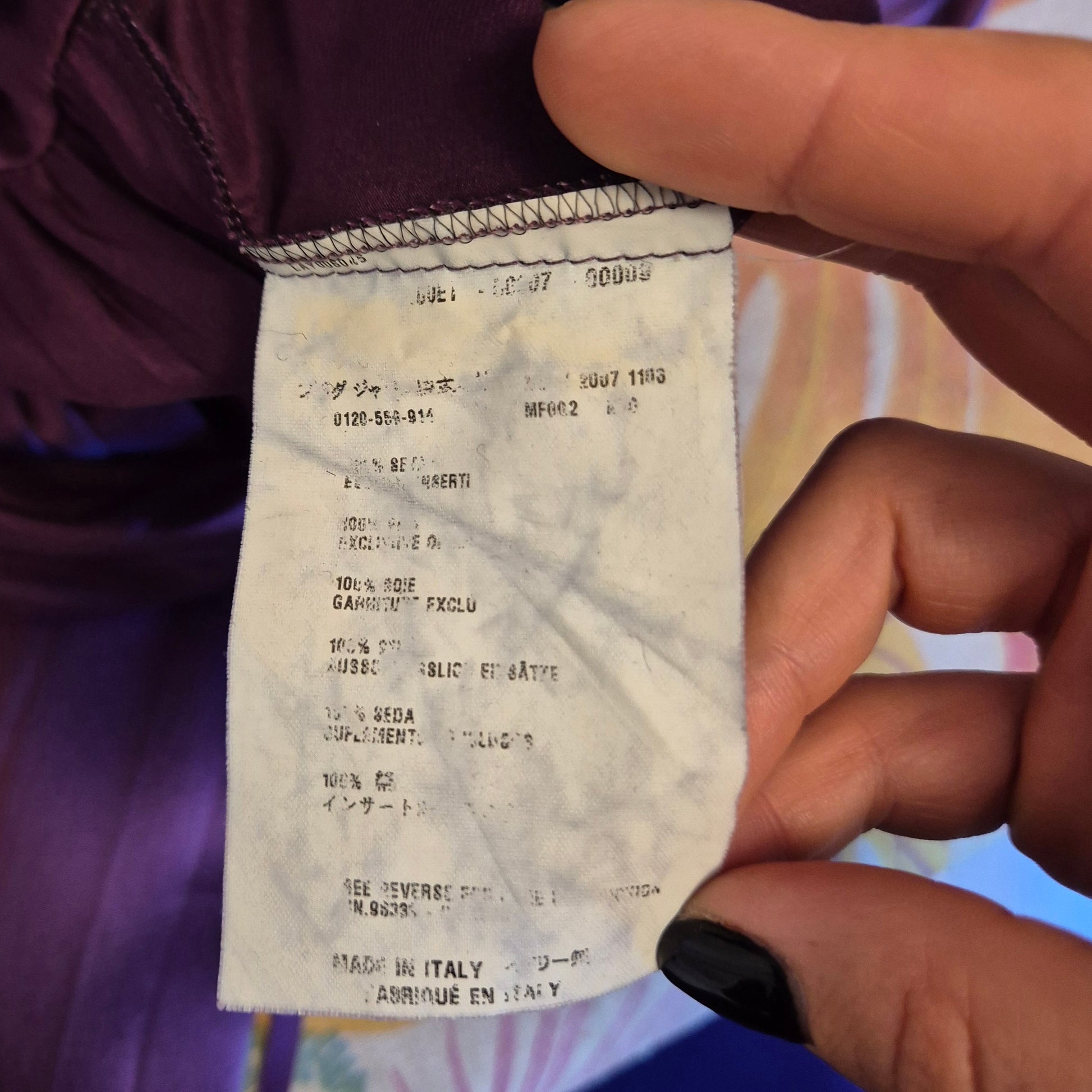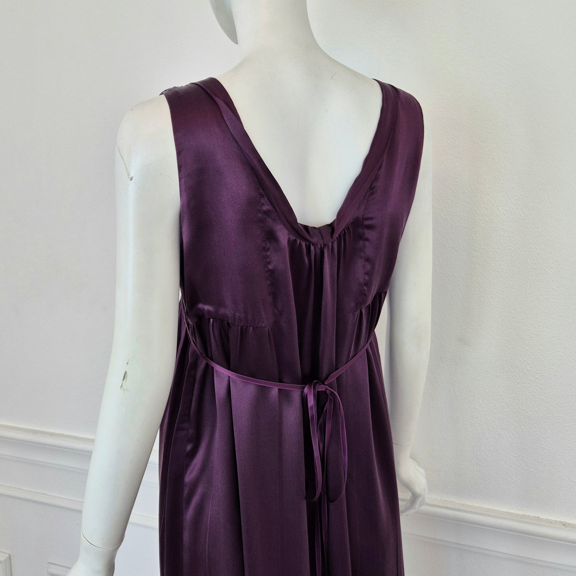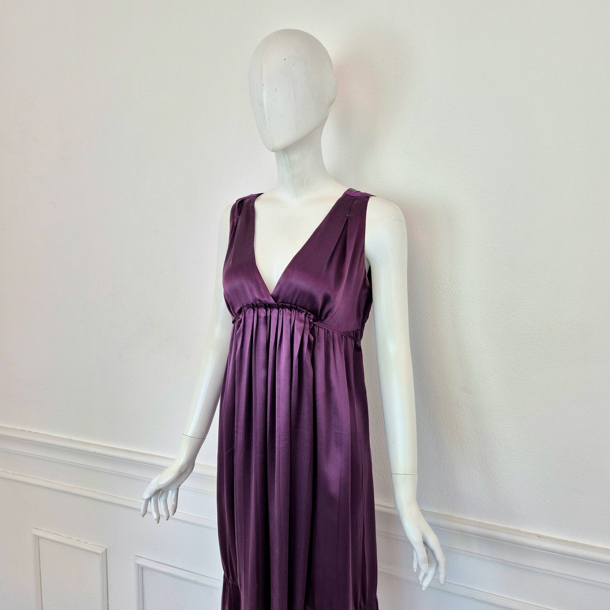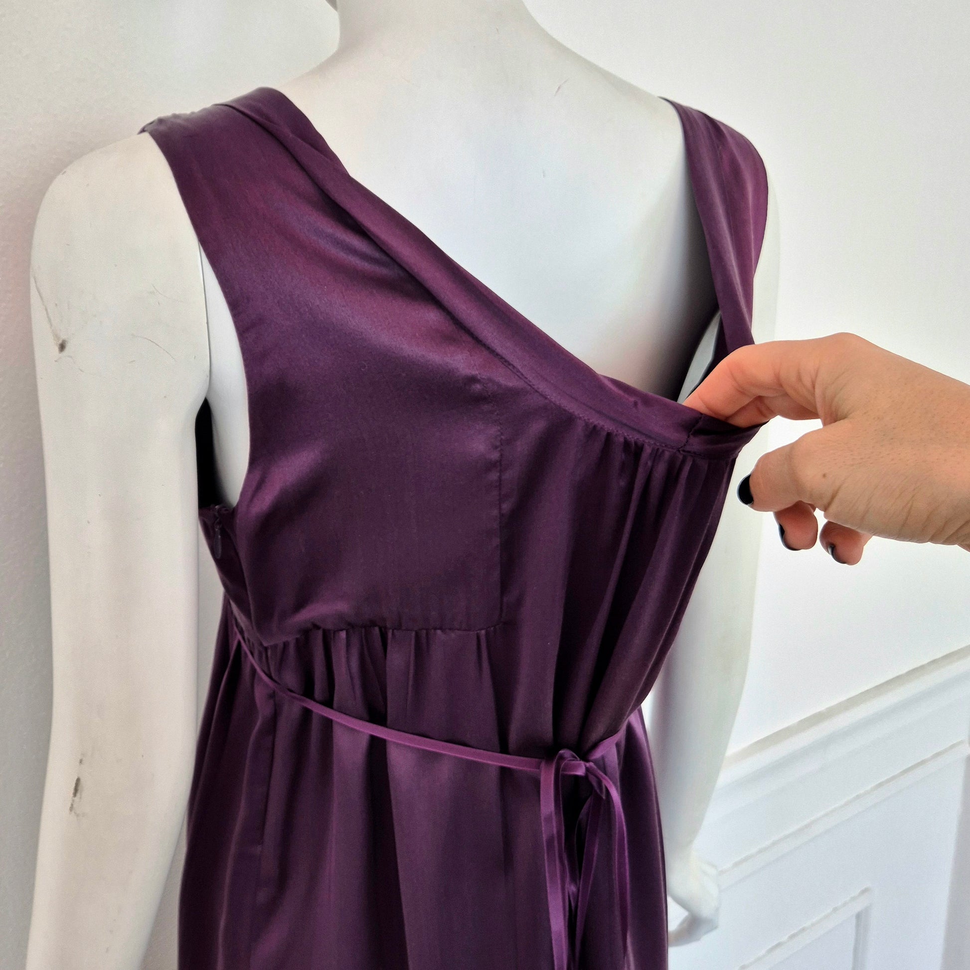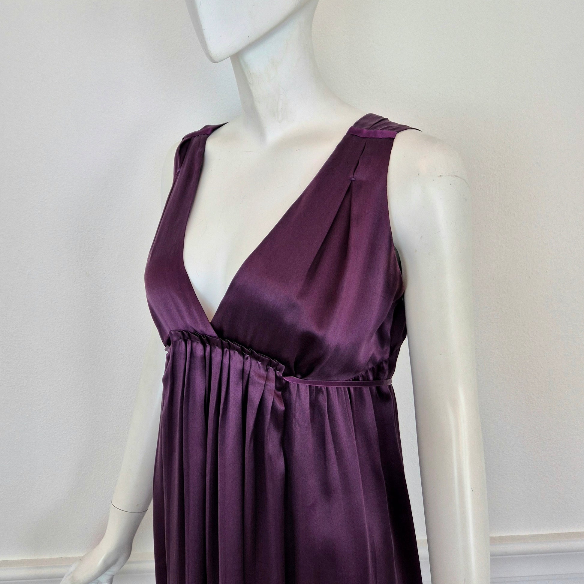 MIU MIU abito in pura seta color viola melanzana, con scollo a V, pieghe all'altezza del seno e due sottili lacci da chiudere sul retro in un fiocco per regolare il punto vita secondo necessità.