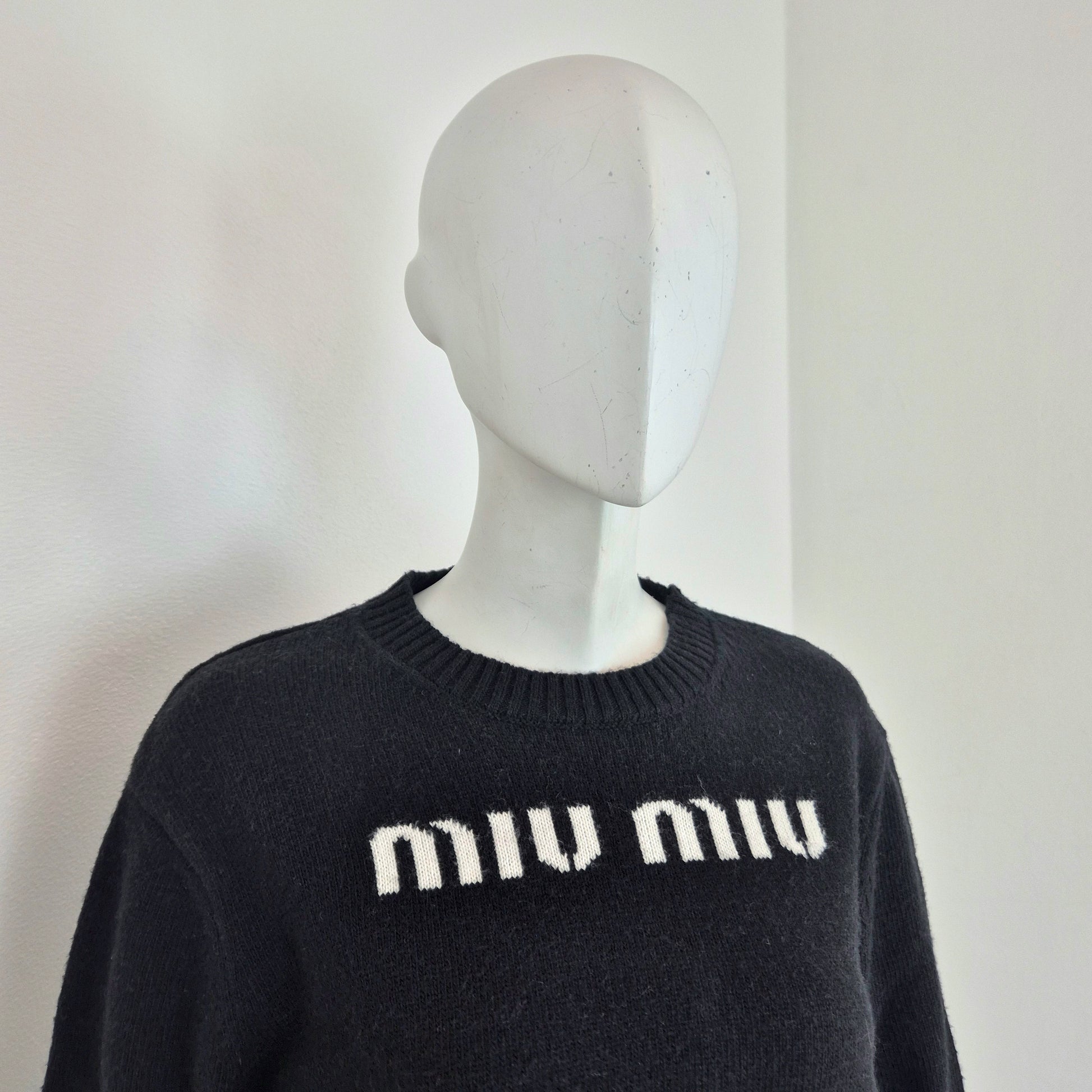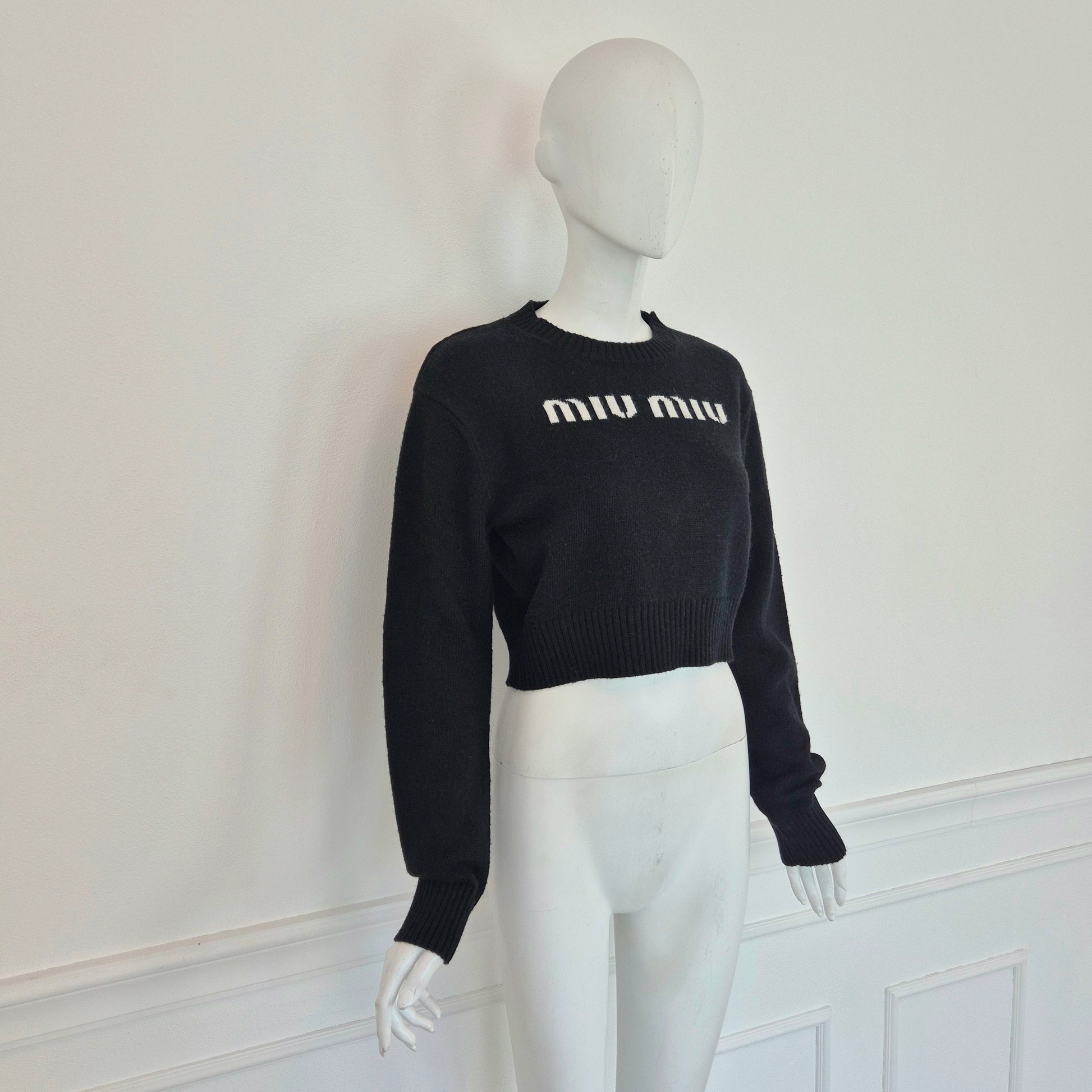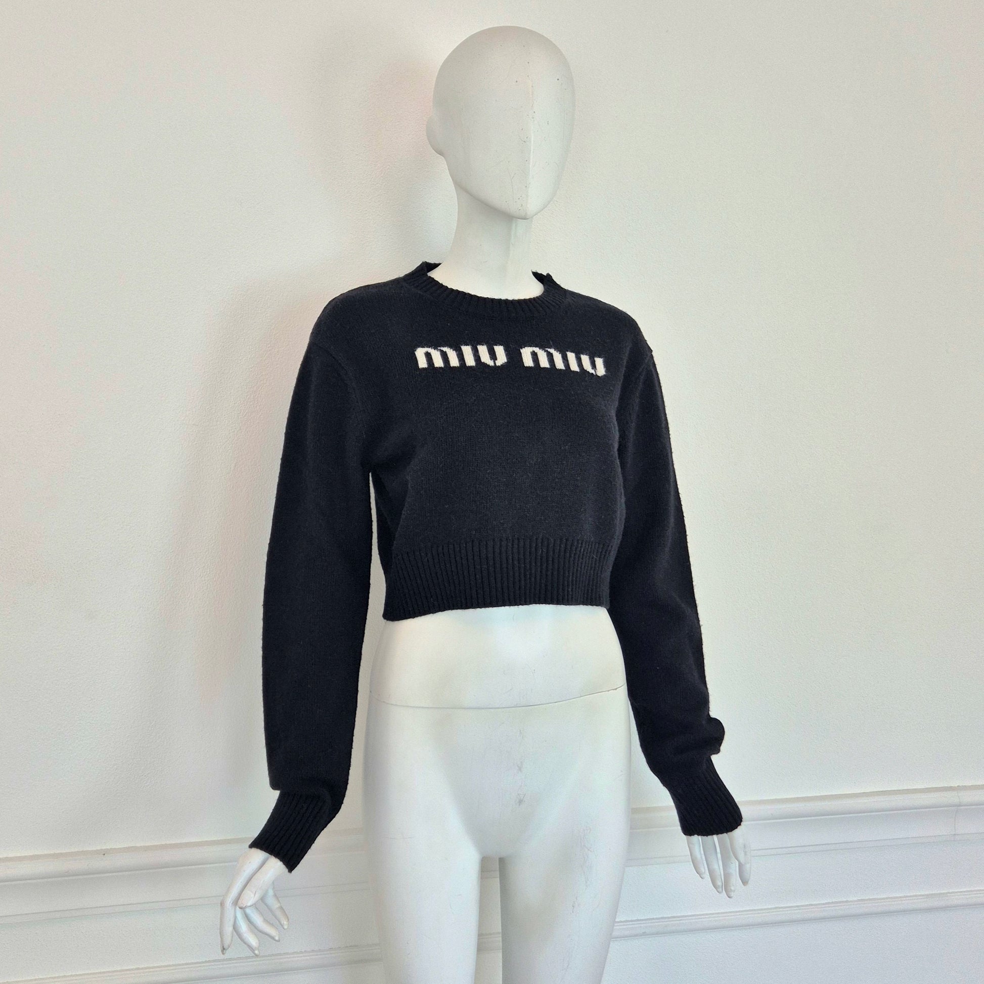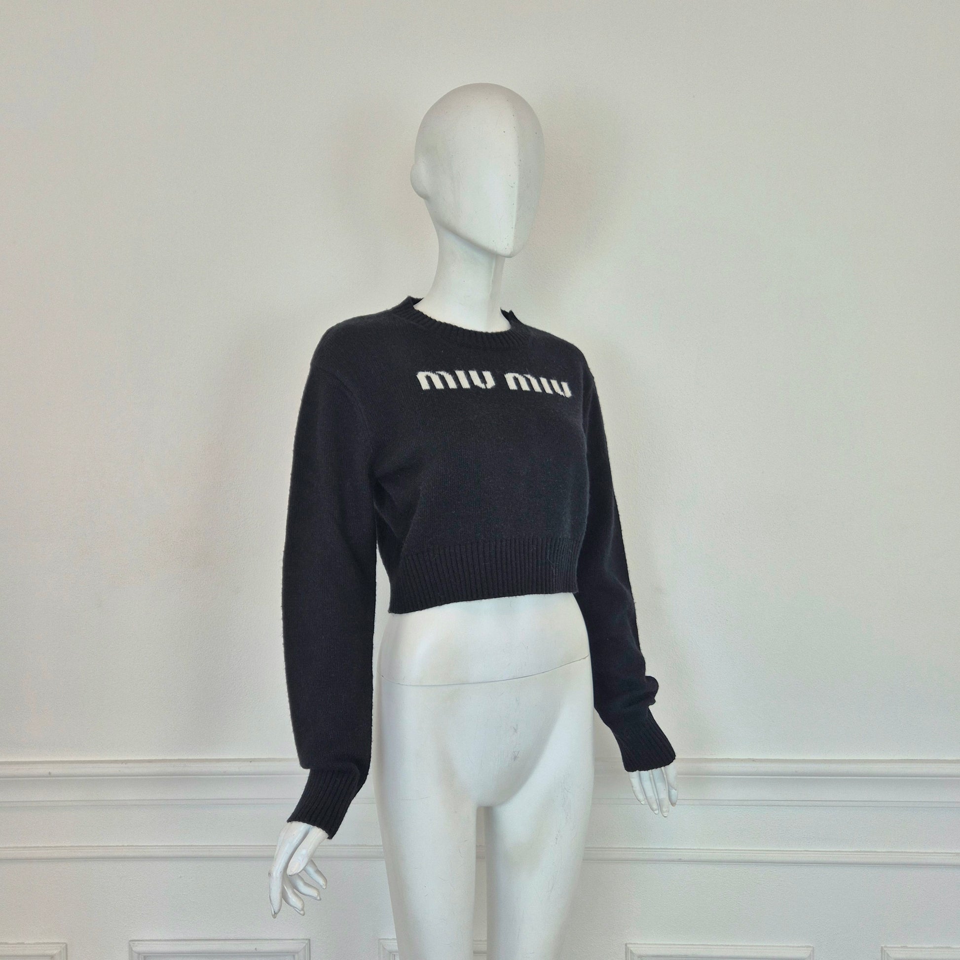 MIU MIU maglione nero dal taglio corto in lana e cashmere con logo frontale.