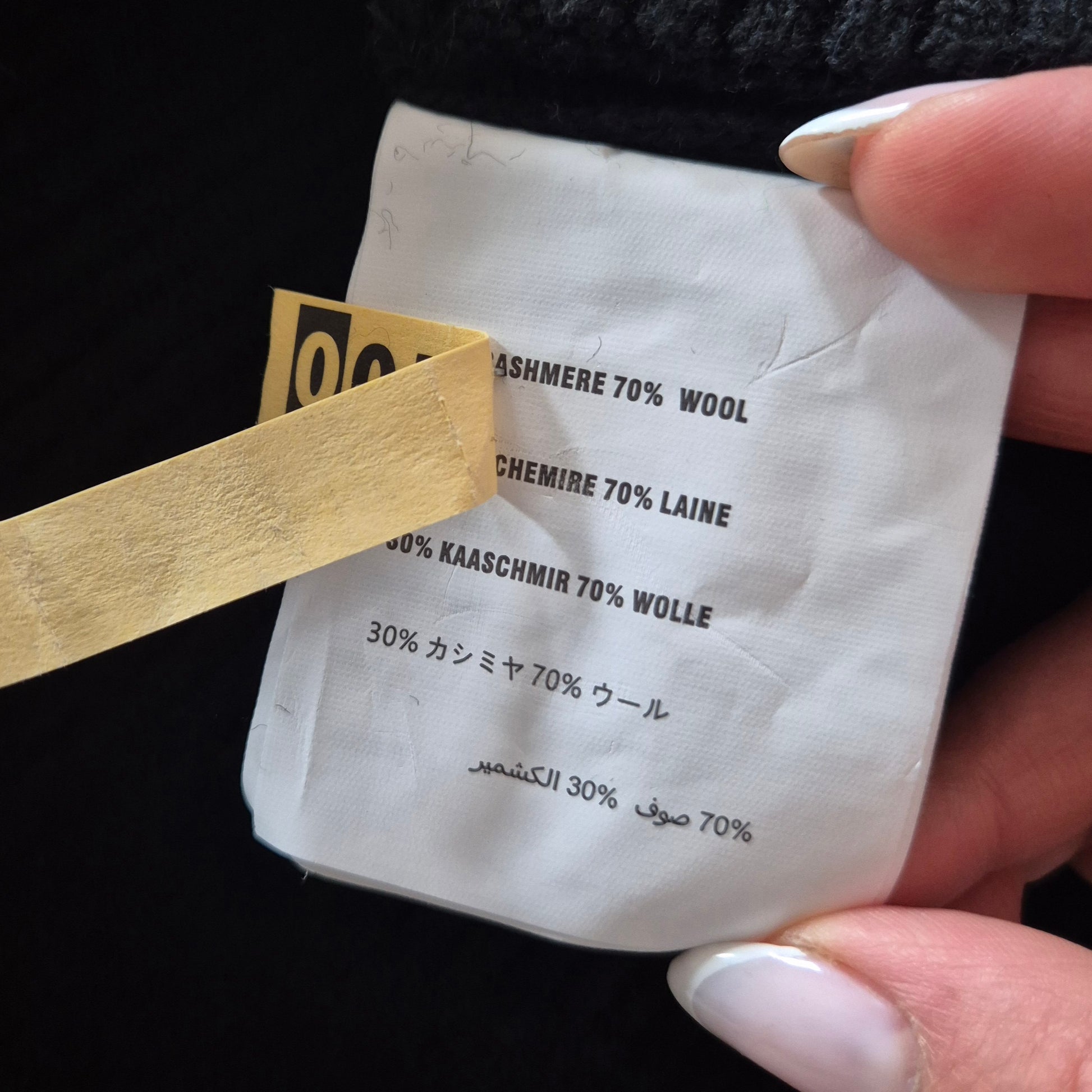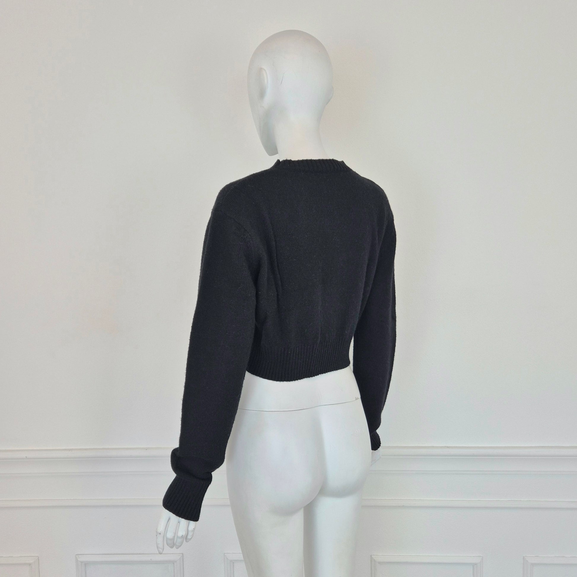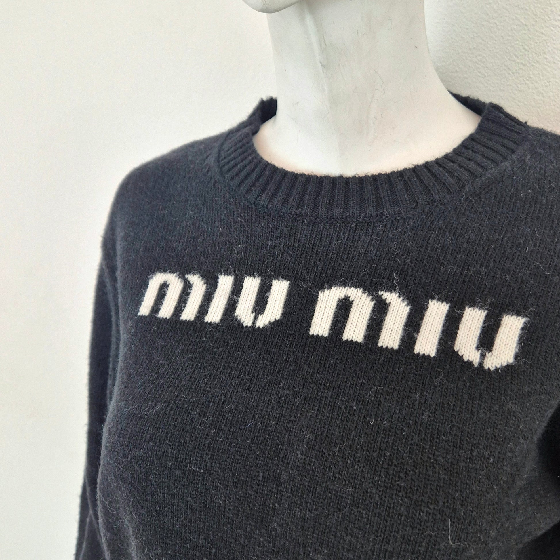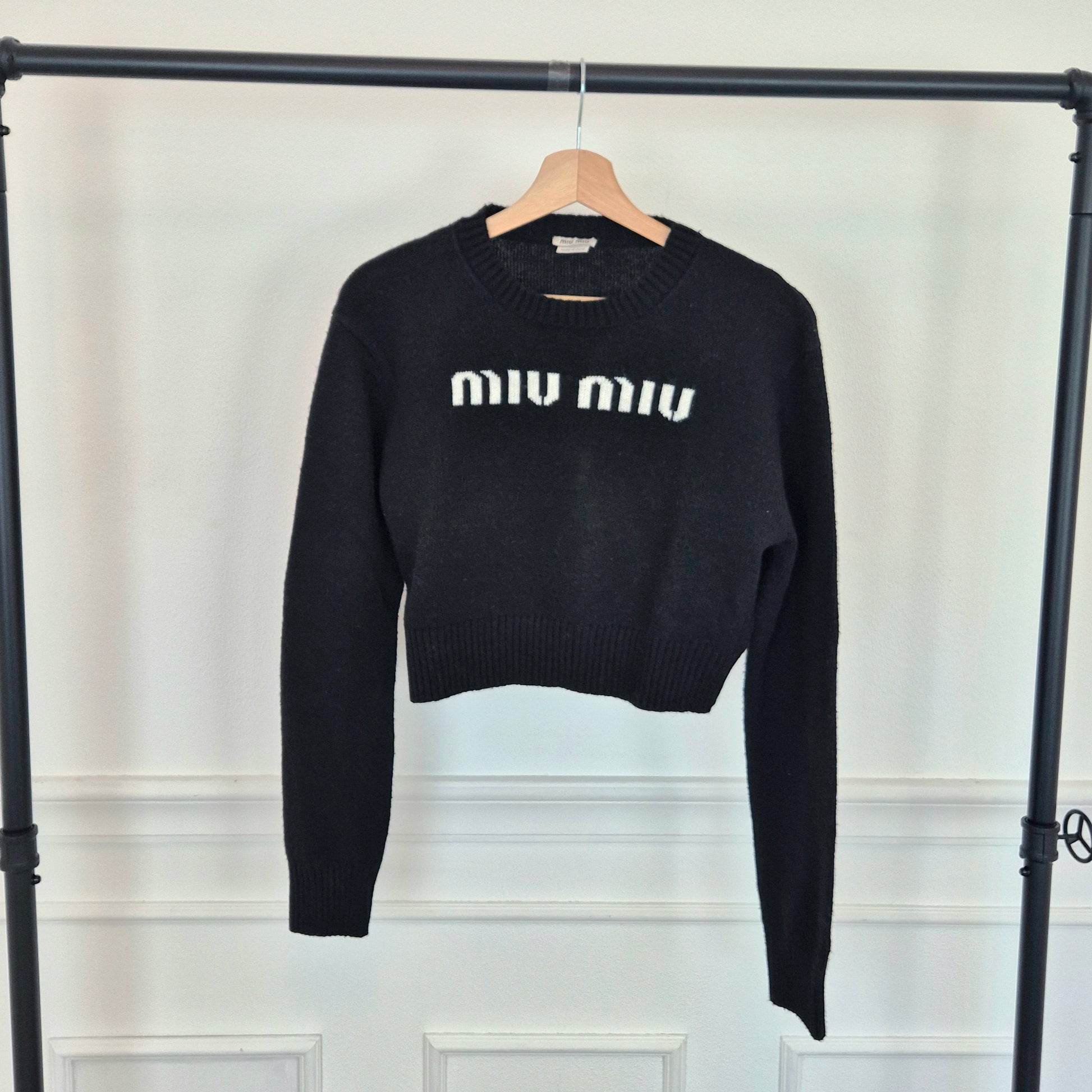 MIU MIU maglione nero dal taglio corto in lana e cashmere con logo frontale.