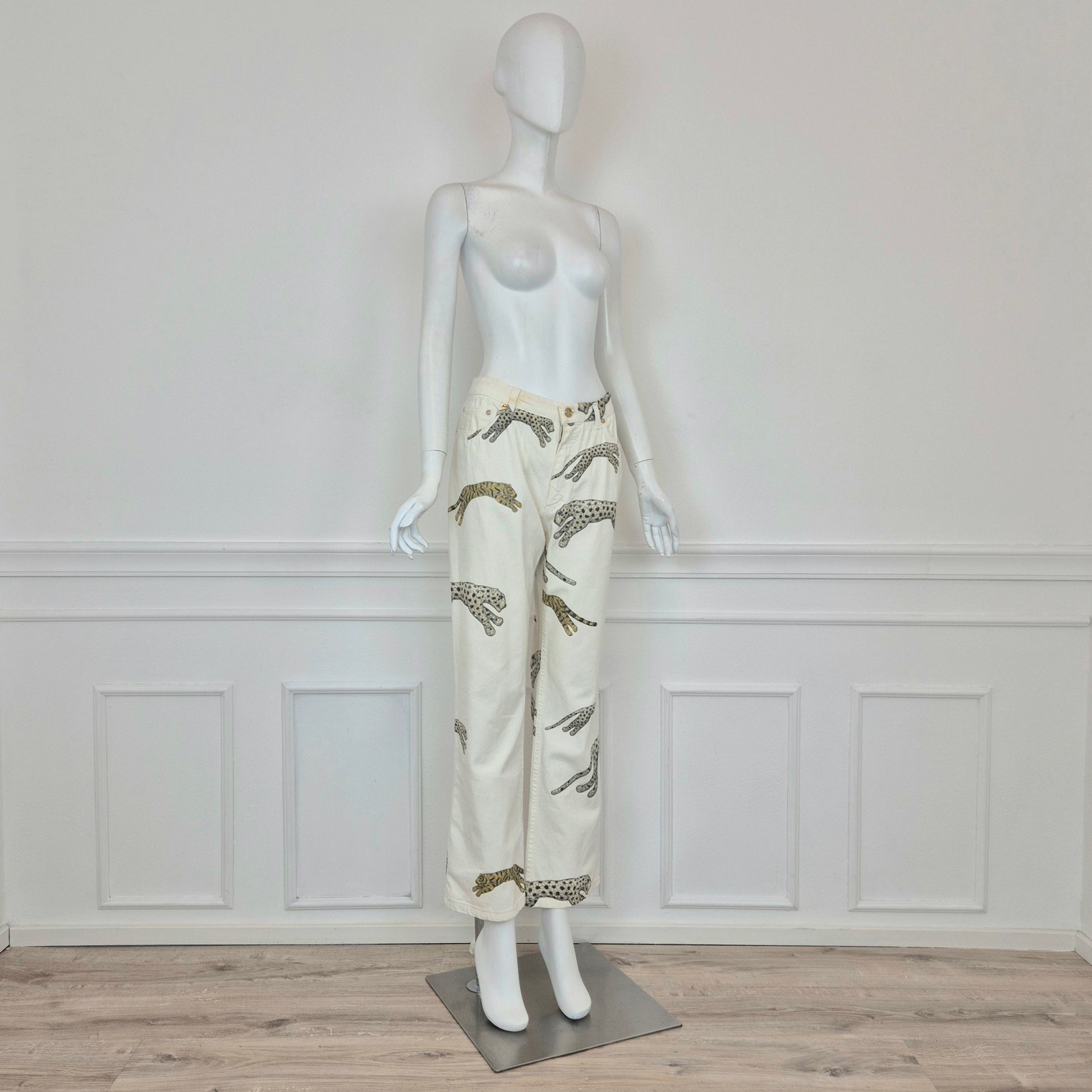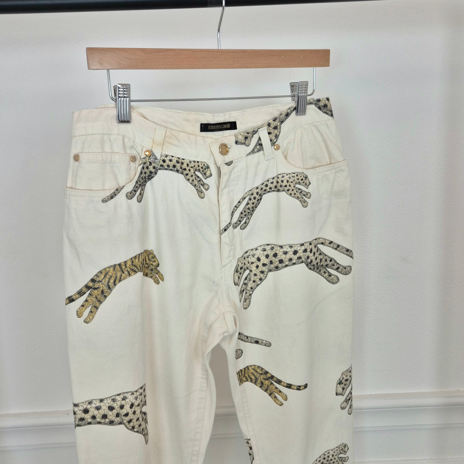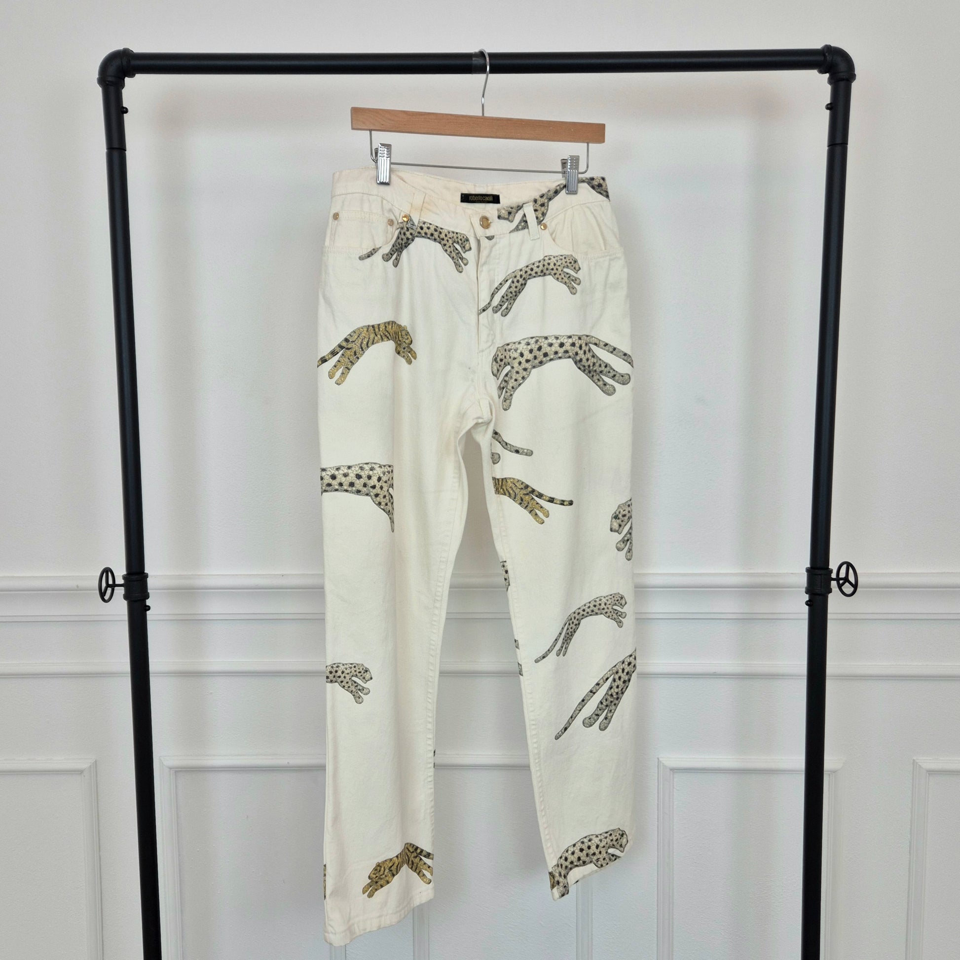 ROBERTO CAVALLI (spring summer 2002) jeans vintage dall'iconica stampa raffigurante tigri e leopardi effetto "mosaico" su fondo bianco. Gamba dritta, chiusura tramite zip e bottone, classiche cinque tasche.