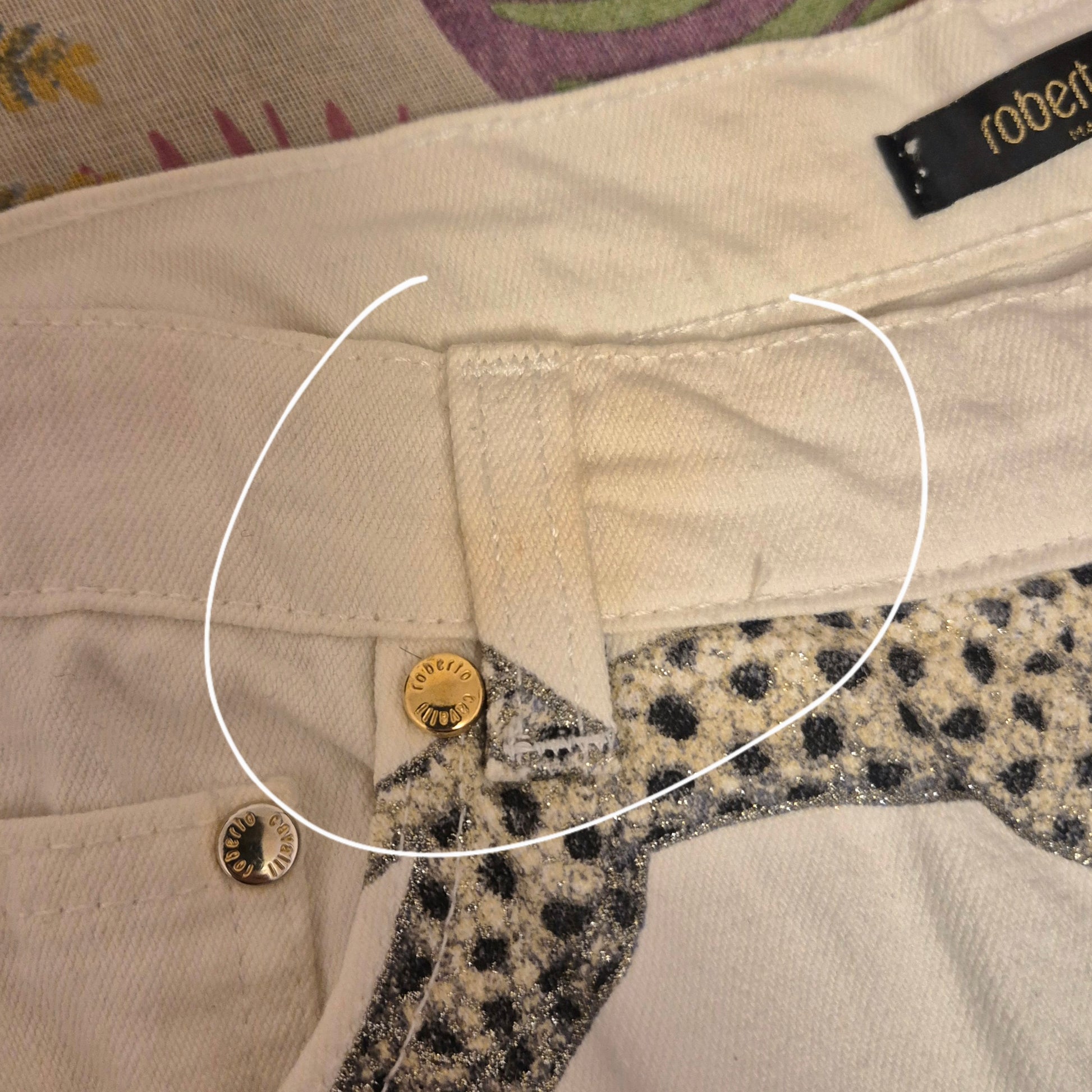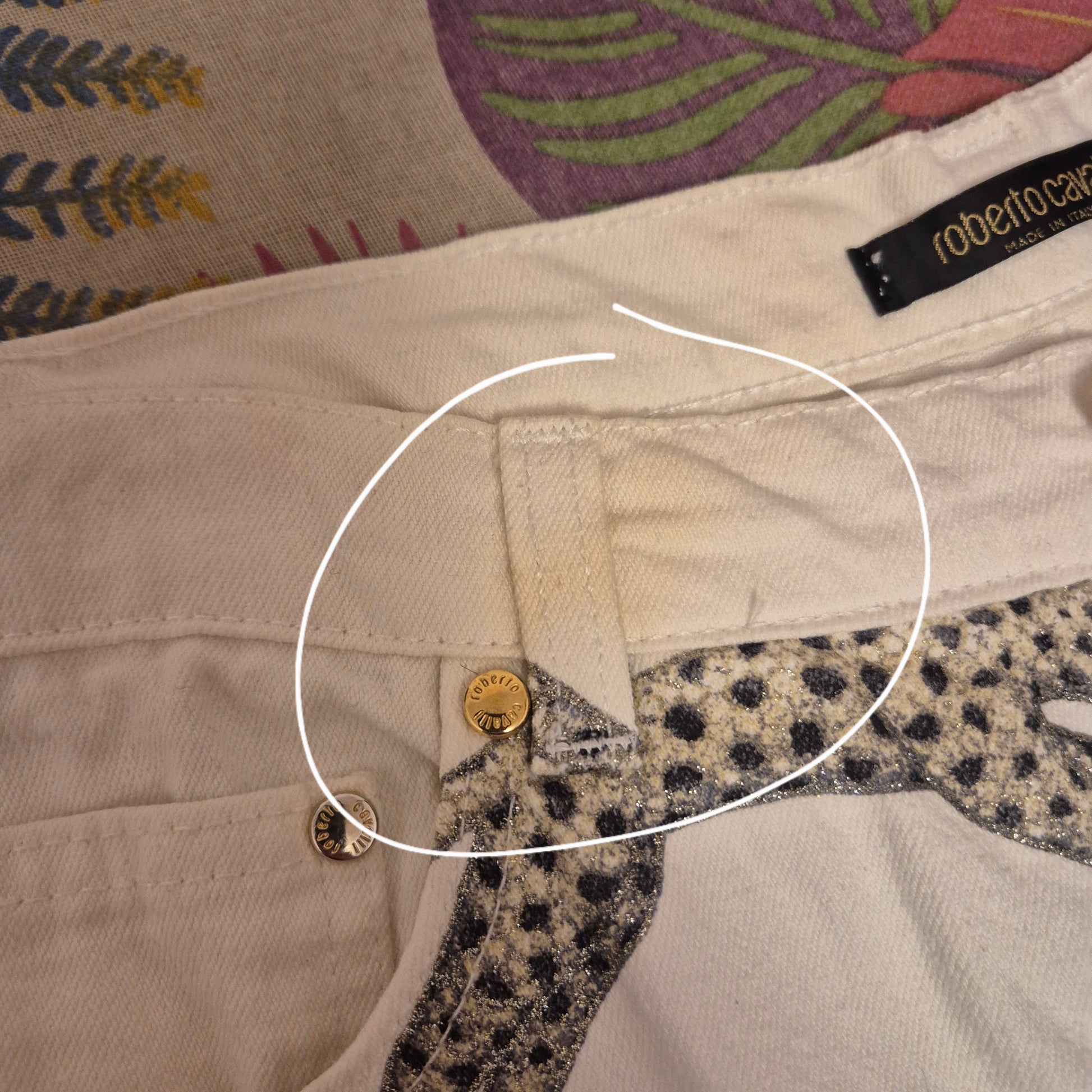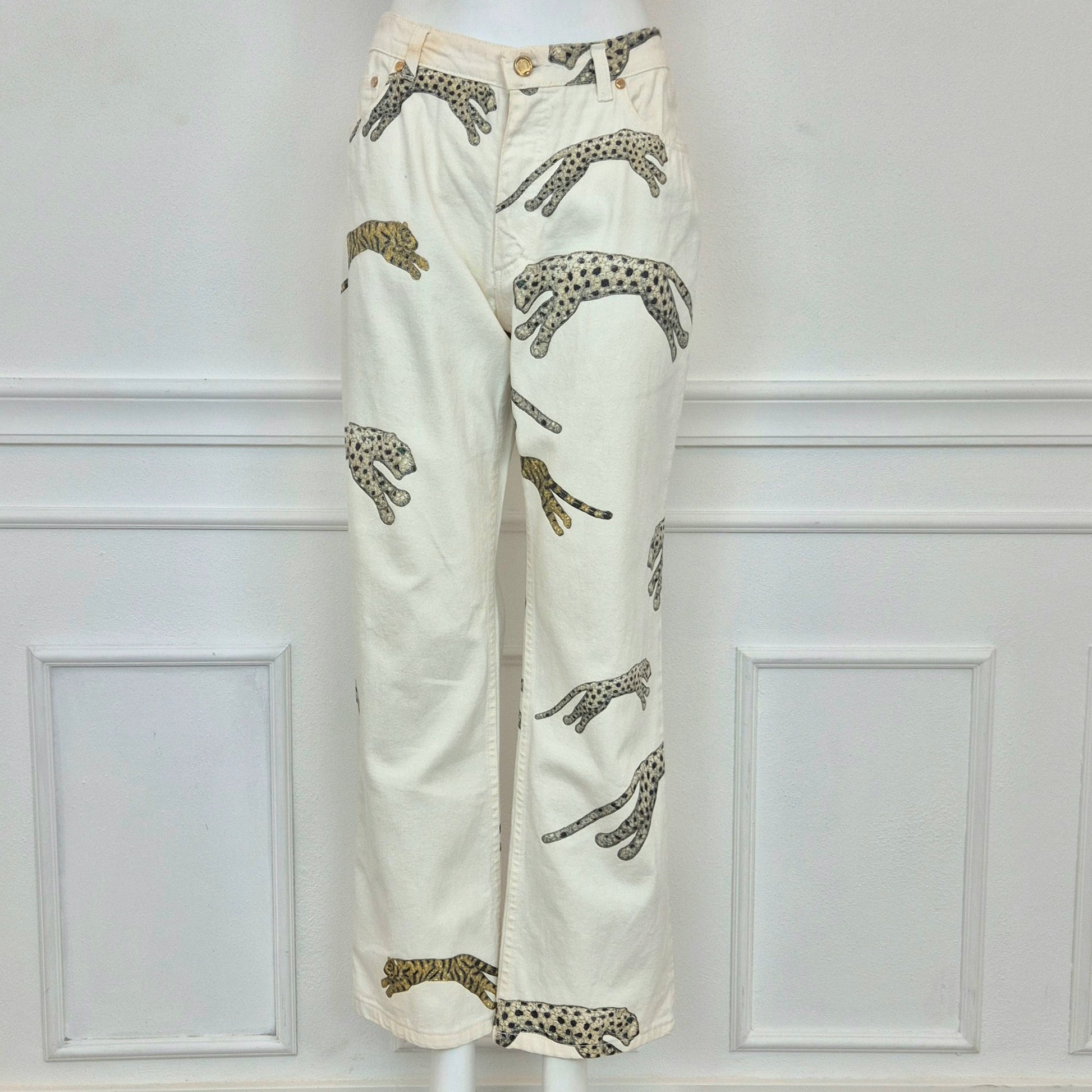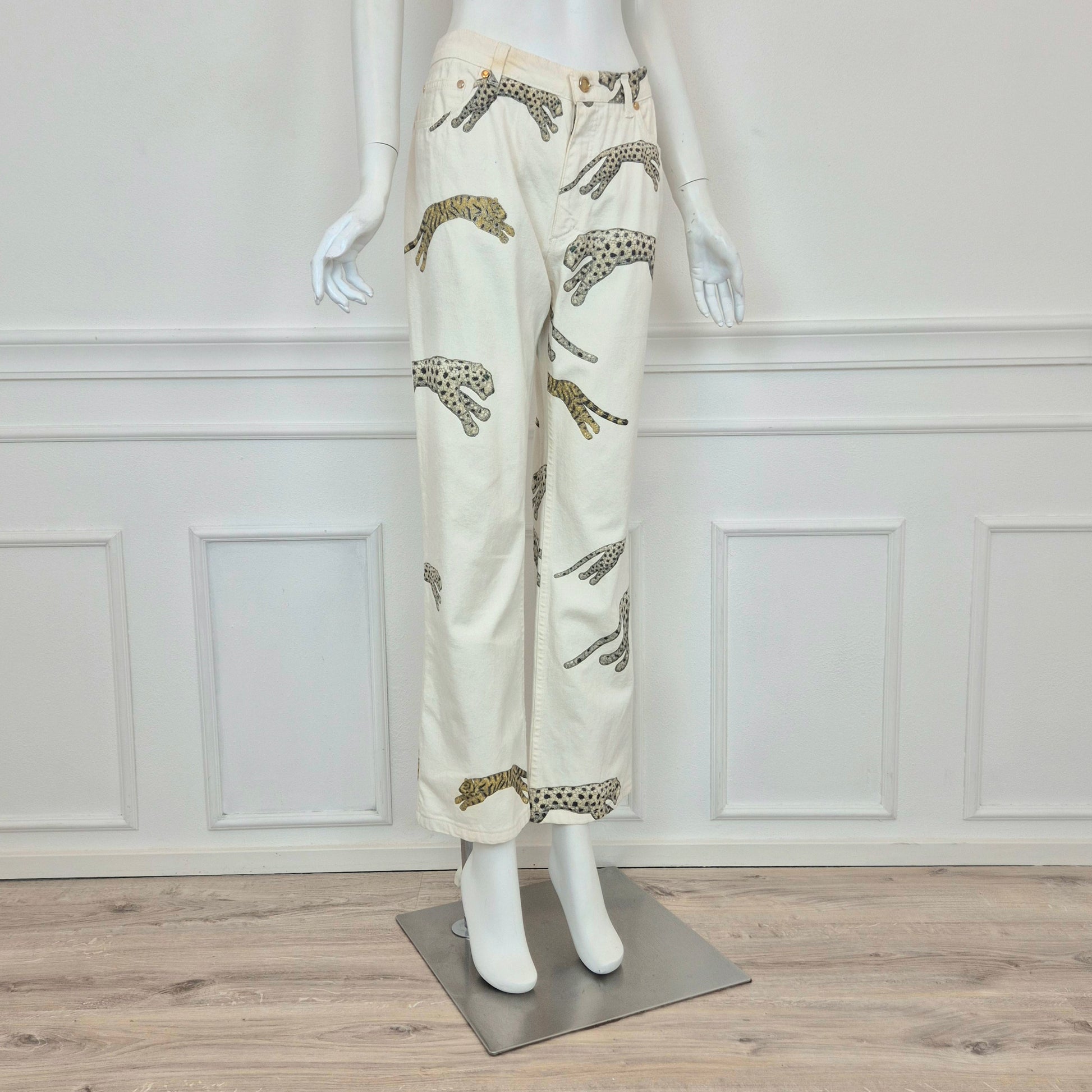 ROBERTO CAVALLI (spring summer 2002) jeans vintage dall'iconica stampa raffigurante tigri e leopardi effetto "mosaico" su fondo bianco. Gamba dritta, chiusura tramite zip e bottone, classiche cinque tasche.