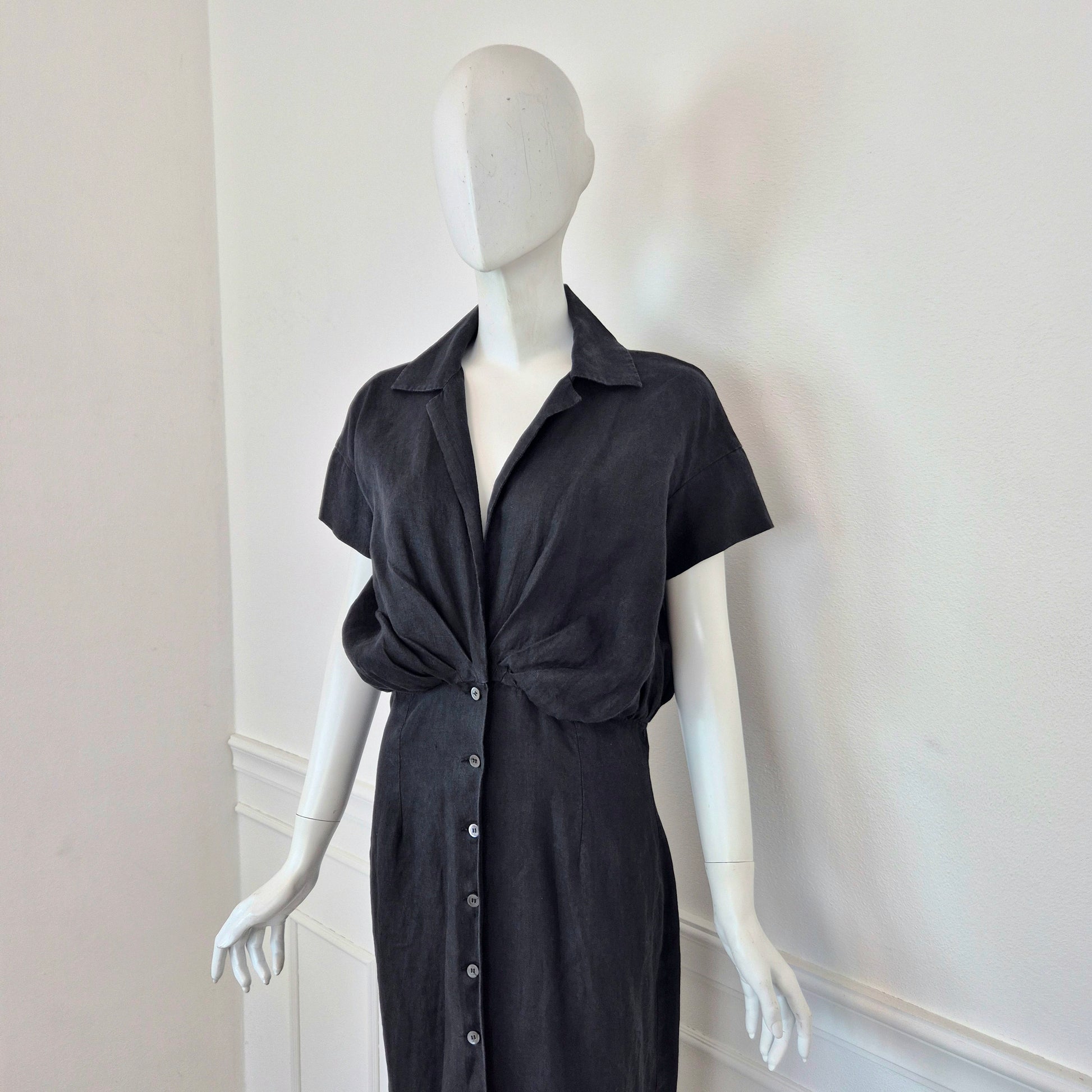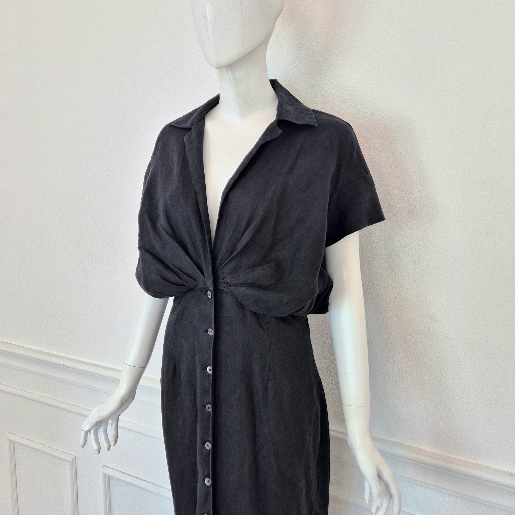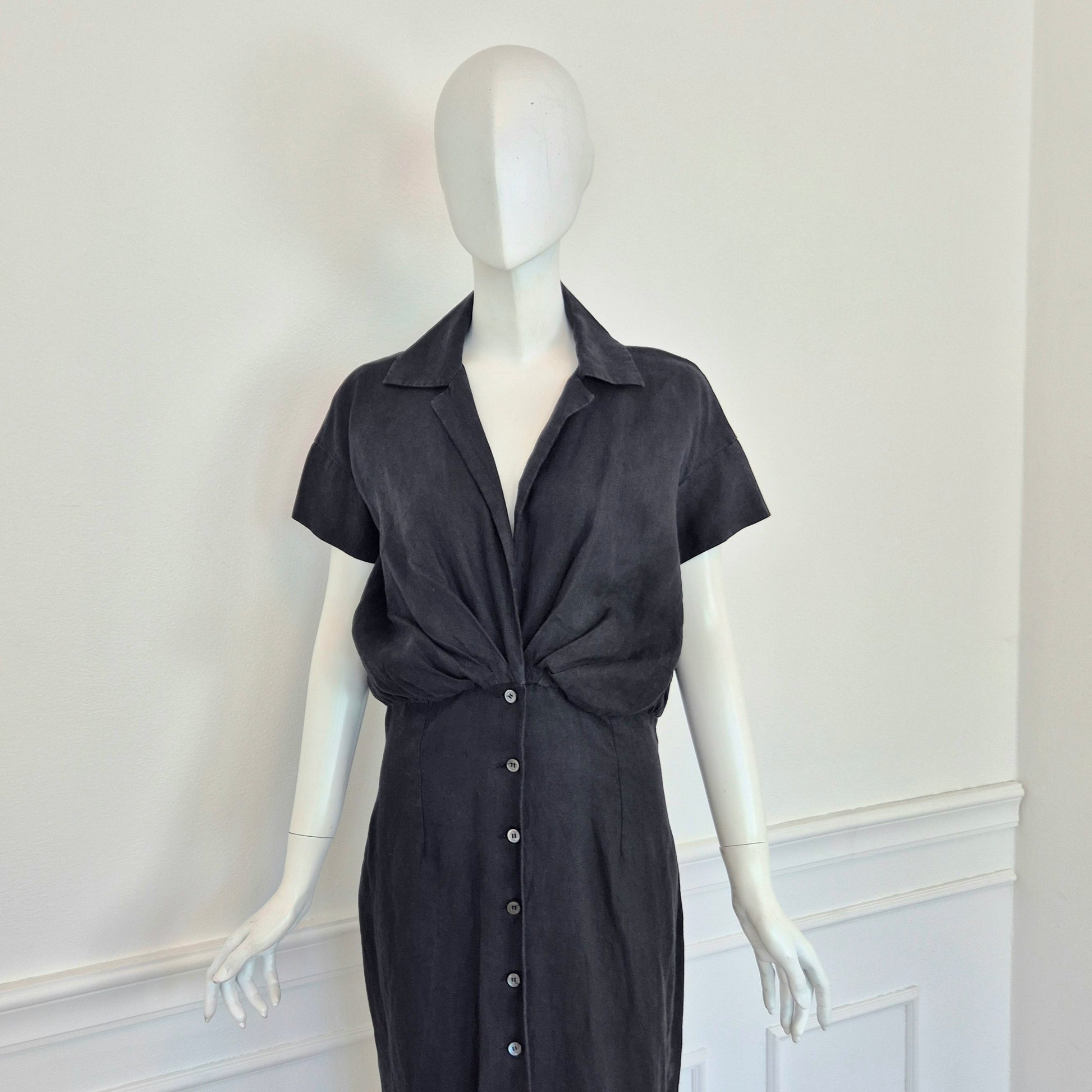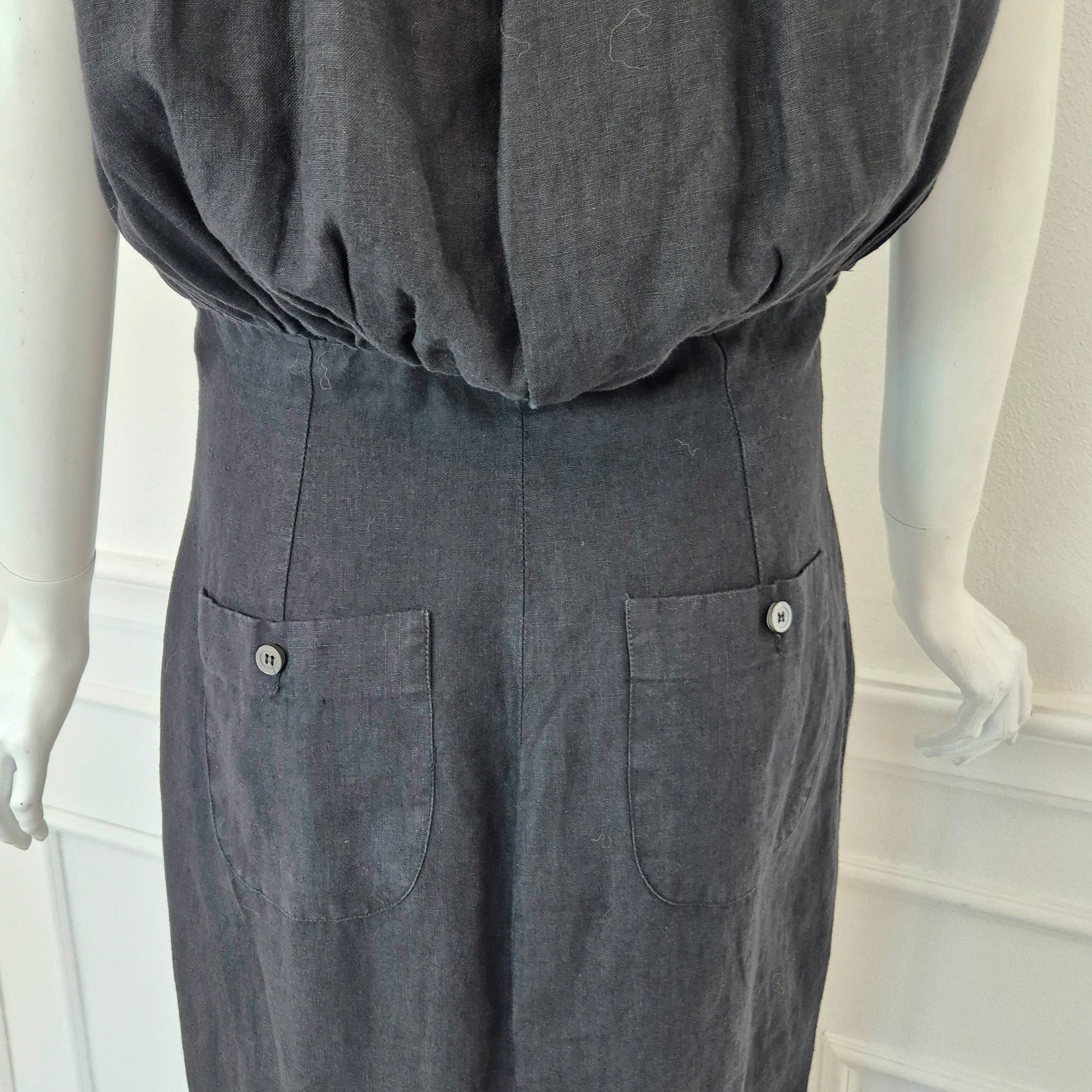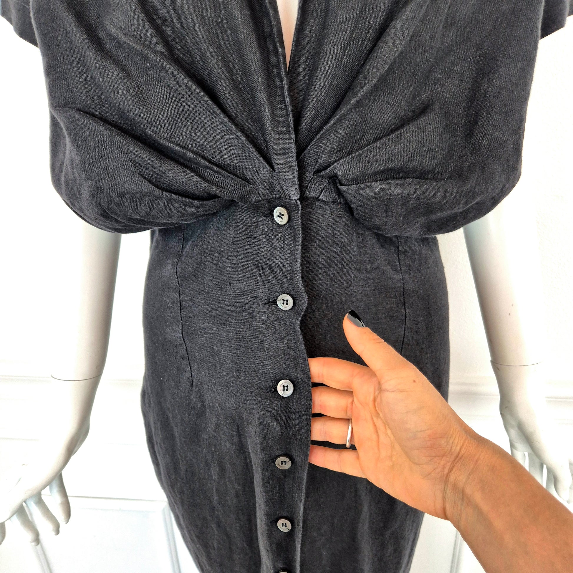 ROMEO GIGLI (estate 1996) abito lungo in misto lino e seta color nero, con bellissimo scollo a V esaltato dalla parte alta del vestito caratterizzata da pieghe convergenti. Bottoncini in madreperla fin sul fondo.