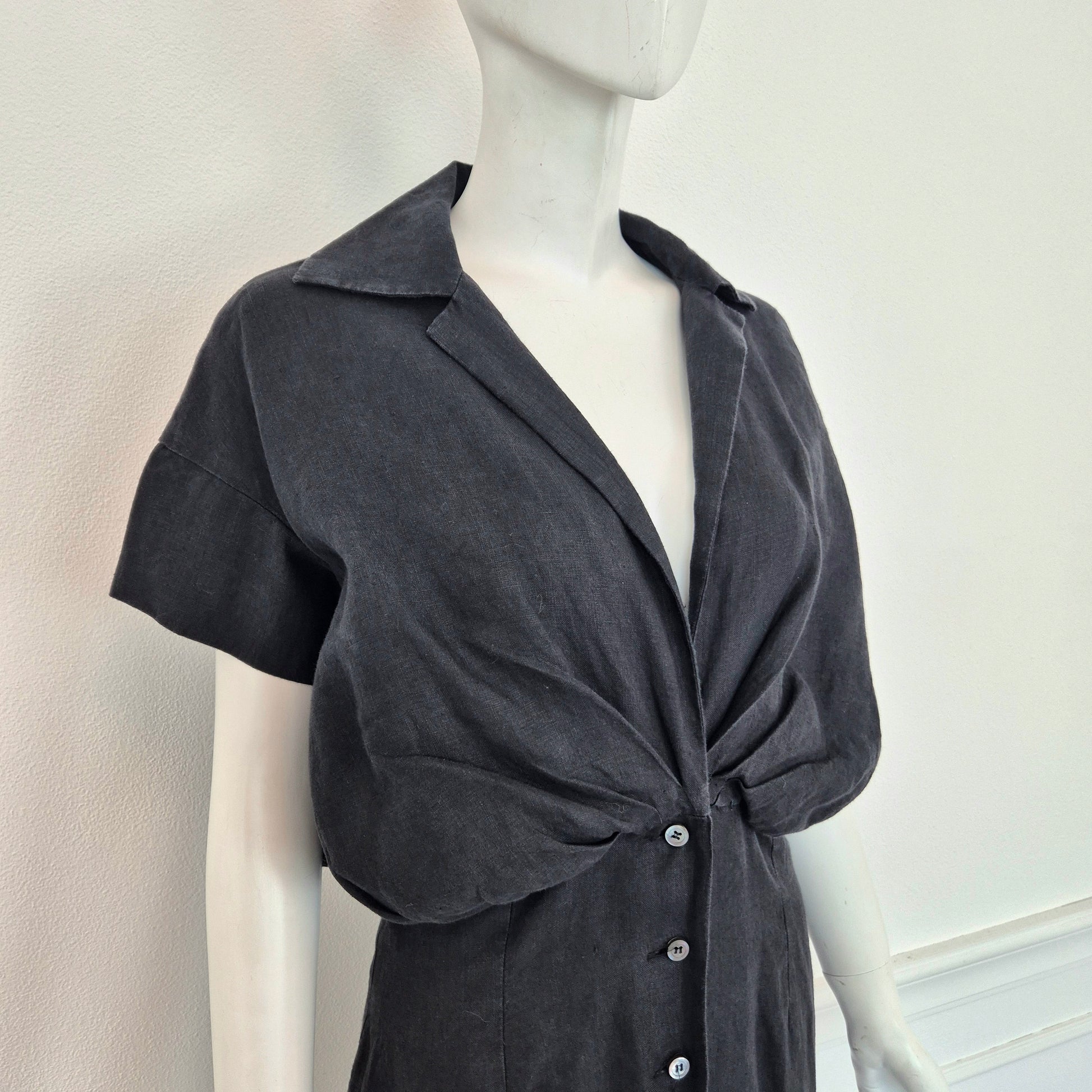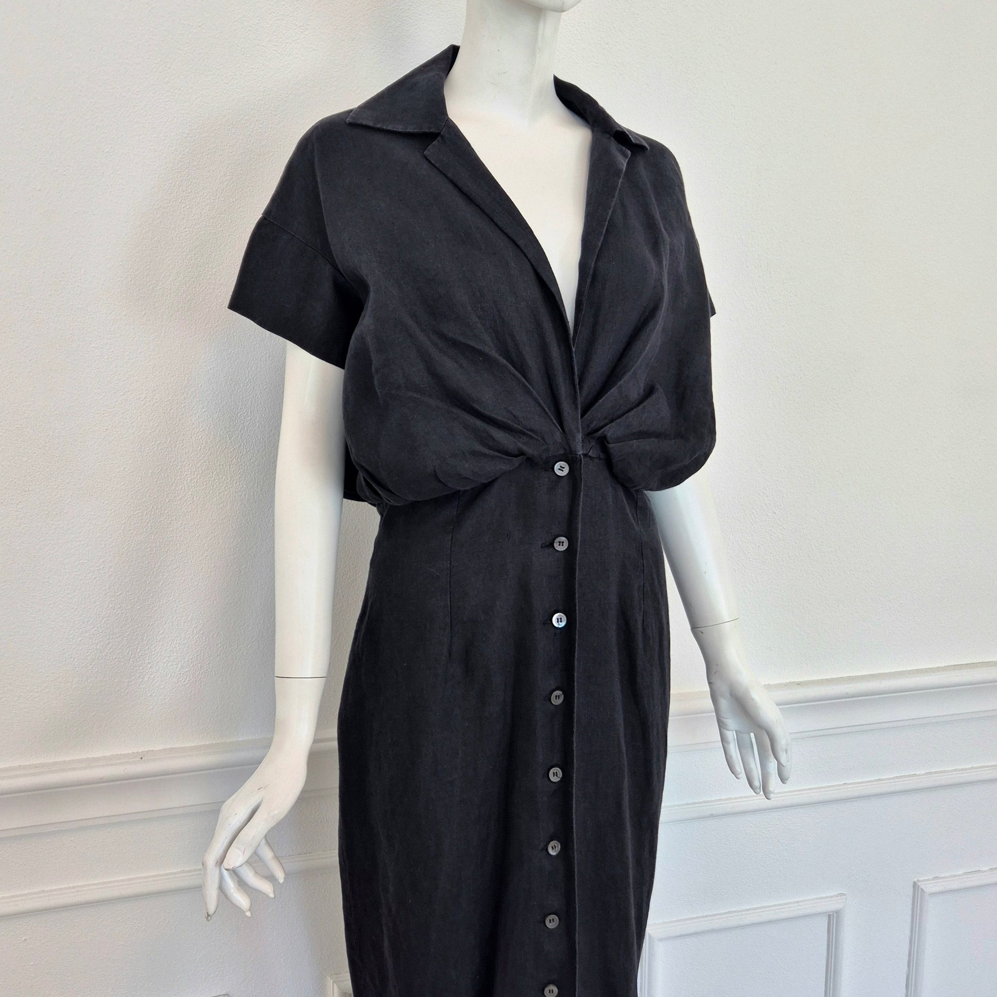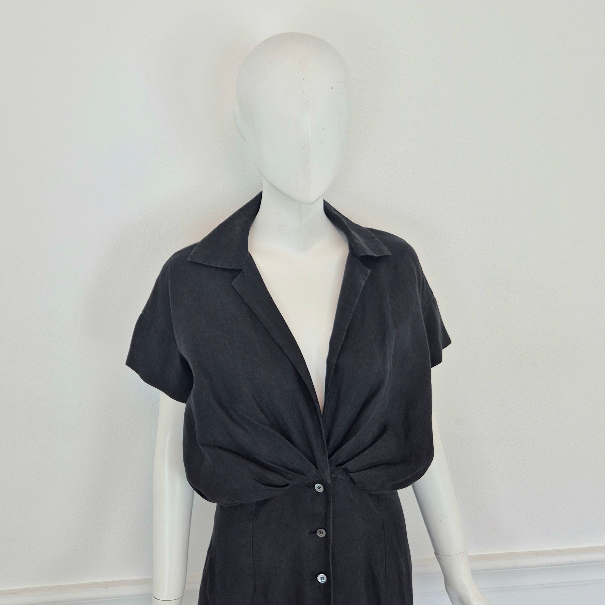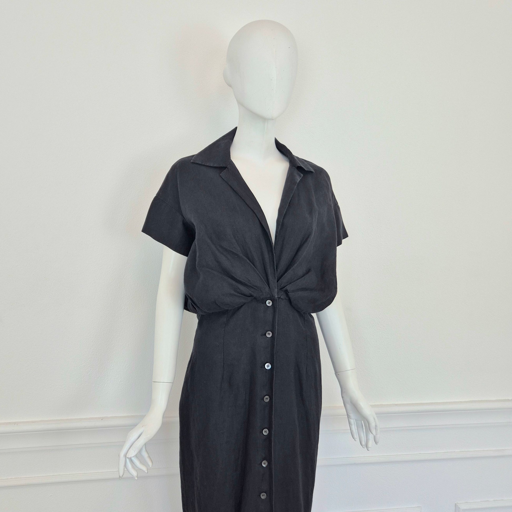 ROMEO GIGLI (estate 1996) abito lungo in misto lino e seta color nero, con bellissimo scollo a V esaltato dalla parte alta del vestito caratterizzata da pieghe convergenti. Bottoncini in madreperla fin sul fondo.