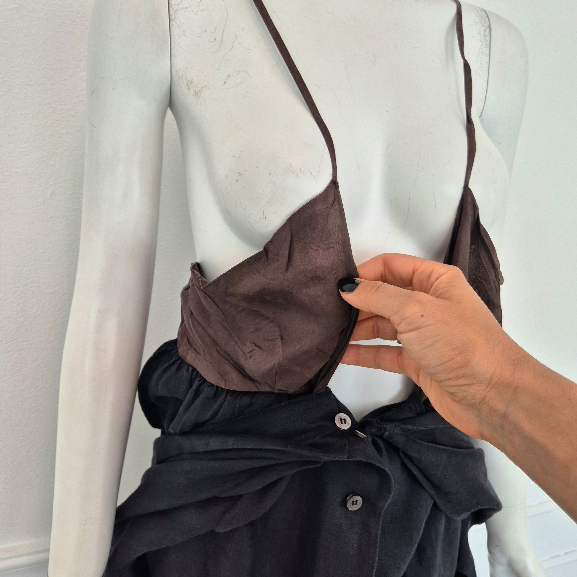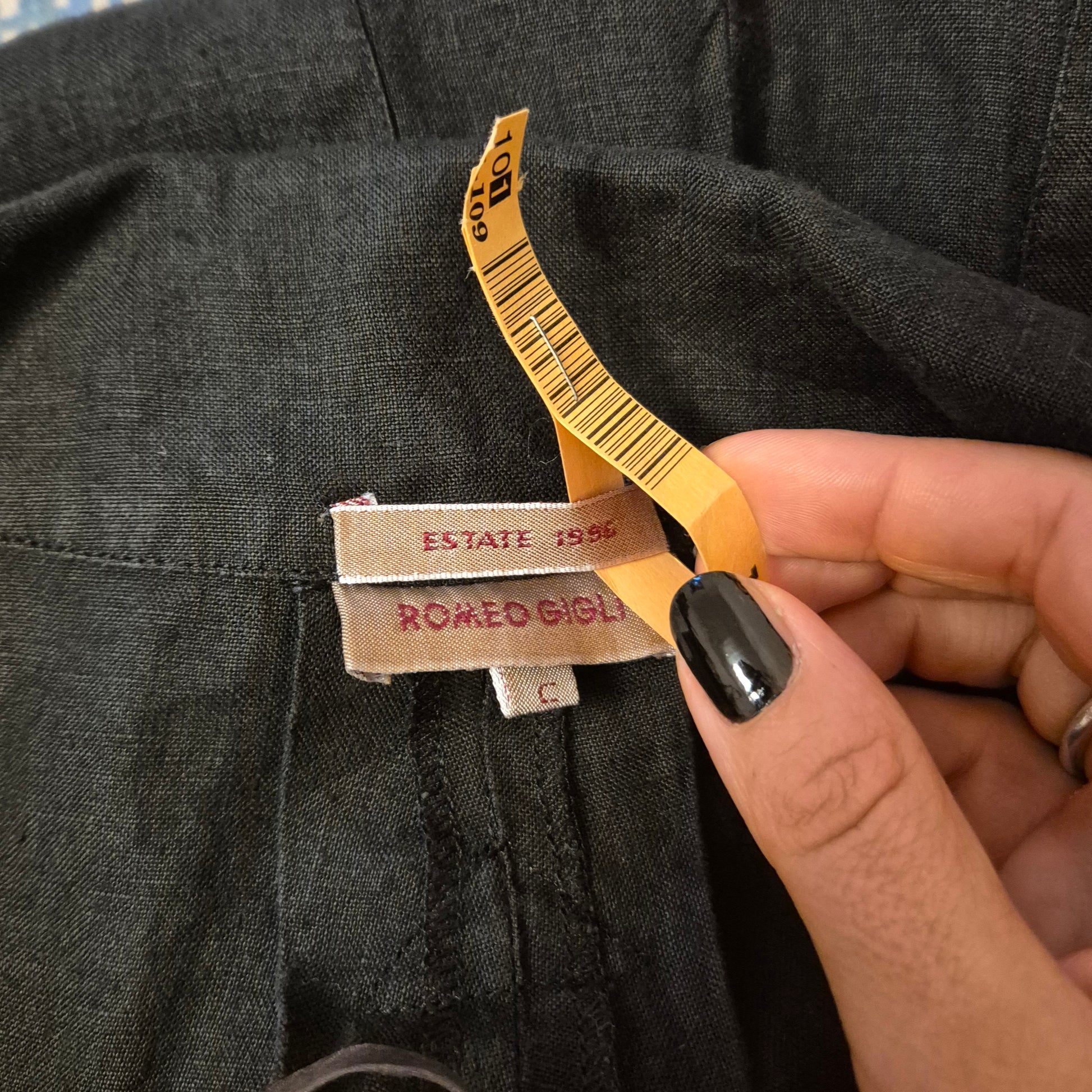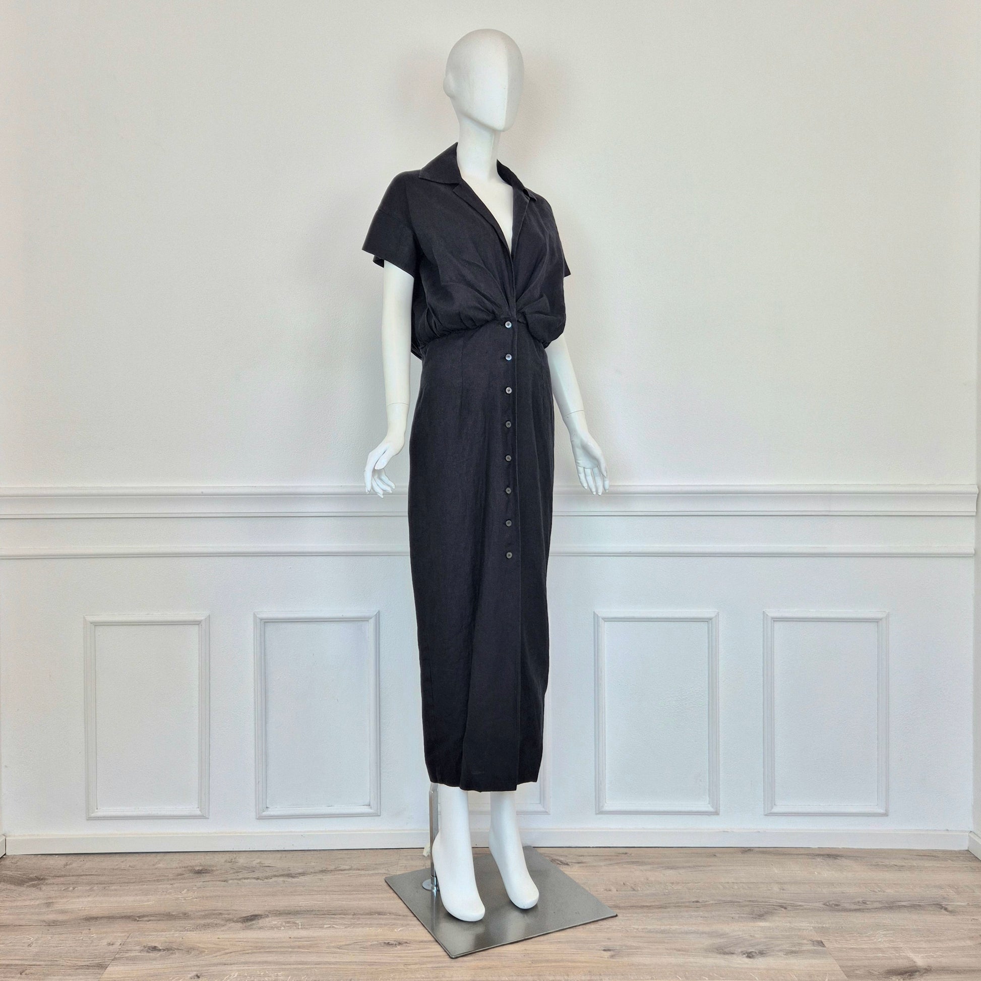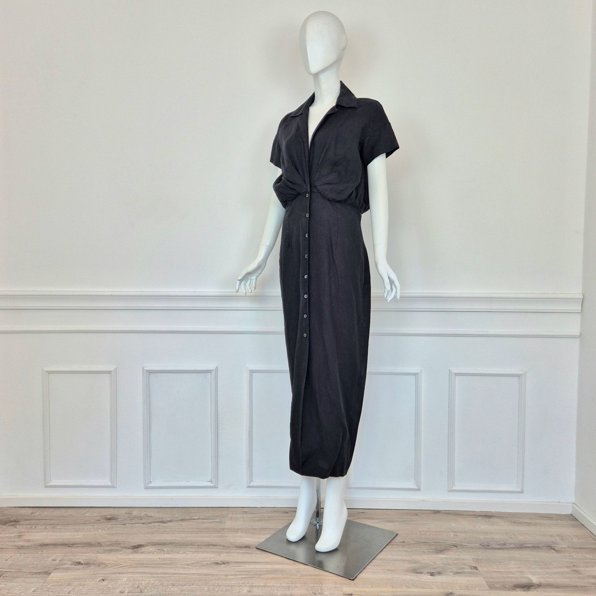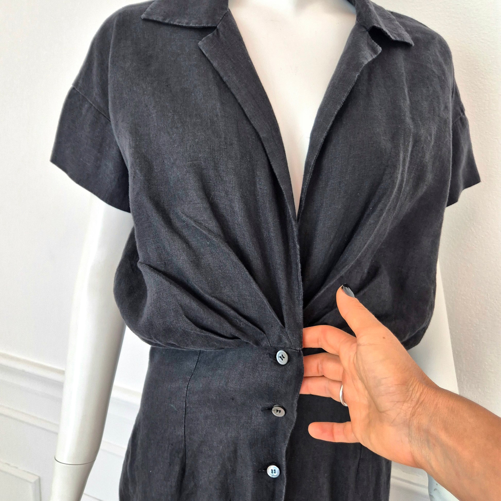 ROMEO GIGLI (estate 1996) abito lungo in misto lino e seta color nero, con bellissimo scollo a V esaltato dalla parte alta del vestito caratterizzata da pieghe convergenti. Bottoncini in madreperla fin sul fondo.