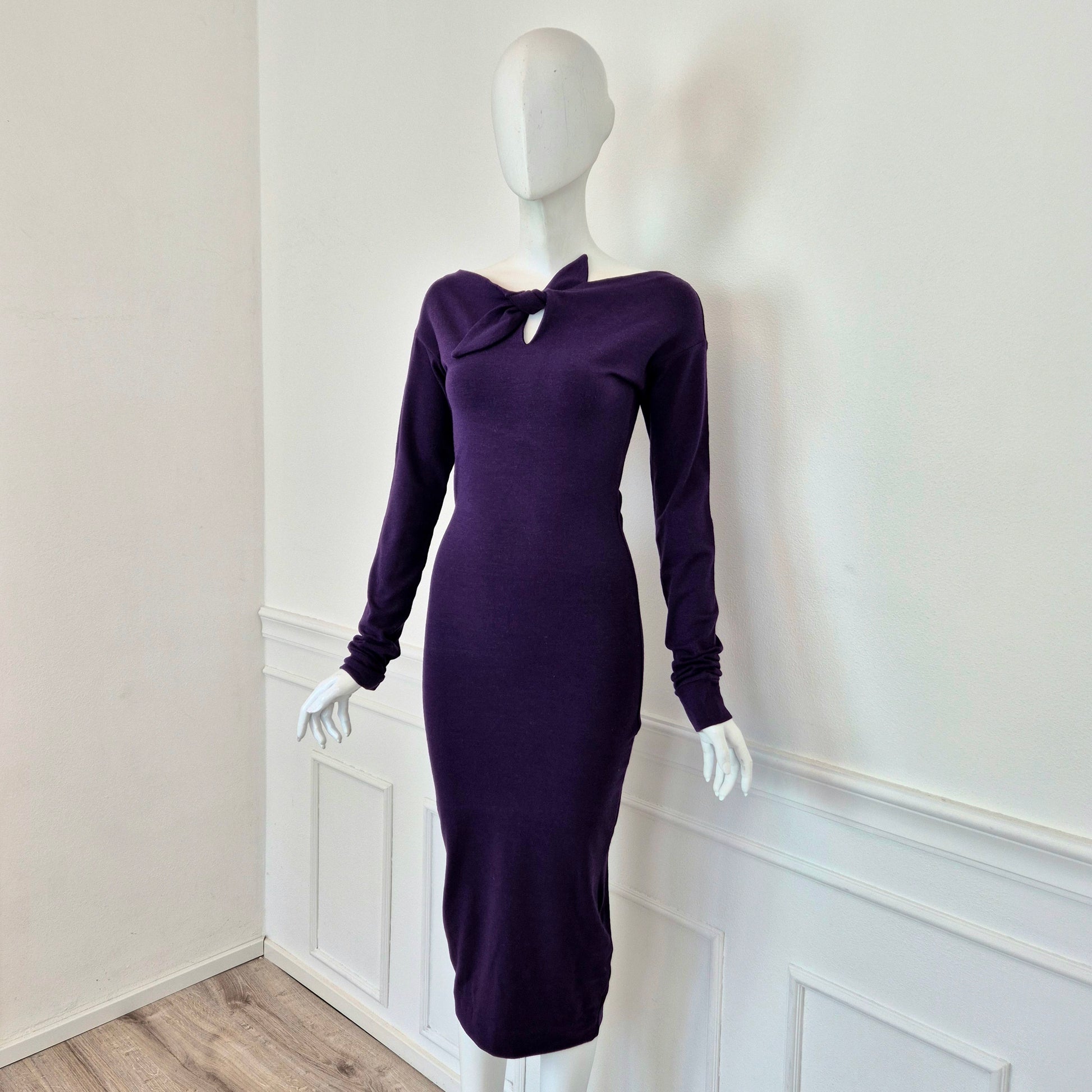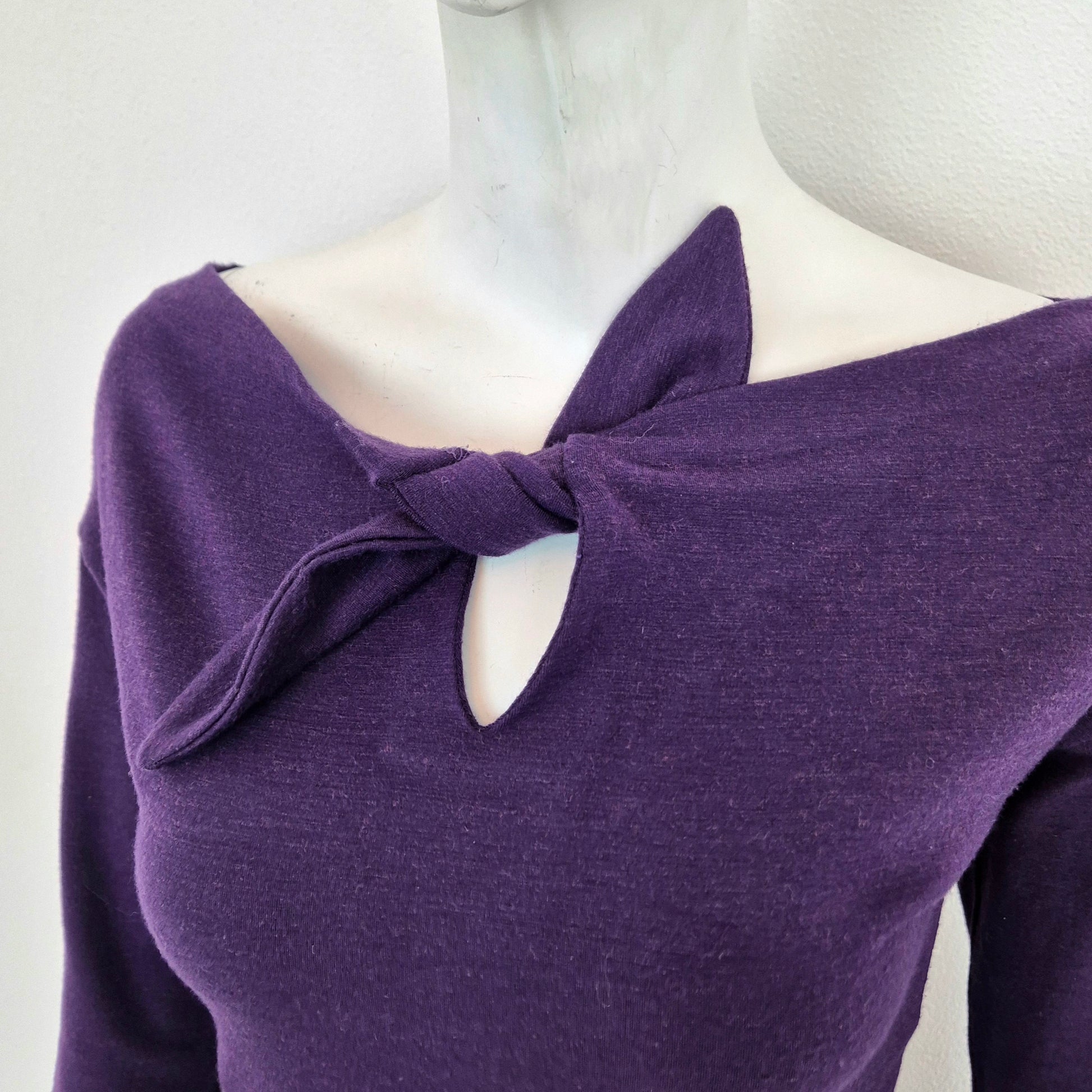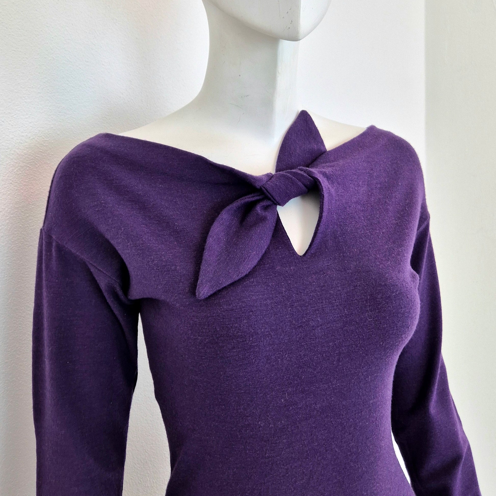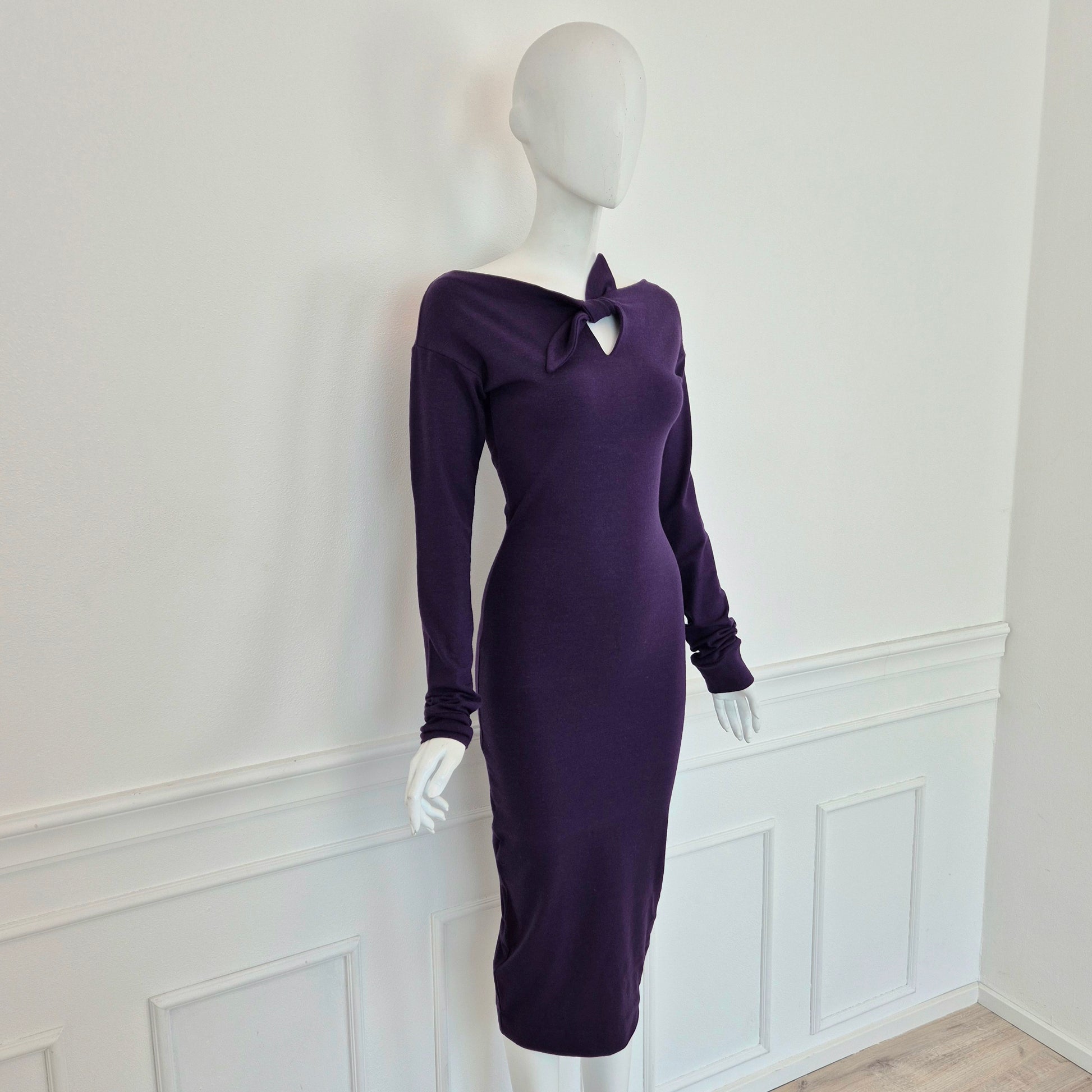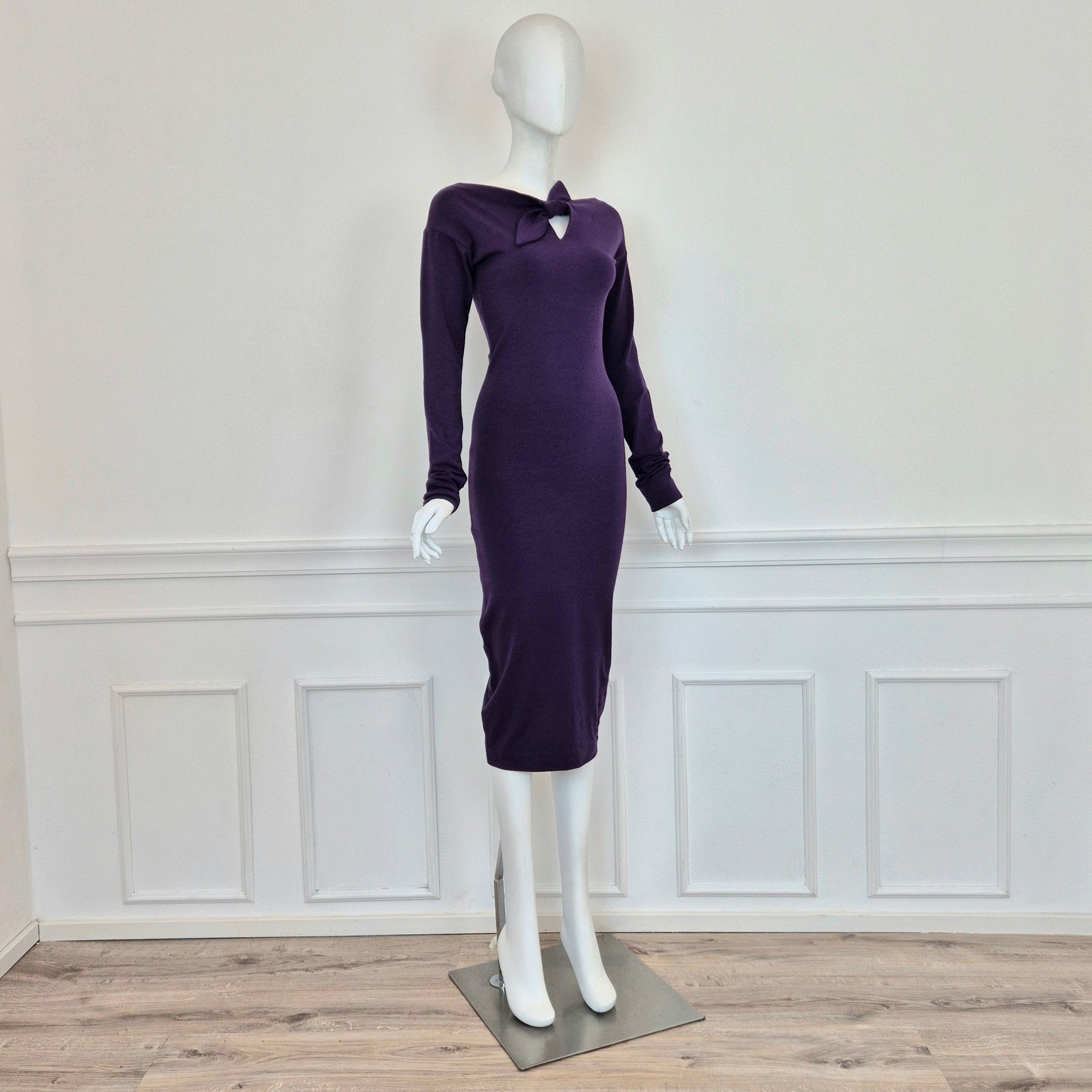 ROMEO GIGLI (linea G di Gigli) abito vintage anni '90 color viola con manica lunga e fiocchetto da allacciare sul seno. Manica lunga, linea aderente con lunghezza al polpaccio.