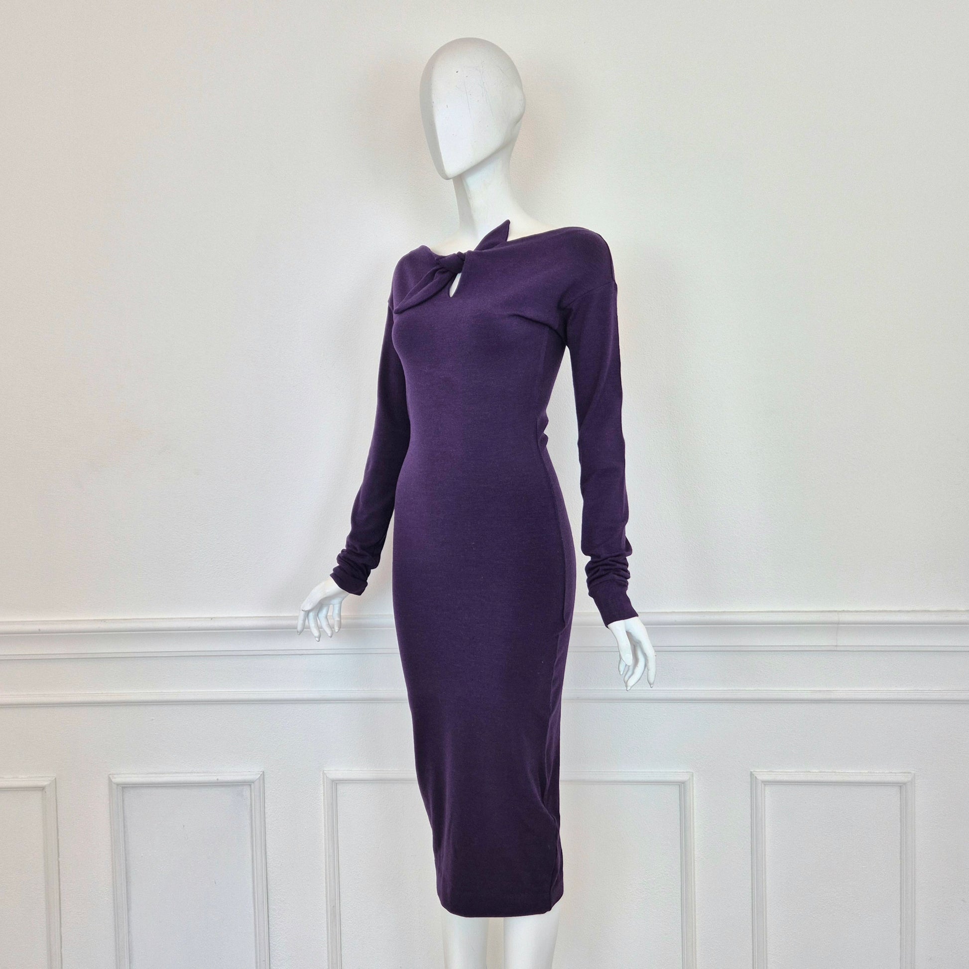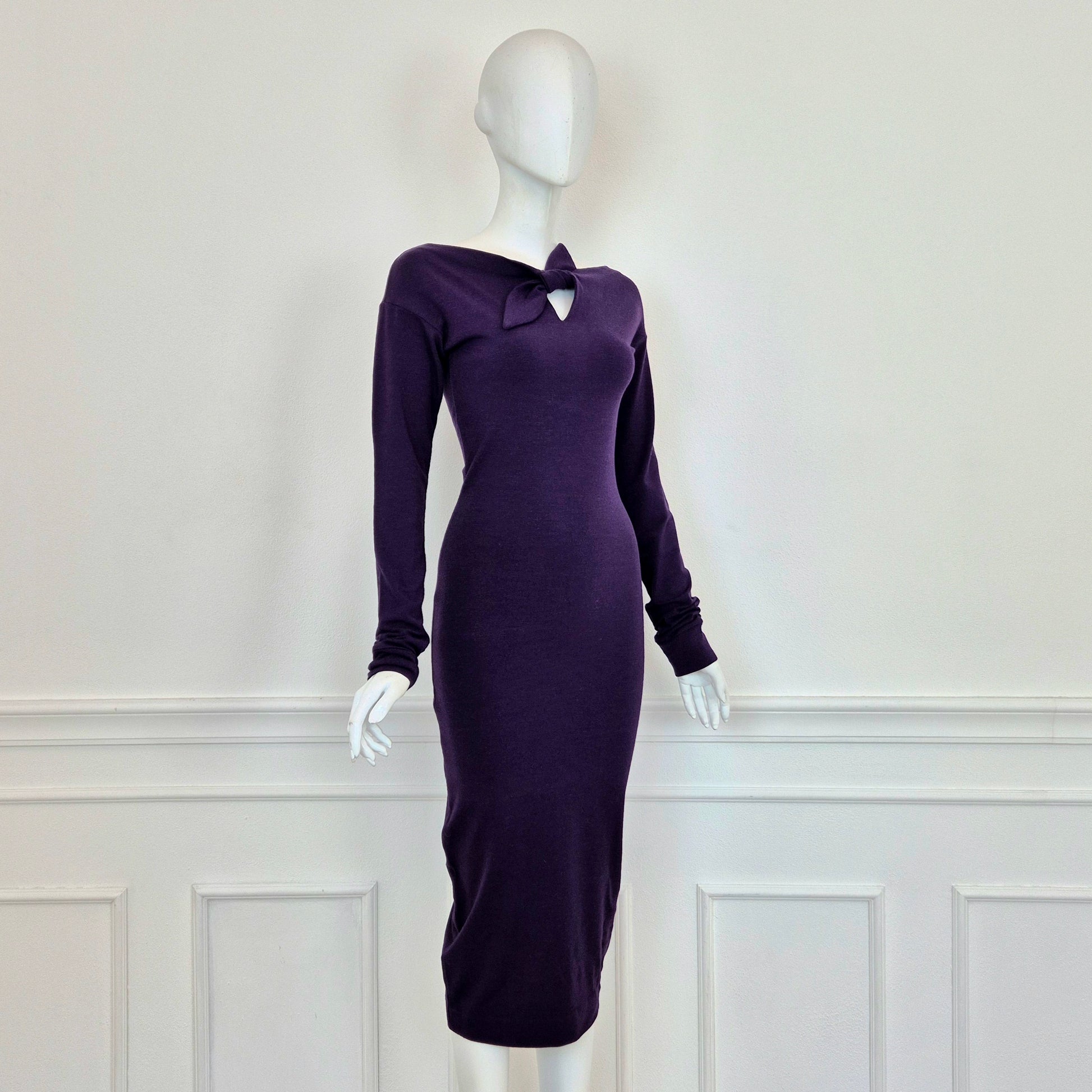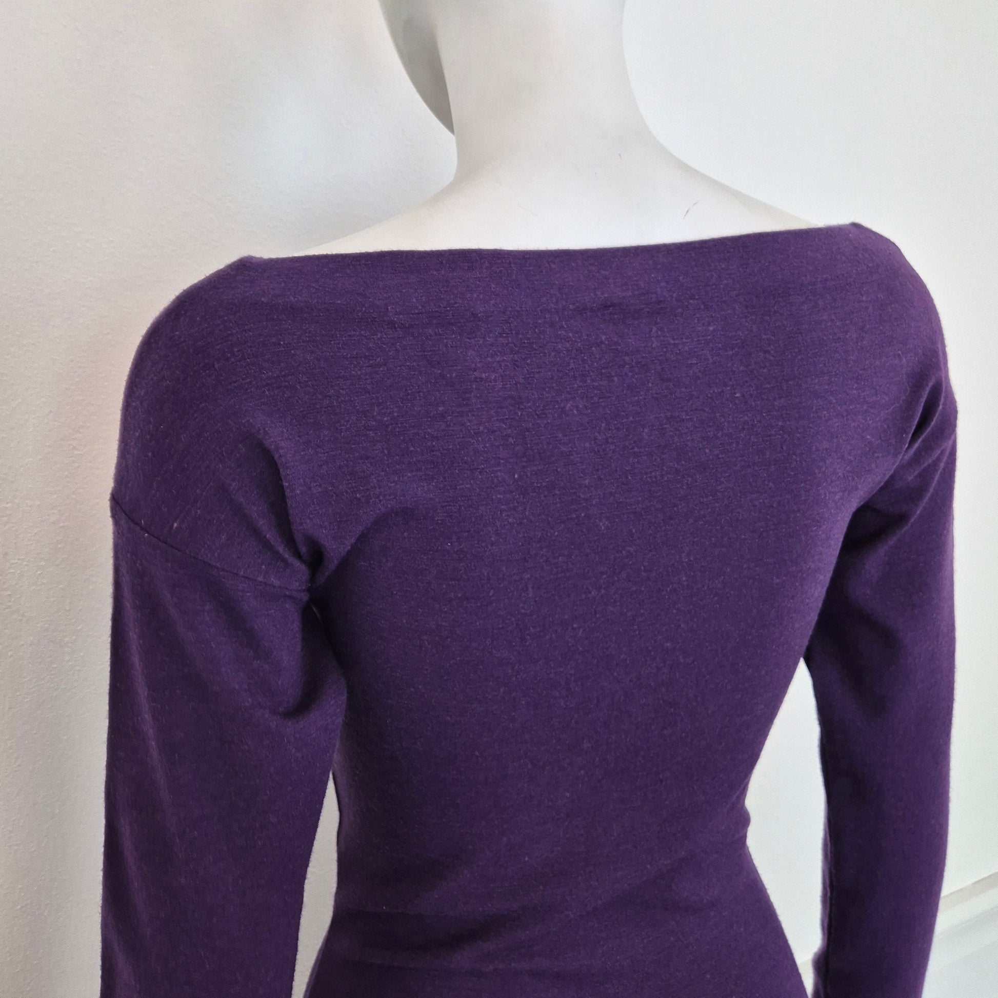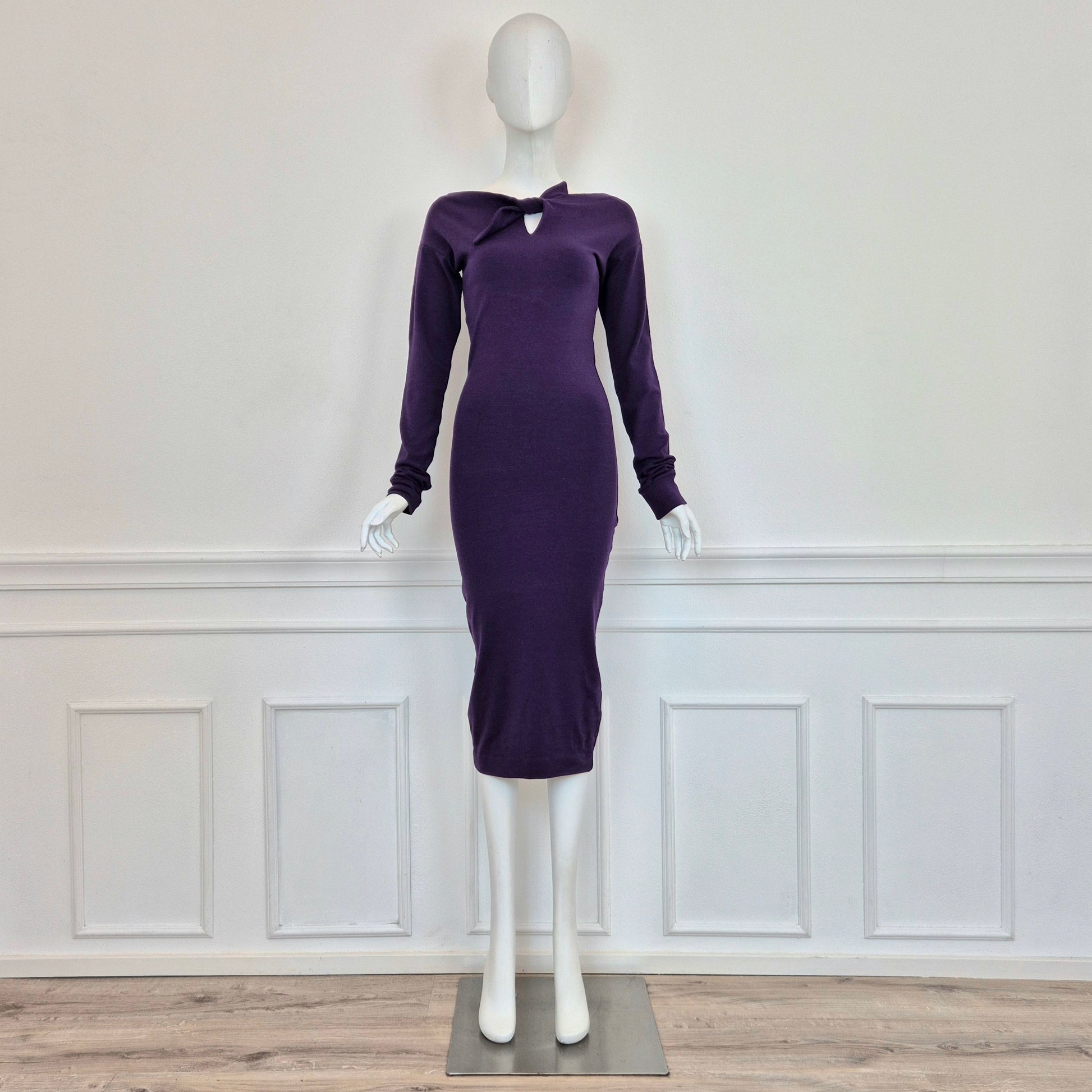 ROMEO GIGLI (linea G di Gigli) abito vintage anni '90 color viola con manica lunga e fiocchetto da allacciare sul seno. Manica lunga, linea aderente con lunghezza al polpaccio.