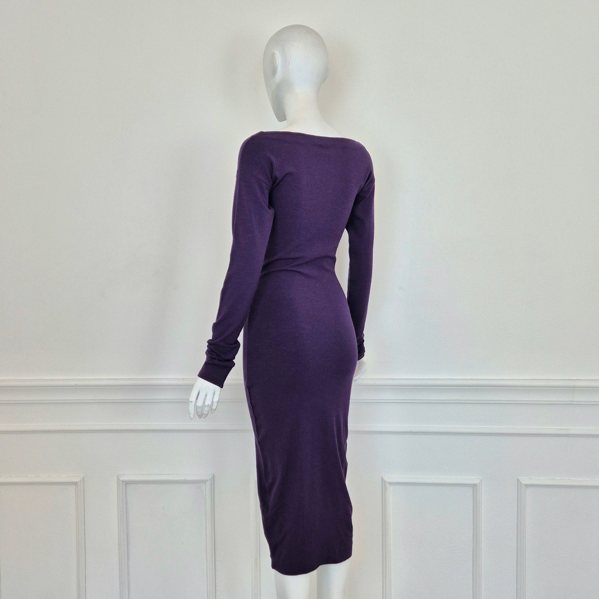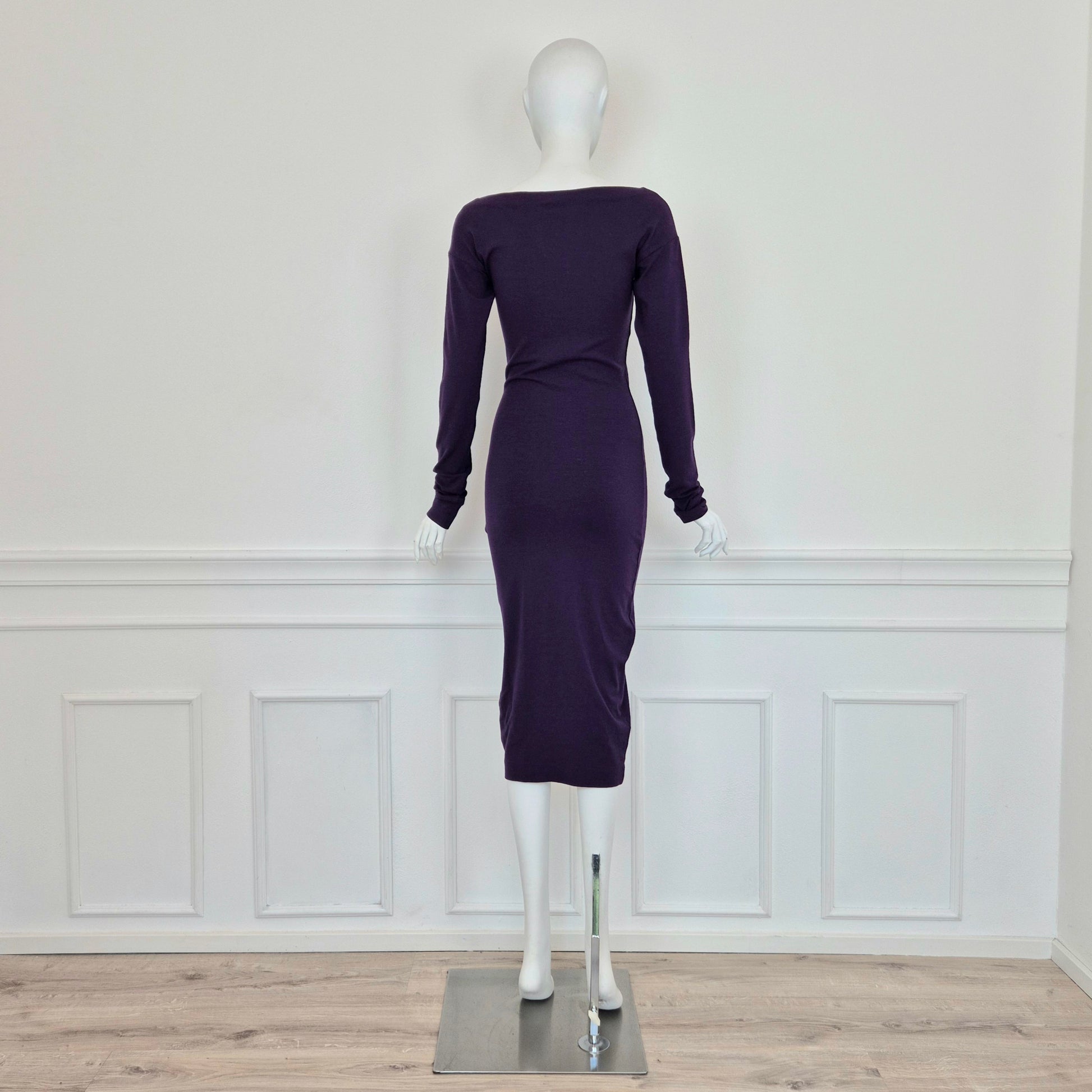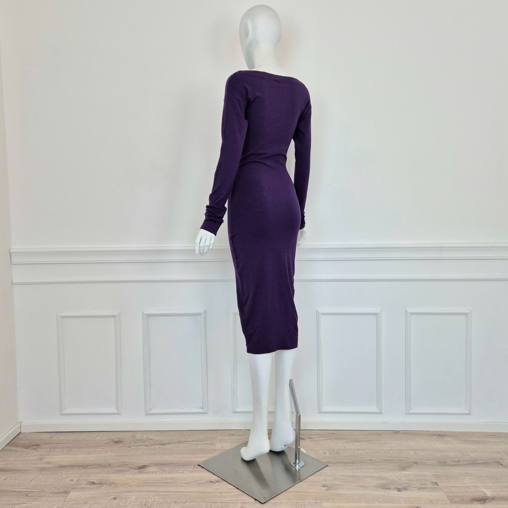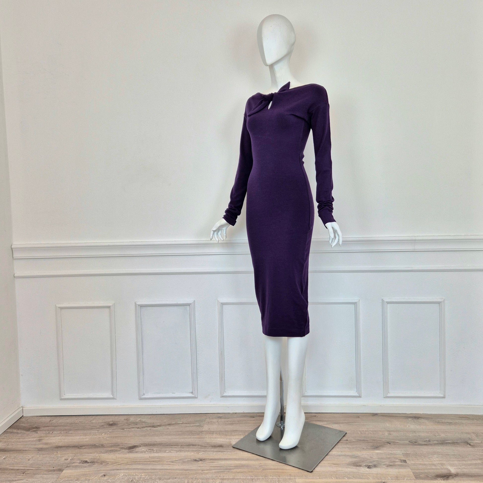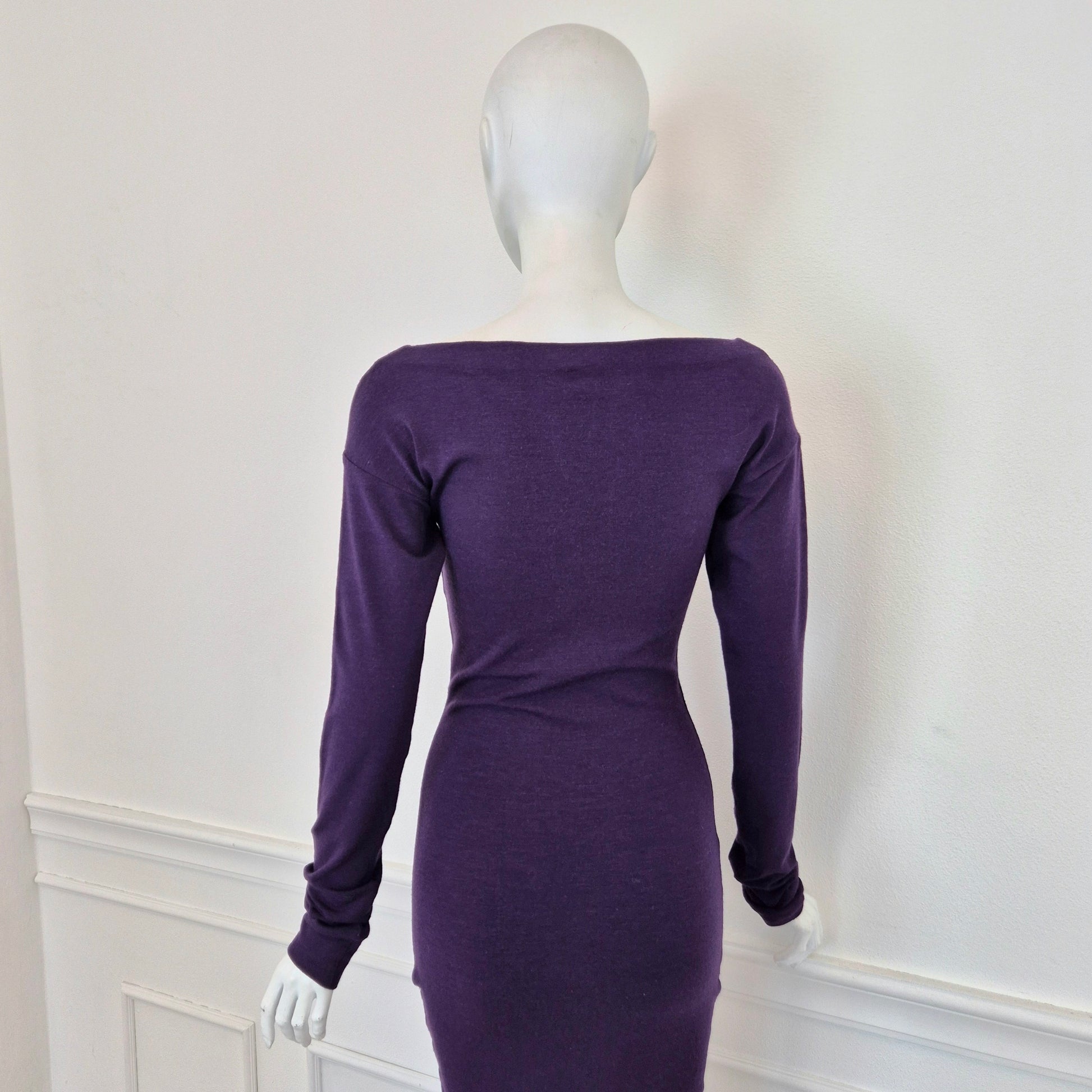 ROMEO GIGLI (linea G di Gigli) abito vintage anni '90 color viola con manica lunga e fiocchetto da allacciare sul seno. Manica lunga, linea aderente con lunghezza al polpaccio.