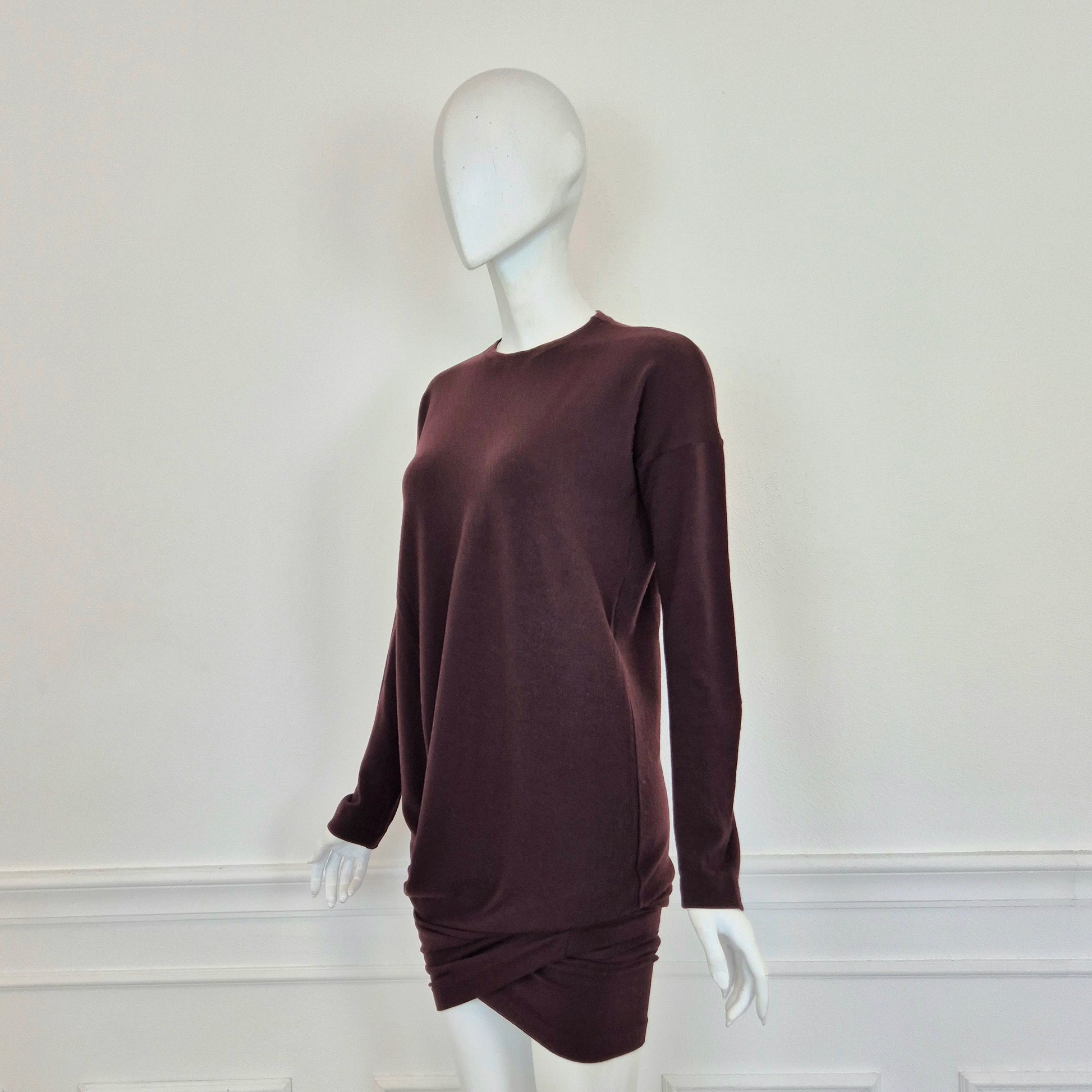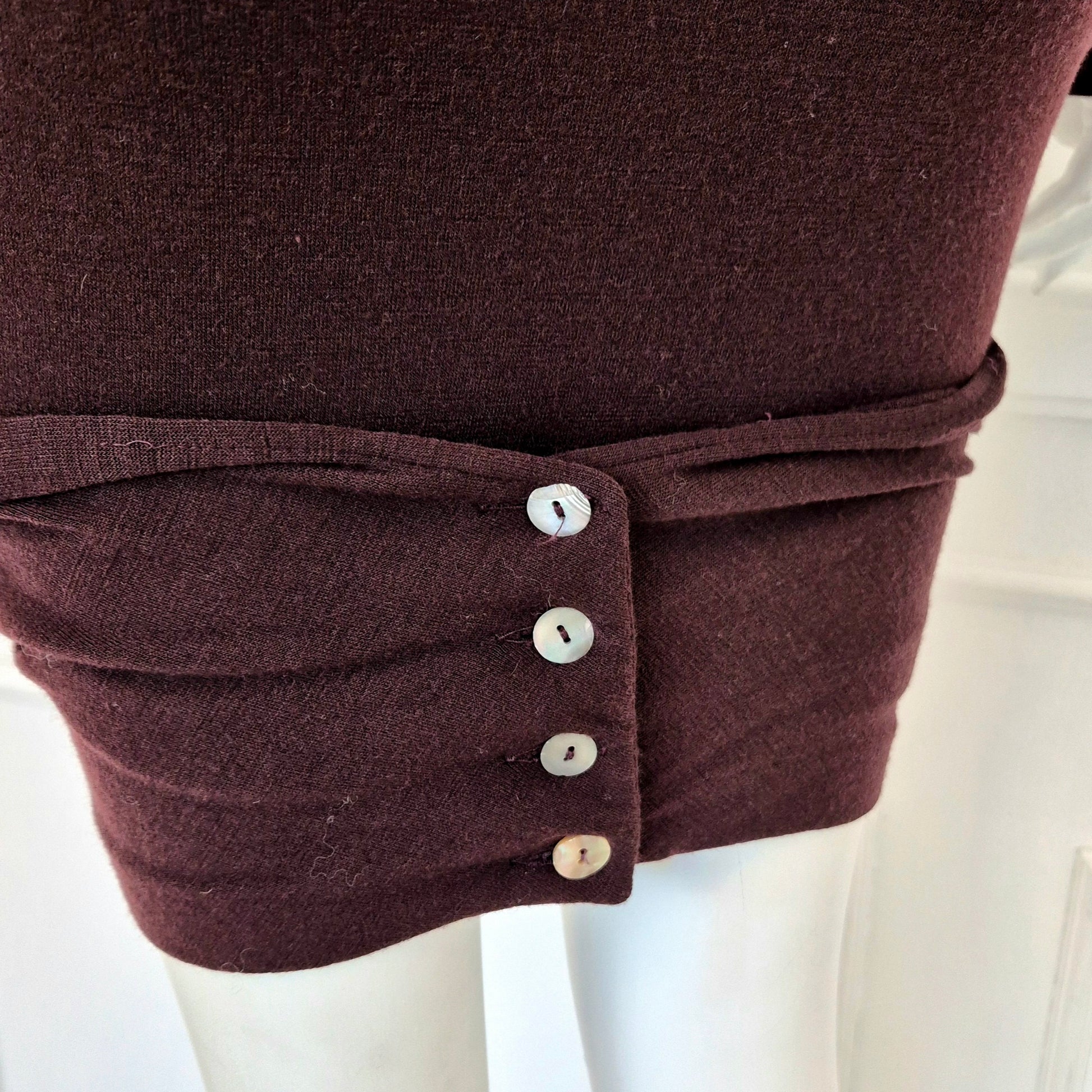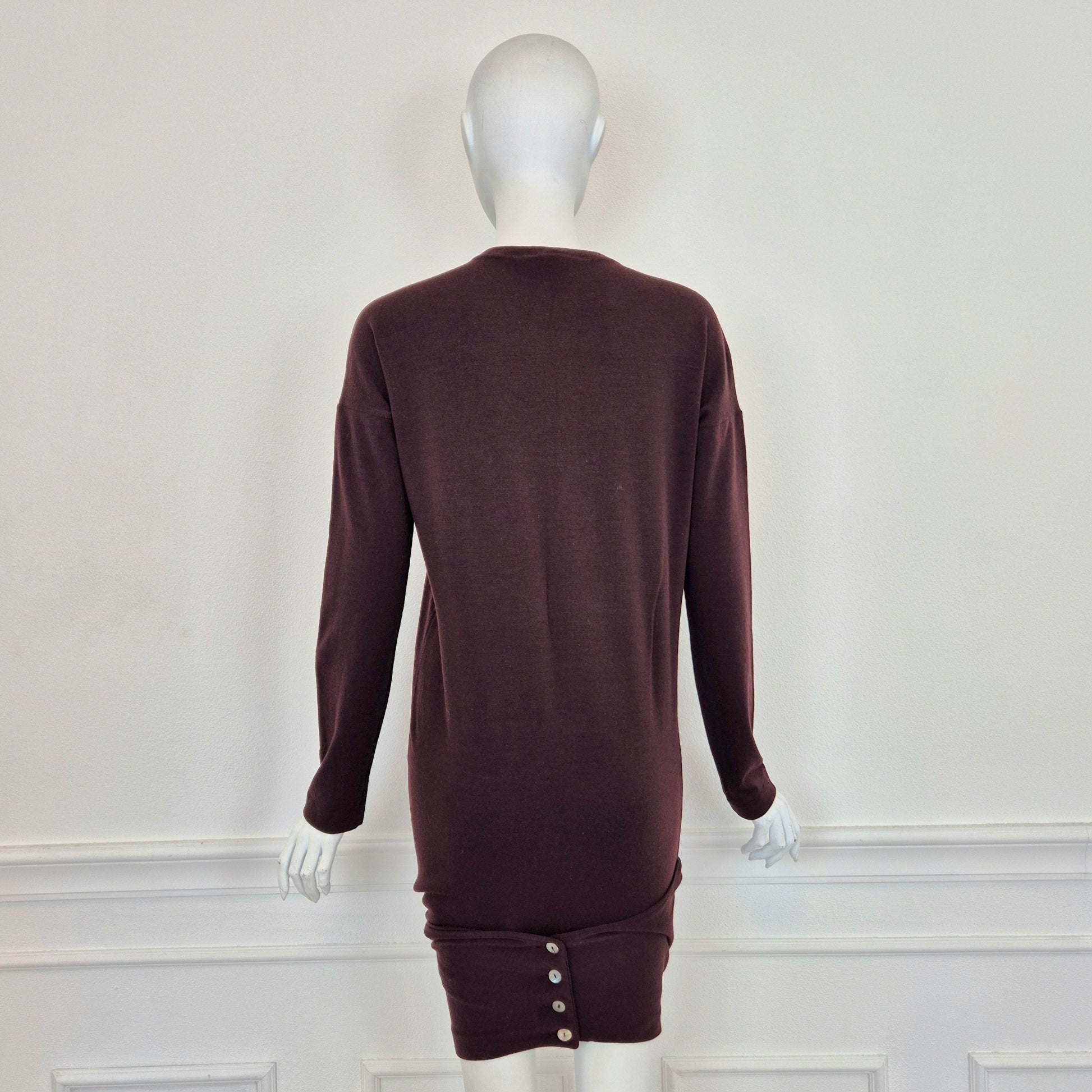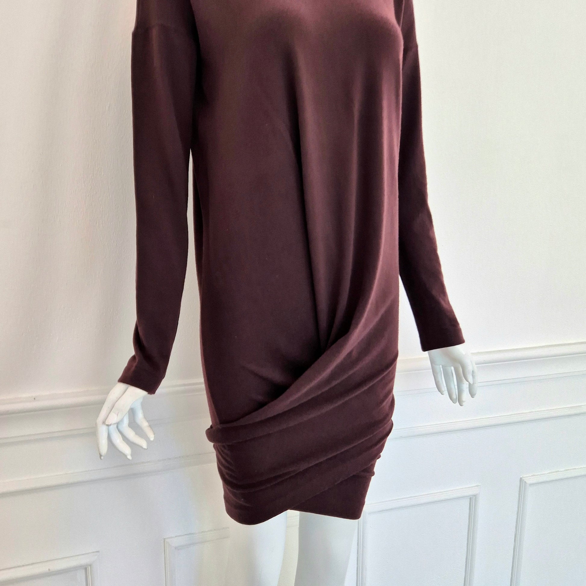 ROMEO GIGLI (fall winter 1988) abito vintage in misto lana color melanzana / vinaccia, una delle tonalità più care allo stilista. Scollo rotondo, manica lunga, linea aderente sul corpo, abbraccia le forme e si ammorbidisce scendendo verso il fondo, dove si incrocia sul retro grazie alla fascia chiusa da bottoni in madreperla naturale.