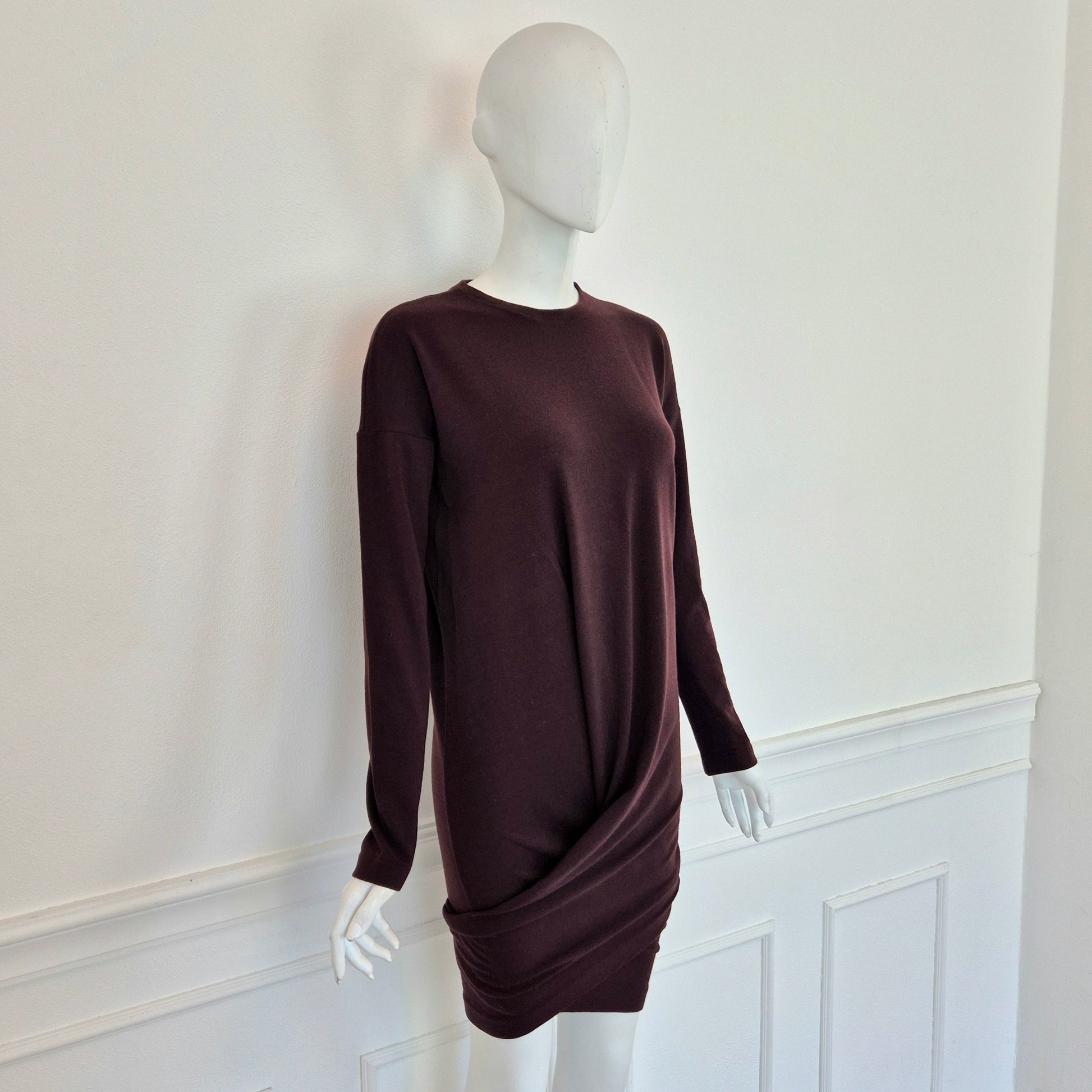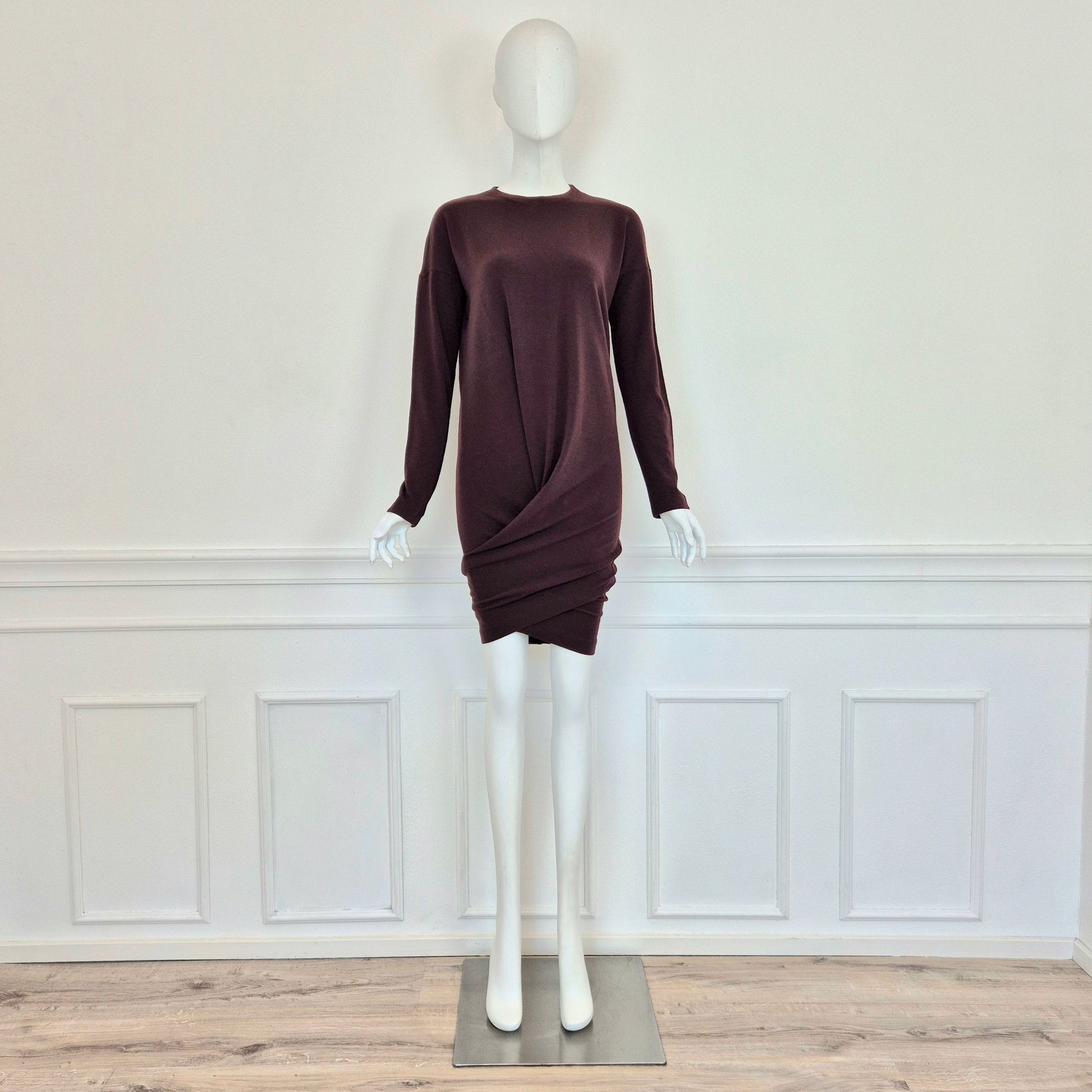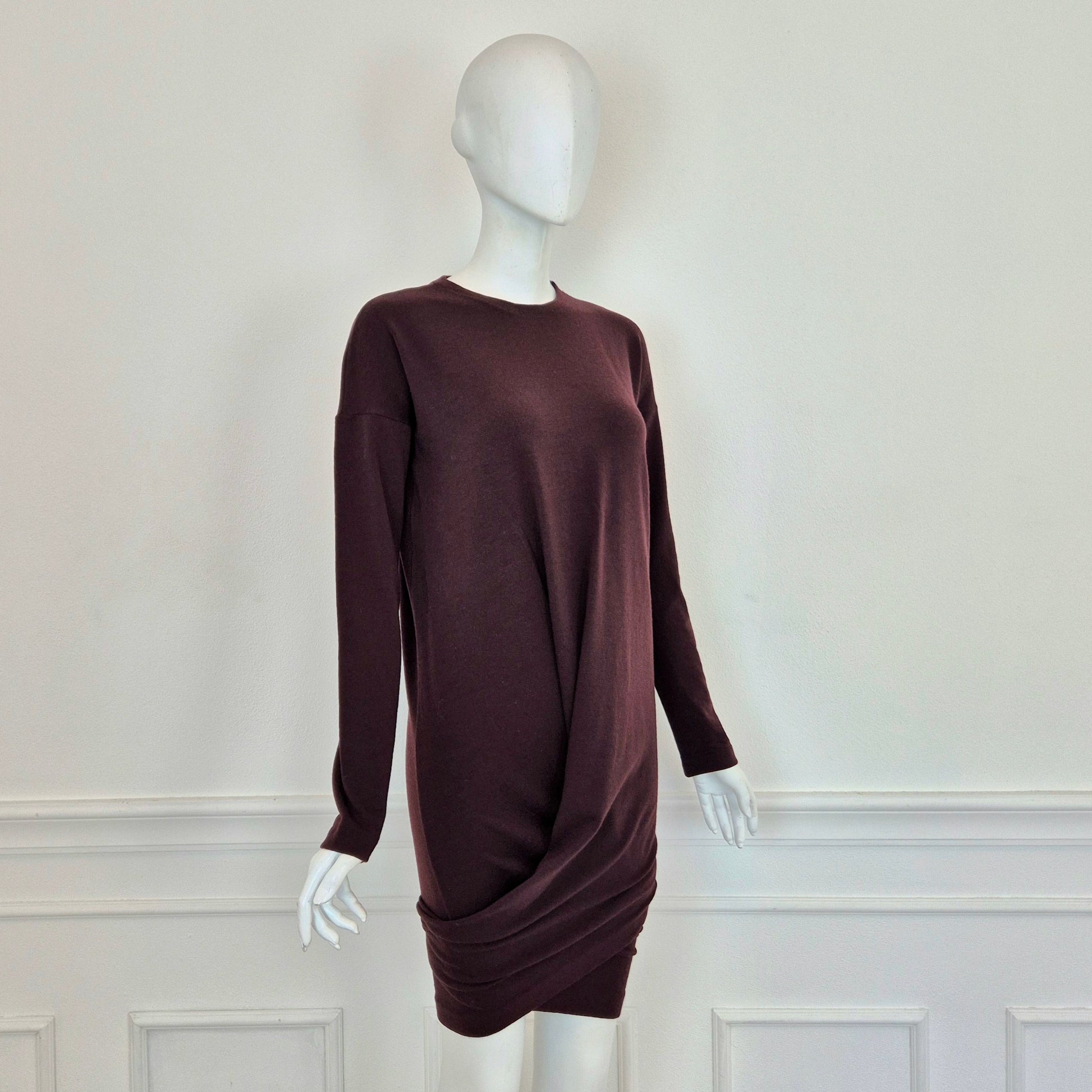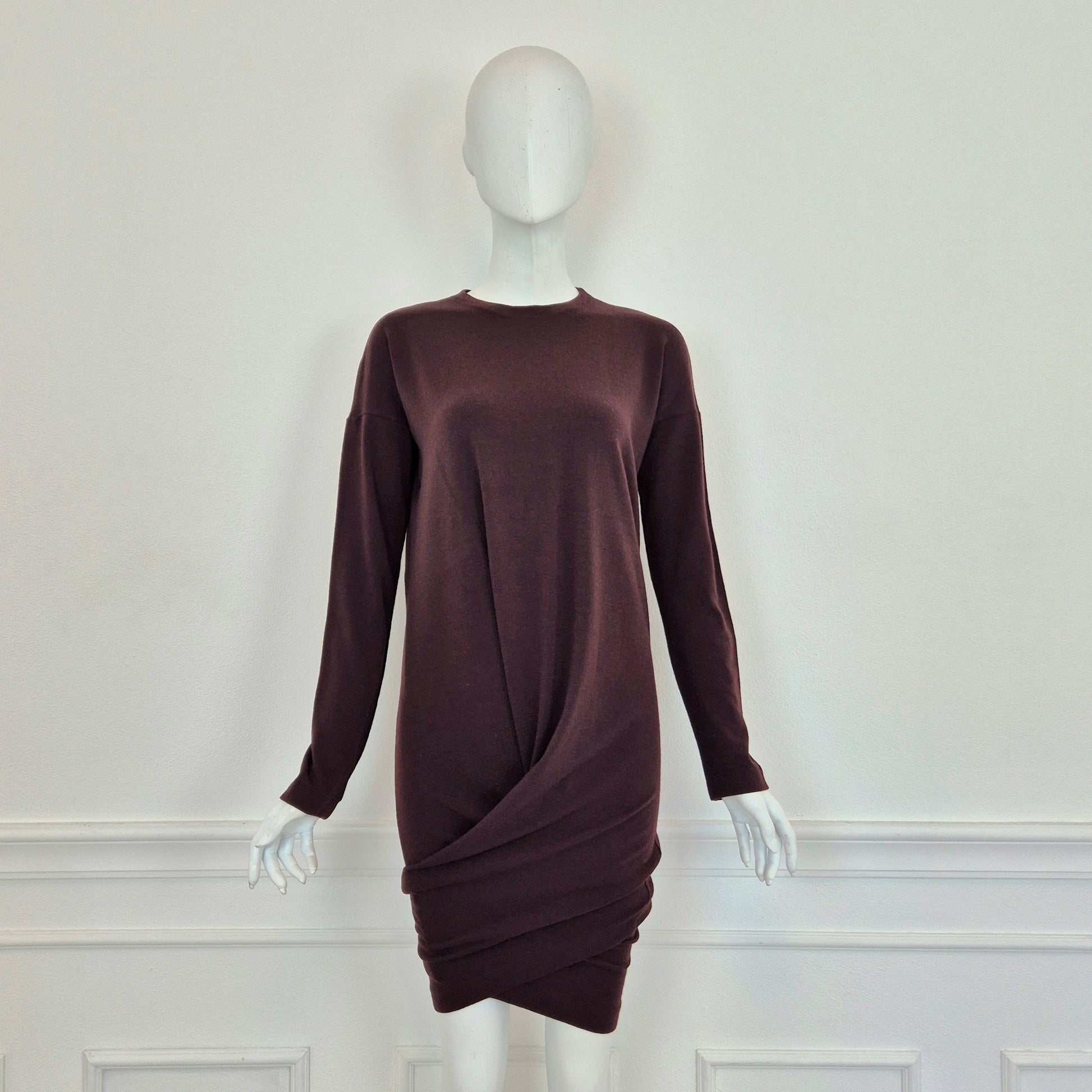 ROMEO GIGLI (fall winter 1988) abito vintage in misto lana color melanzana / vinaccia, una delle tonalità più care allo stilista. Scollo rotondo, manica lunga, linea aderente sul corpo, abbraccia le forme e si ammorbidisce scendendo verso il fondo, dove si incrocia sul retro grazie alla fascia chiusa da bottoni in madreperla naturale.