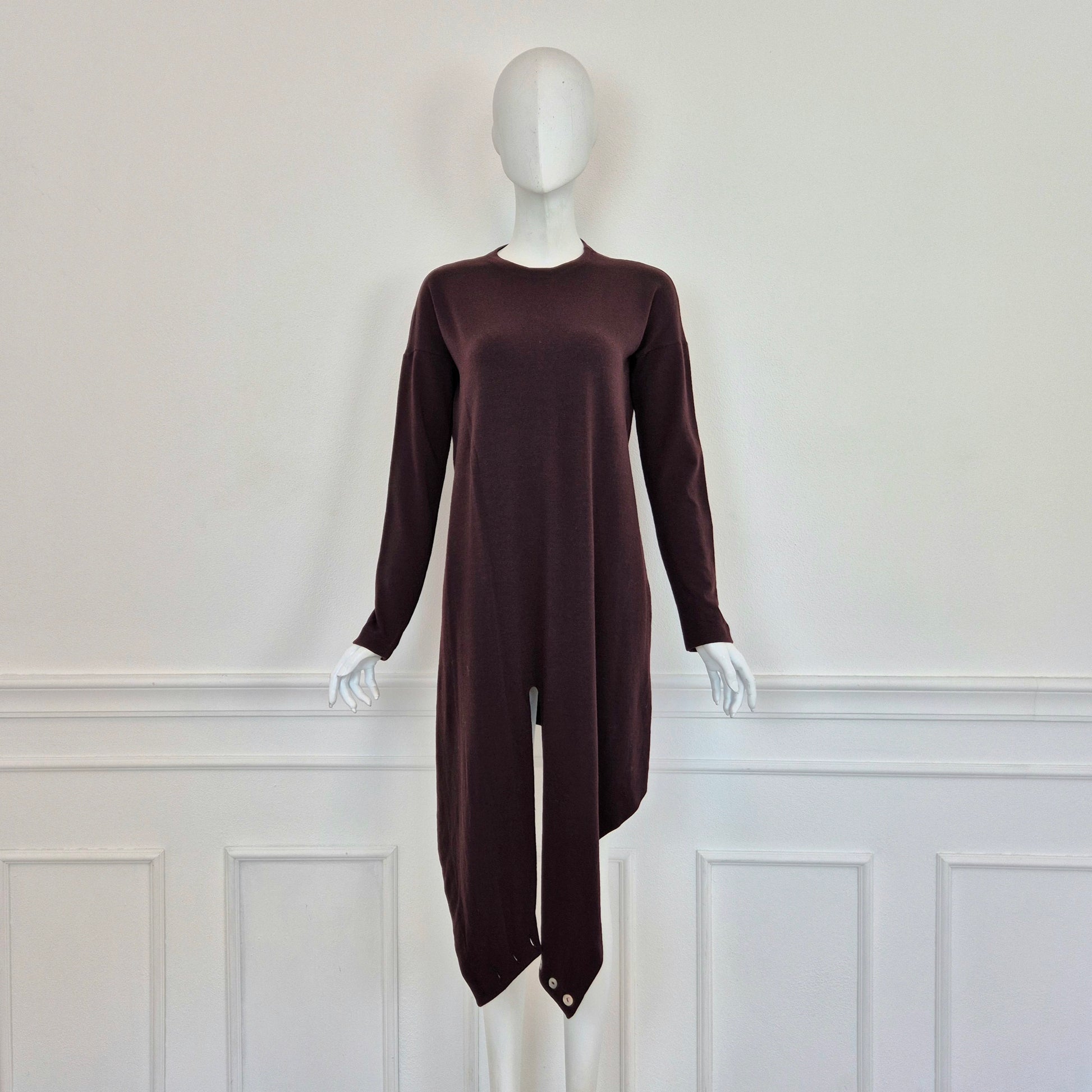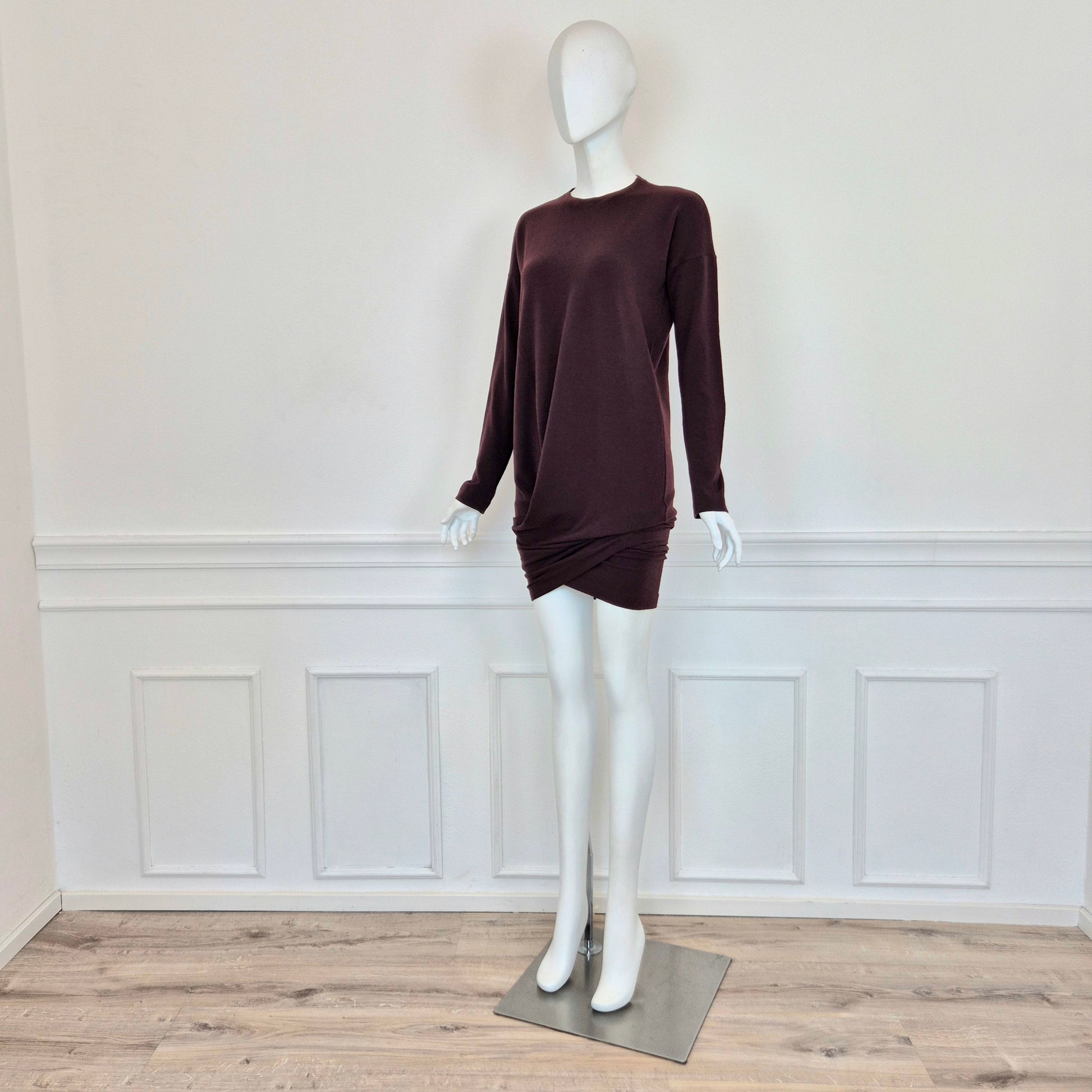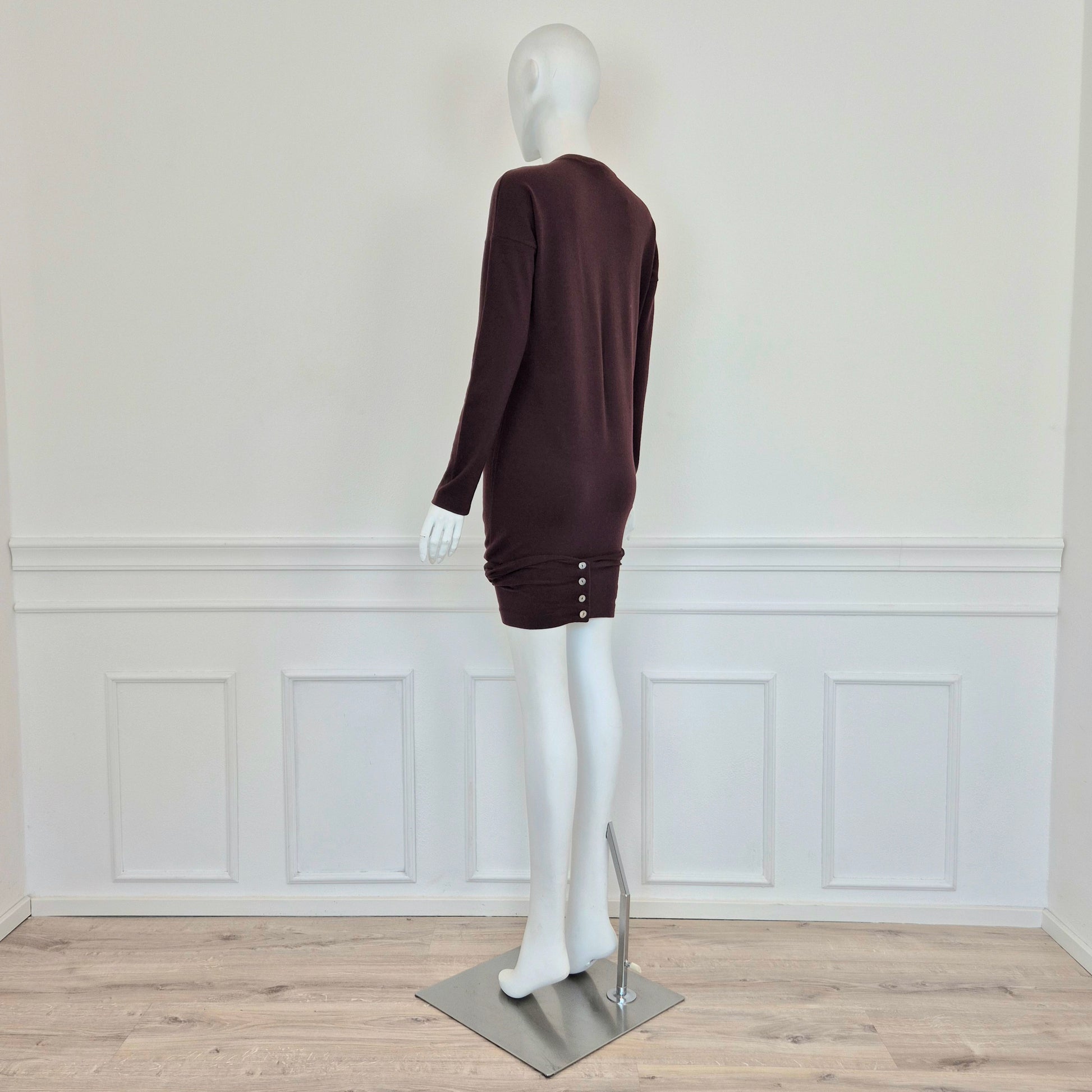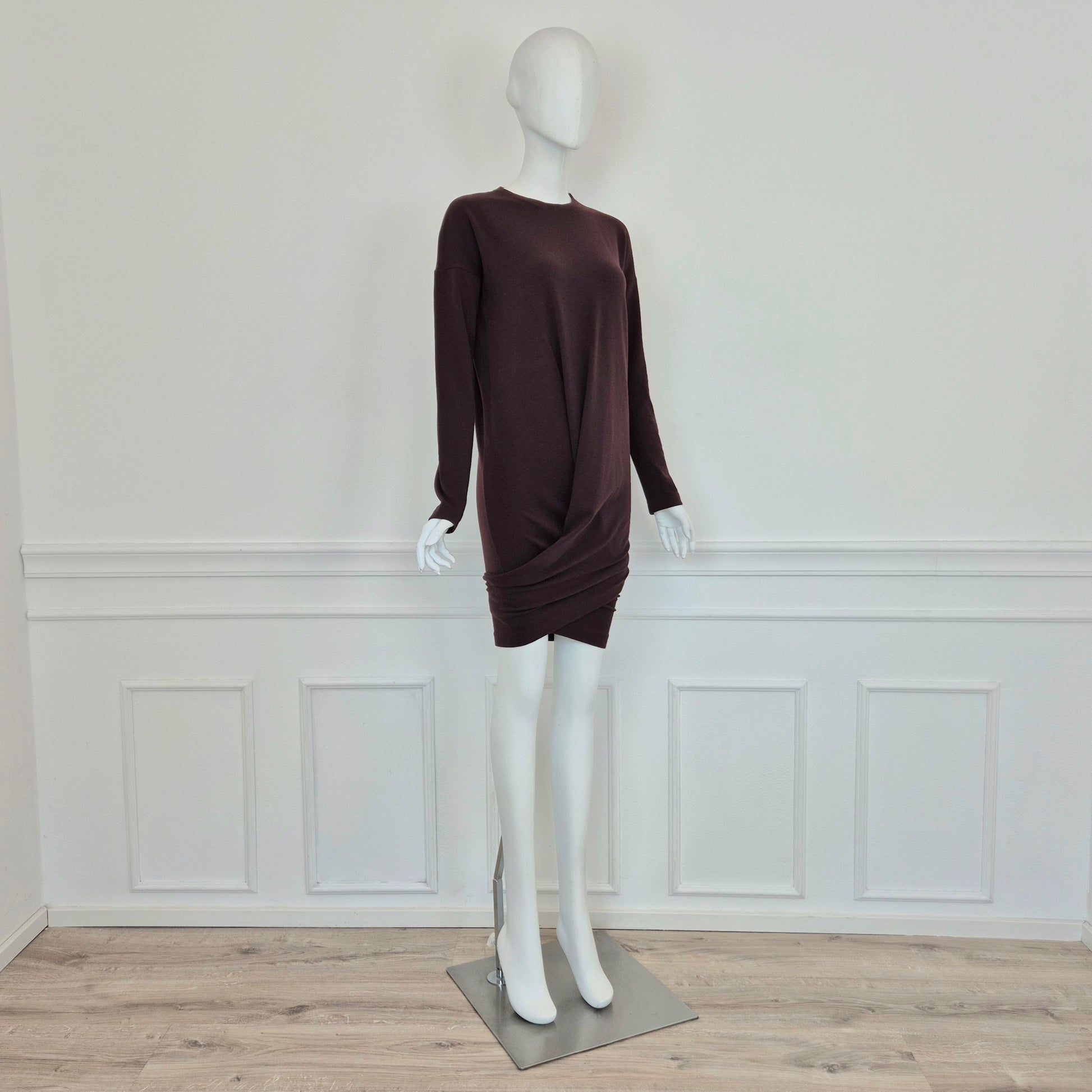 ROMEO GIGLI (fall winter 1988) abito vintage in misto lana color melanzana / vinaccia, una delle tonalità più care allo stilista. Scollo rotondo, manica lunga, linea aderente sul corpo, abbraccia le forme e si ammorbidisce scendendo verso il fondo, dove si incrocia sul retro grazie alla fascia chiusa da bottoni in madreperla naturale.