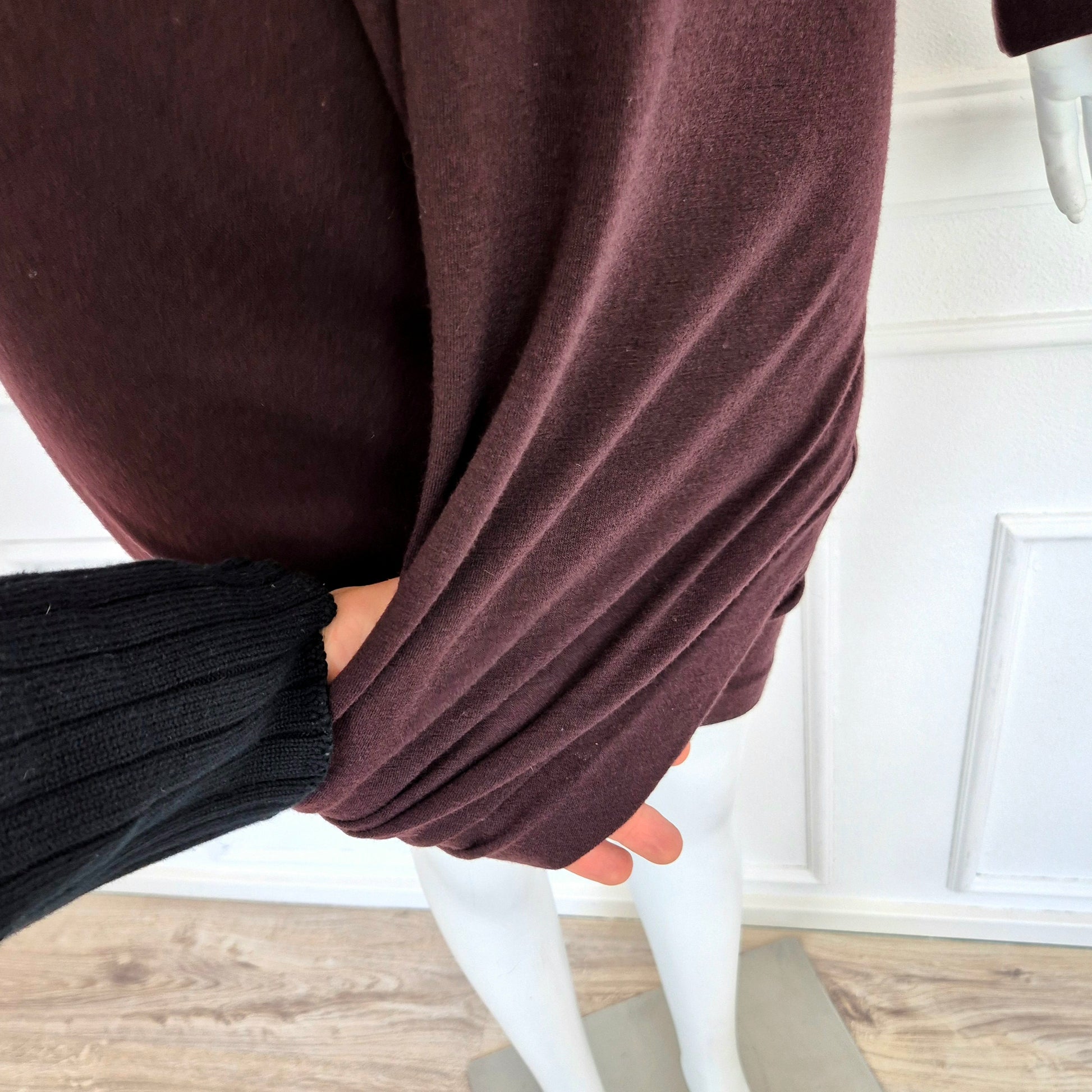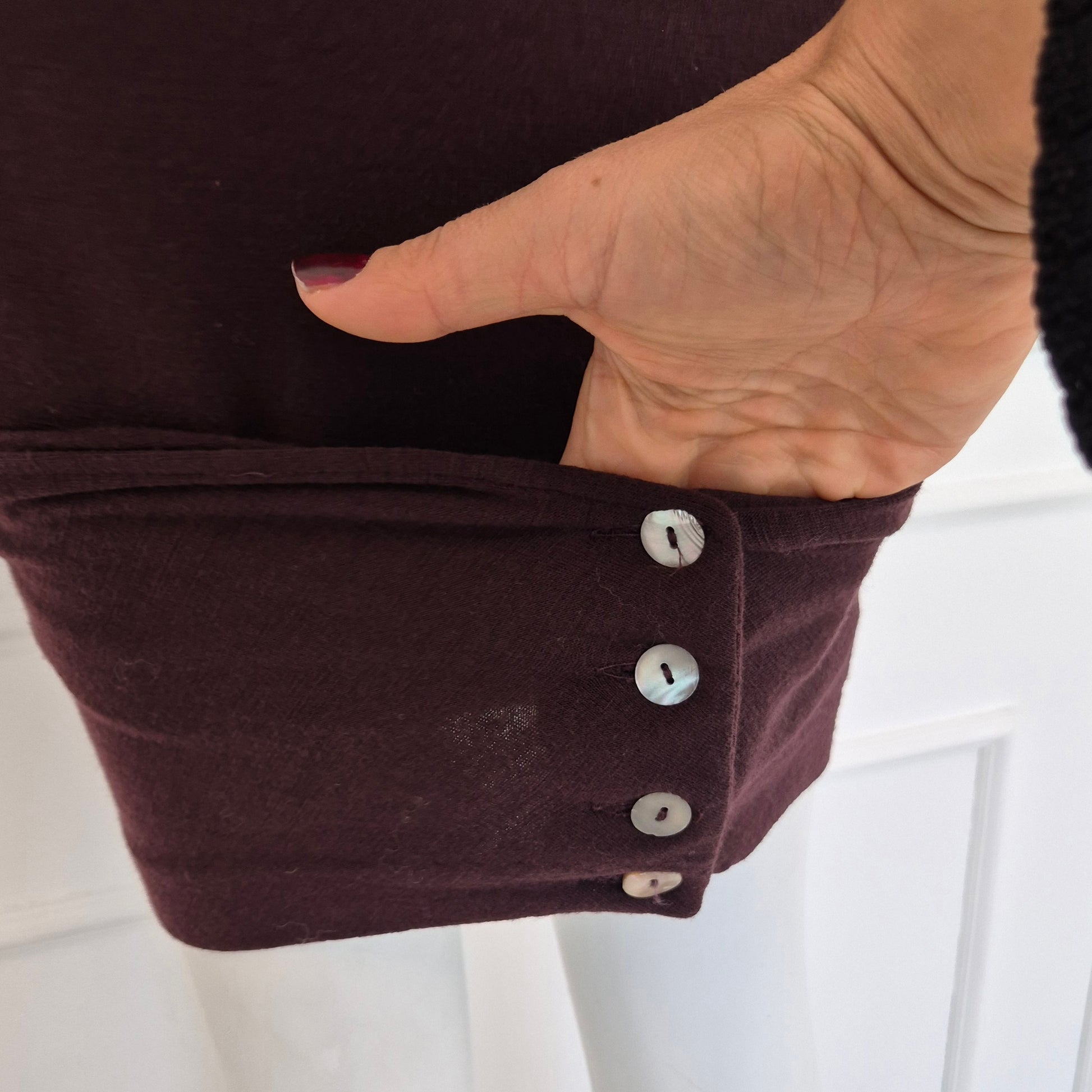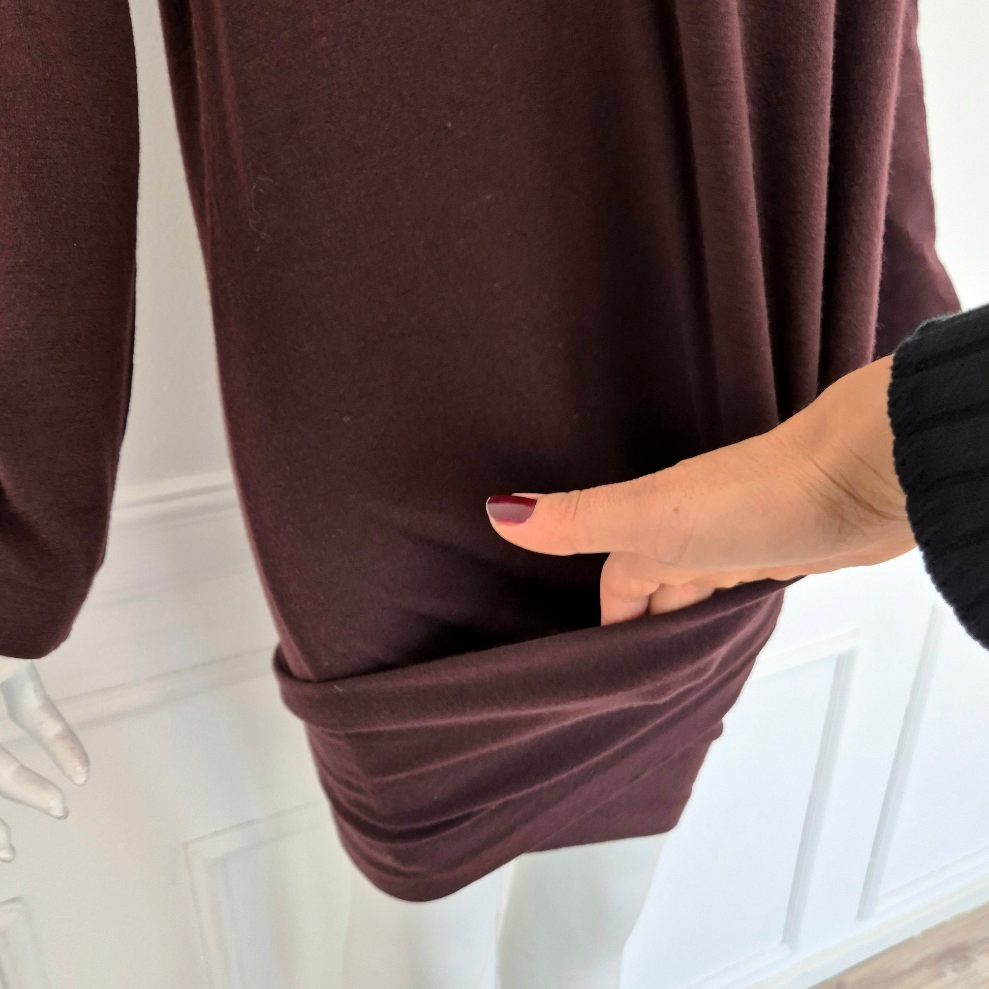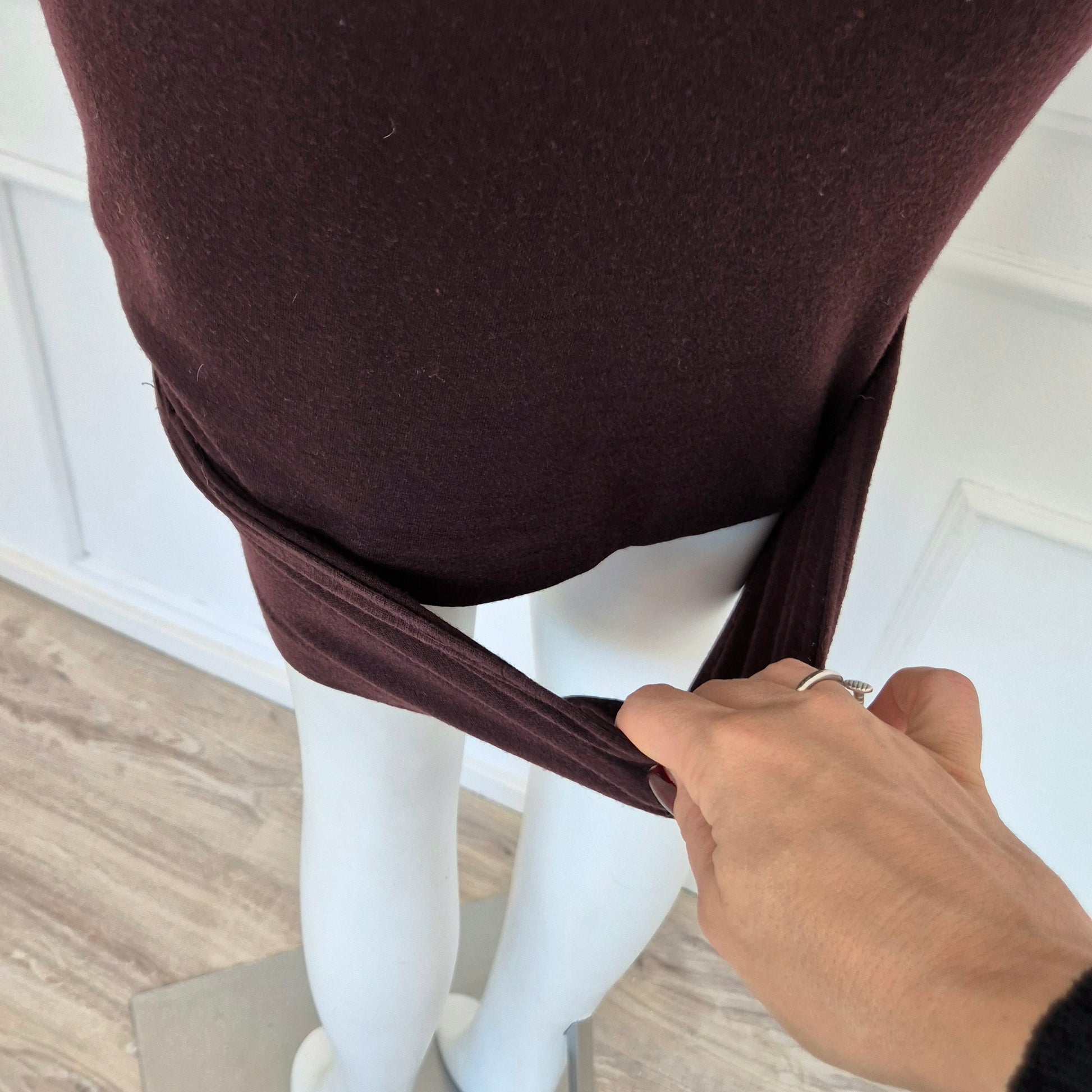 ROMEO GIGLI (fall winter 1988) abito vintage in misto lana color melanzana / vinaccia, una delle tonalità più care allo stilista. Scollo rotondo, manica lunga, linea aderente sul corpo, abbraccia le forme e si ammorbidisce scendendo verso il fondo, dove si incrocia sul retro grazie alla fascia chiusa da bottoni in madreperla naturale.
