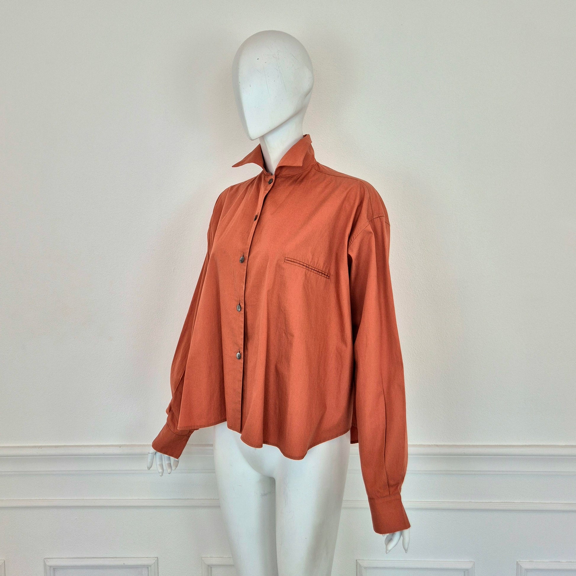 ROMEO GIGLI (1990) camicia vintage in cotone arancio zucca, con colletto a punta da portare abbottonato, manica lunga e taschino sul seno. Bottoni in madreperla naturale su tutta la lunghezza.