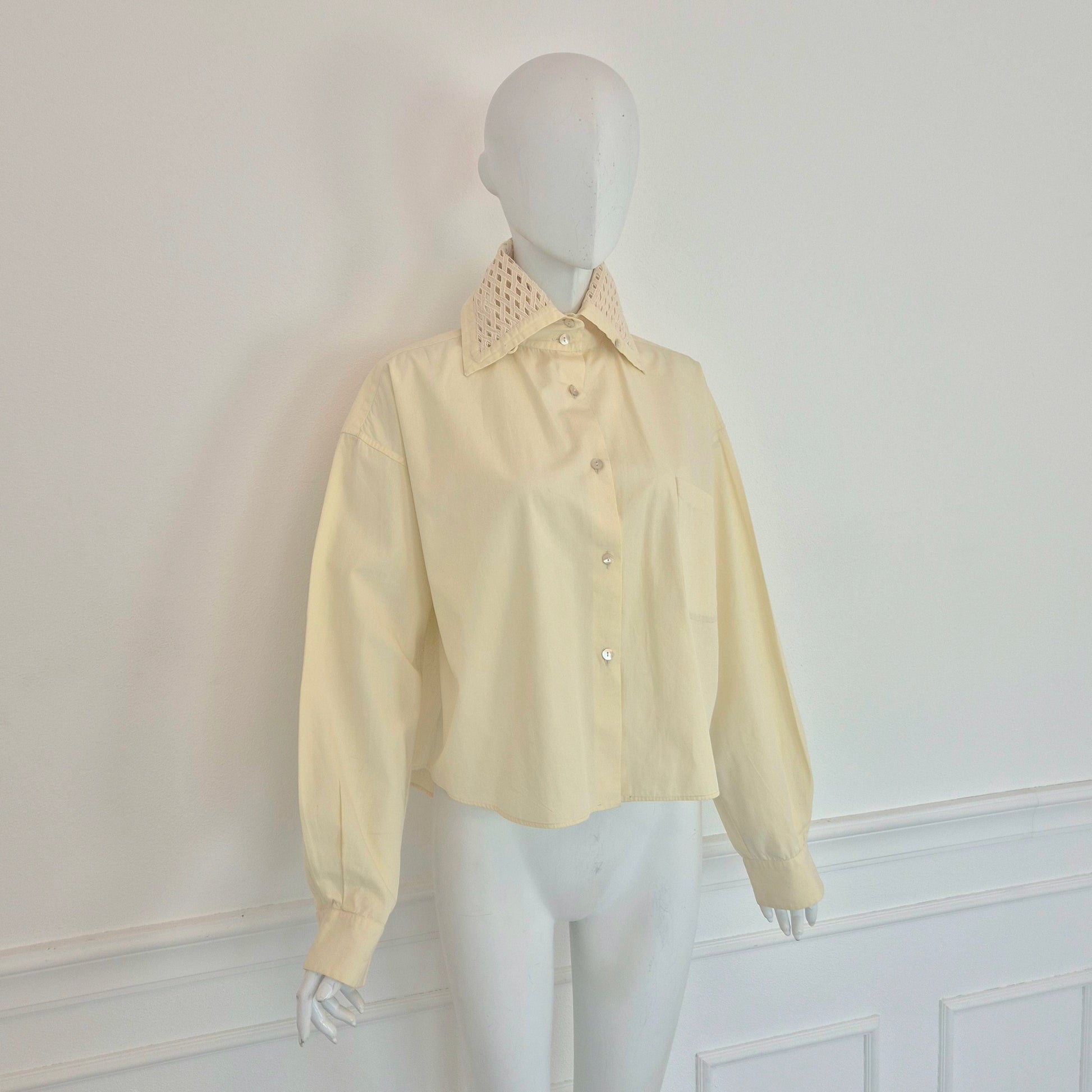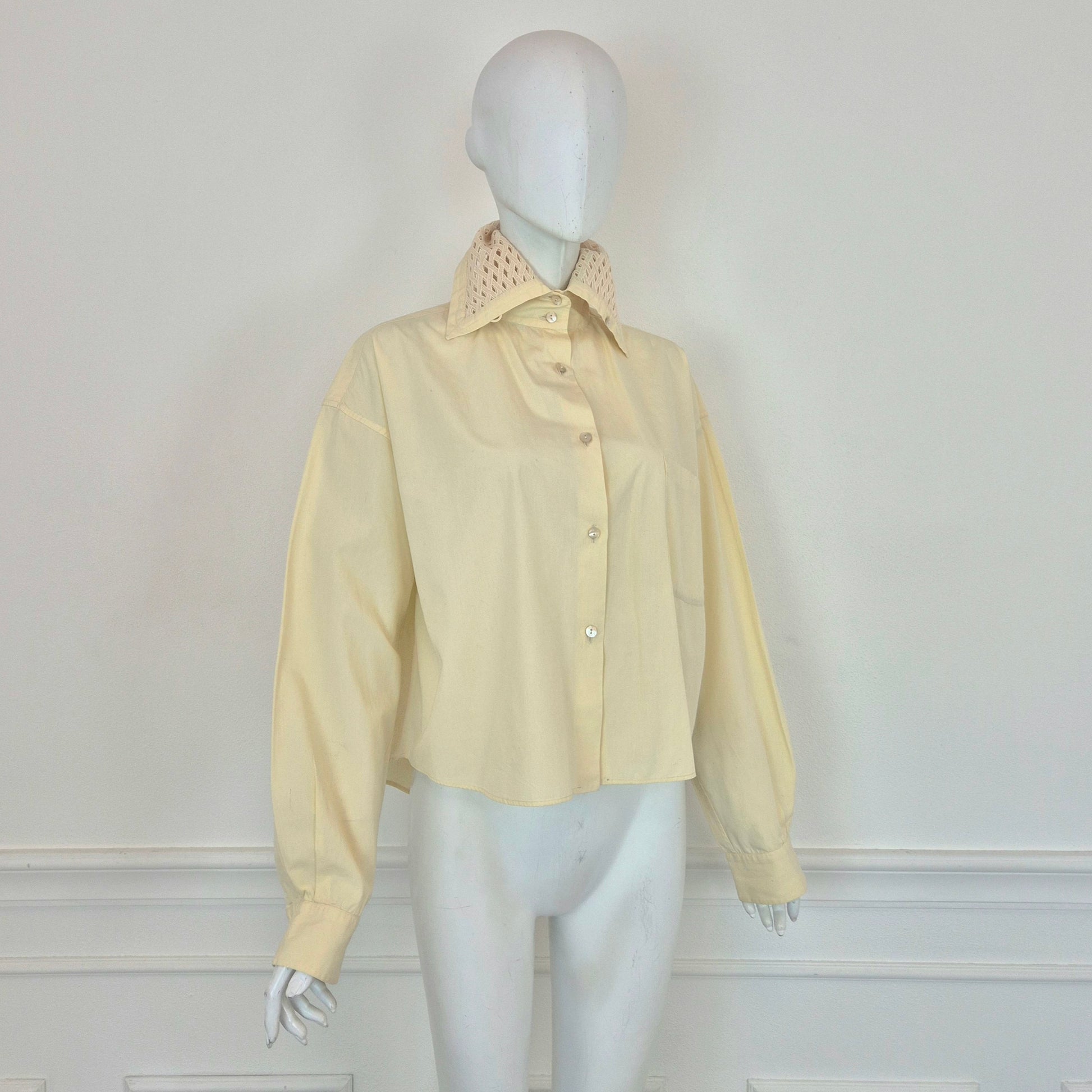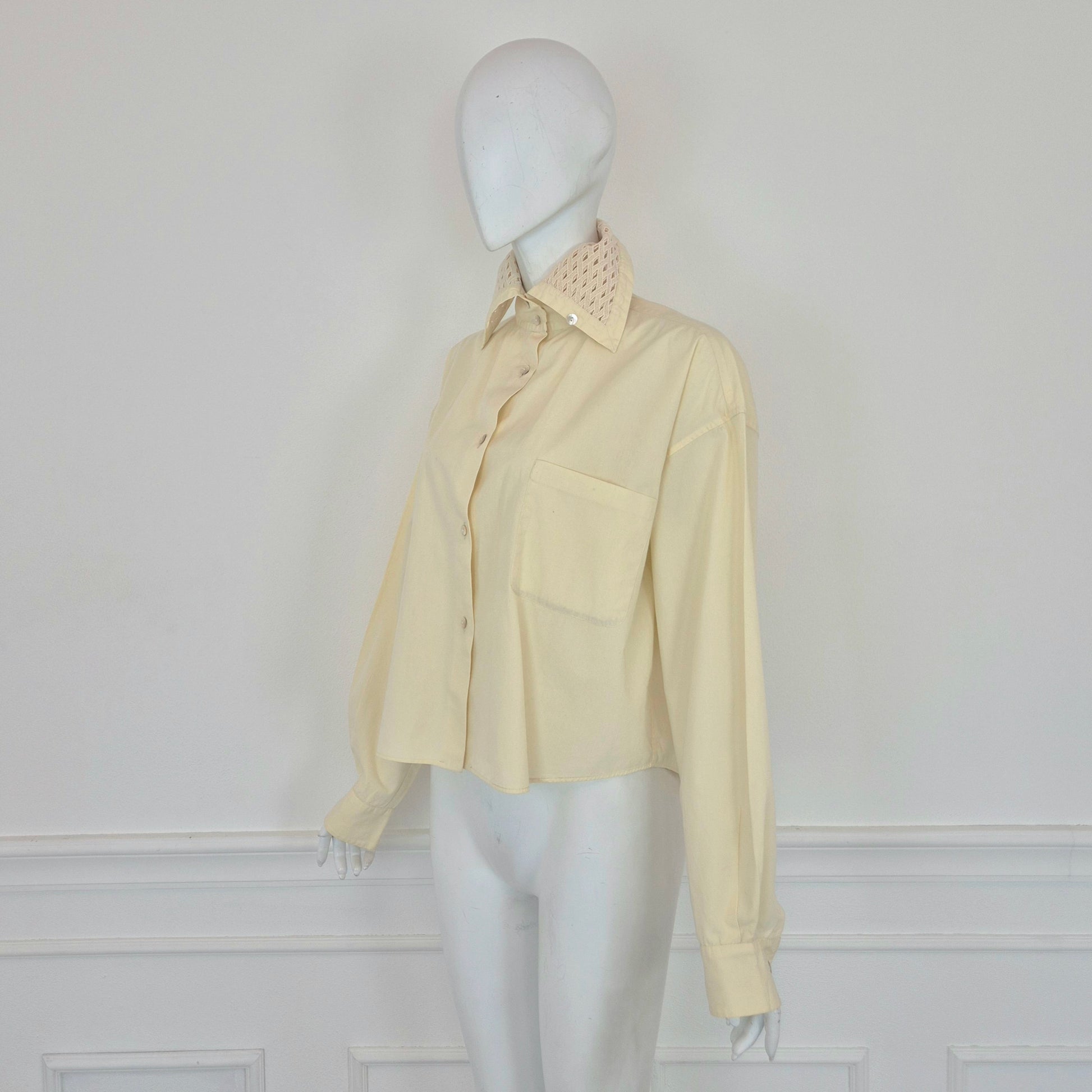 ROMEO GIGLI (1992) camicia vintage in cotone color avorio con bottoncini in madreperla, taschino frontale e colletto lavorato.