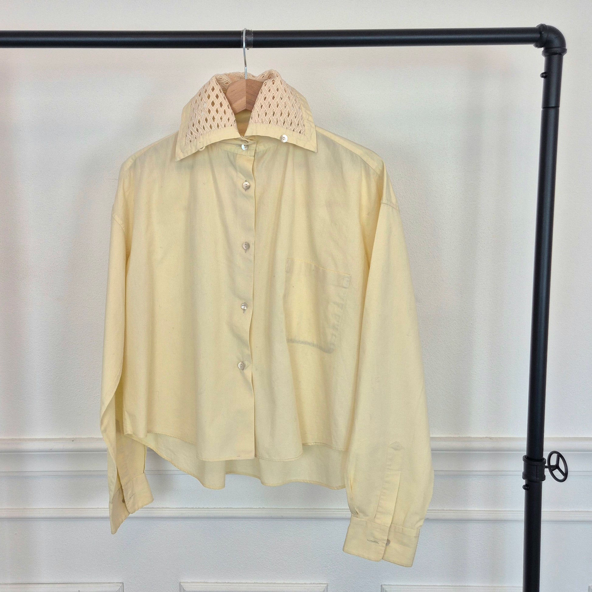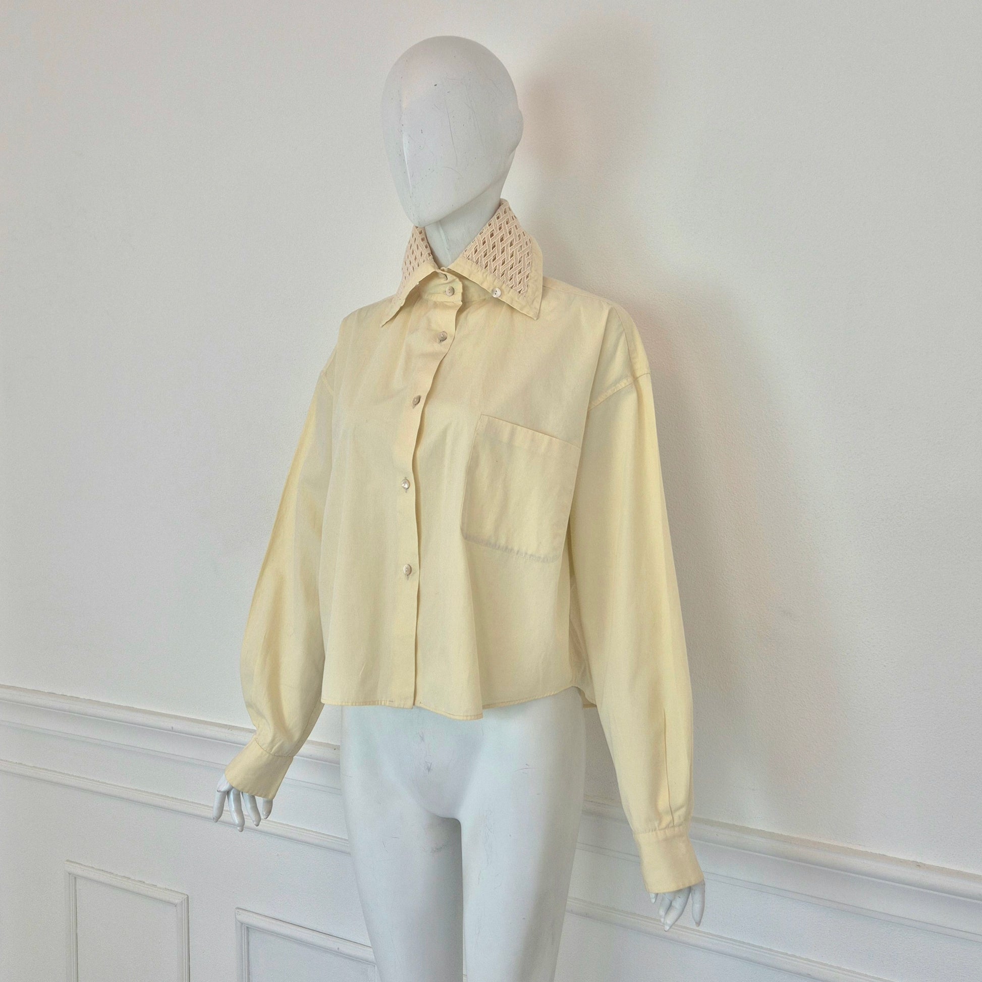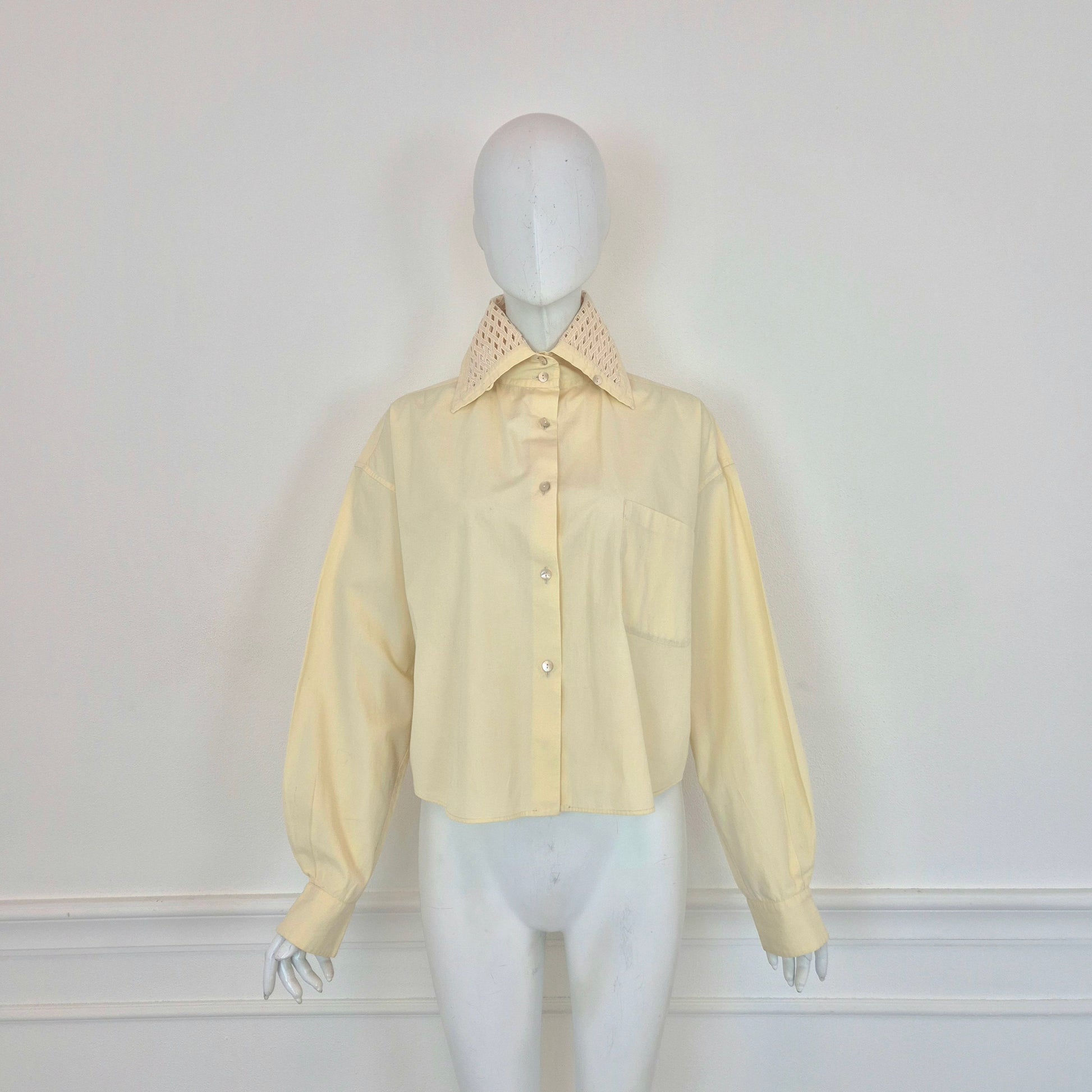 ROMEO GIGLI (1992) camicia vintage in cotone color avorio con bottoncini in madreperla, taschino frontale e colletto lavorato.