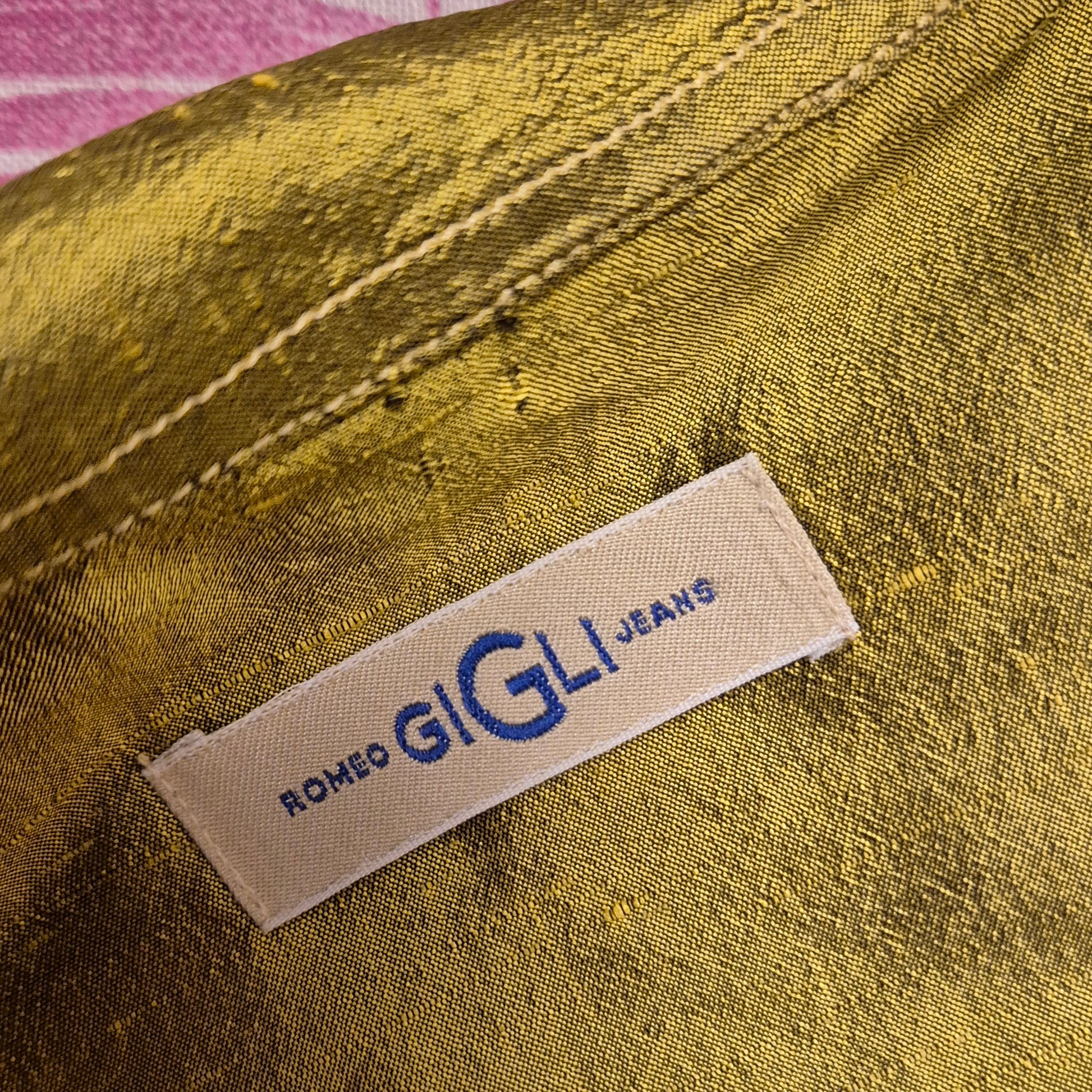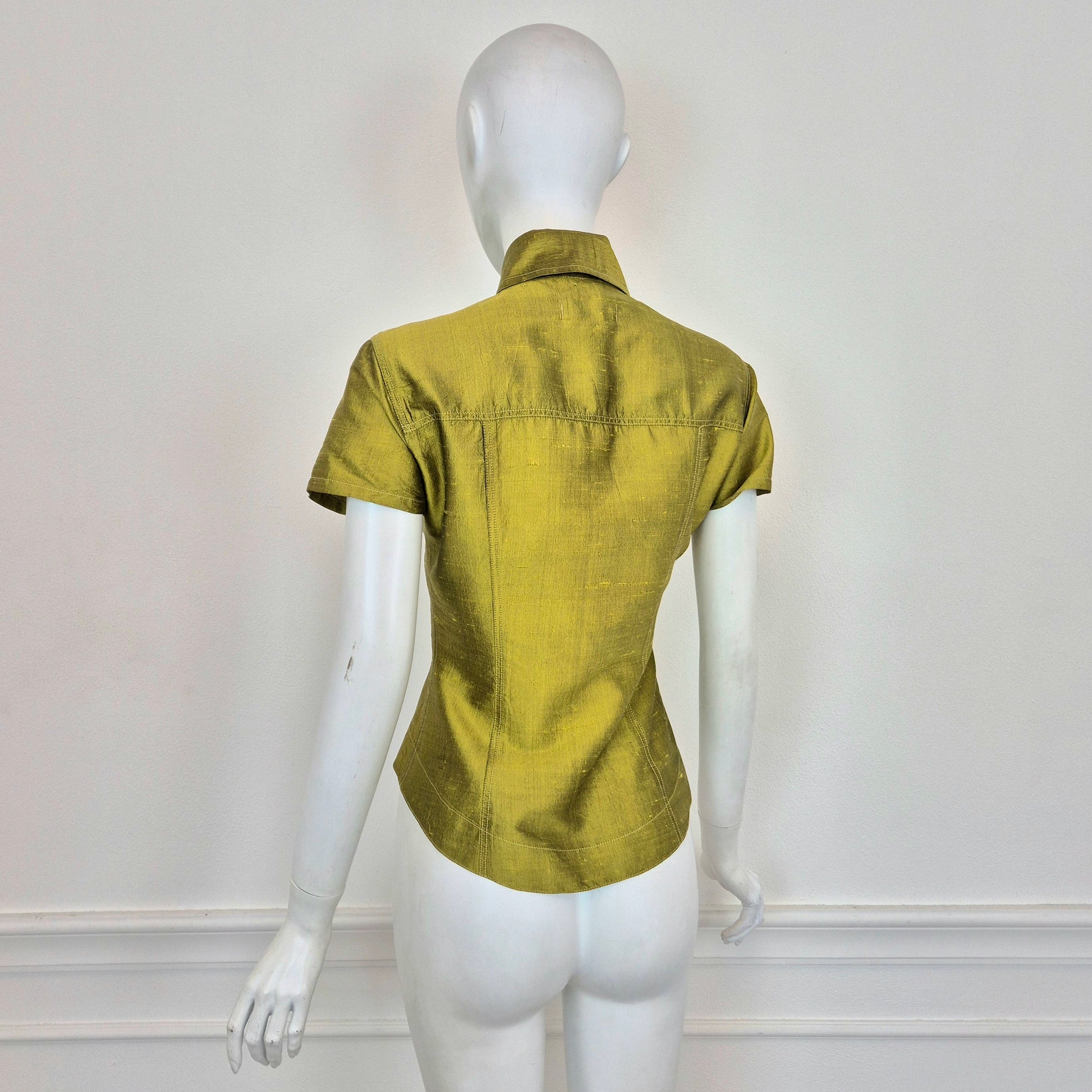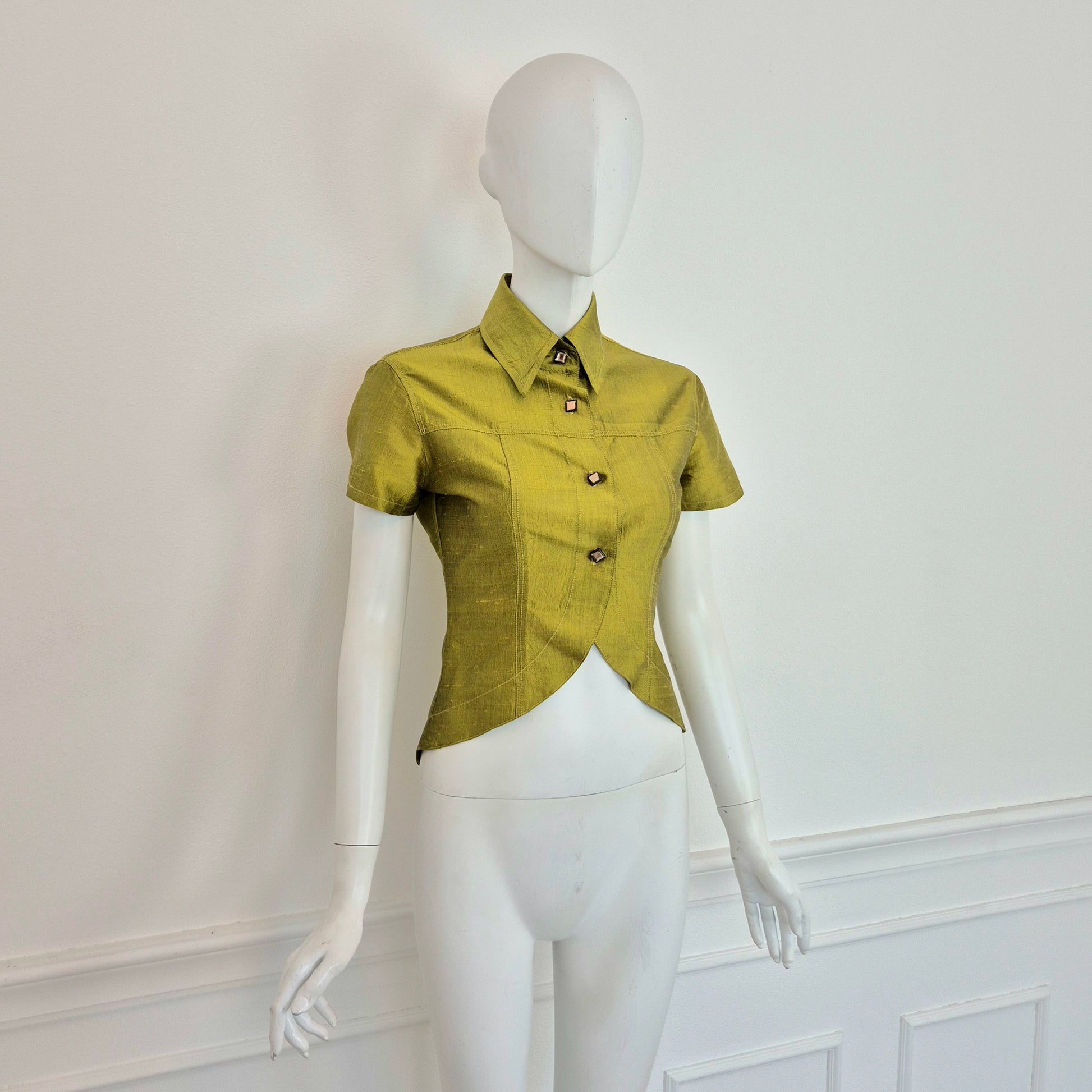 ROMEO GIGLI (linea jeans) camicia vintage anni '90 in seta grezza color verde mela con particolari bottoncini quadrati, colletto a punta e linea sagomata che lascia scoperto l'ombelico.