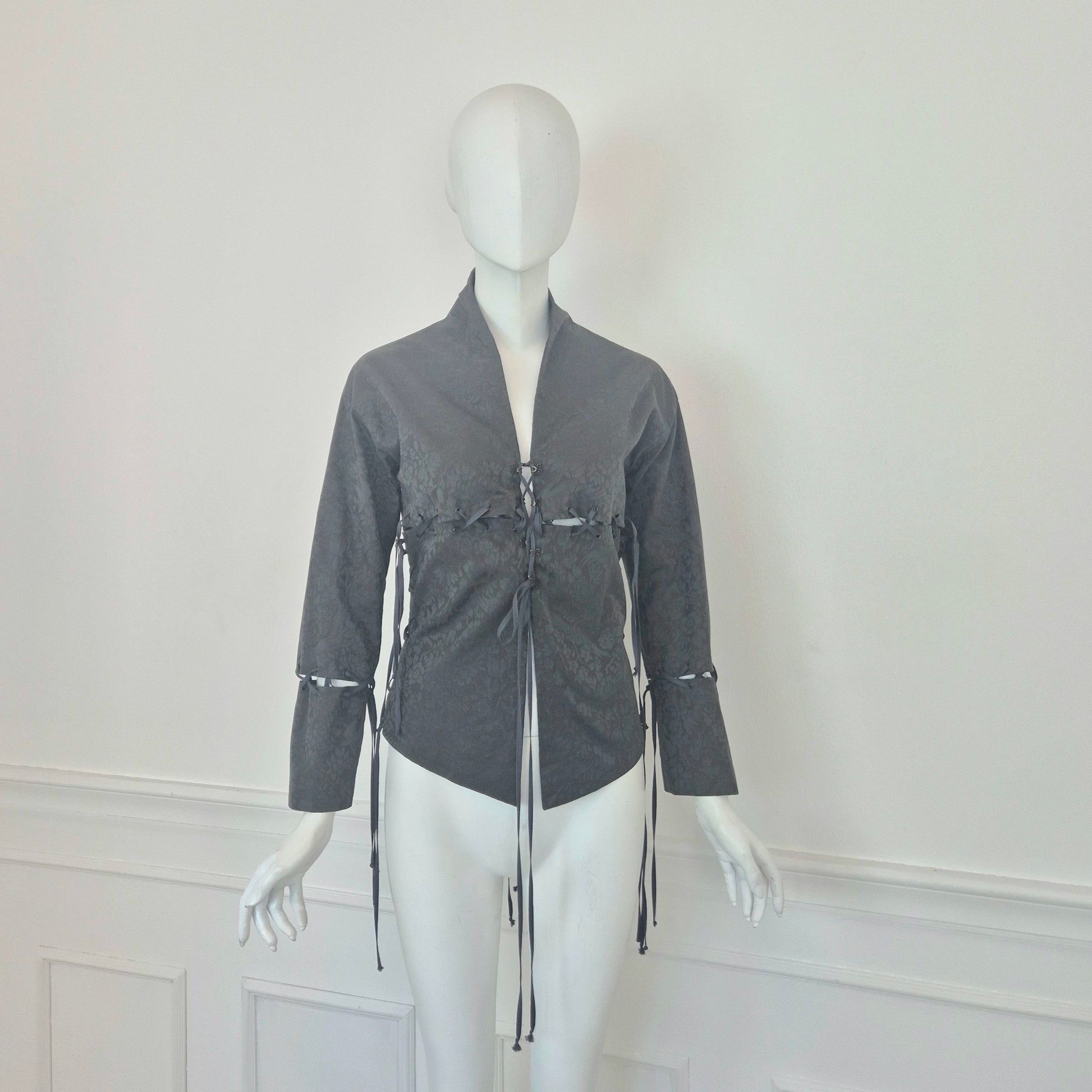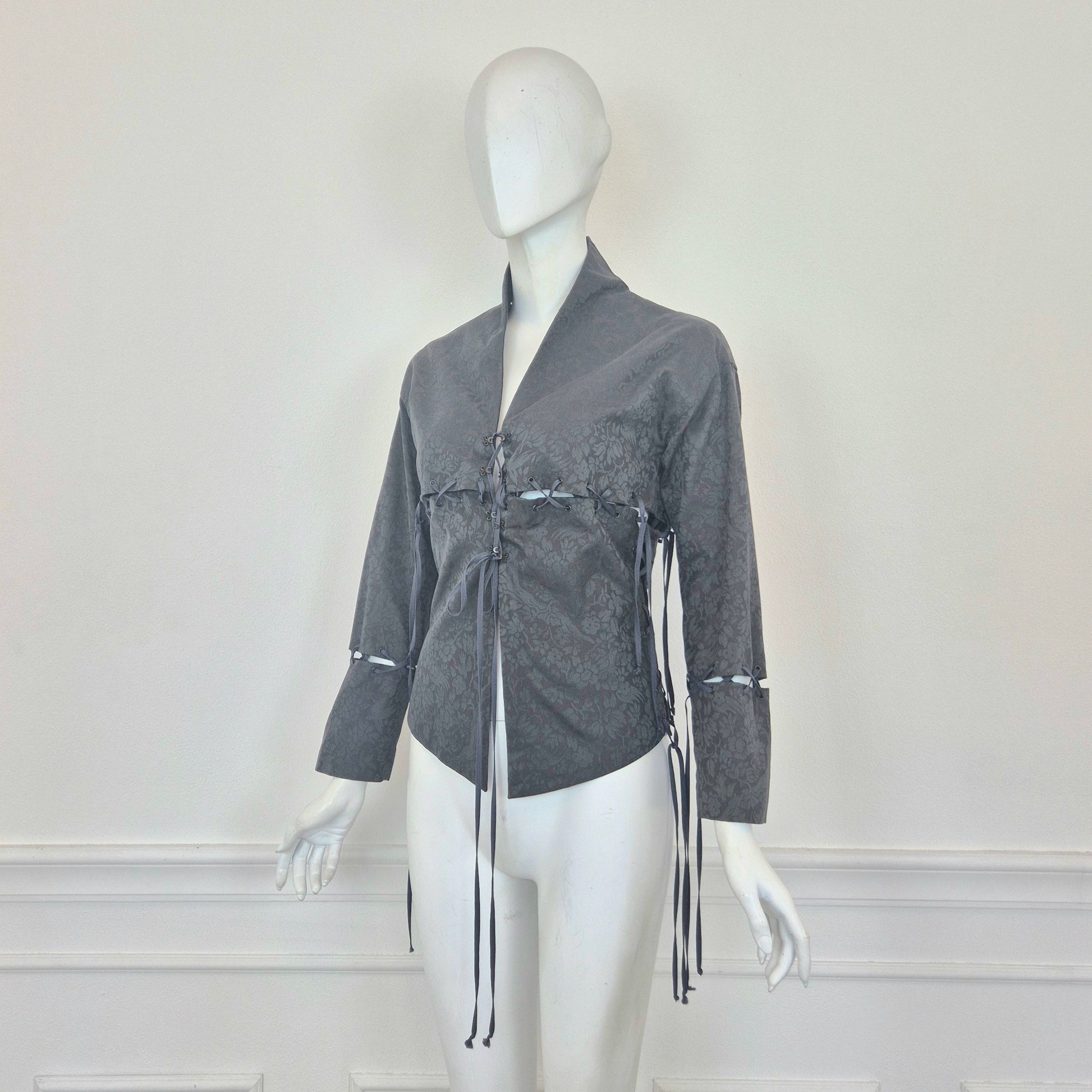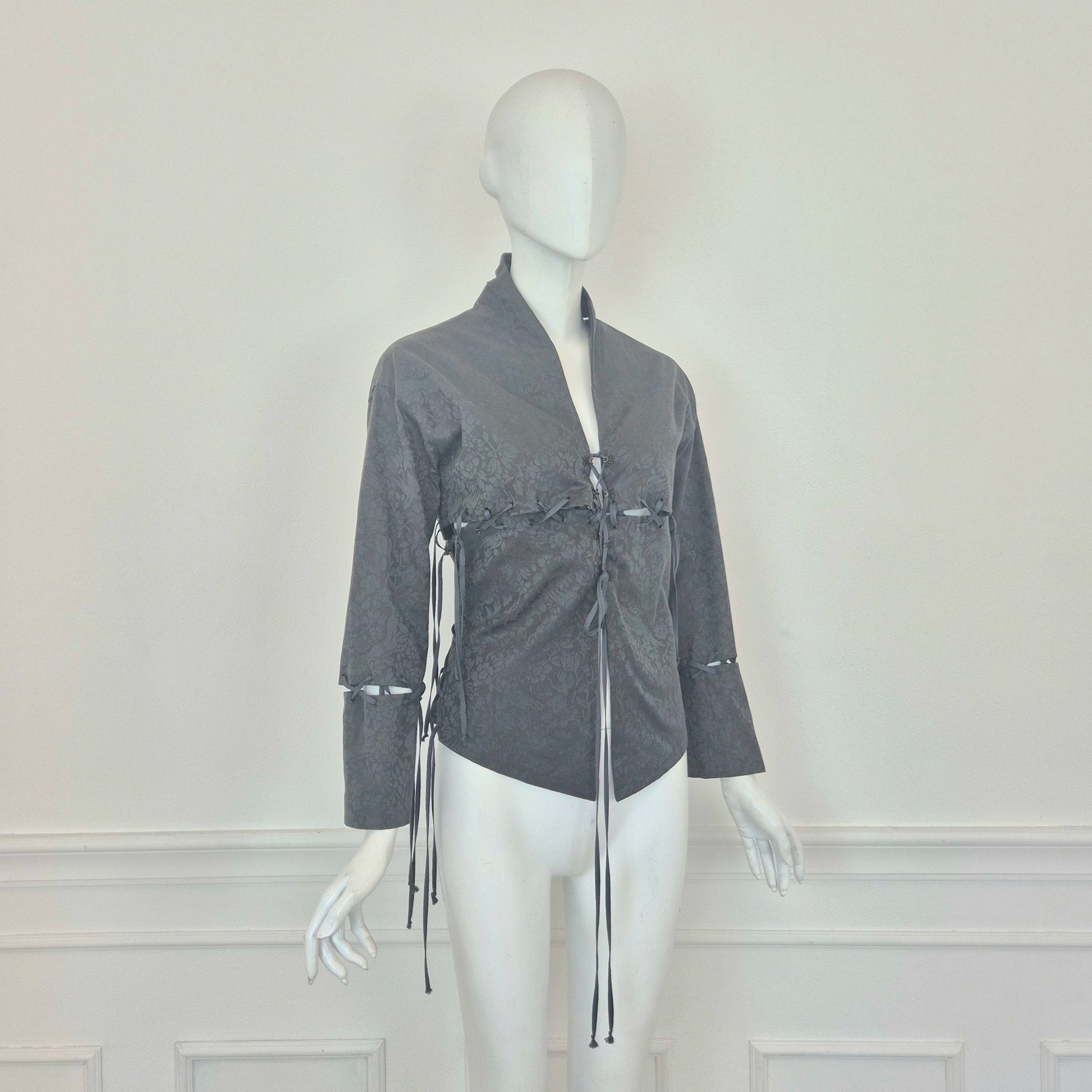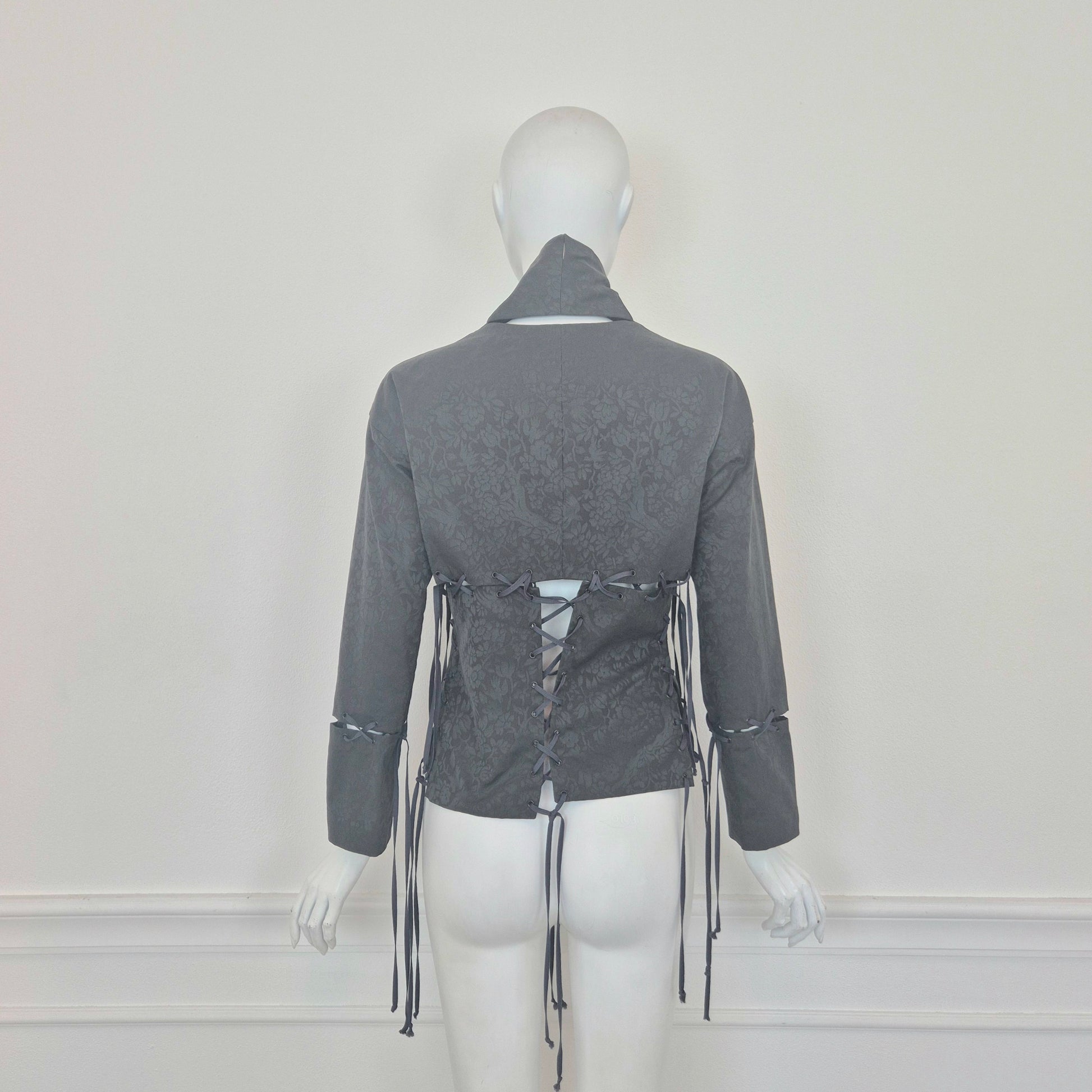 ROMEO GIGLI giacca vintage anni '2000 in cotone grigio dalla stampa floreale tono su tono, con particolari stringhe che ne tengono intrecciati i diversi pezzi. Gancini sul davanti per allacciarla in vario modo tramite le apposite stringhe.