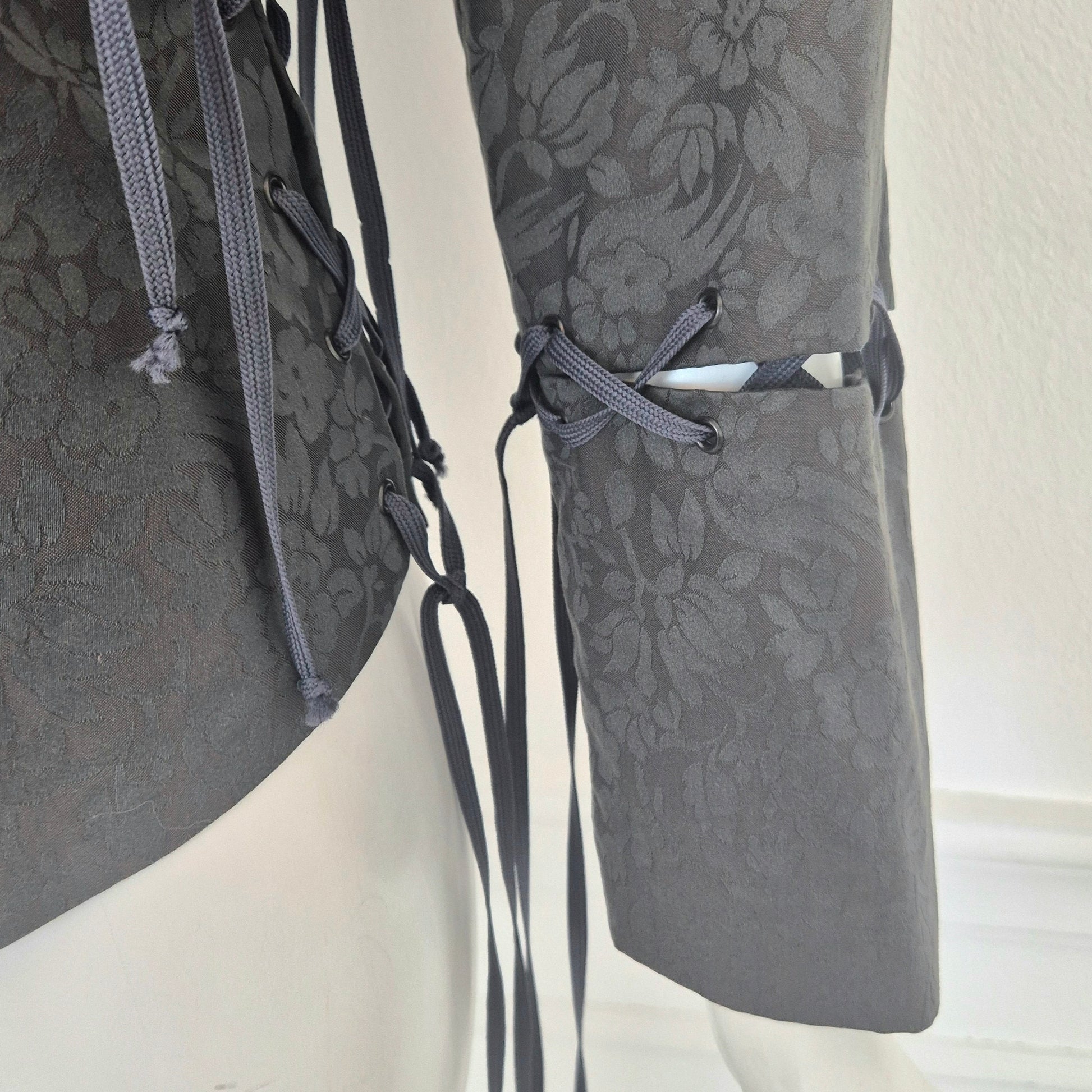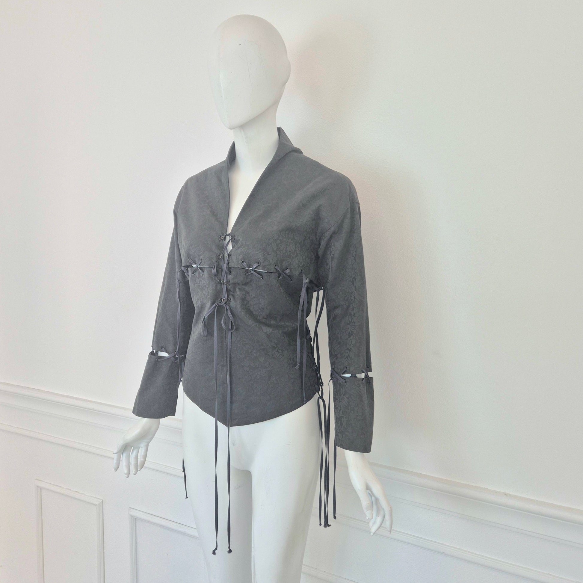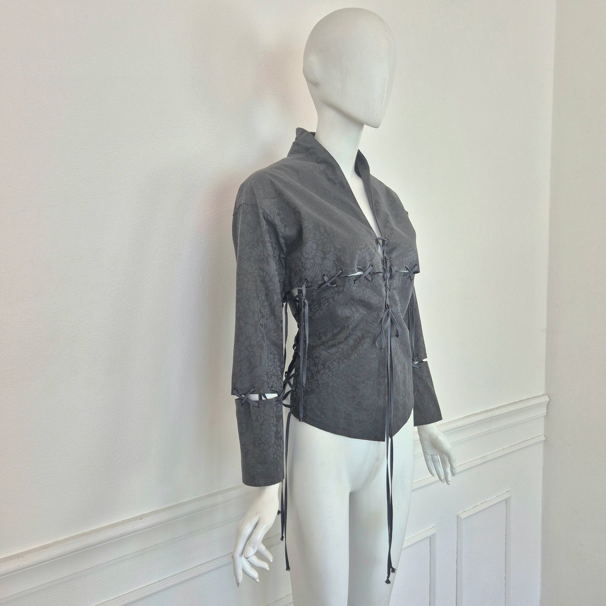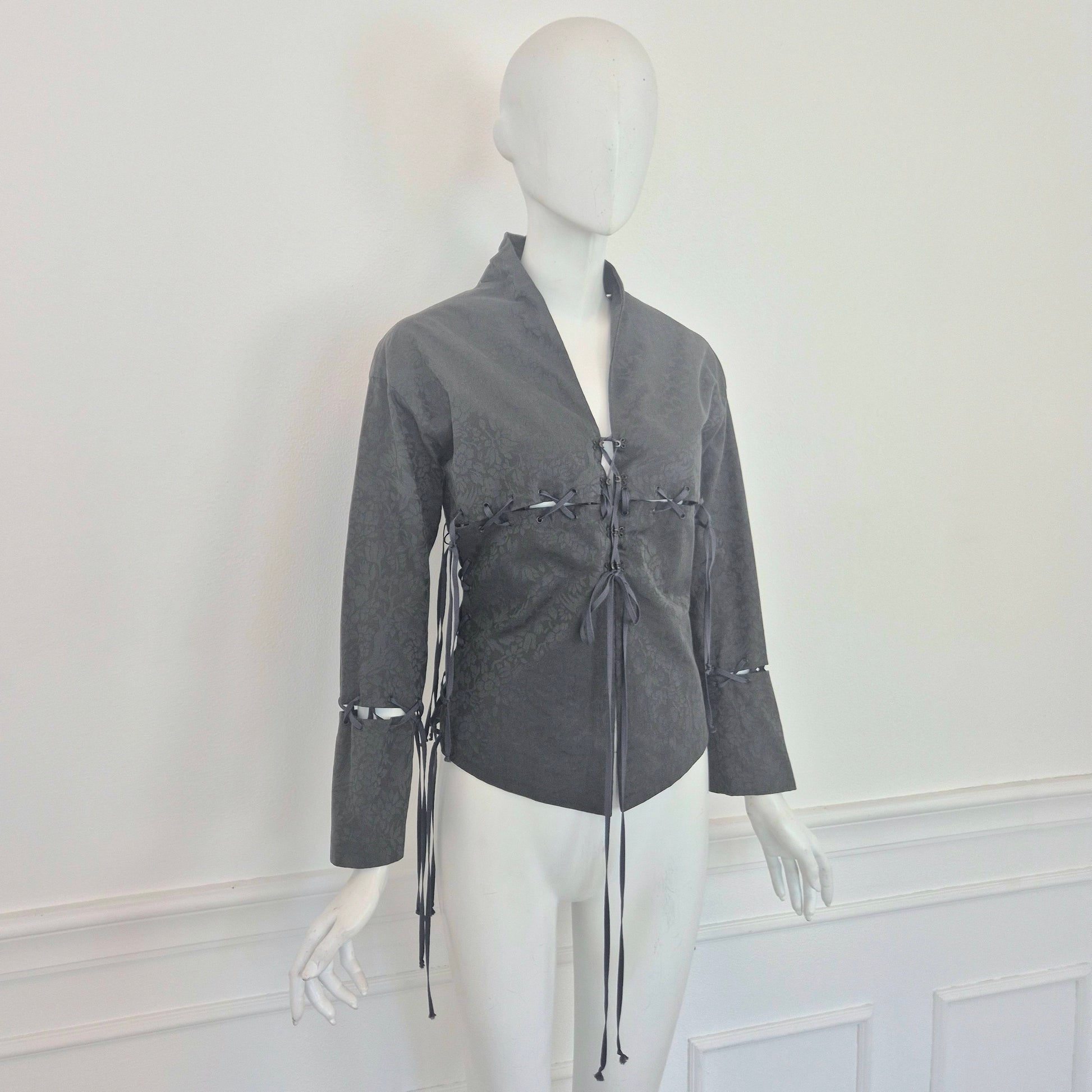 ROMEO GIGLI giacca vintage anni '2000 in cotone grigio dalla stampa floreale tono su tono, con particolari stringhe che ne tengono intrecciati i diversi pezzi. Gancini sul davanti per allacciarla in vario modo tramite le apposite stringhe.