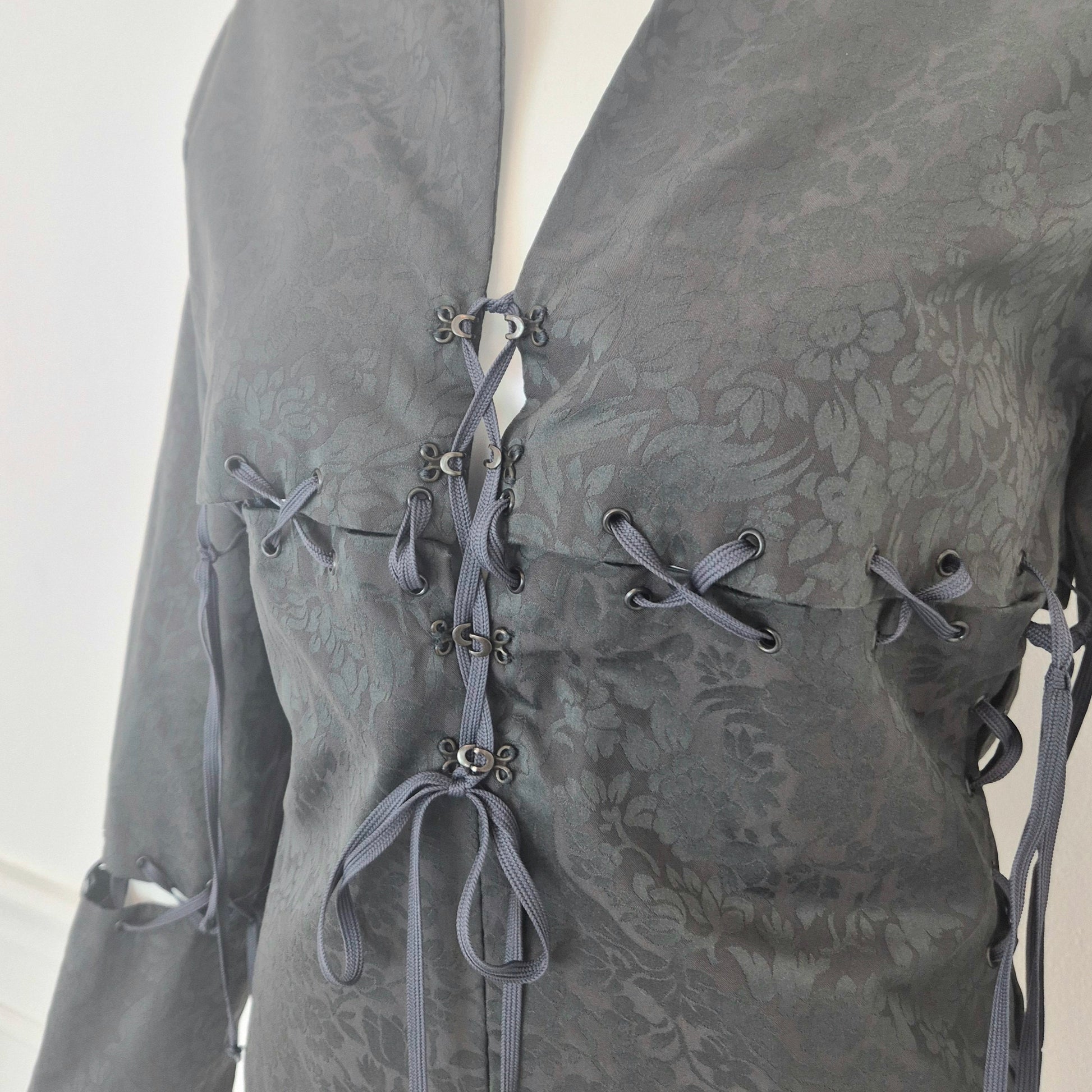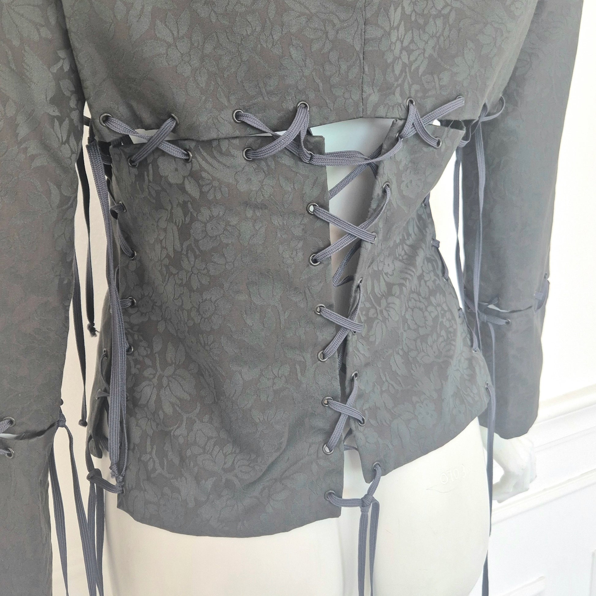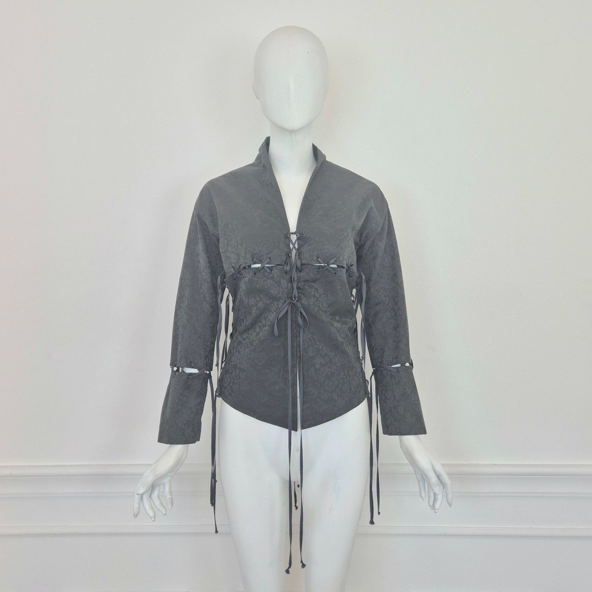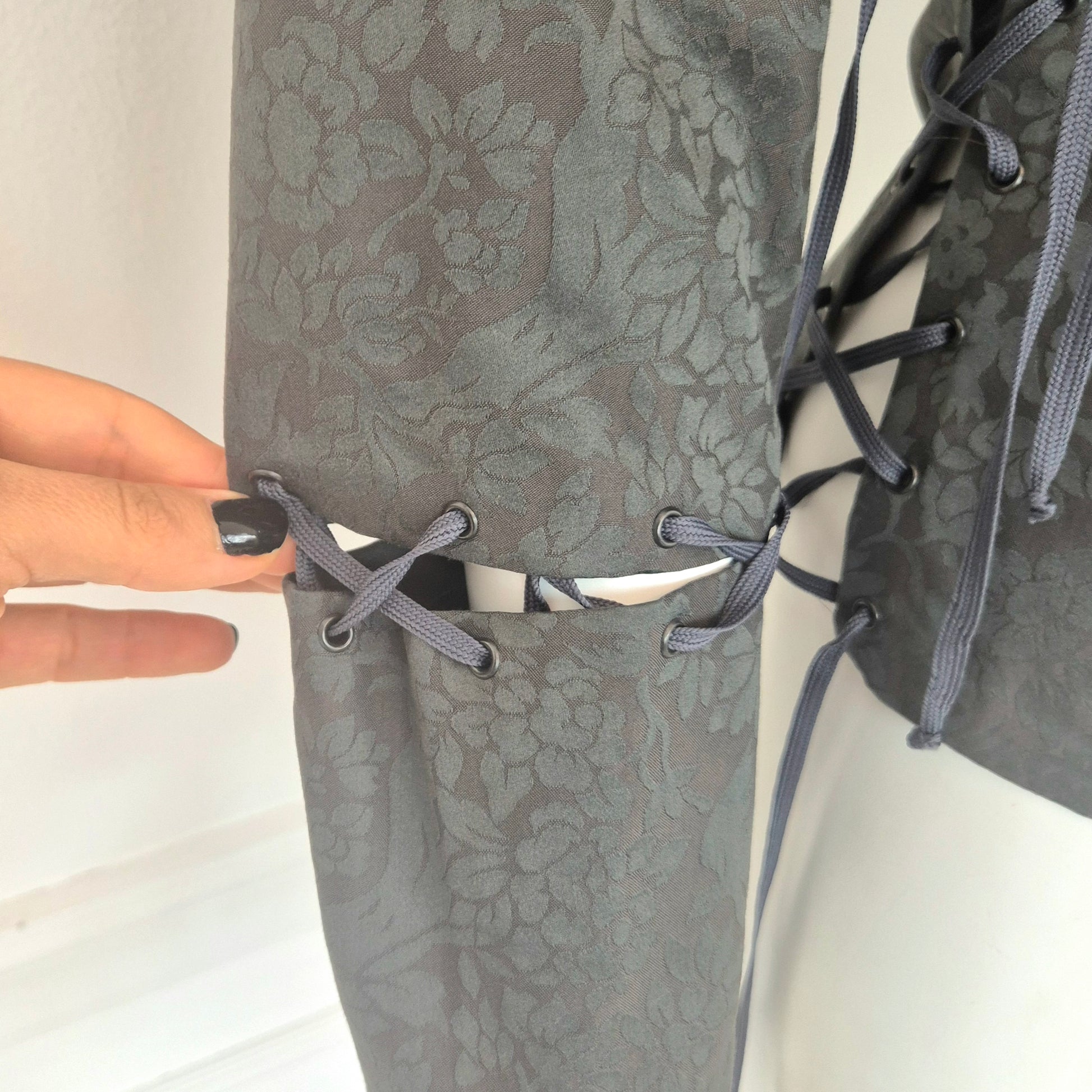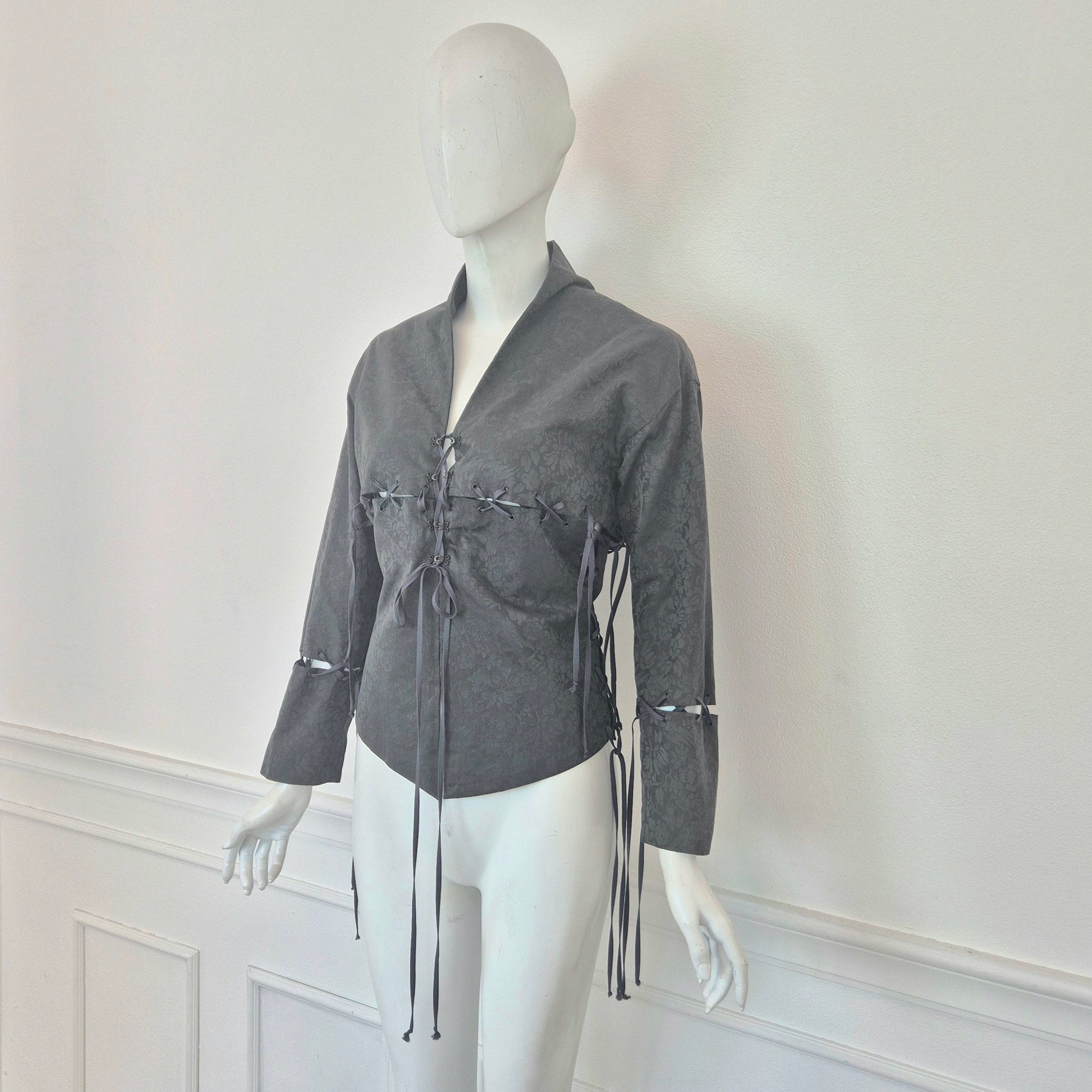 ROMEO GIGLI giacca vintage anni '2000 in cotone grigio dalla stampa floreale tono su tono, con particolari stringhe che ne tengono intrecciati i diversi pezzi. Gancini sul davanti per allacciarla in vario modo tramite le apposite stringhe.