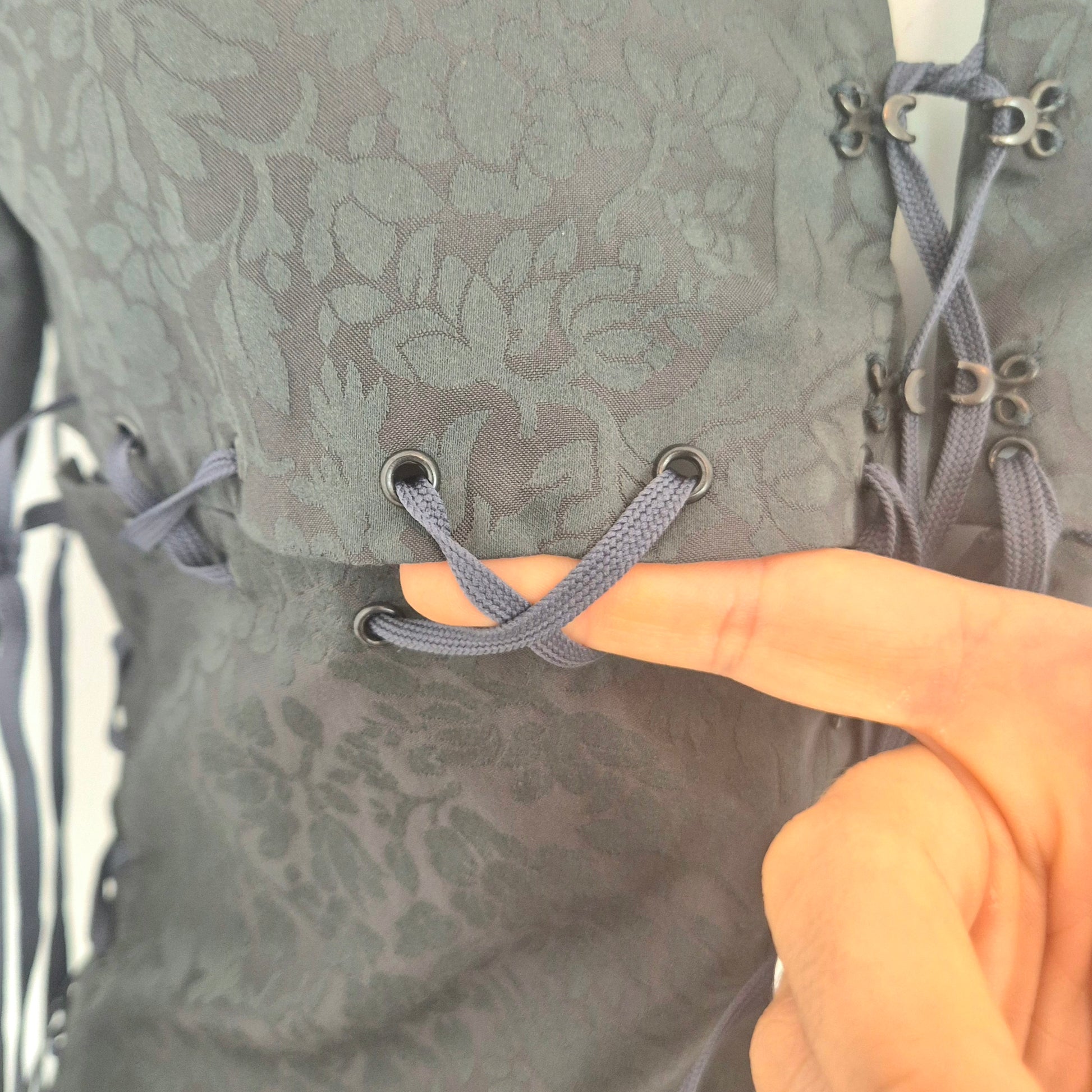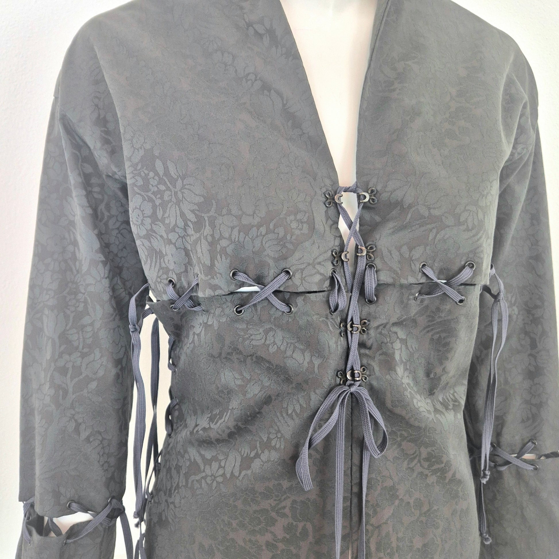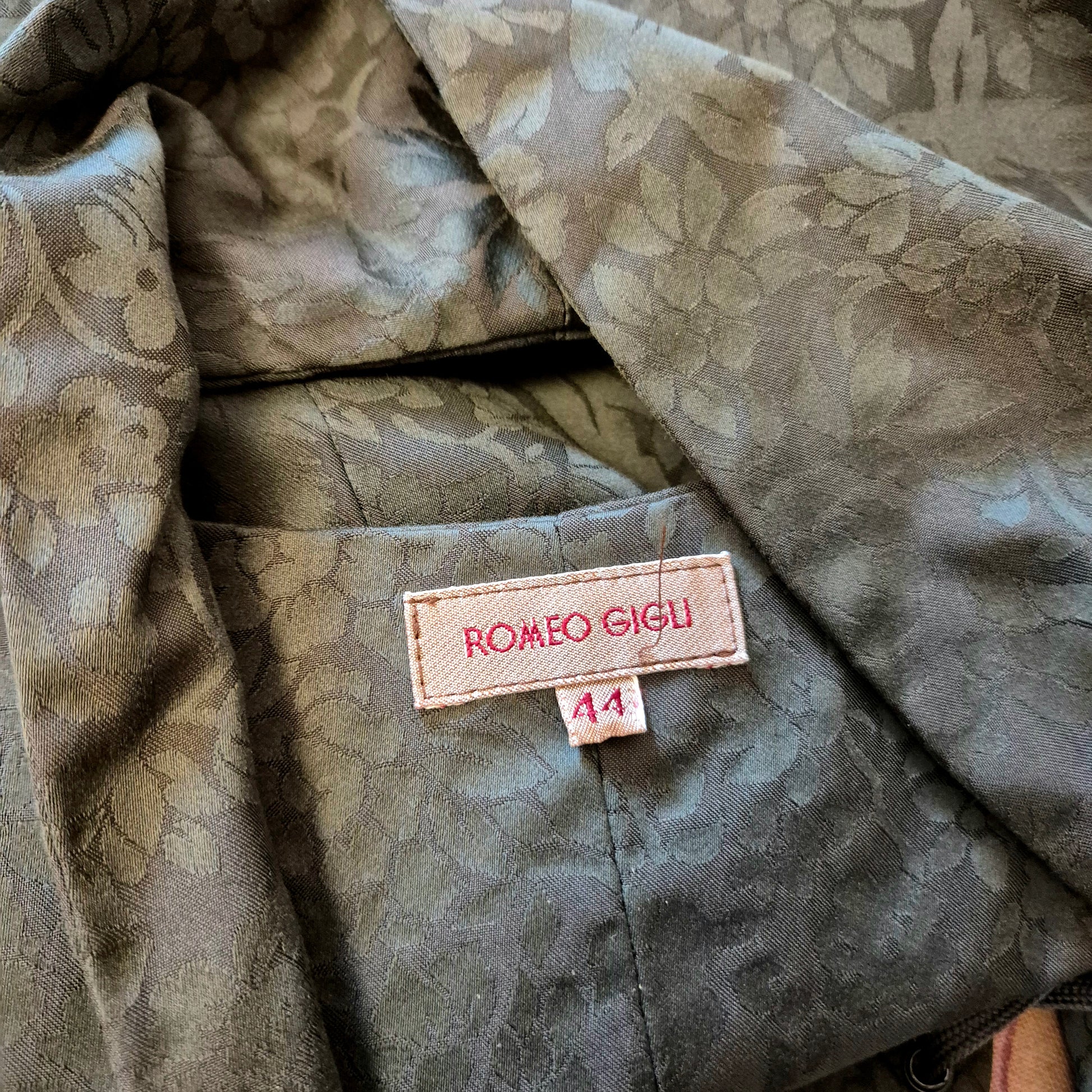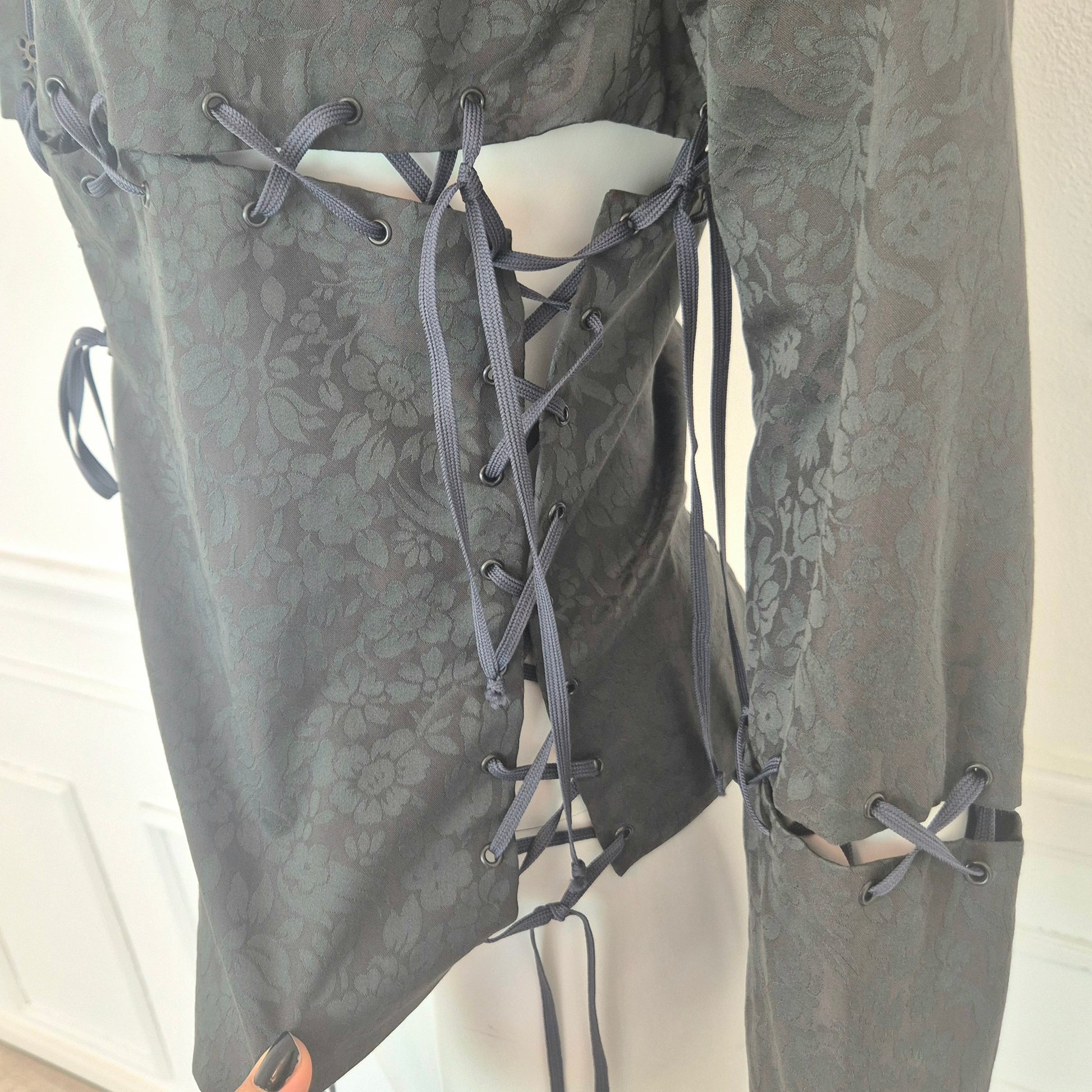 ROMEO GIGLI giacca vintage anni '2000 in cotone grigio dalla stampa floreale tono su tono, con particolari stringhe che ne tengono intrecciati i diversi pezzi. Gancini sul davanti per allacciarla in vario modo tramite le apposite stringhe.