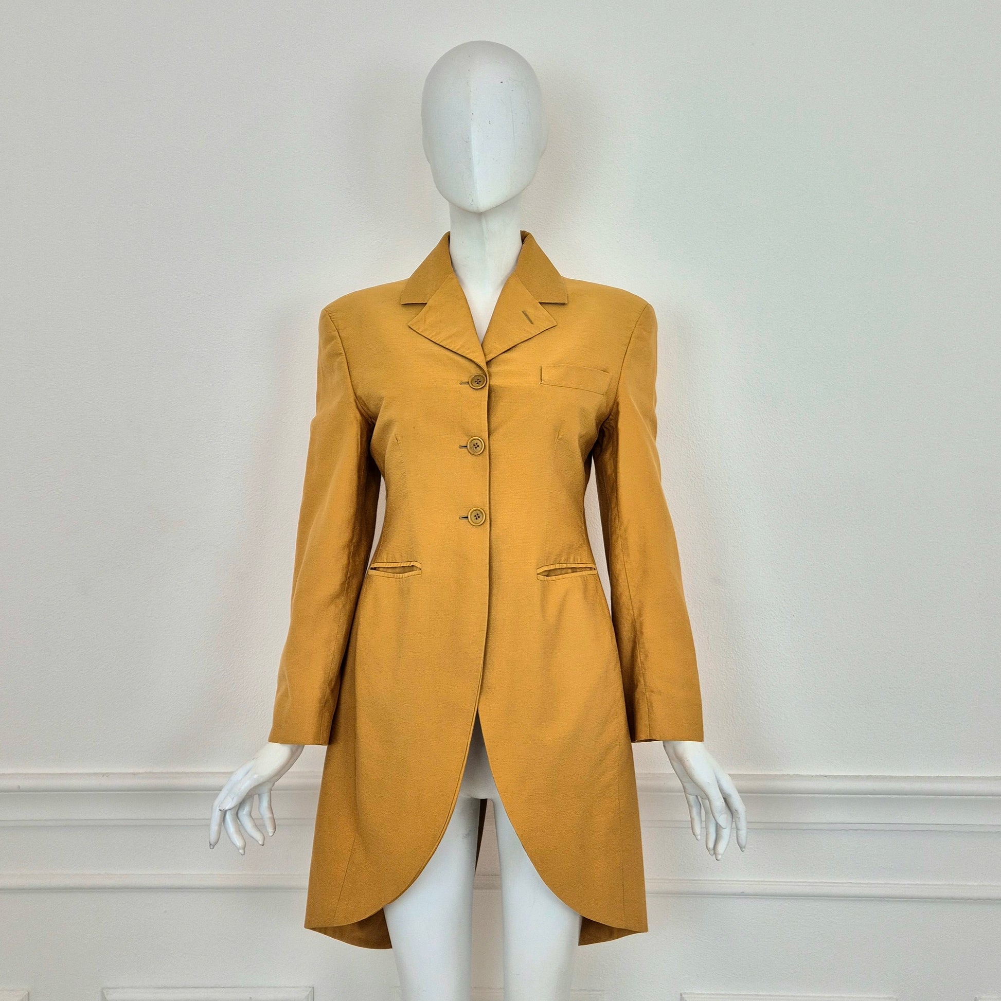 ROMEO GIGLI (1990) giacca lunga taglio frac - soprabito in cotone color giallo zafferano, con abbottonatura monopetto tre bottoni, linea sciancrata ed ampio spacco sul retro.