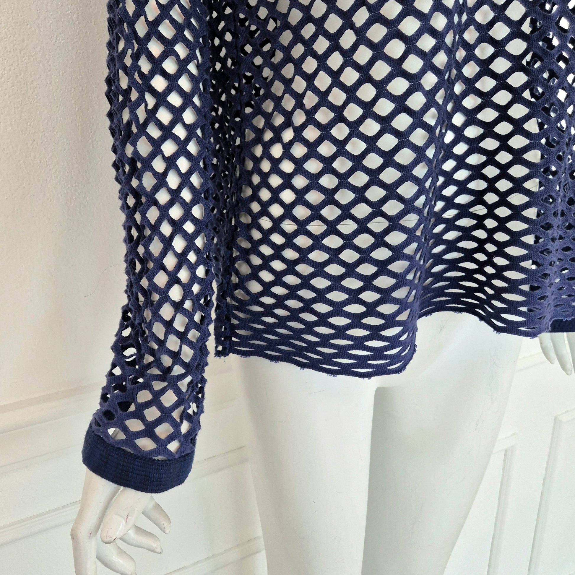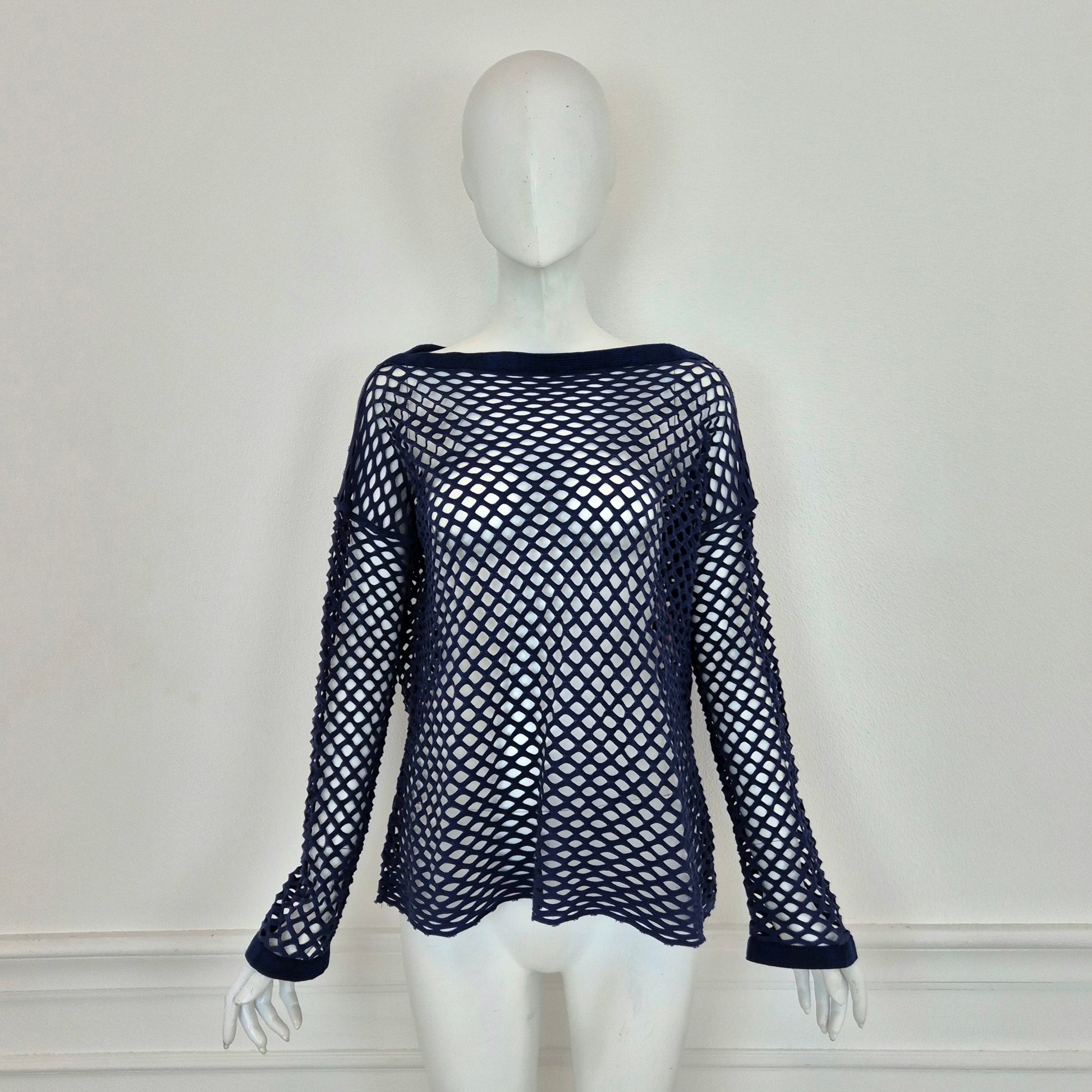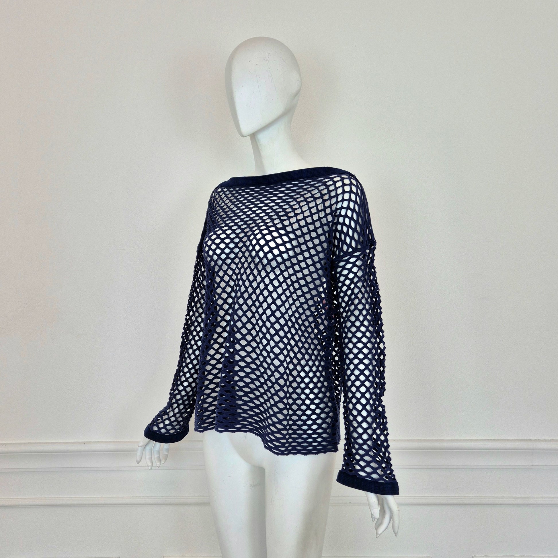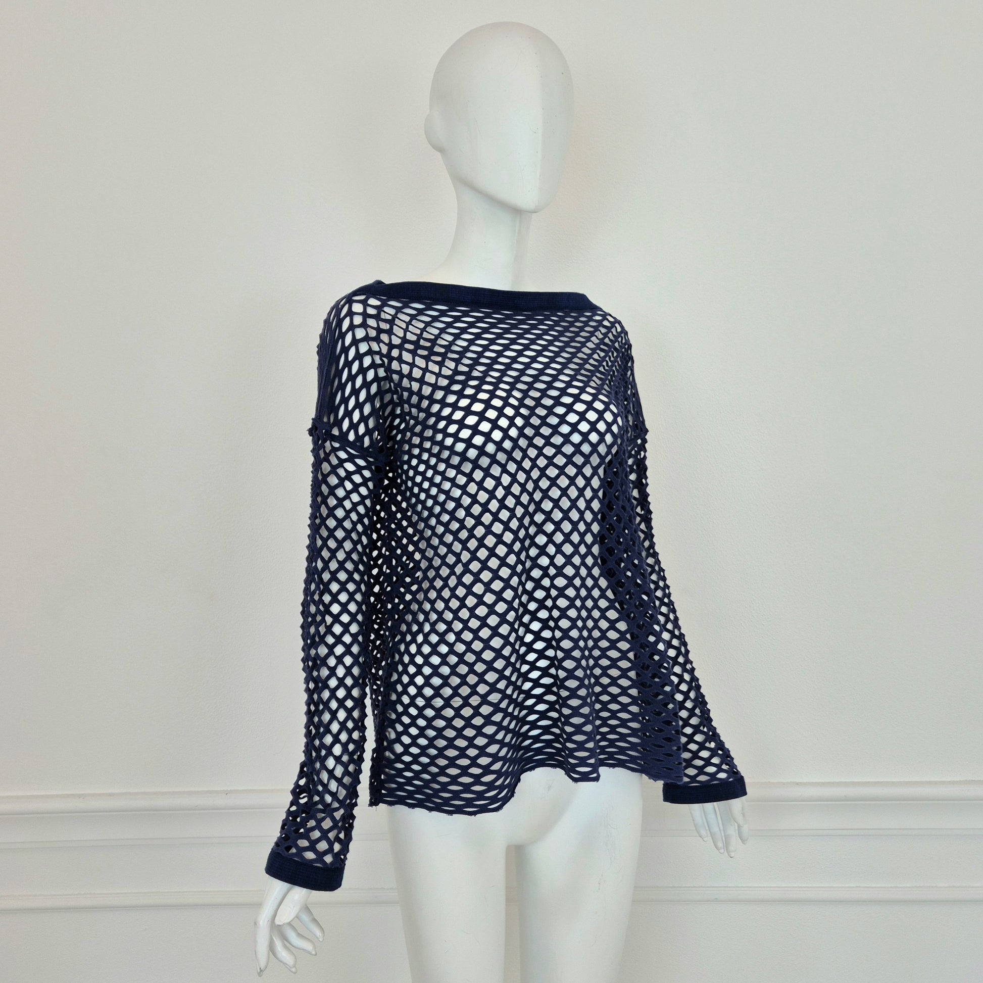 ROMEO GIGLI (1994) maglia vintage in rete di cotone color blu, con scollo a barchetta e manica lunga.