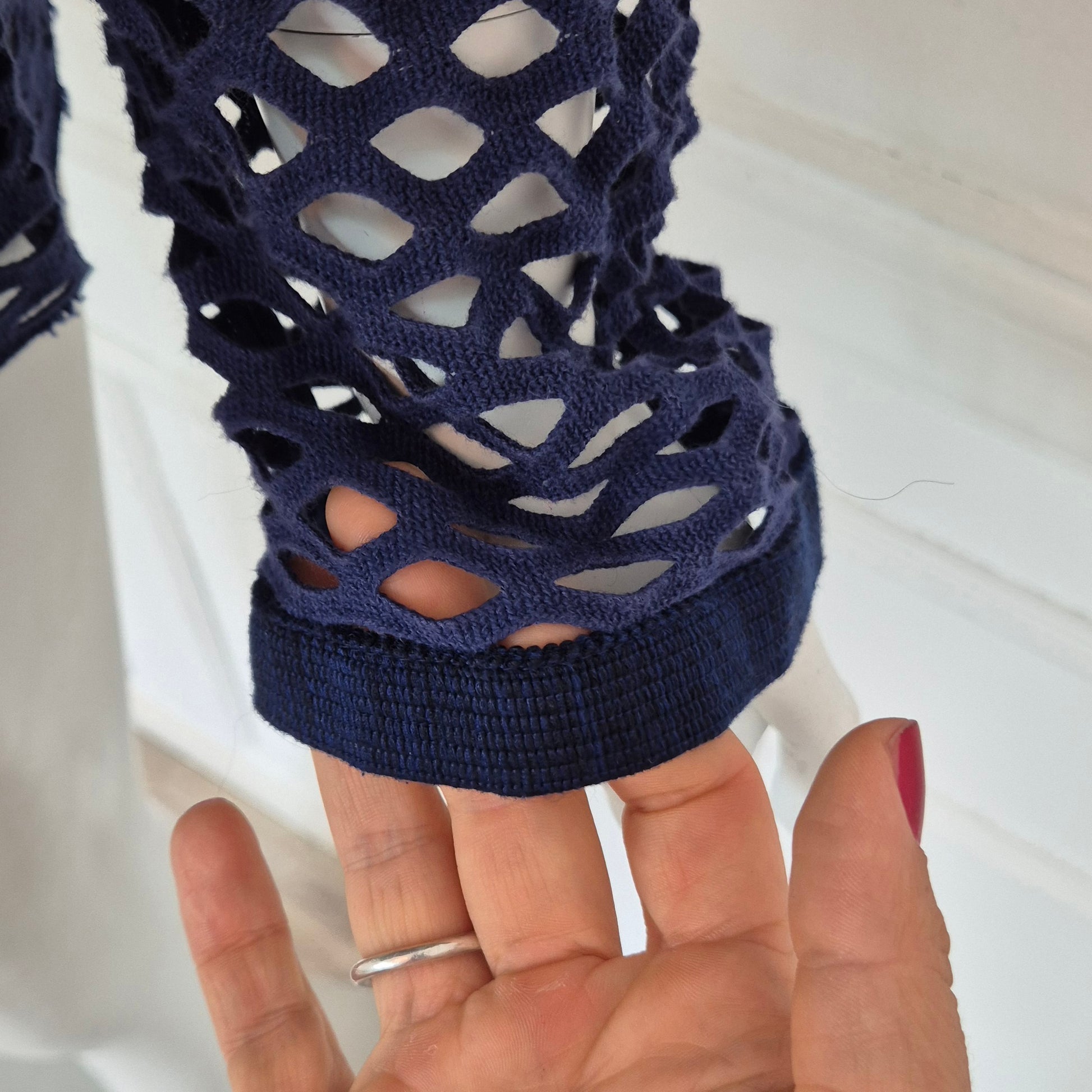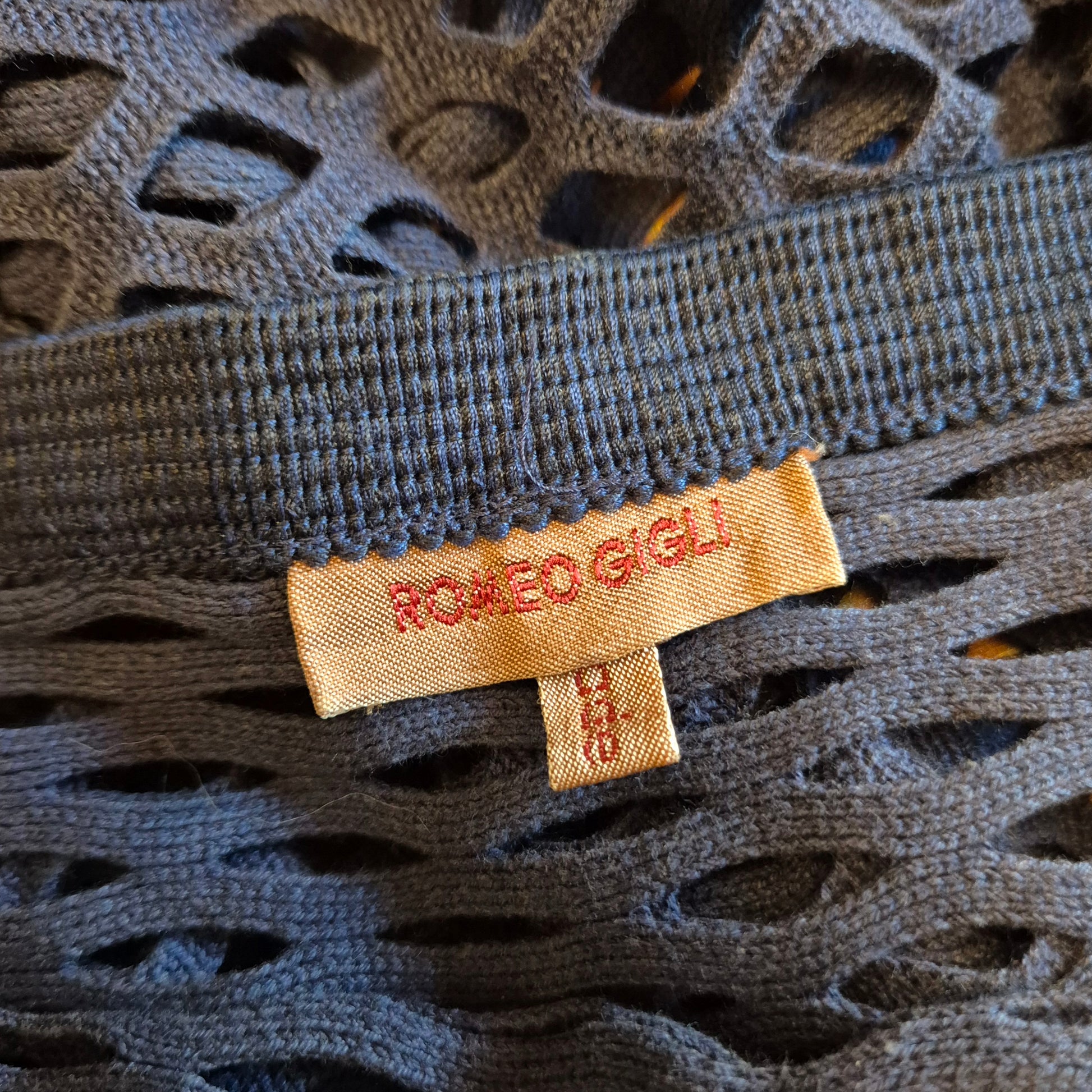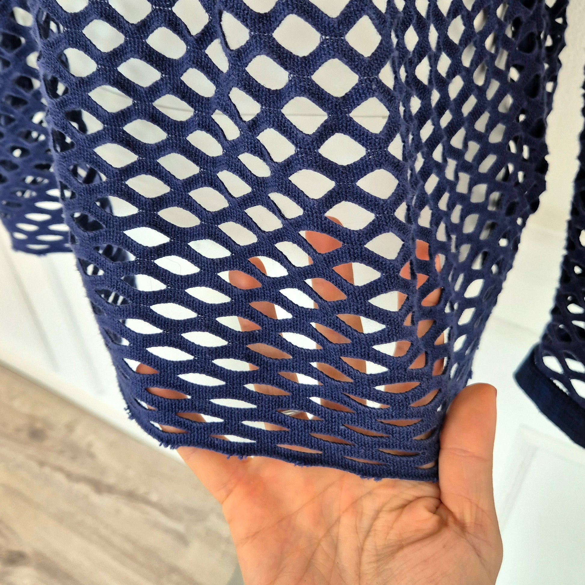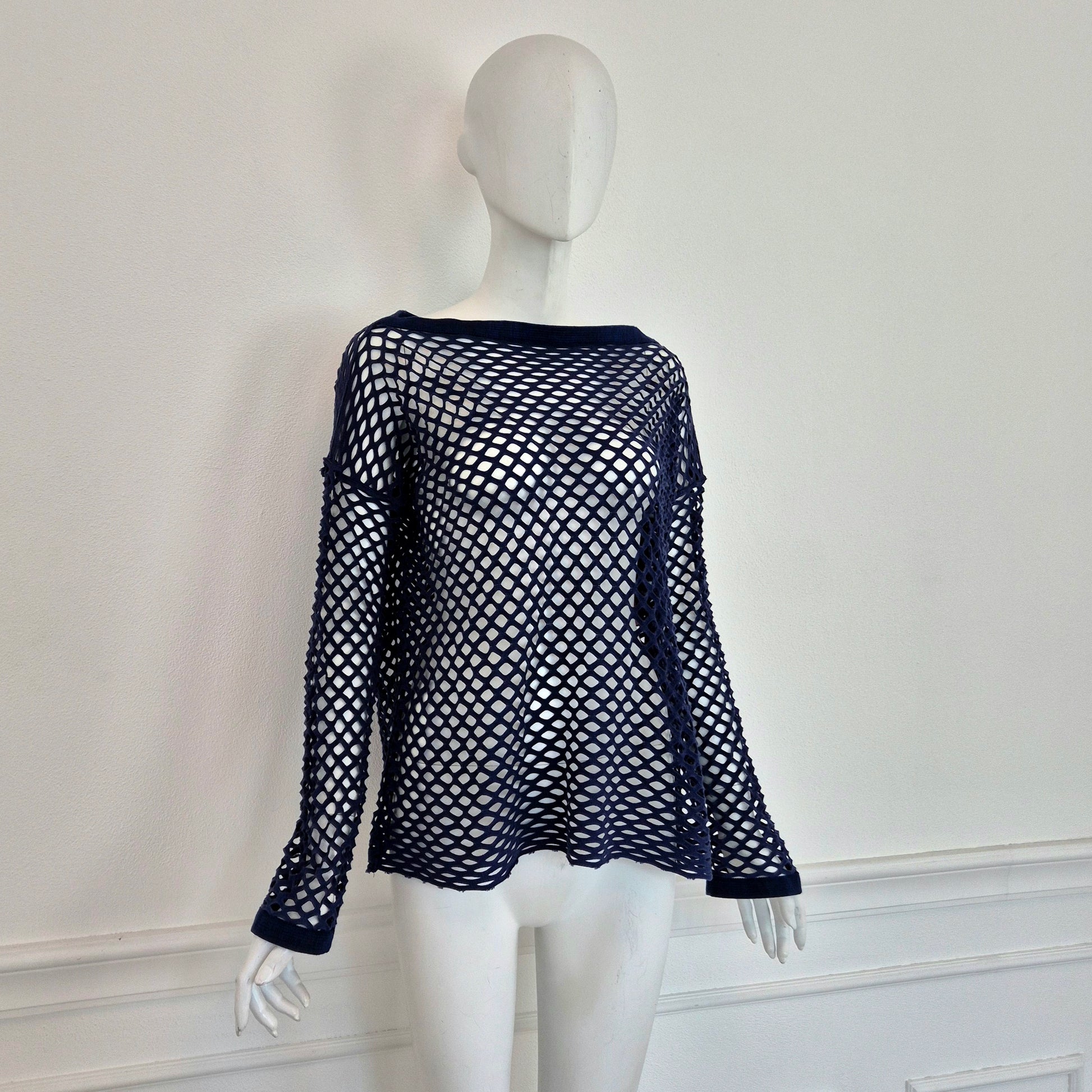ROMEO GIGLI (1994) maglia vintage in rete di cotone color blu, con scollo a barchetta e manica lunga.