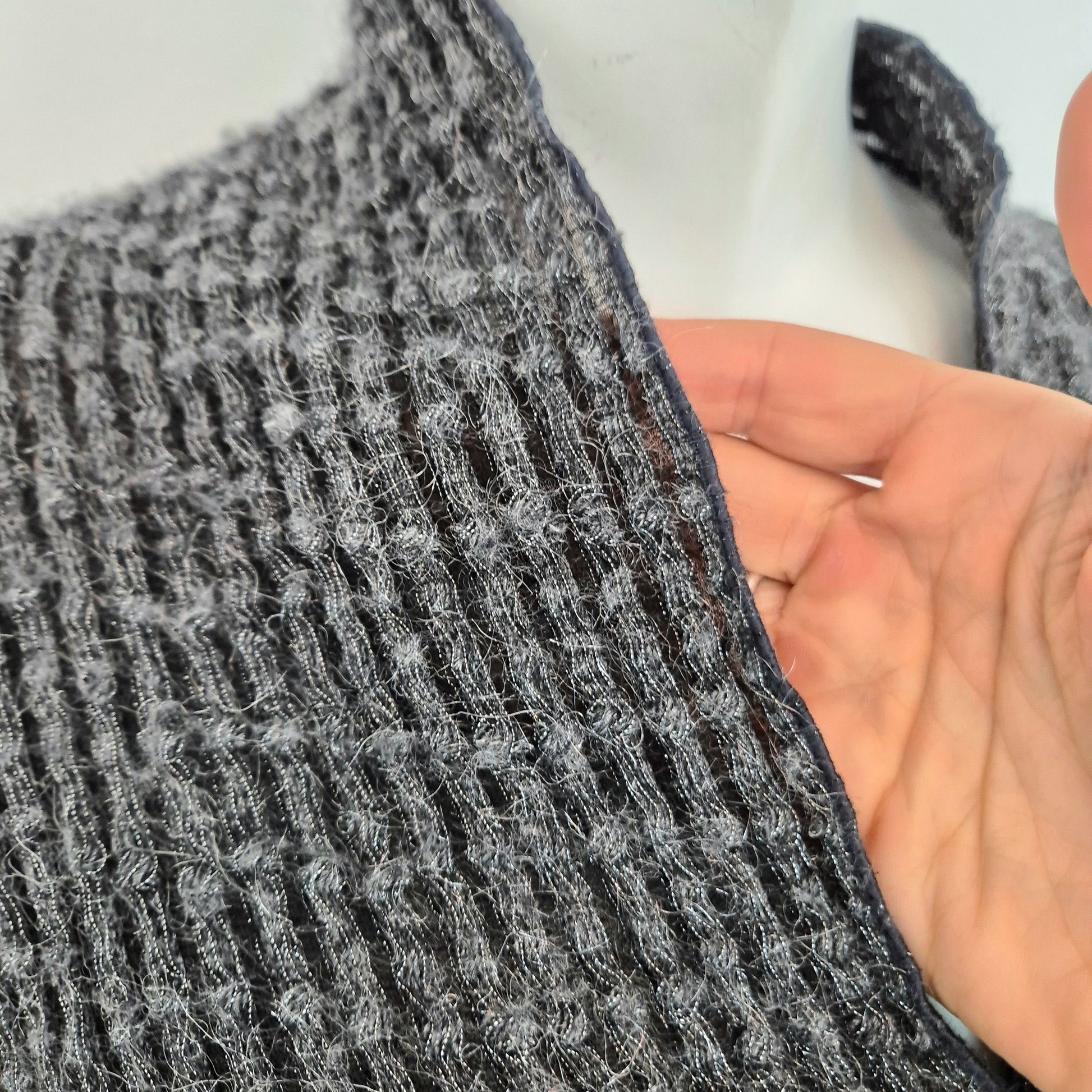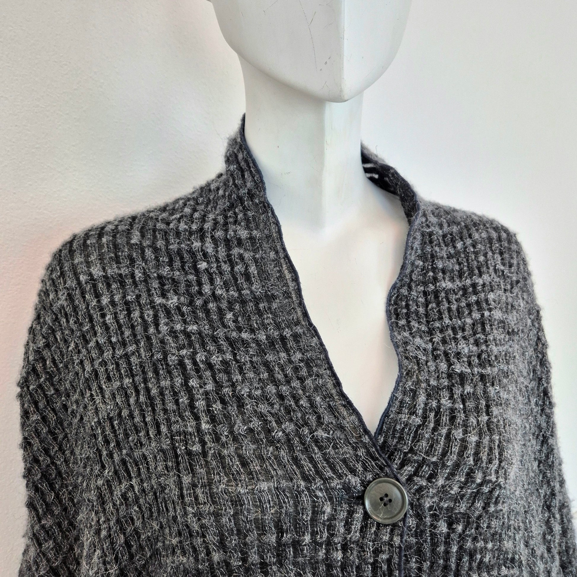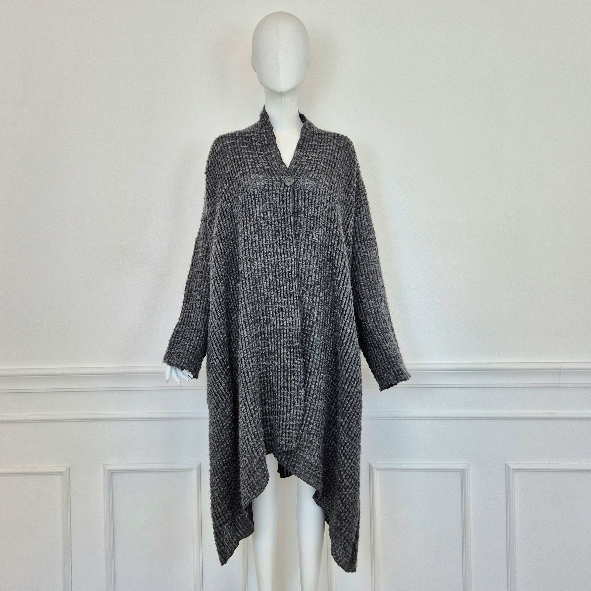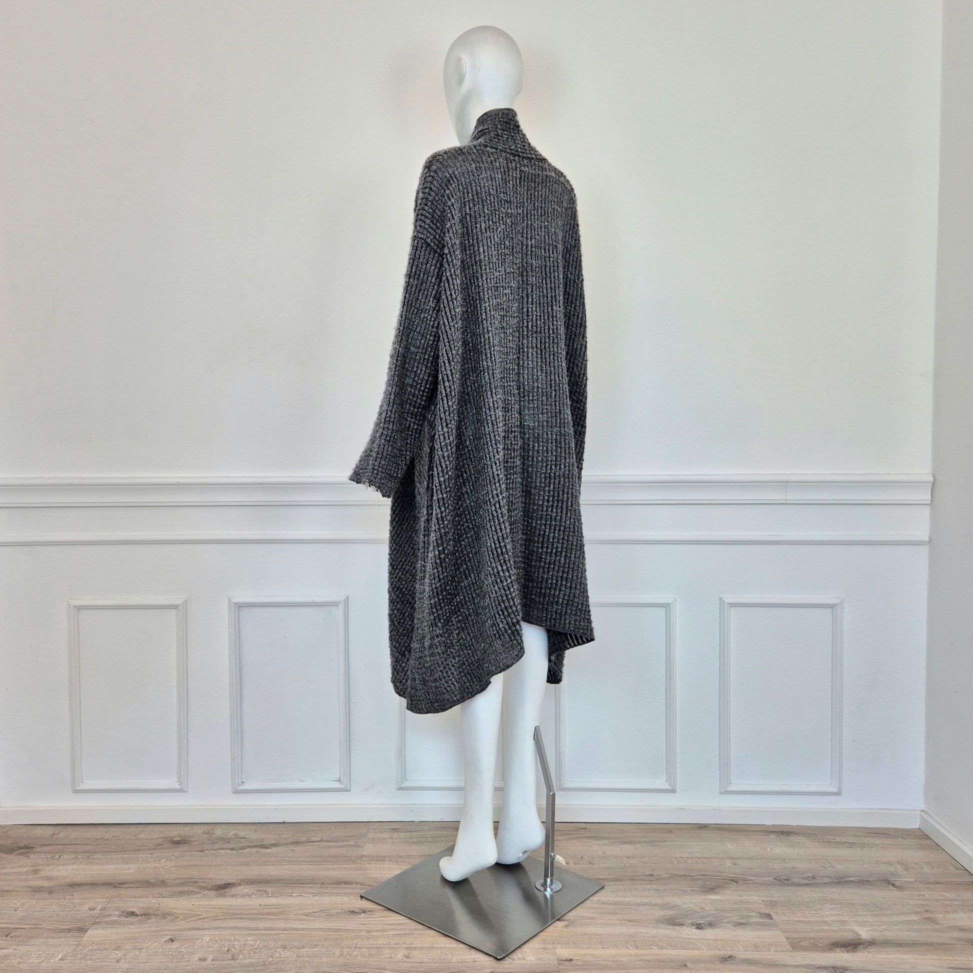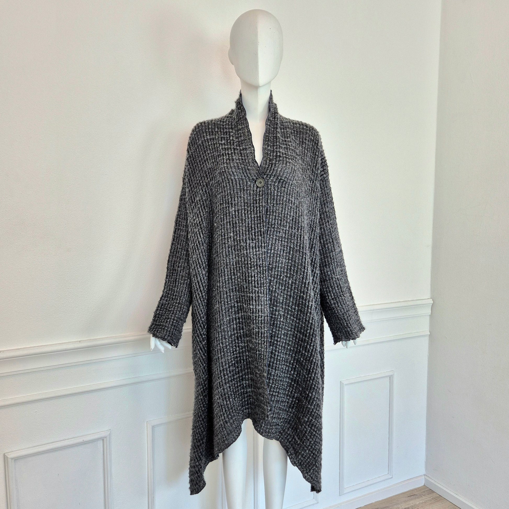 ROMEO GIGLI (fall winter 2000) maxi cardigan / soprabito autunnale in misto lana color grigio antracite con bottone singolo a chiudere e linea asimmetrica.