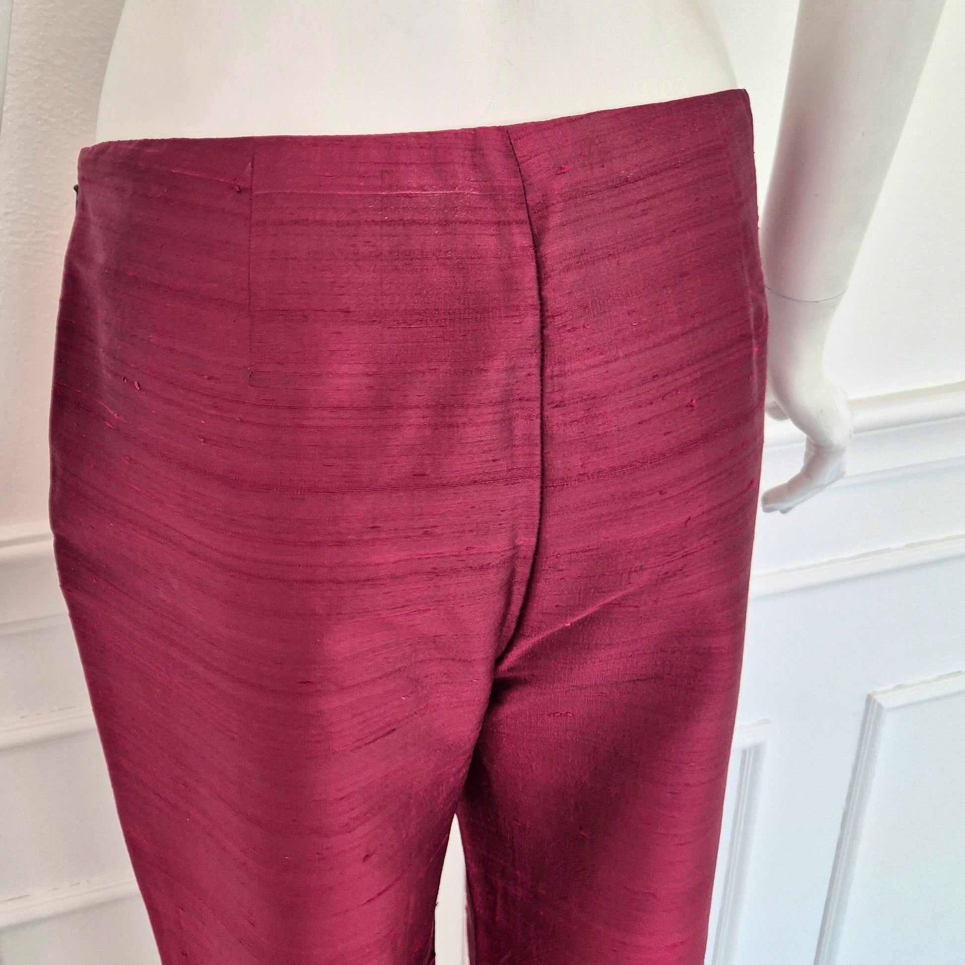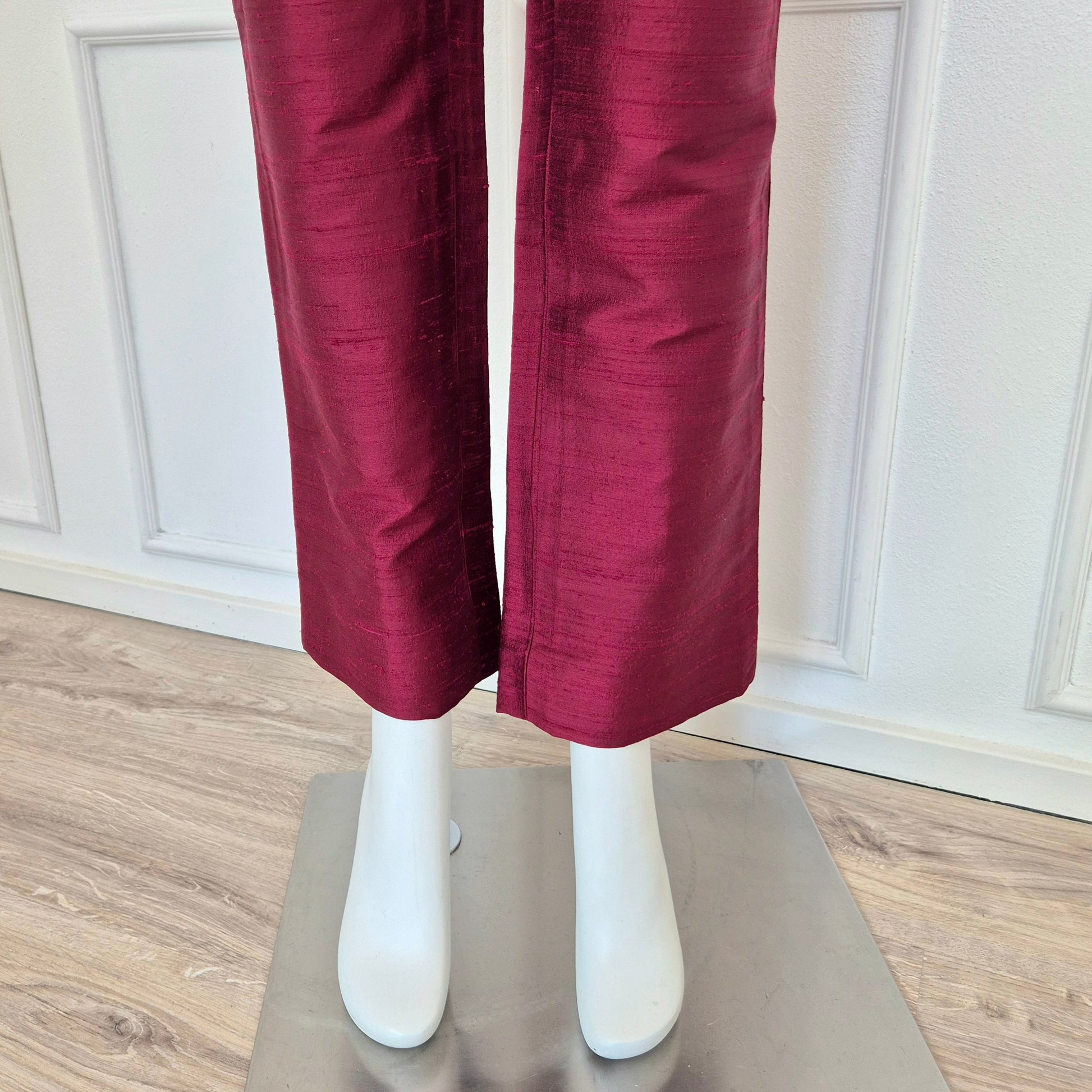 ROMEO GIGLI (linea GIGLI) pantaloni vintage anni '90 in seta grezza (o shantung di seta che dir si voglia) color borgogna cangiante, con vita media chiusa da zip e taglio classico. La gamba si allarga leggermente sul fondo.