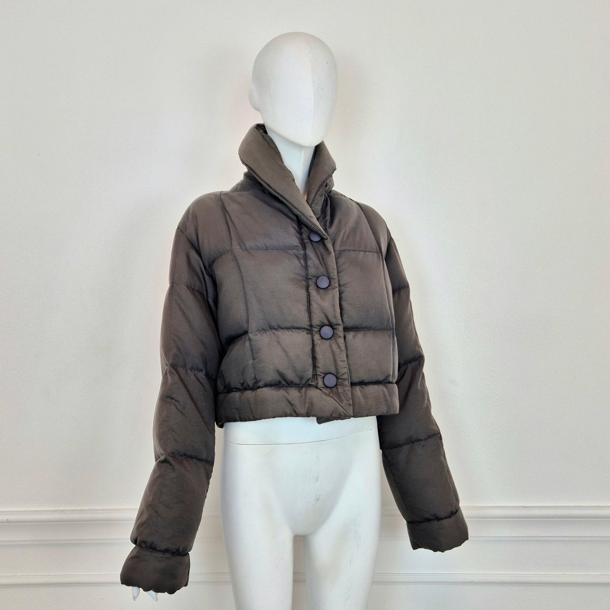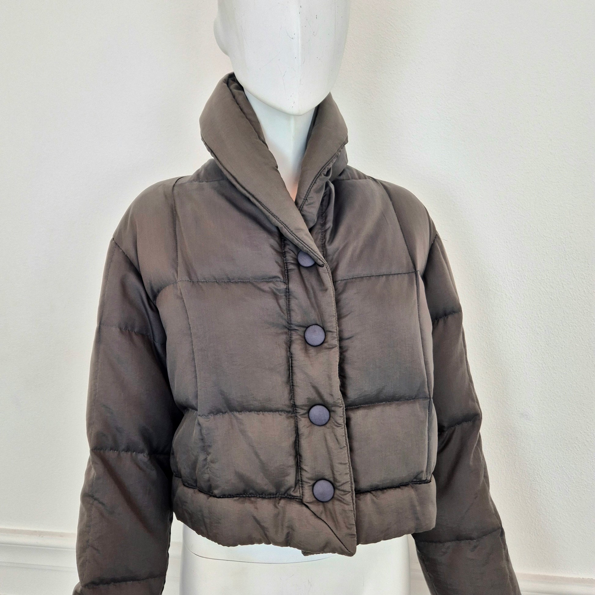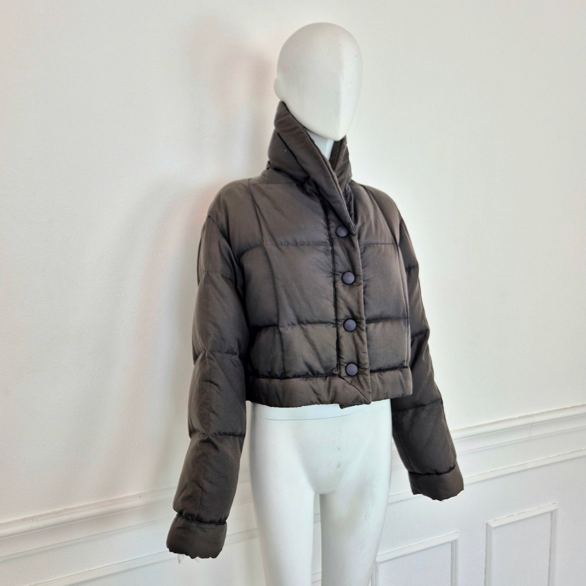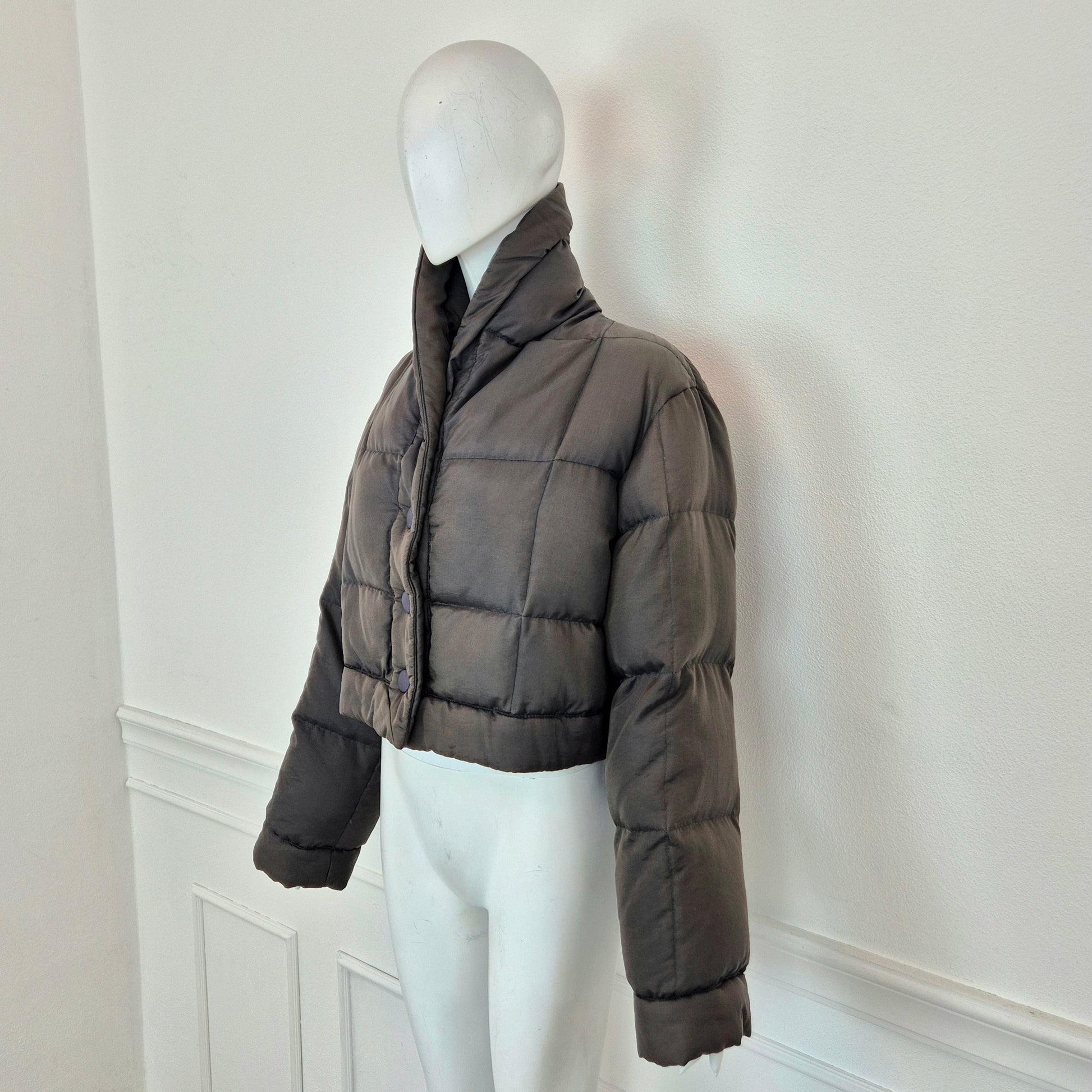 ROMEO GIGLI (linea G di Gigli) piumino corto vintage anni '90 in tessuto impermeabile marrone, con bottoni automatici tono su tono.