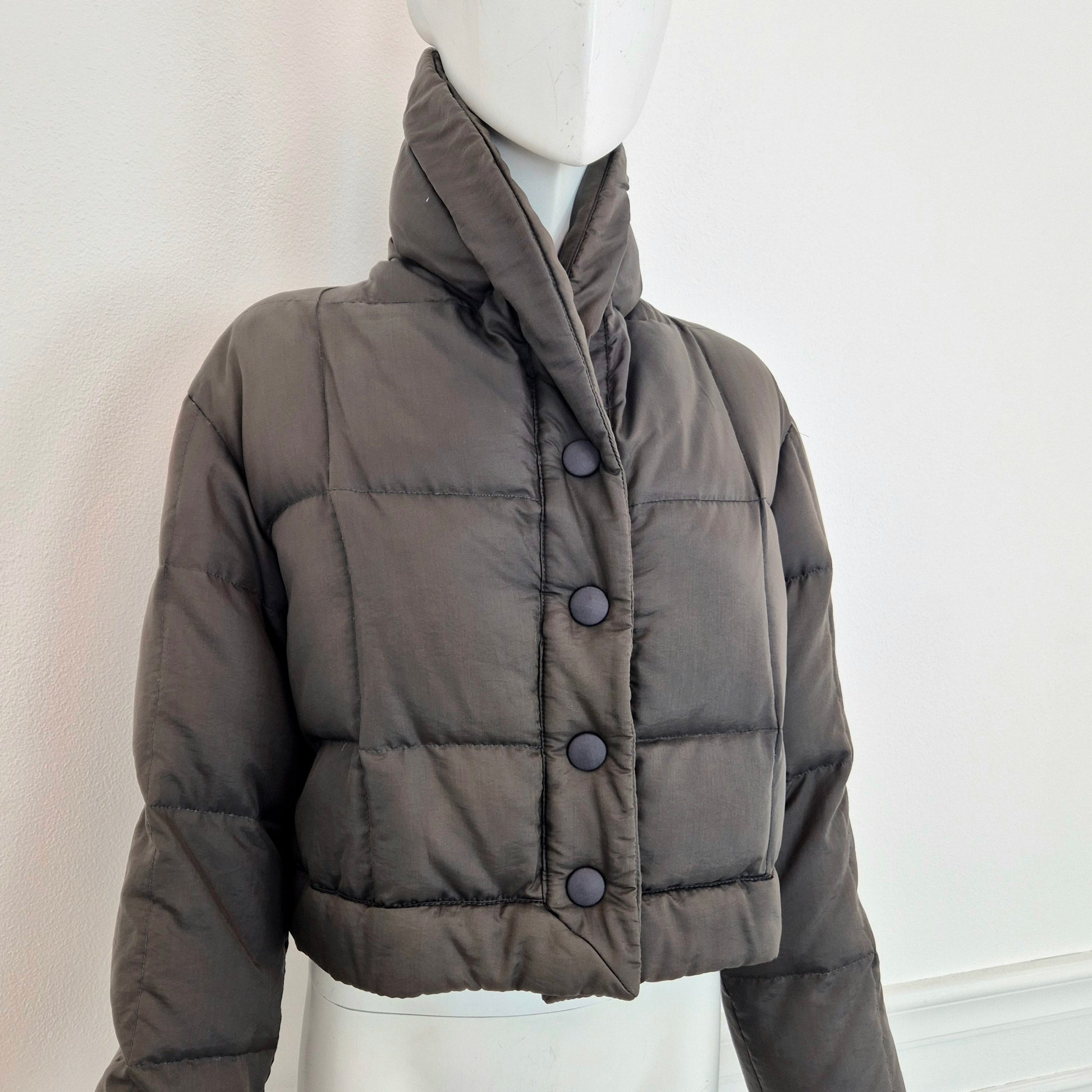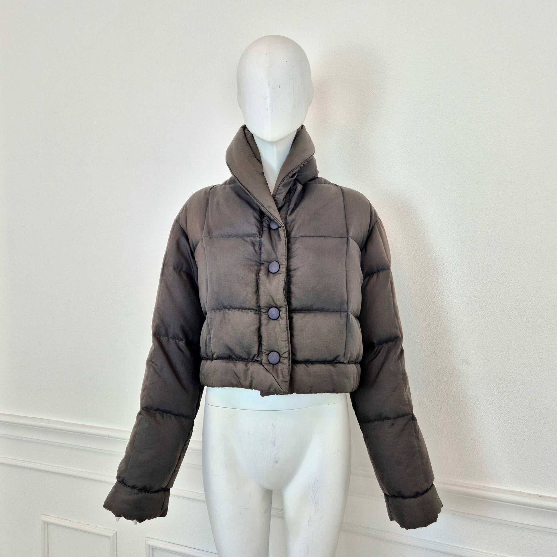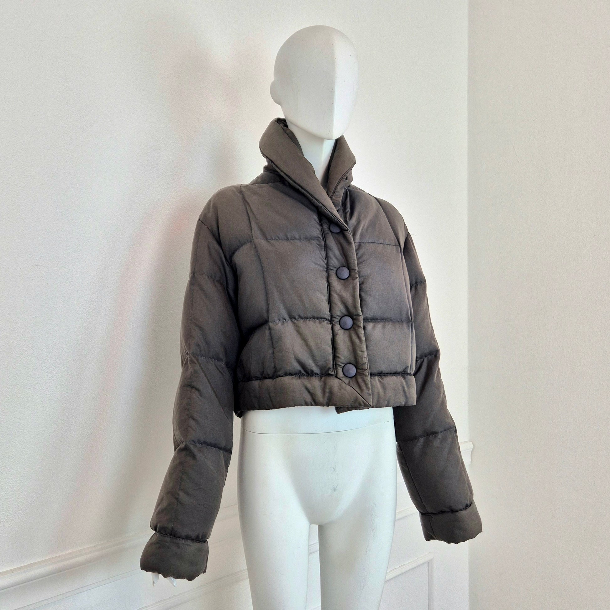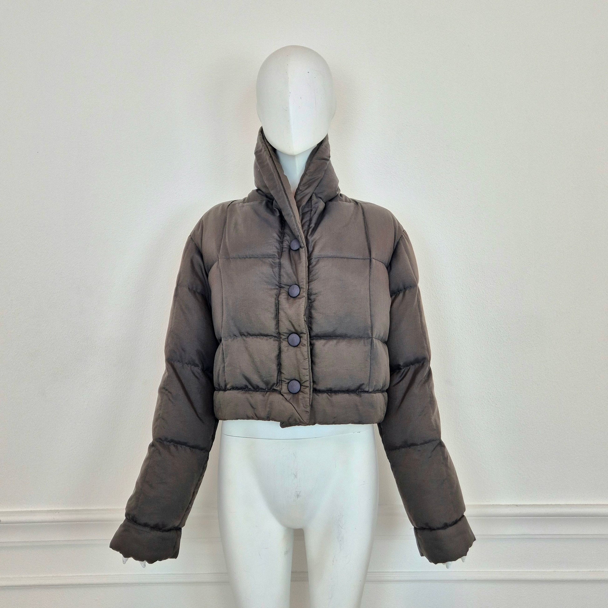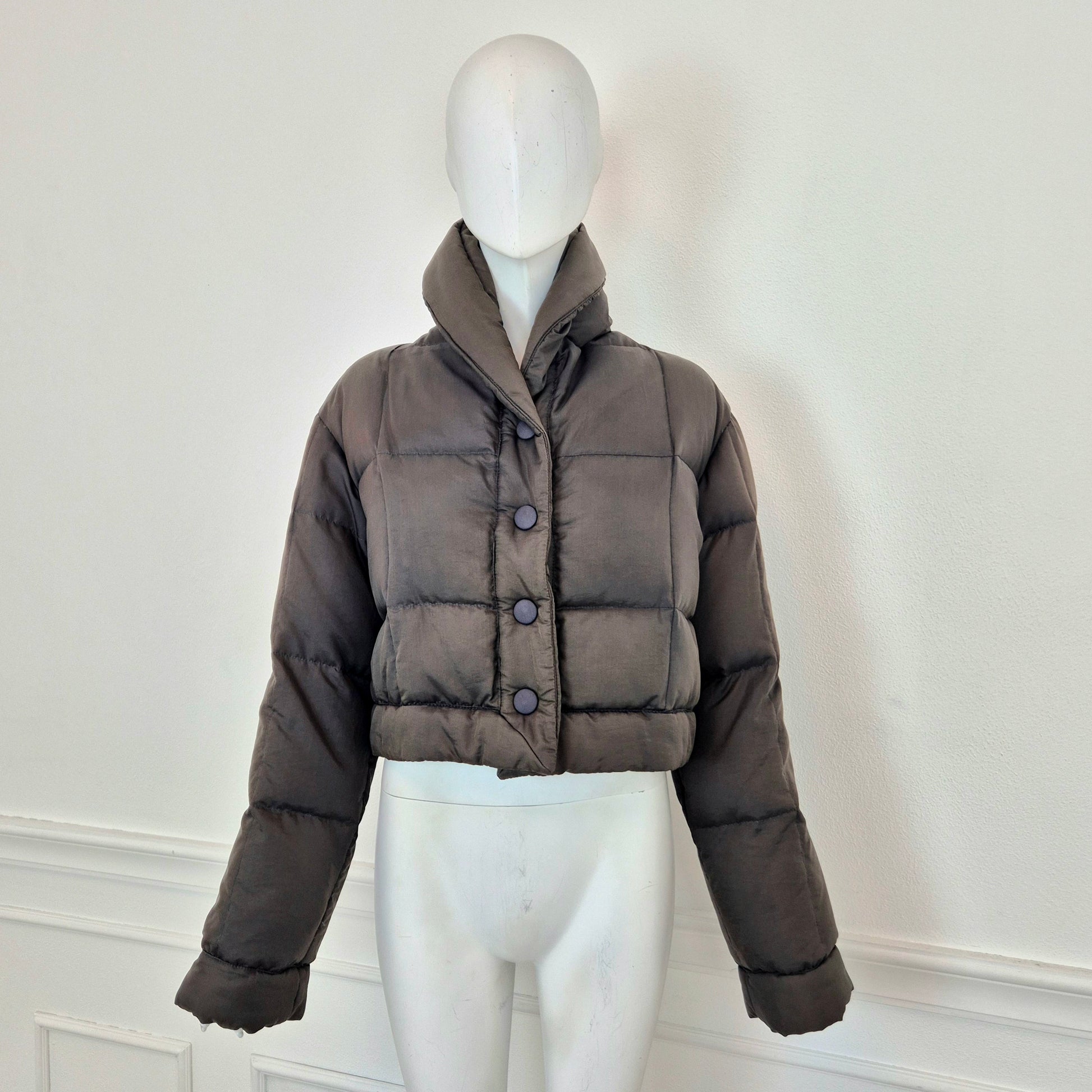 ROMEO GIGLI (linea G di Gigli) piumino corto vintage anni '90 in tessuto impermeabile marrone, con bottoni automatici tono su tono.