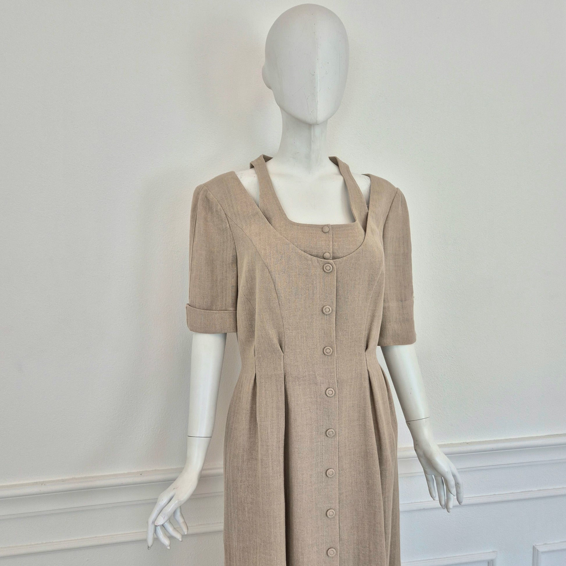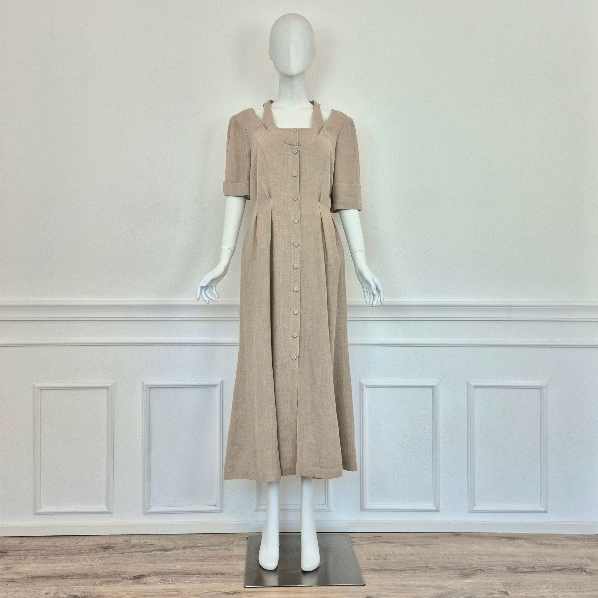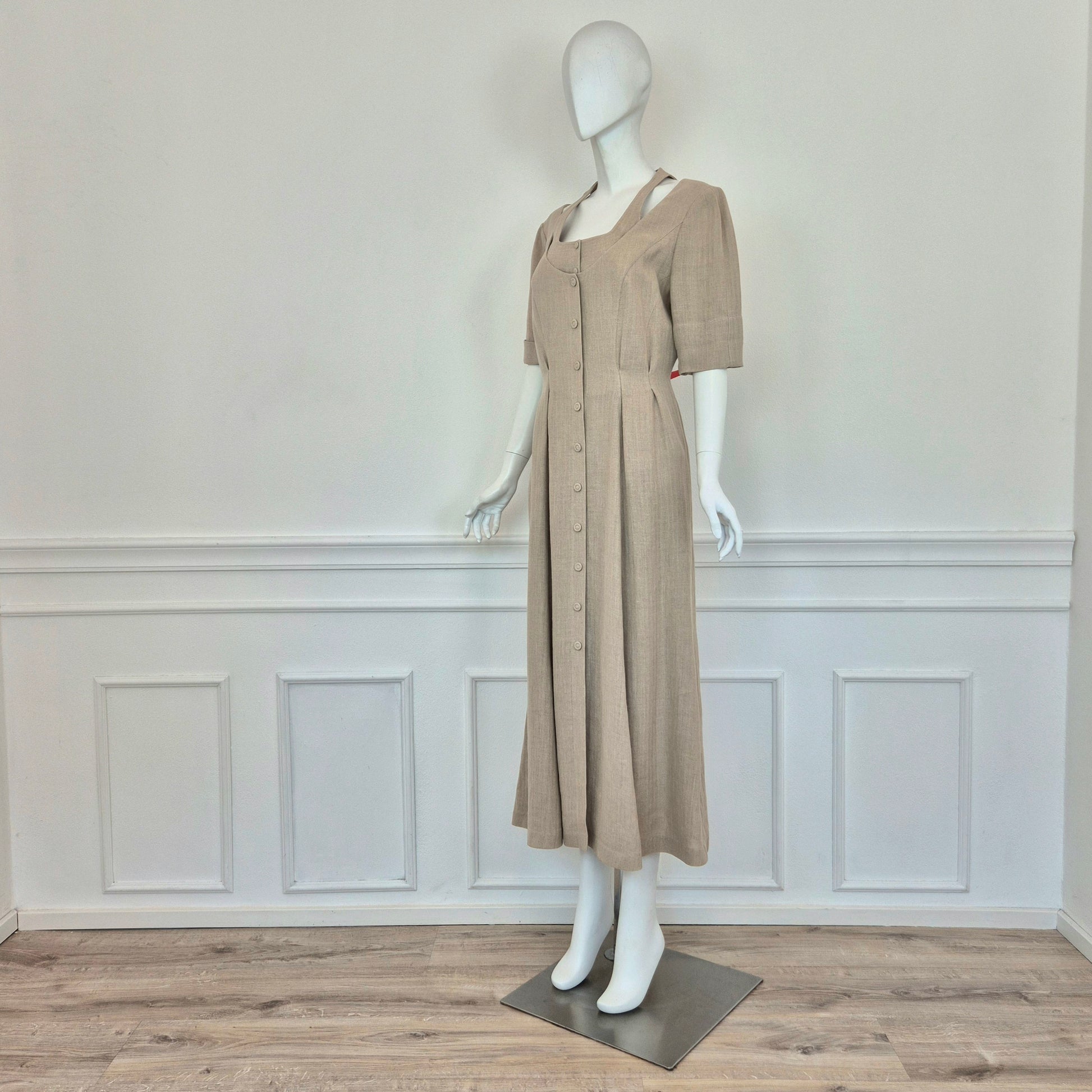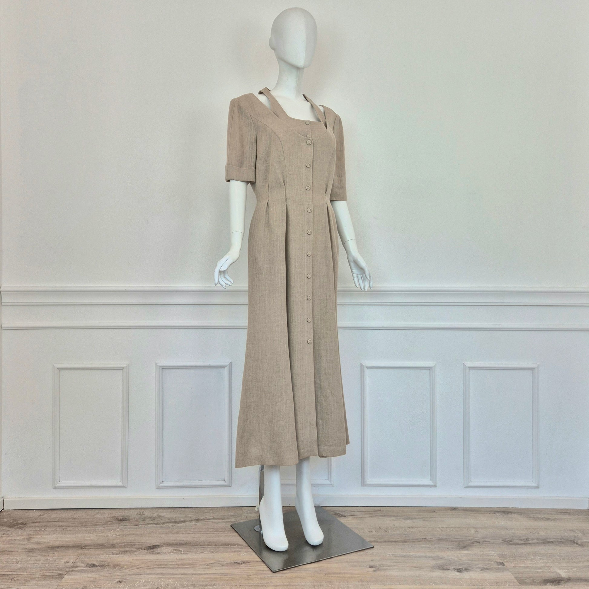 THIERRY MUGLER abito lungo in lino beige dalla costruzione magistrale, con corpetto interno con bottoncini a pressione e pinces a segnare il punto vita.