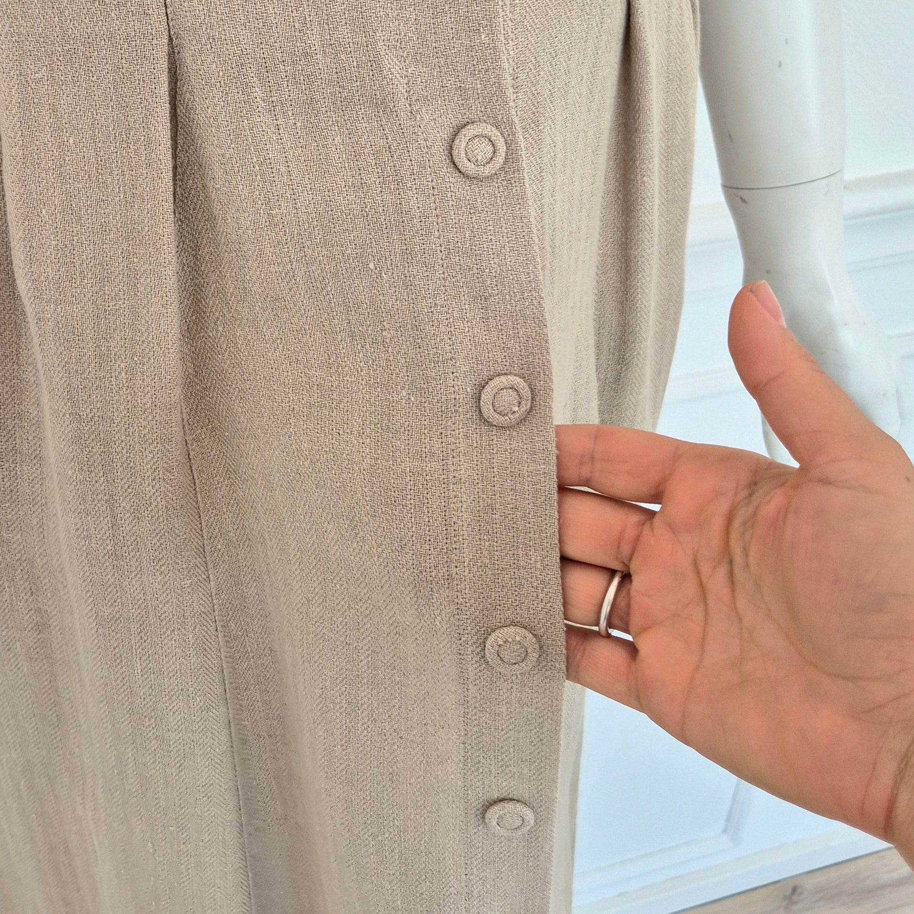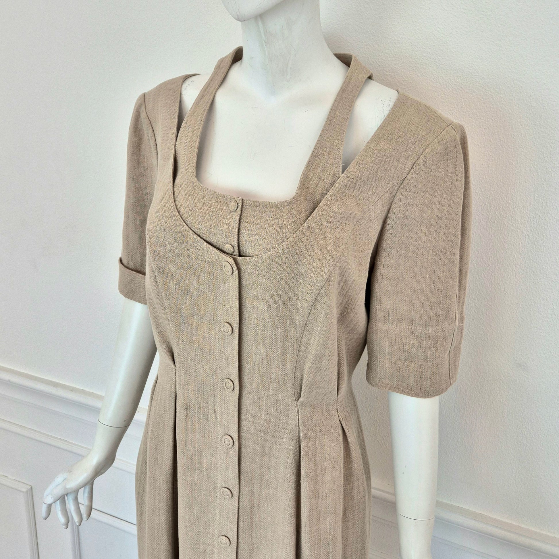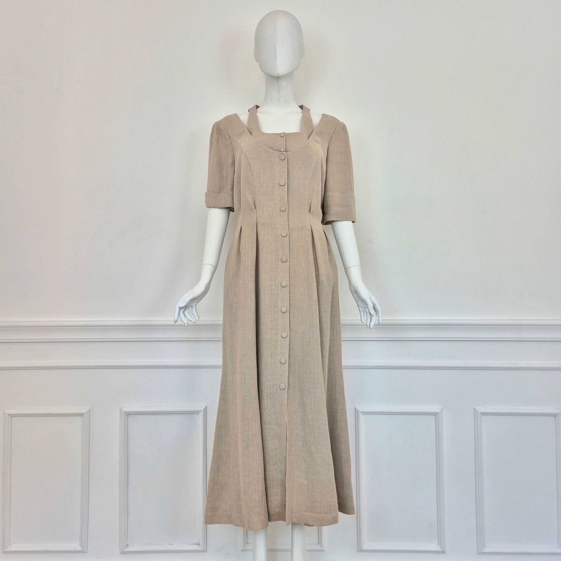 THIERRY MUGLER abito lungo in lino beige dalla costruzione magistrale, con corpetto interno con bottoncini a pressione e pinces a segnare il punto vita.
