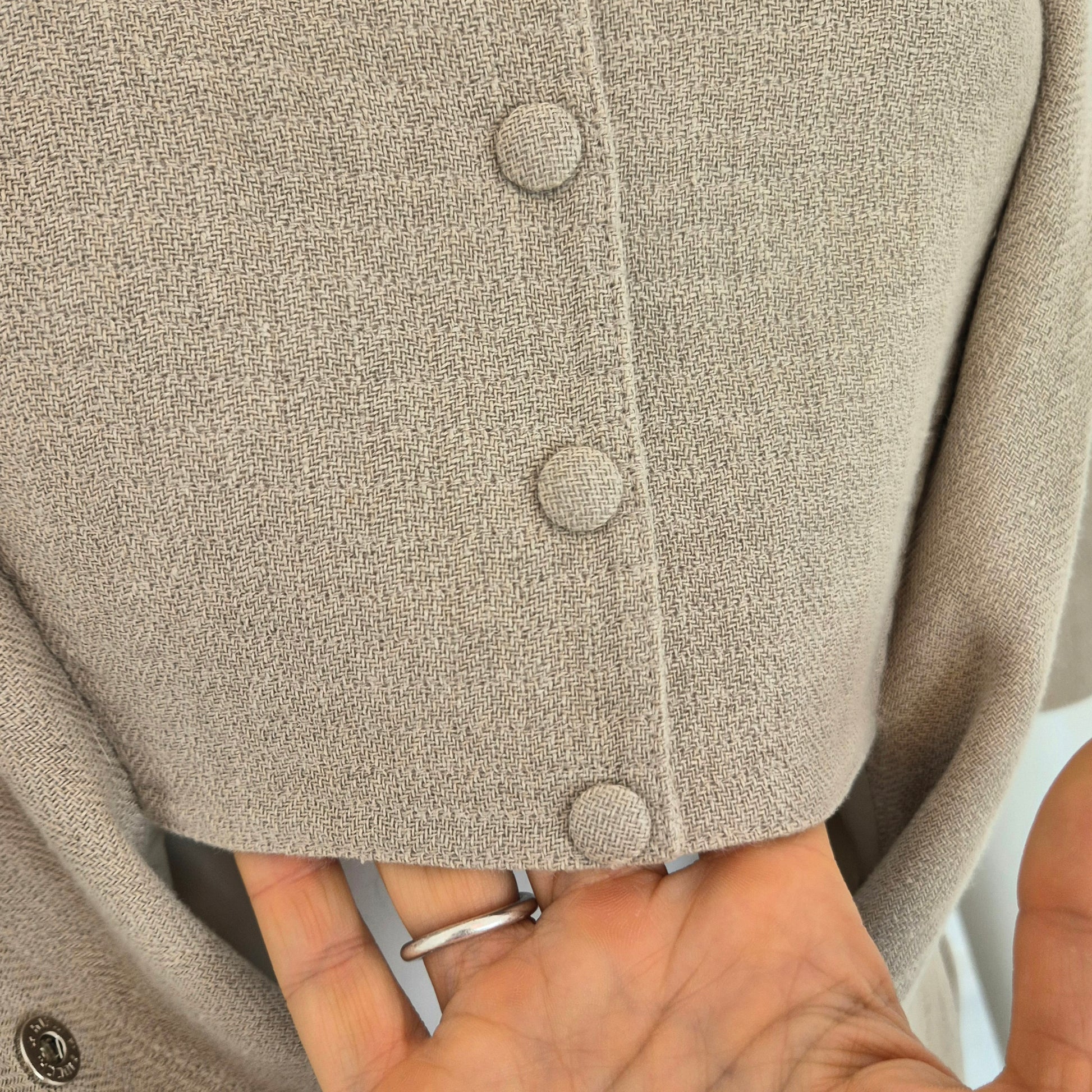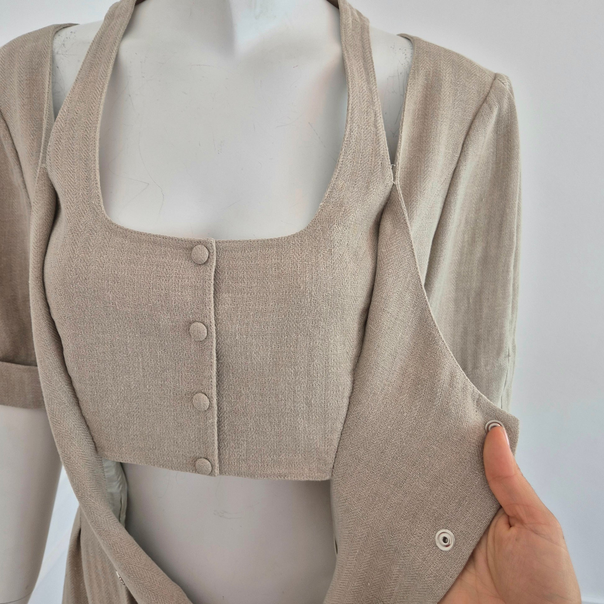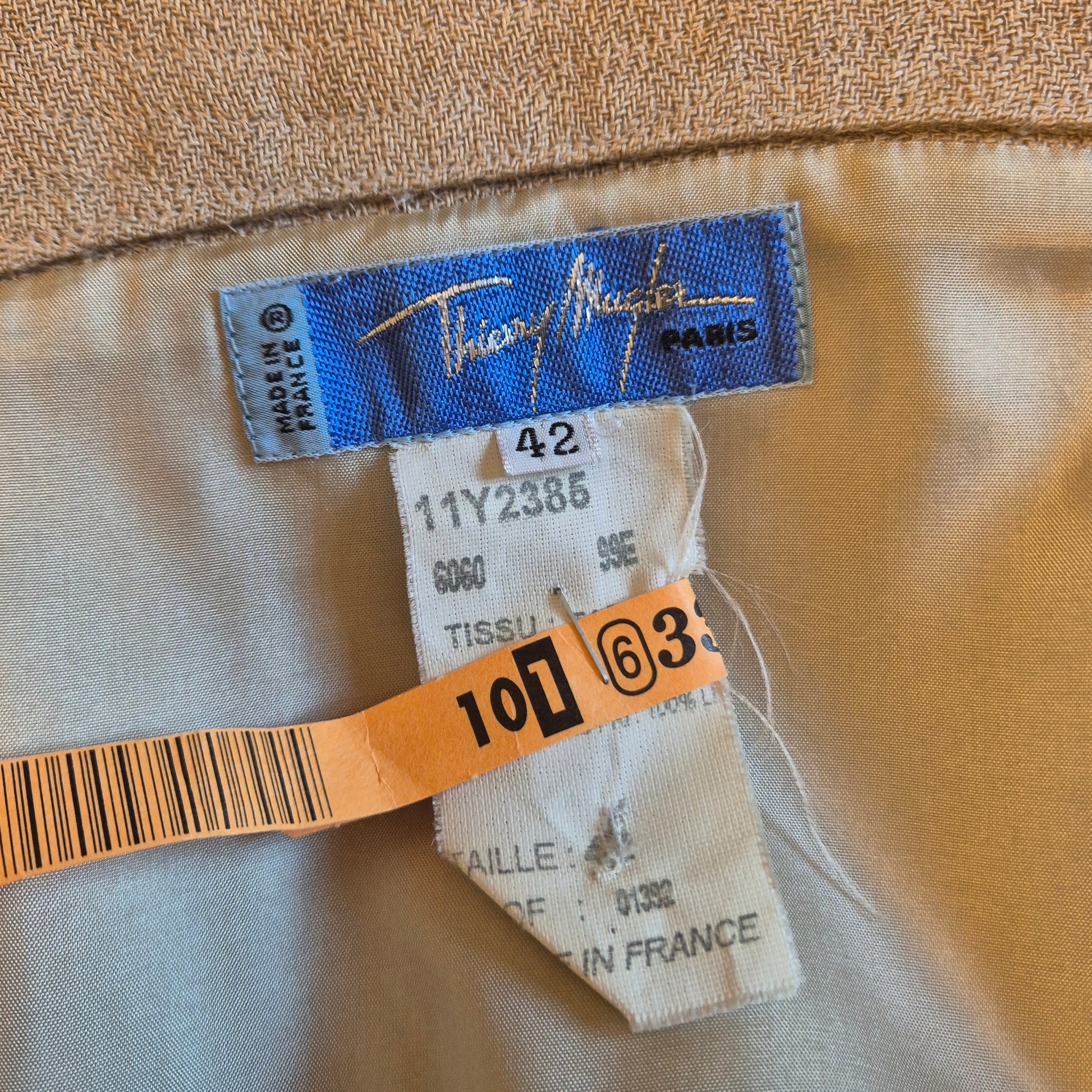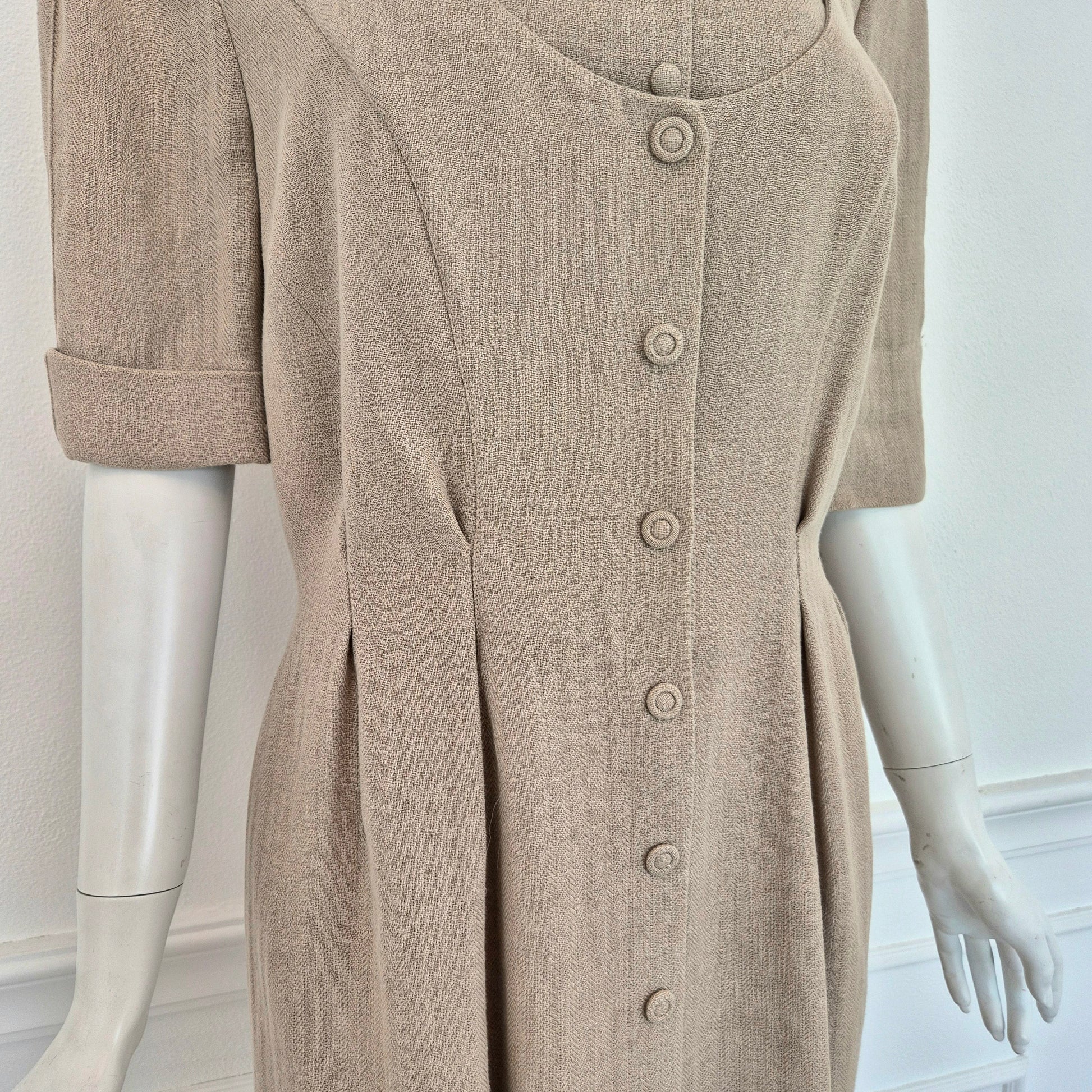 THIERRY MUGLER abito lungo in lino beige dalla costruzione magistrale, con corpetto interno con bottoncini a pressione e pinces a segnare il punto vita.