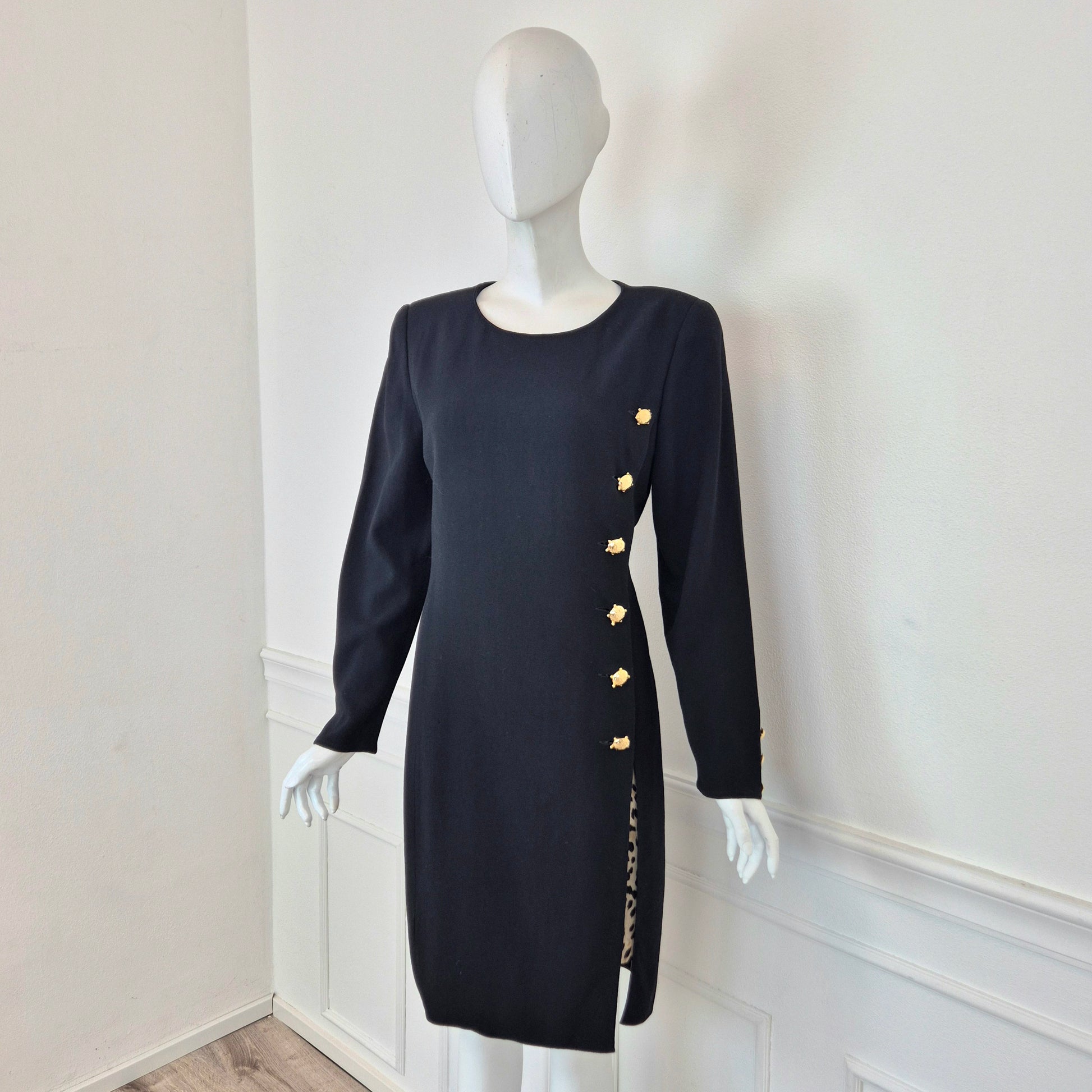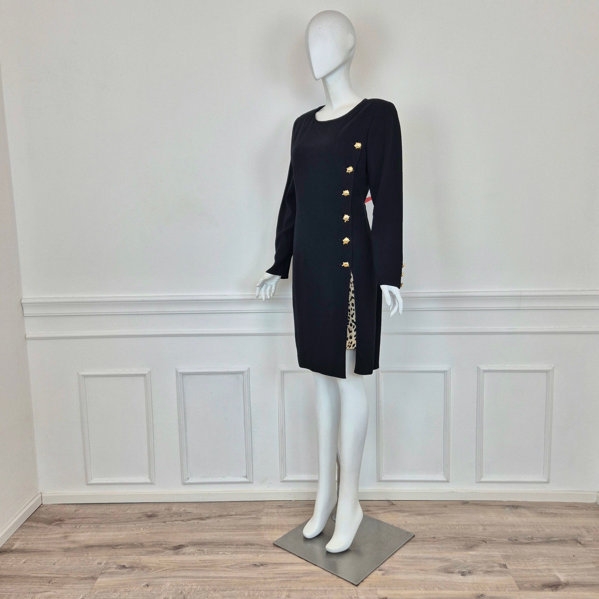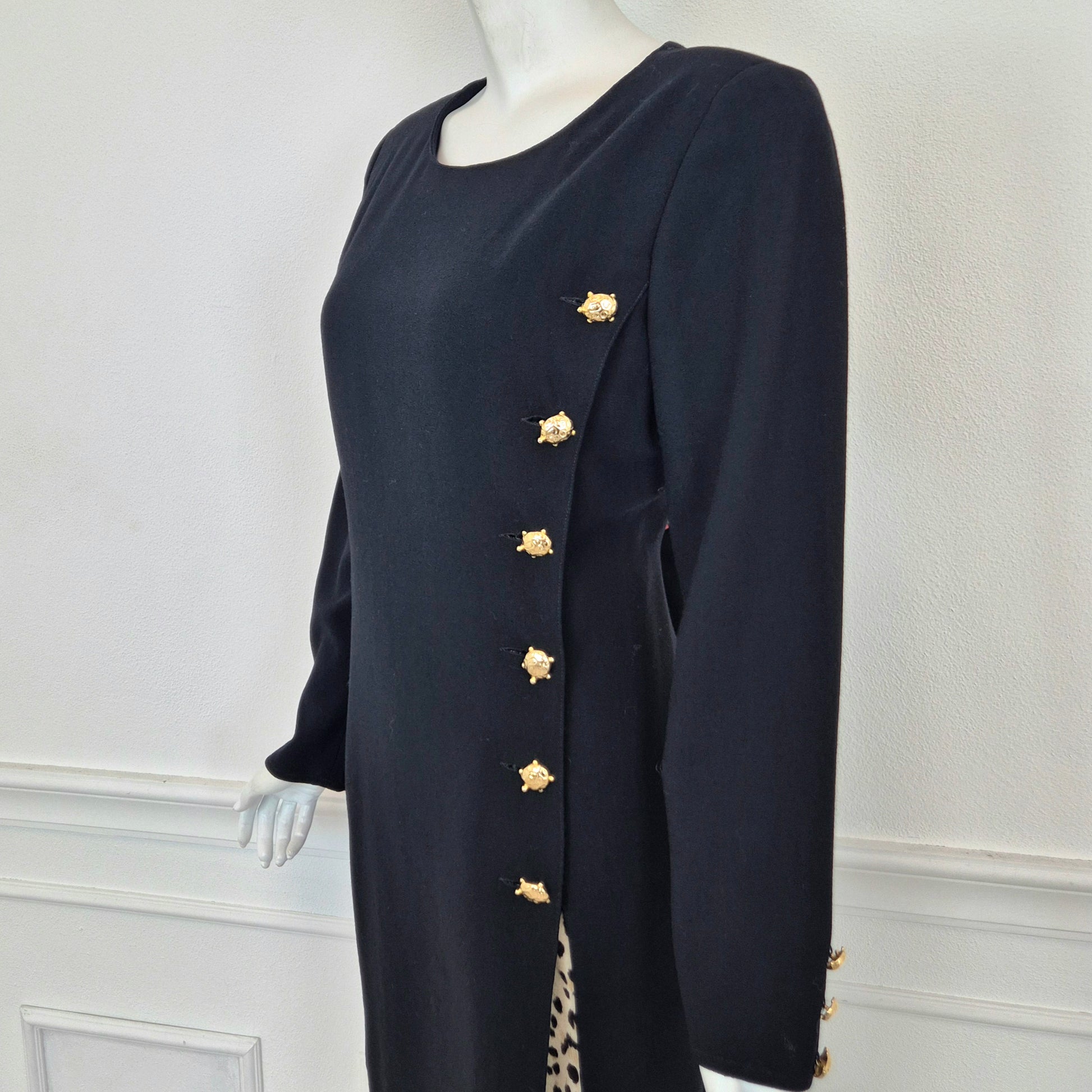 VALENTINO abito vintage anni '80 in pura lana color nero, con scollo rotondo, manica lunga, particolare spacco con tessuto interno animalier e lunga fila di bottoni dorati a forma di tartaruga.