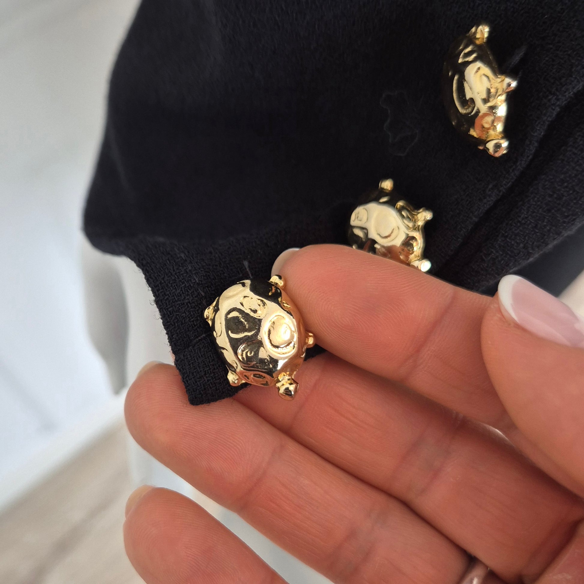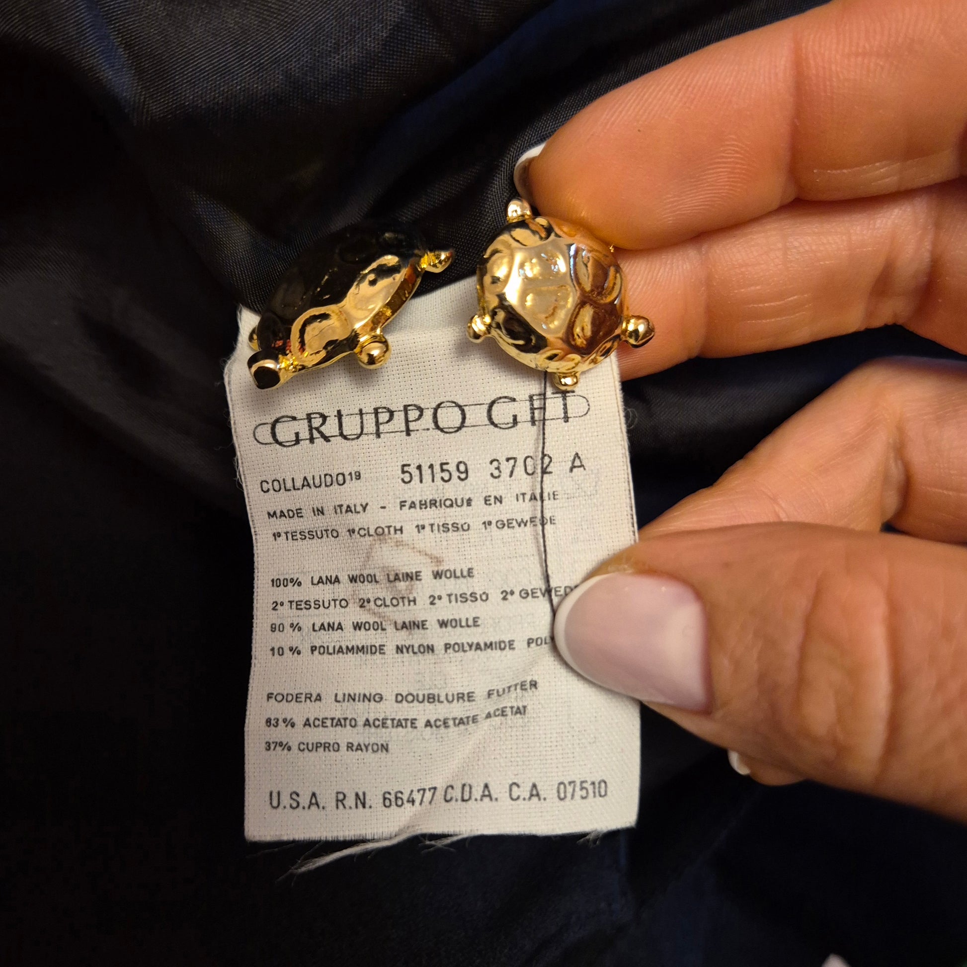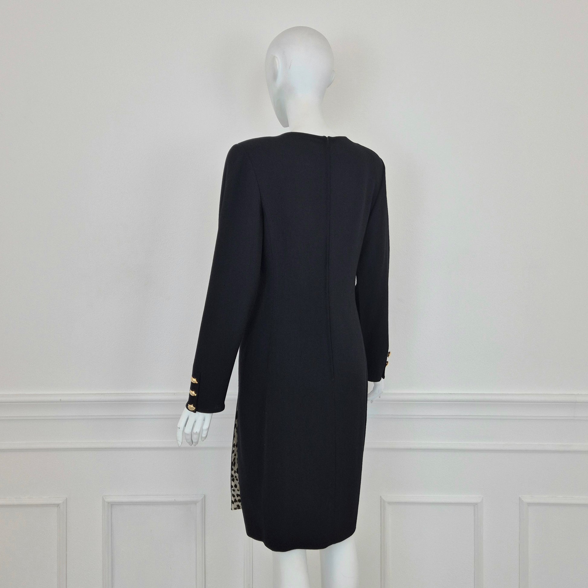VALENTINO abito vintage anni '80 in pura lana color nero, con scollo rotondo, manica lunga, particolare spacco con tessuto interno animalier e lunga fila di bottoni dorati a forma di tartaruga.