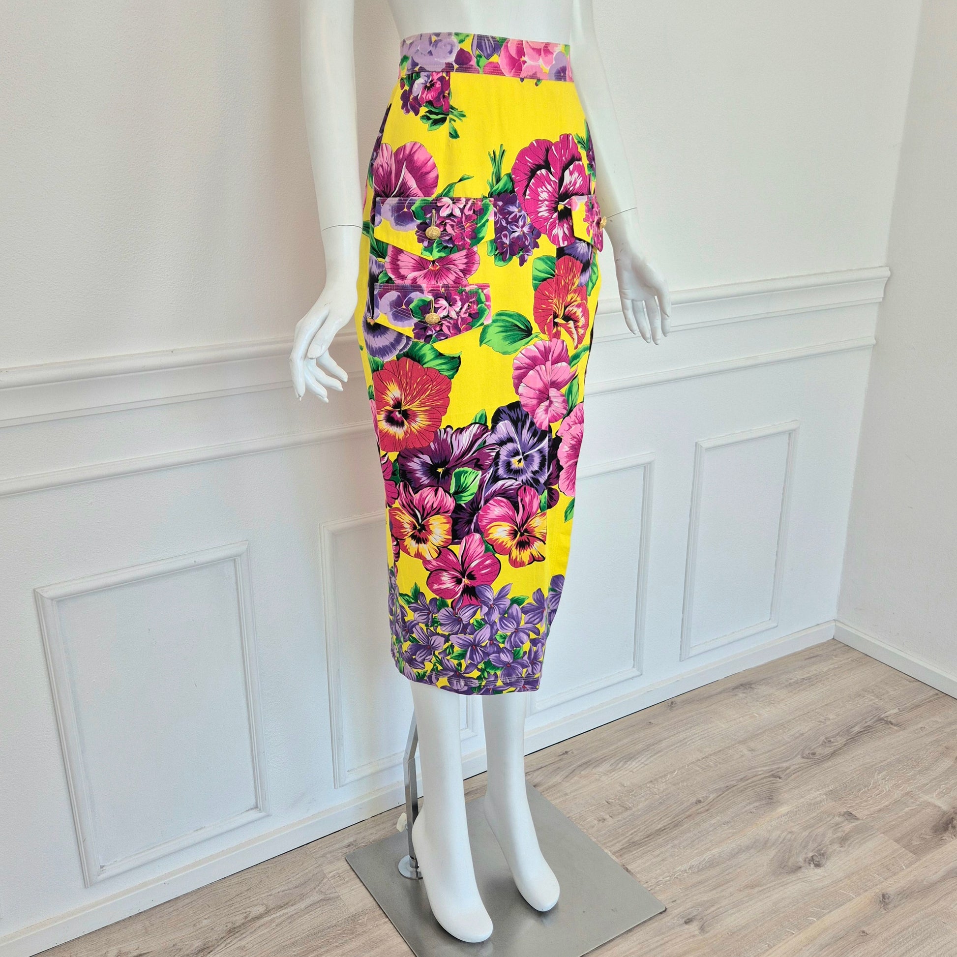VERSUS di GIANNI versace gonna longuette vintage anni '90 in cotone e viscosa dalla stampa floreale multicolor su fondo giallo. Bottoni dorati, spacco laterale e particolare doppia tasca su un fianco.