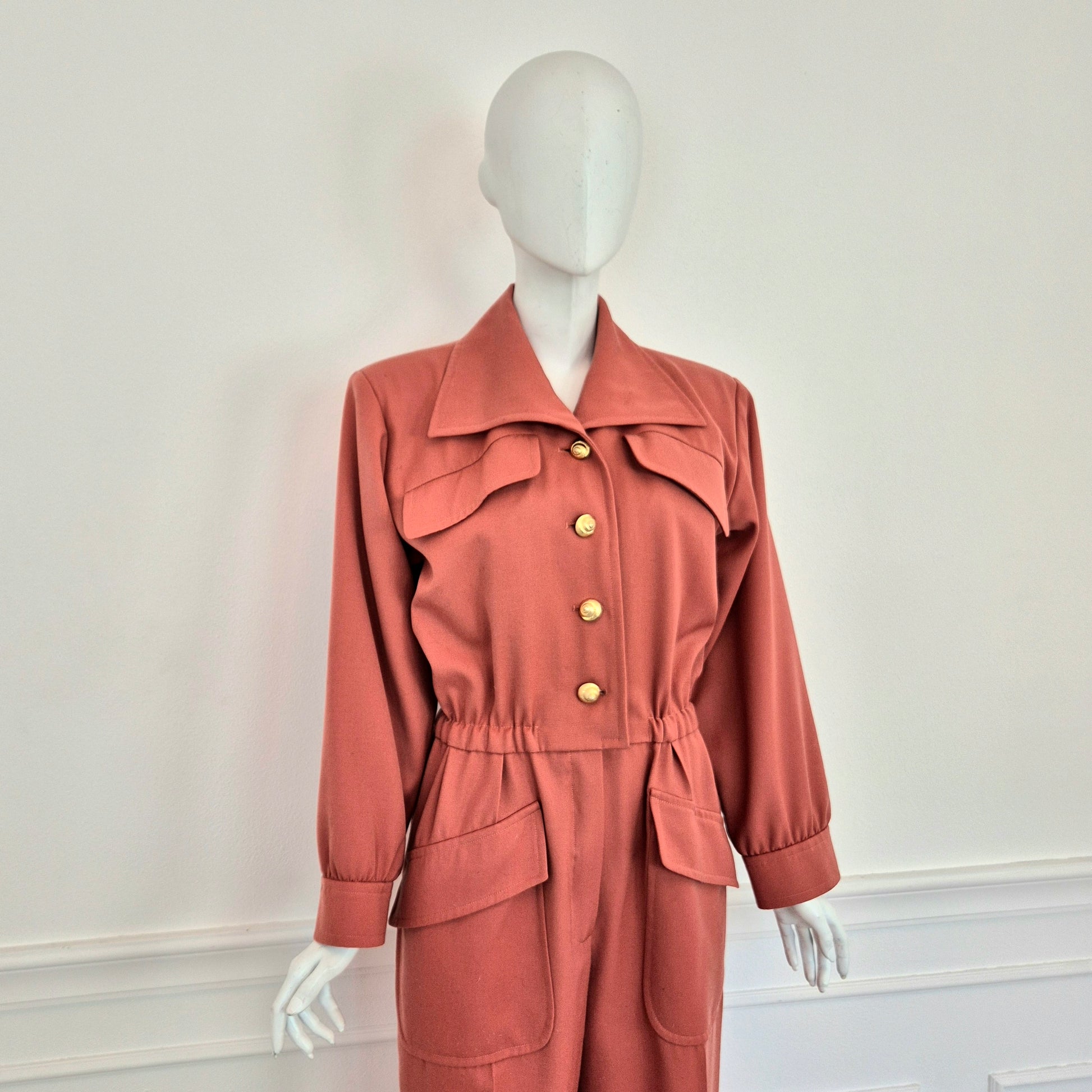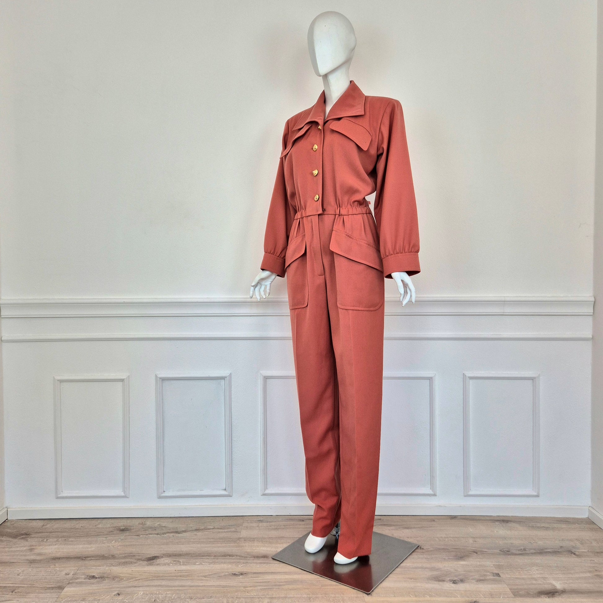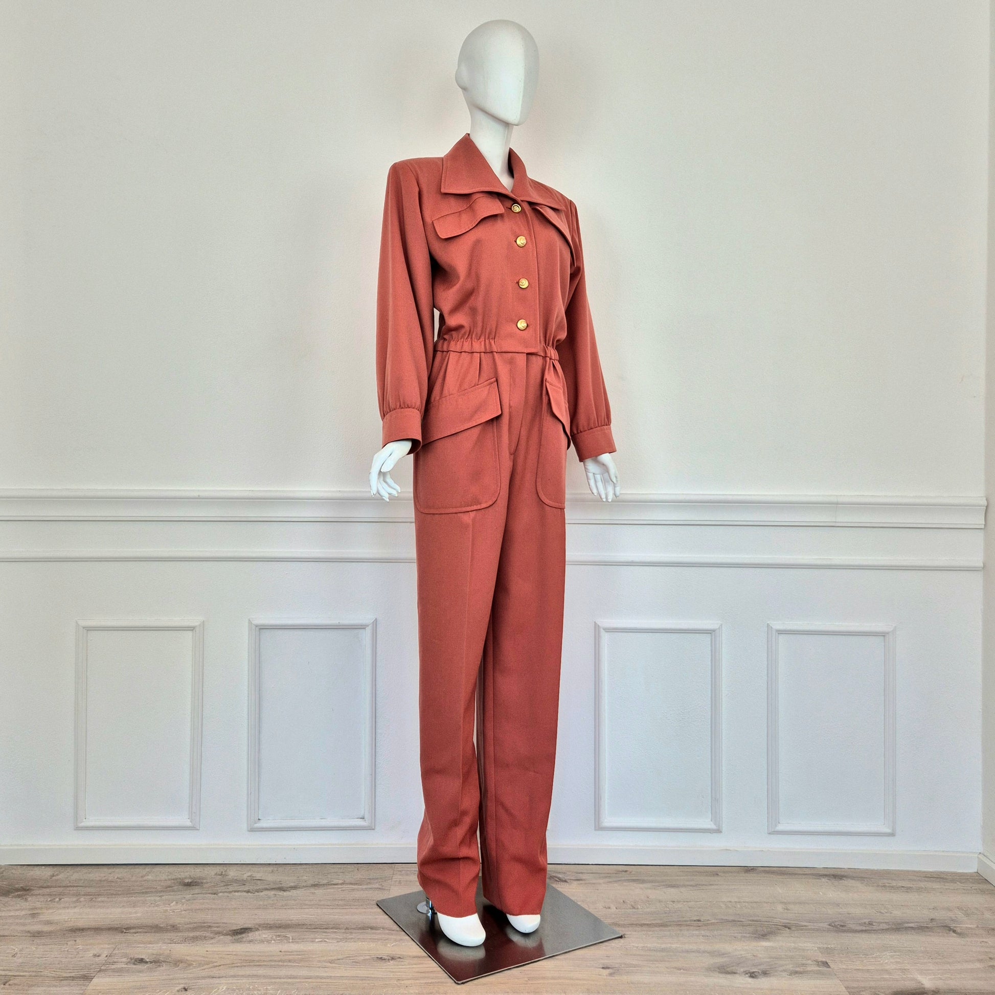 YVES SANT LAURENT rive gauche - incredibile tuta vintage anni 70 color zucca, con colletto a punta e botoni a conchiglia dorati. grandi tasche all'altezza delle anche.